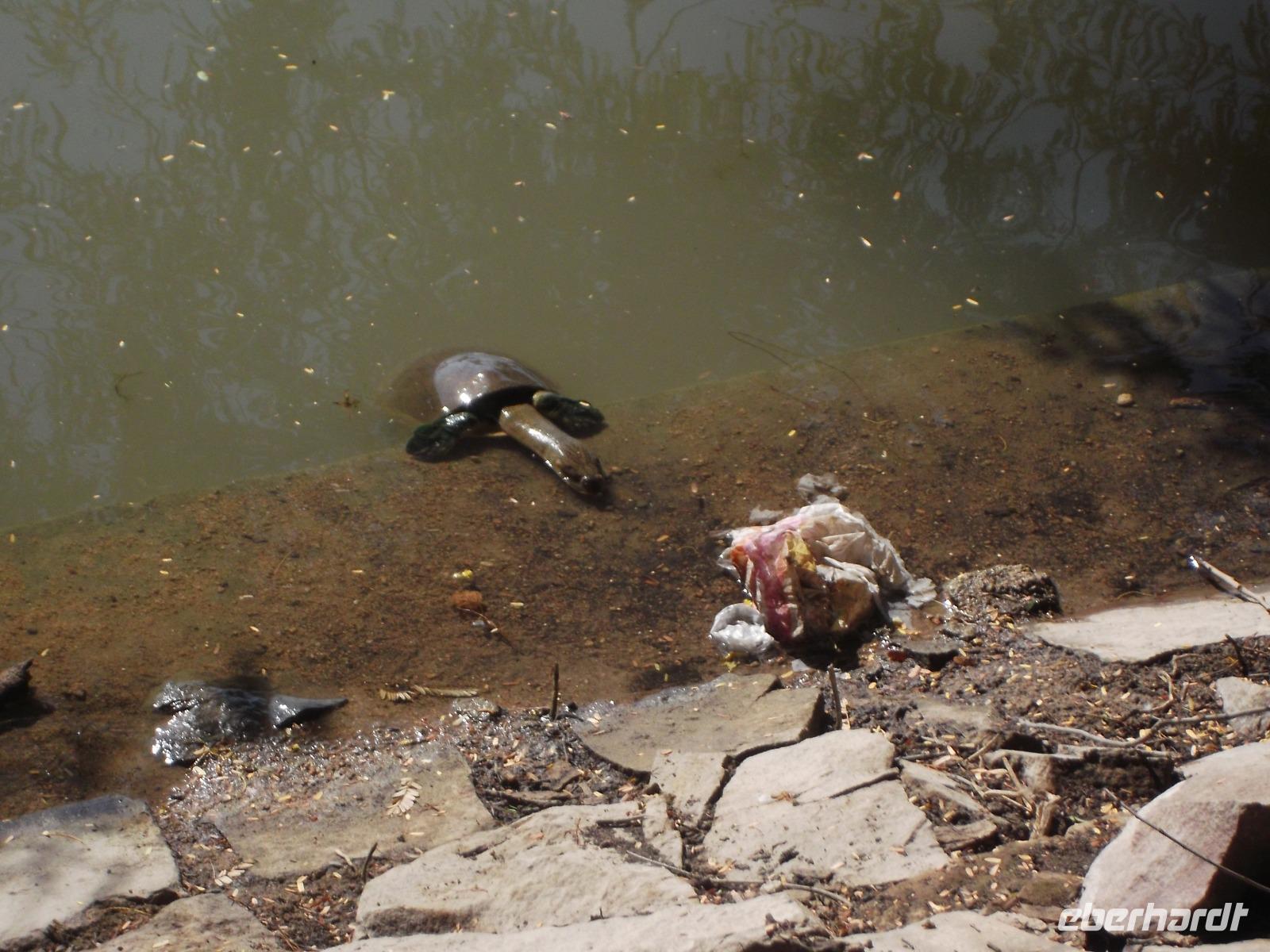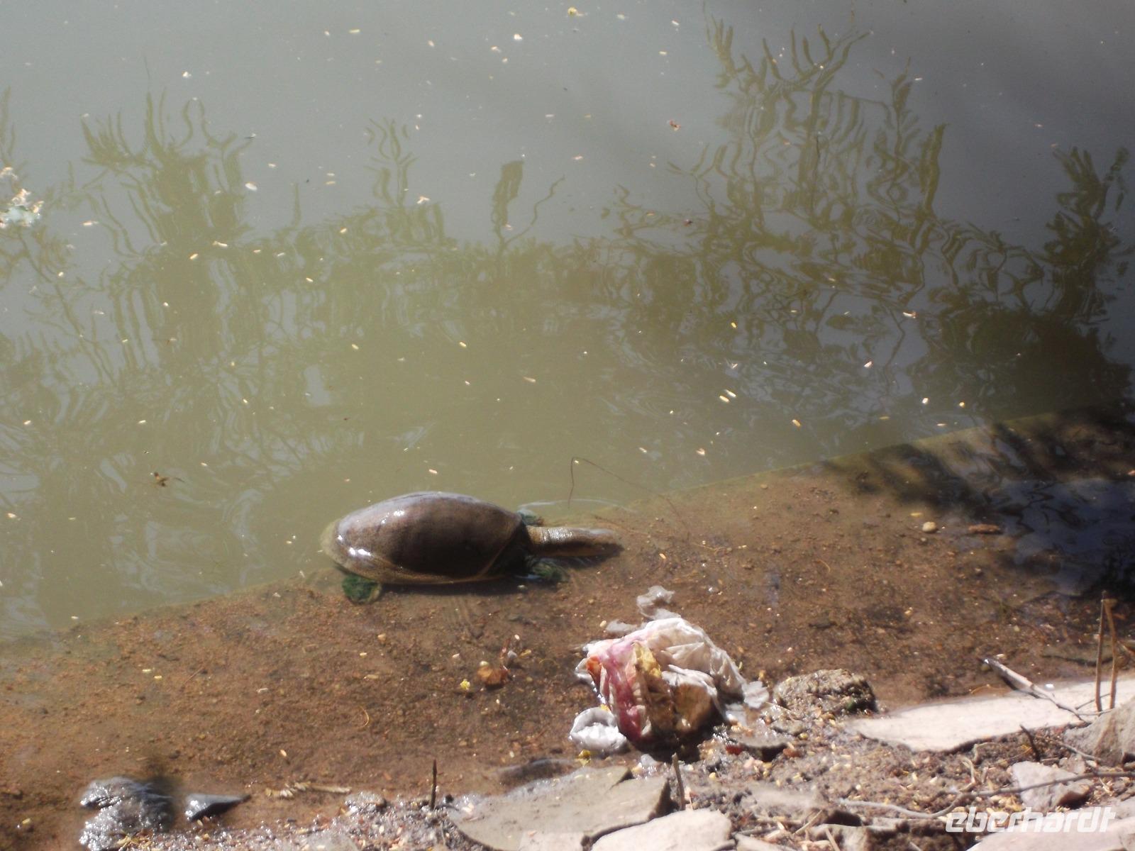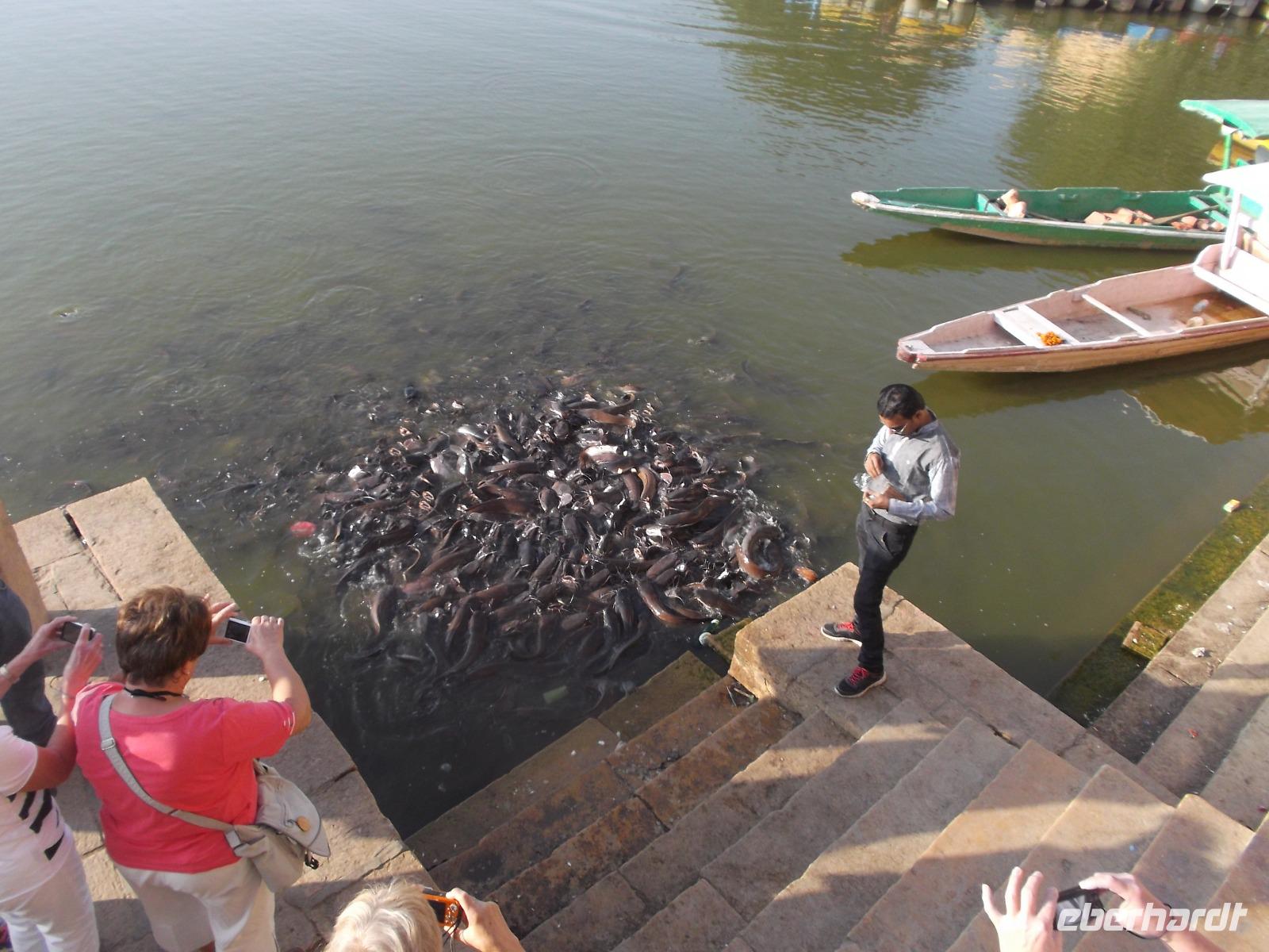 Zu Beginn des bevorstehenden ereignisreichen Tages brachte uns der Bus an den „heiligen" See vor den Toren Jaisalmers. Der „Gadi Sagar" wurde an einem Tempelkomplex als Monsunstausee mit altem Tor und einem Shivatempel angelegt. Eine Besonderheit sind die riesigen, in großen Mengen hier lebenden Welse, die man füttern kann und die dann in ihrer Gier nach Futter gewaltige Knäuel aus Fischleibern bildeten.