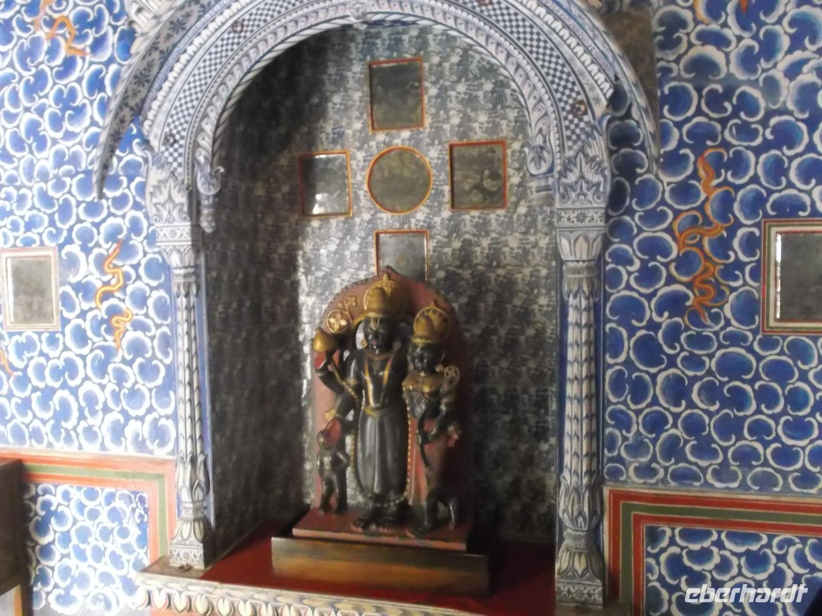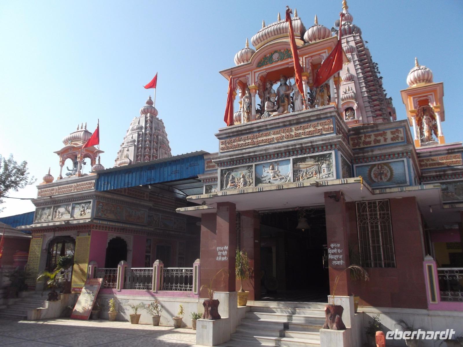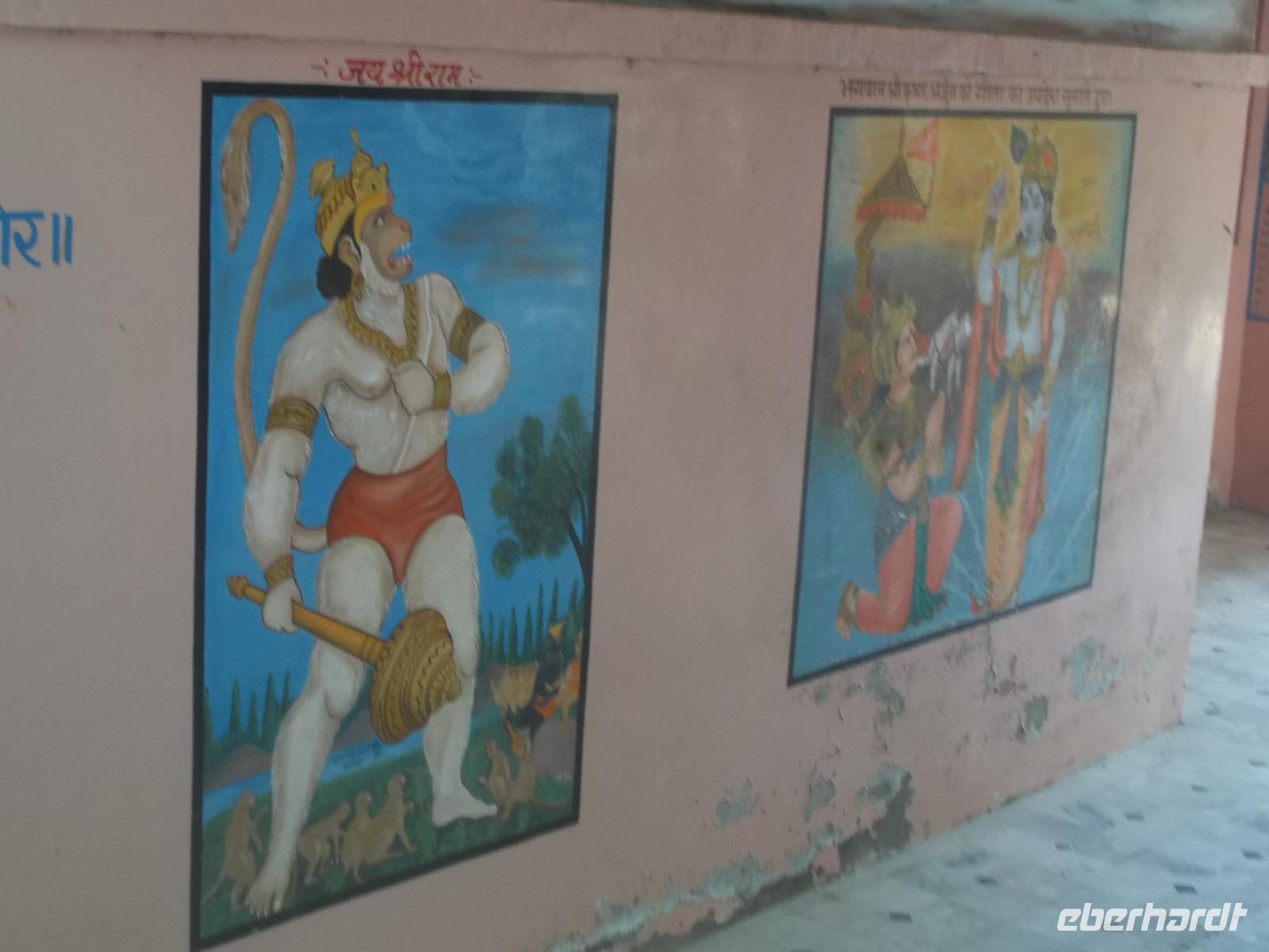 Für das Shekawati-Gebiet sind die bemalten Havelis als architektonische Besonderheiten und die rasch verblassende Schönheit ihrer bemalten Paläste ebenso typisch wie die Steppenbrunnen. Früher durch vier Säulen - als Anzeige „hier gibt es Wasser für Mensch und Tier" - gekennzeichnet, stehen die sogenannten „Harlakhas" in fast jedem Ort dieses Gebietes, da die meisten Ansiedlungen den Wasserstellen ihre Gründung verdanken. Das gilt auch für Nawalgarh, die Stadt, in der unser Ambiente-Hotel „Grand Haveli" stand. Einst nur ein Dorf mit Wasserstelle gewann der Ort durch die Zunahme des Karawanenhandels im 18. Jh. an Bedeutung und wurde zu einem Verkehrsknotenpunkt mit wachsender Einwohnerzahl. Bei einem Rundgang sahen wir einige der in dieser Zeit des Aufschwunges entstandenen Havelis und bemalten Innenhöfe, einen der besser erhaltenen Steppenbrunnen und machten noch einen Fotostopp an einem Hanuman Tempel, derdurch Aufbau und Bemalung eher südindisch als in diese Gegen d gehörend wirkte.