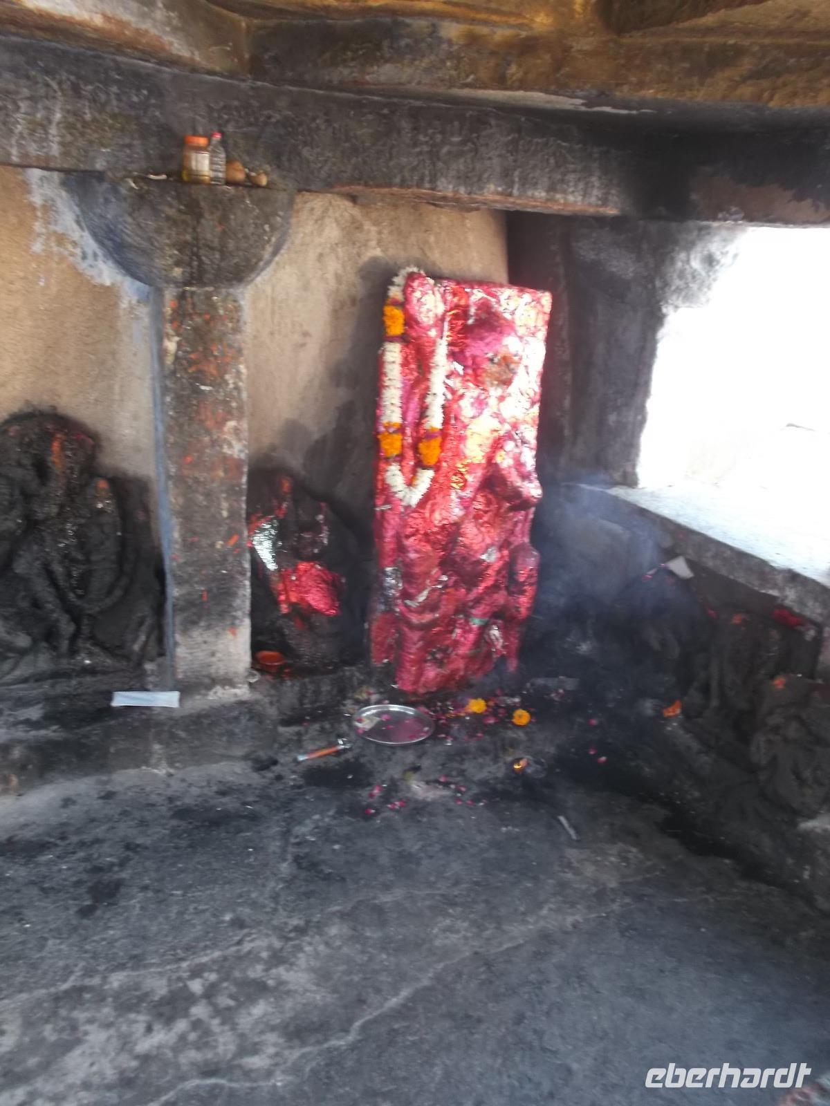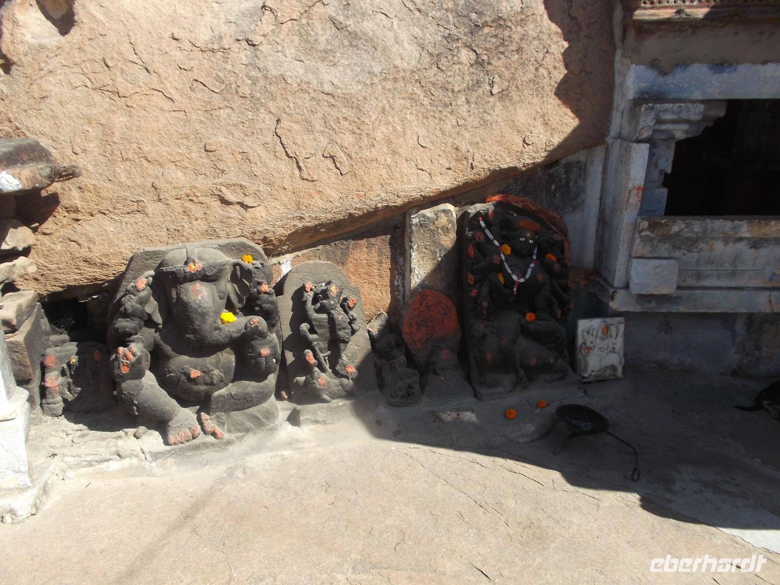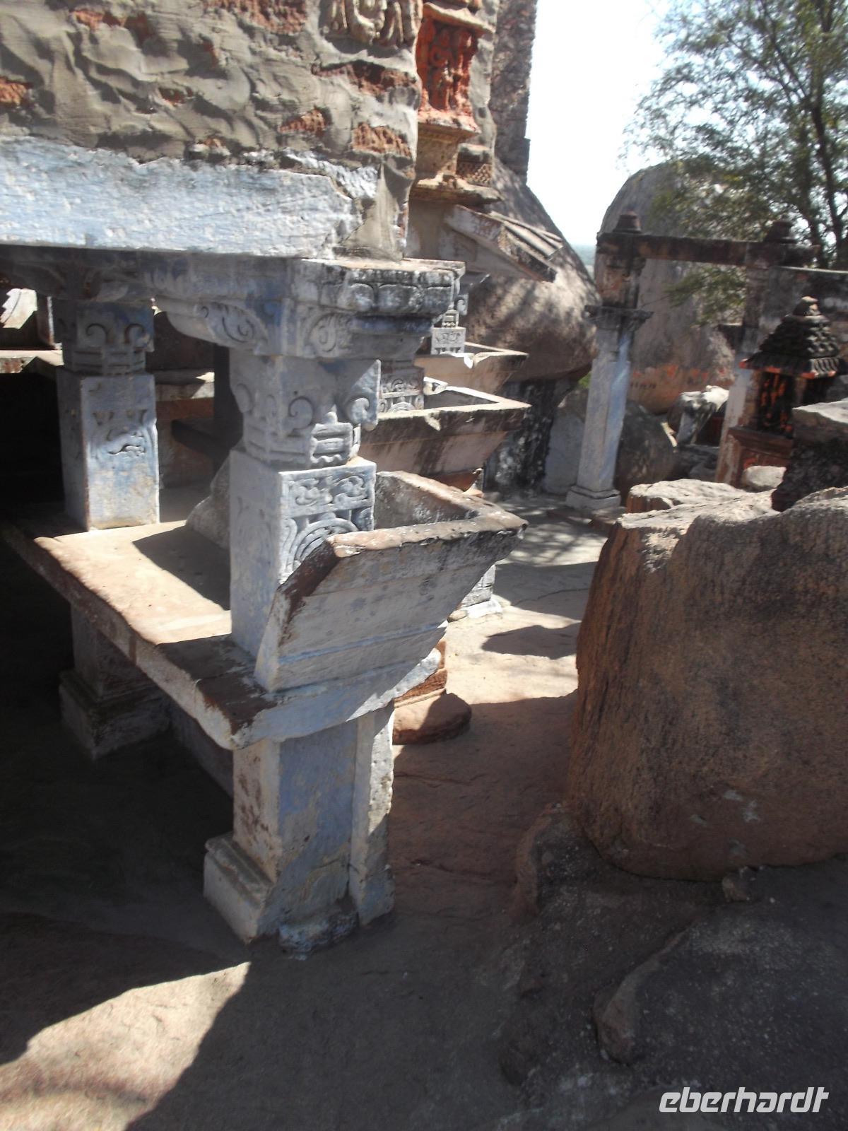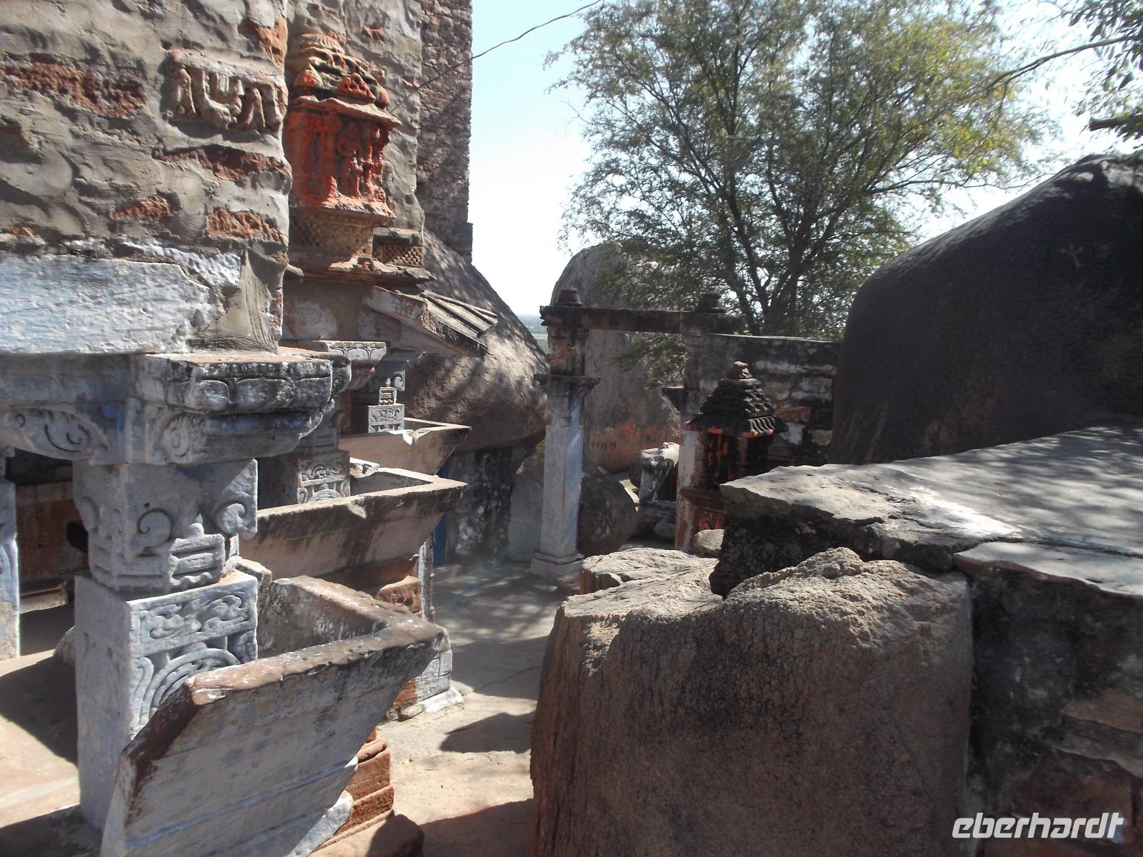 Unsere Jeepsafari endete an einem weithin sichtbaren, seit uralter Zeit genutzten Felsenheiligtum für die Mutter- und Fruchtbarkeitsgöttin Durga, in dem, aber auch andere Götter verehrt werden. Mehrere uralte Tempel und ihre teilweise bis zur Unkenntlichkeit mit Opfergaben verschmierten Reliefs bieten ein urwüchsiges Bild der immer noch überall herrschenden Religiosität der Hindus. Nach der Besichtigung konnten wir von der Aussichtsplattform des Heiligtums ein rustikales, als Picknick organisiertes Mittagessen genießen.