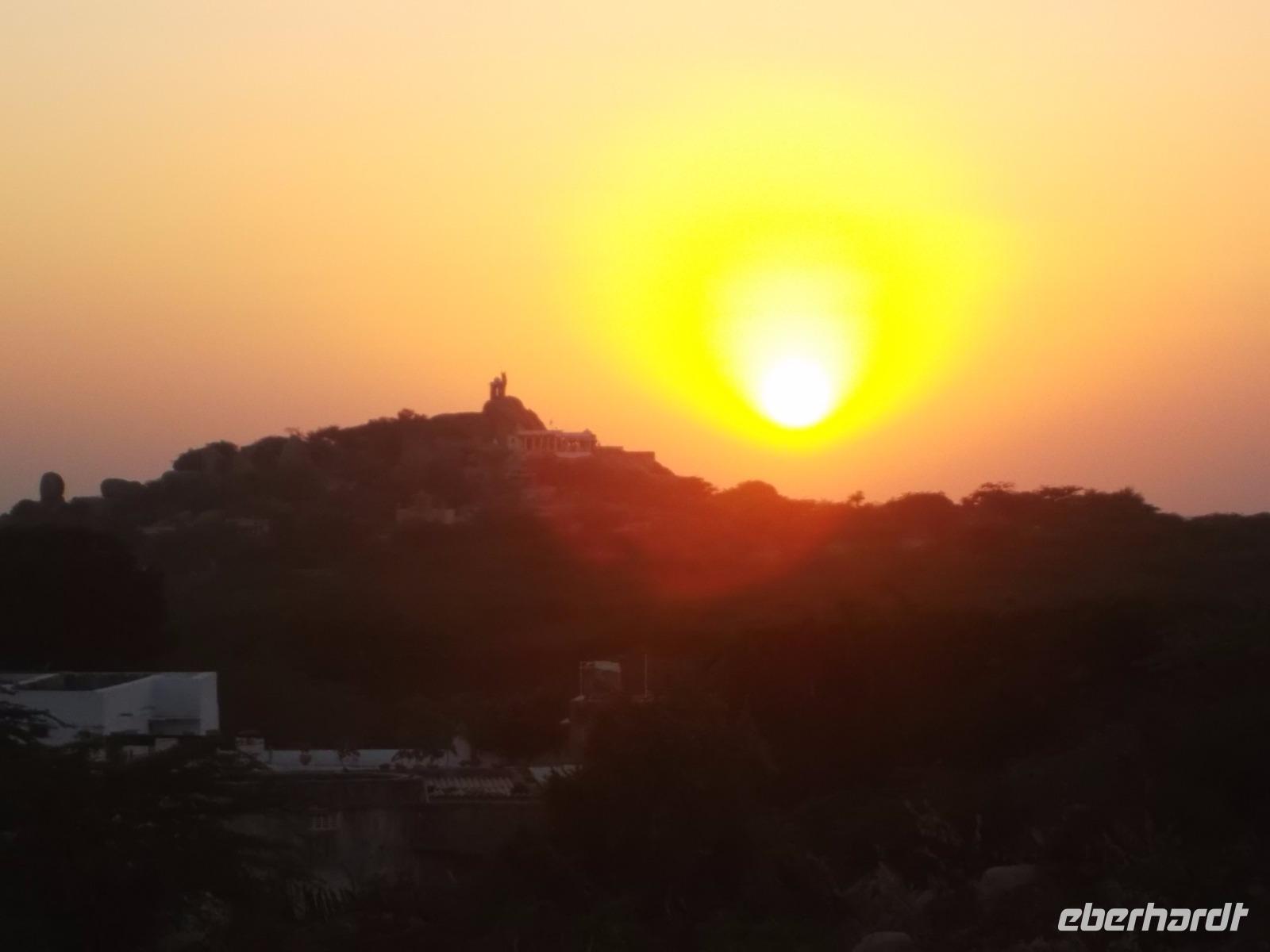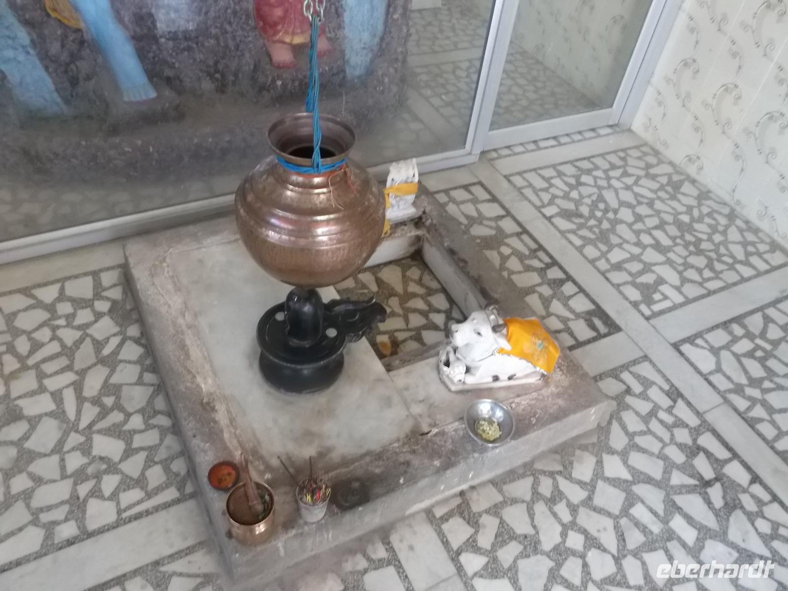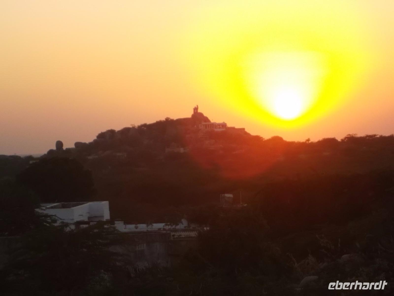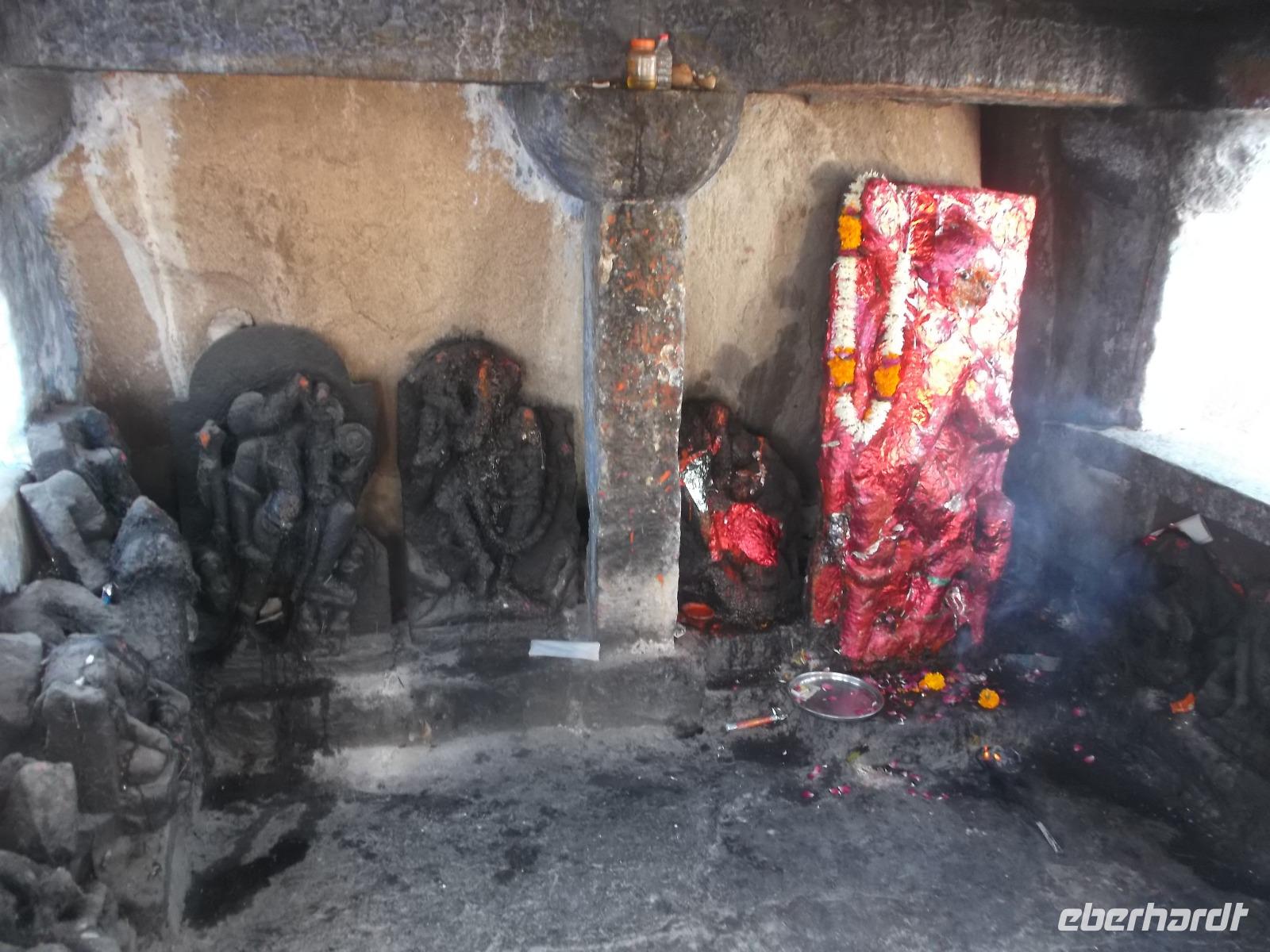 Unsere Jeepsafari endete an einem weithin sichtbaren, seit uralter Zeit genutzten Felsenheiligtum für die Mutter- und Fruchtbarkeitsgöttin Durga, in dem, aber auch andere Götter verehrt werden. Mehrere uralte Tempel und ihre teilweise bis zur Unkenntlichkeit mit Opfergaben verschmierten Reliefs bieten ein urwüchsiges Bild der immer noch überall herrschenden Religiosität der Hindus. Nach der Besichtigung konnten wir von der Aussichtsplattform des Heiligtums ein rustikales, als Picknick organisiertes Mittagessen genießen.