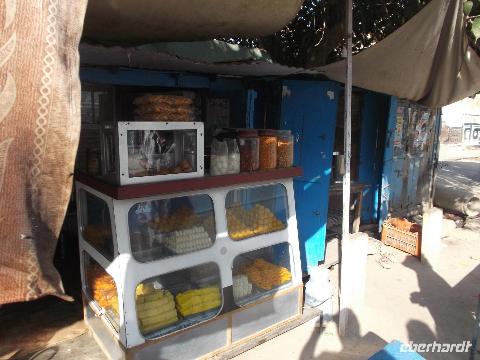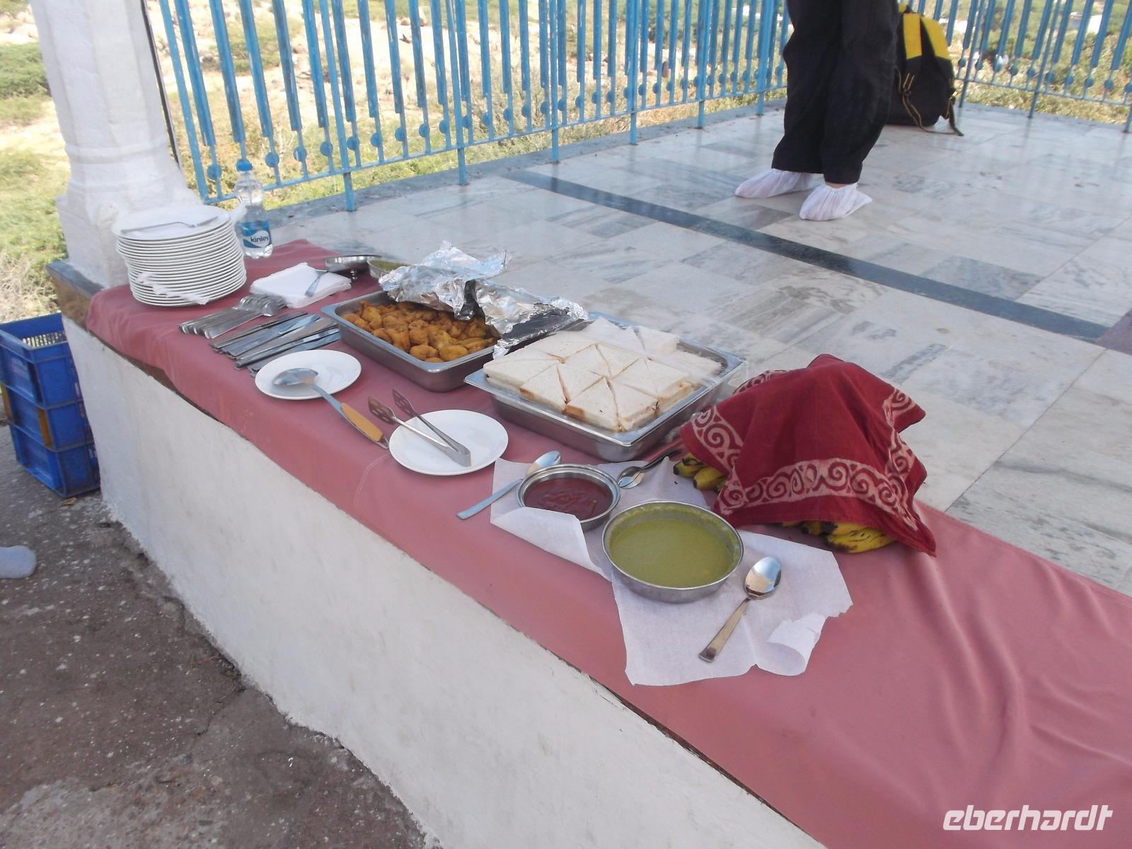 Da es inzwischen schon Mittagszeit war, holte zur Vermeidung langwieriger „Nahrungssuche" im Menschengewühl der fremden Stadt, Reiseleiter Ambrish indische Snacks, Bananen und Trinkwasser und den ersten Mittagsimbiss der Reise nahmen wir im klimatisierten Bus ein.