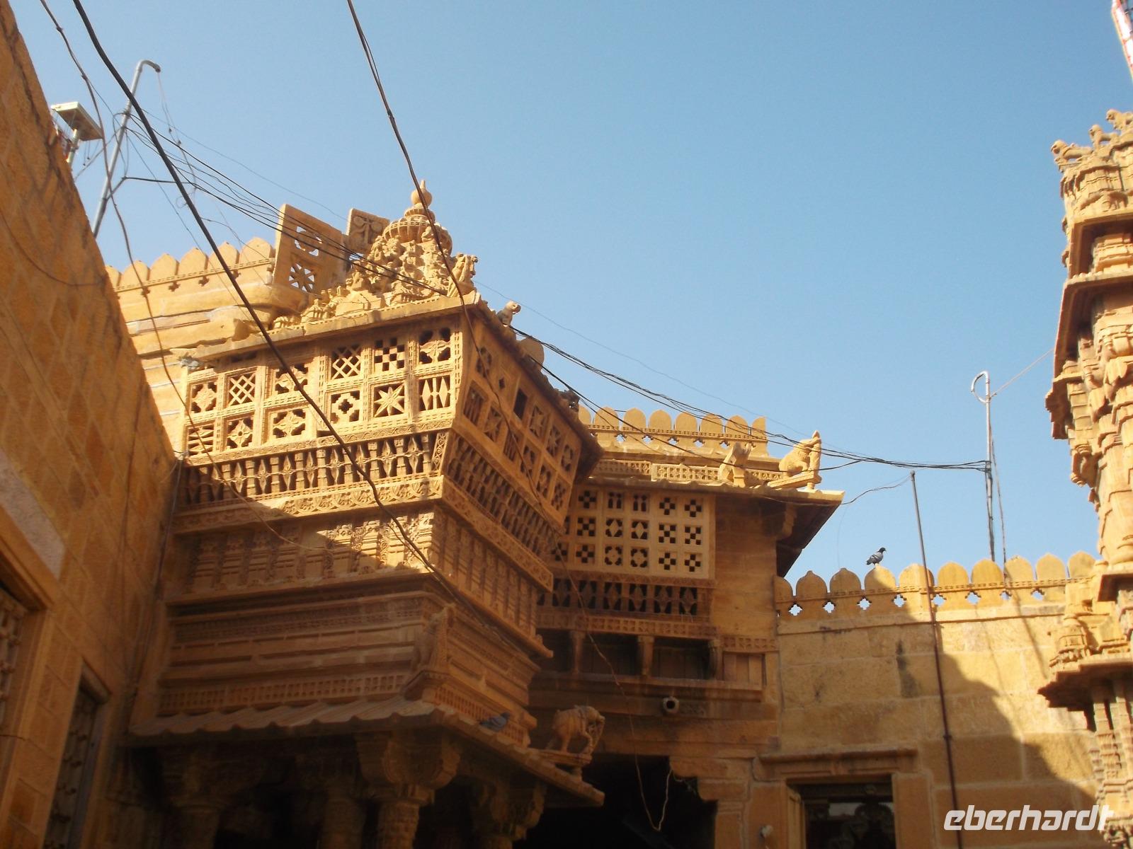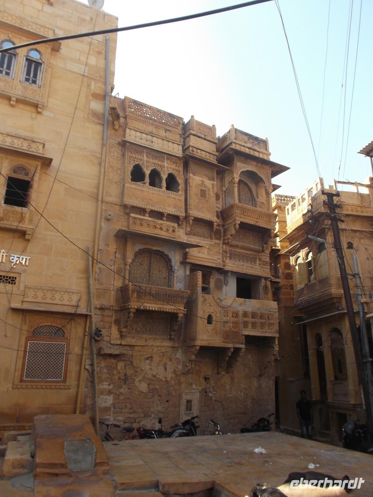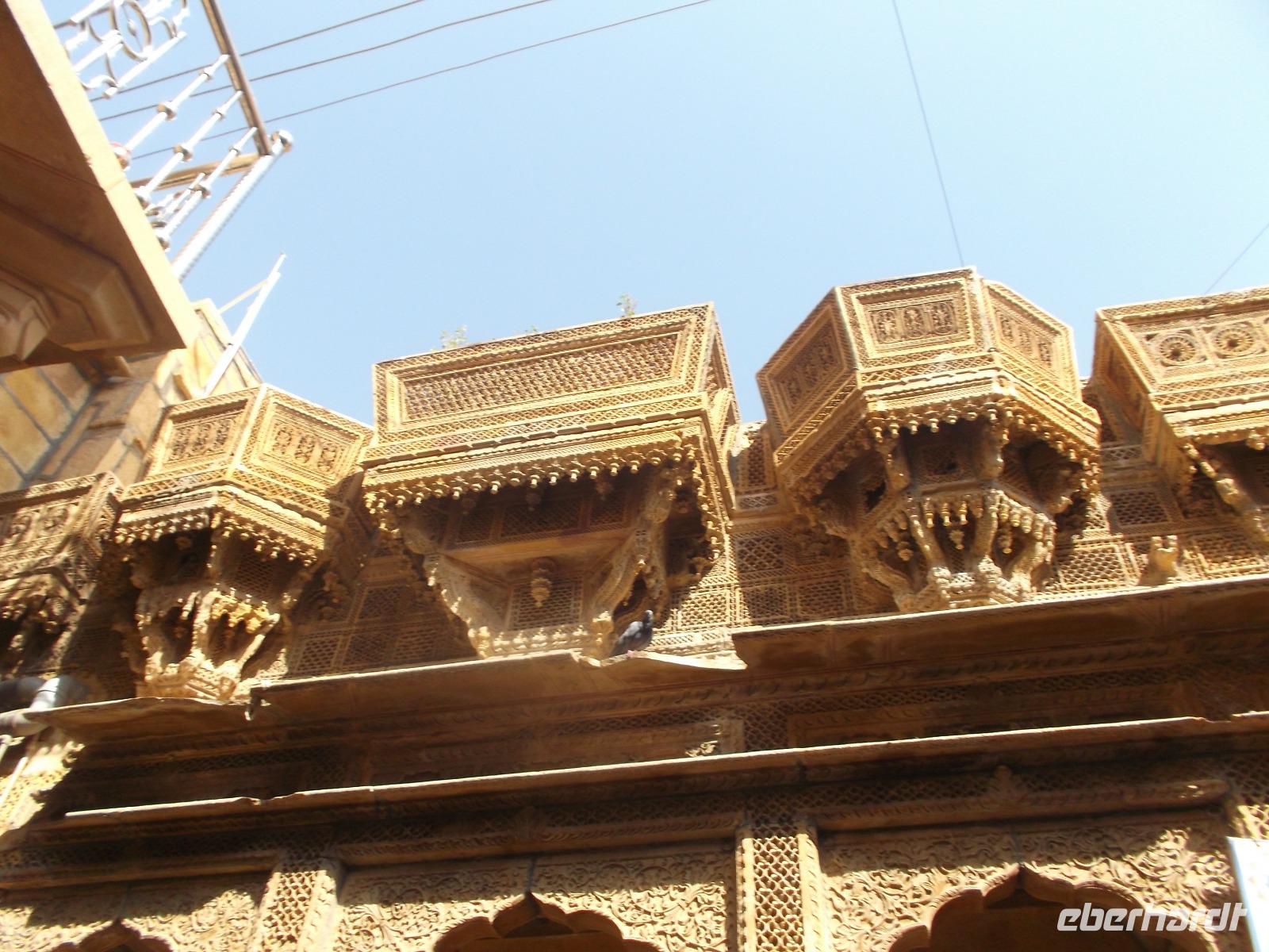 Vom See aus fuhren wir bis zum Fuß der Zitadelle. Diese bildet die Altstadt von Jaisalmer, die man auch „Goldene Stadt" nennt. Der Name für den Ort, der in Verbindung zur historischen Seidenstraße steht, stammt wohl von dem hier bevorzugten Baumaterial, dem honigfarbenen Sandstein. Die Mauern und auch die 99 Türme der Altstadtzitadelle sind aus ihm errichtet worden. Zusammen mit weiteren Festungen - Chittaurgarh und Jaipur hatten wir schon gesehen - wurde Jaisalmer 2013 in die Liste des UNESCO-Weltkulturerbes aufgenommen. Derzeit ist der Ort gerade wegen seines mittelalterlichen Erscheinungsbildes gefährdet - weil das uralte Abwassersystem die Wassermengen eines ergiebigen Monsunjahres nicht mehr fassen kann, werden die historischen Gemäuer unterspült und gerade im vergangenen Jahr sind einige eingestürzt. Wie Chittaurgarh ist Jaisalmer eine der größten, bis heute ununterbrochen bewohnten Festungen der Welt. Wir erreichten noch vor Beginn der großen Tageshitze die Türme und doppelten Mauern der Altstadt-Zitadelle und betraten die von mehrere Dutzend Meter hohen Mauern umgebene Festungsstadt durch ihr beeindruckendes Sytem aufeinanderfolgender Tore an steiler Zufahrtsstraße. Bei der folgenden Besichtigung der Altstadt machten wir unter anderem die Erfahrung, wie es ist, wenn heilige Kühe im Gegenverkehr herankommen. Jaisalmer bietet eine Unmenge Fotomotive - insbesondere die herrlichen geschnitzten Sandsteinfassaden ihrer Wohnhäuser. Nahezu jeder Schritt machte die Stadtführung im Festungsinneren, die mit Blick auf den Stadtpalast begann und beendete - zu einem Erlebnis. Nach etwas Freizeit auf dem Zitadellenplatz widmeten wir uns der Neustadt mit ihren „Havelis", die einst Paläste reicher Händler, mitunter auch Verwaltungsangestellter, Offiziere oder Adeliger waren. Sie wurden auf einzigartige Weise mit wie Holzschnitzerei wirkenden filigran geschmückten Sandsteinfassaden voll kunstvoller Kerbschnitzerei verziert.