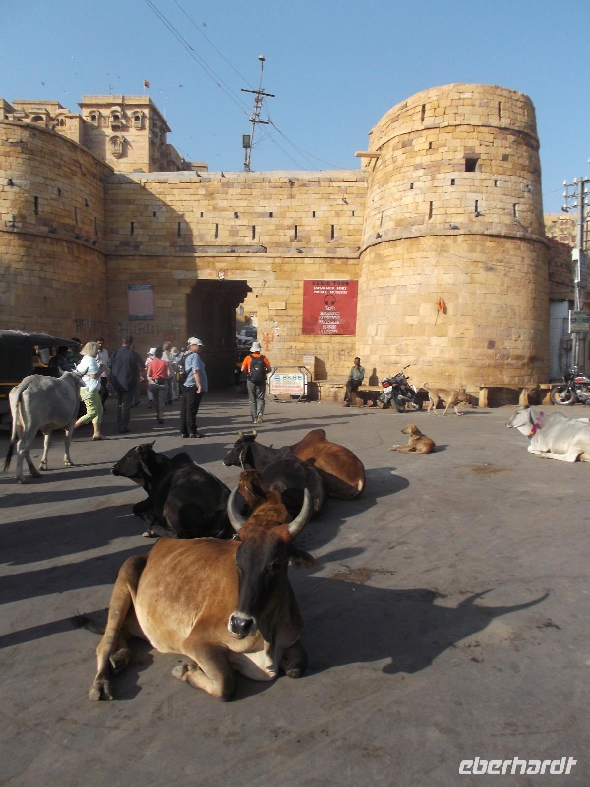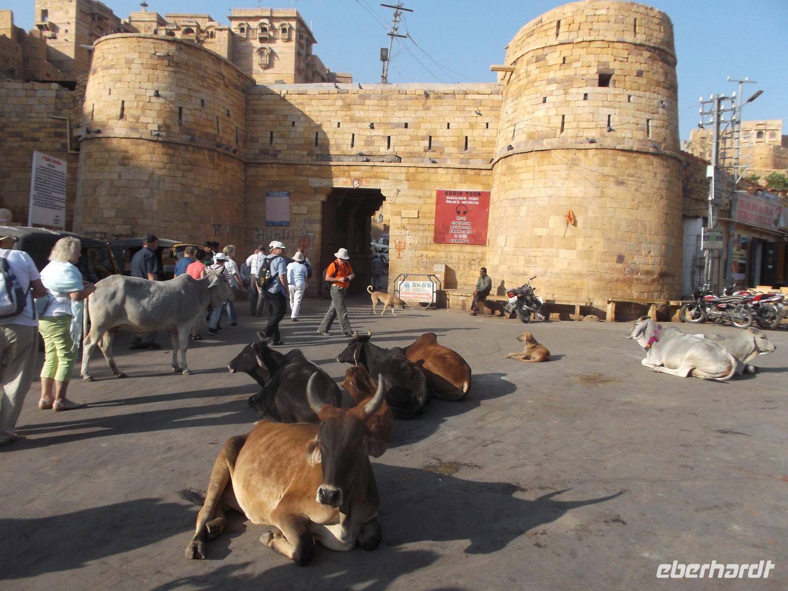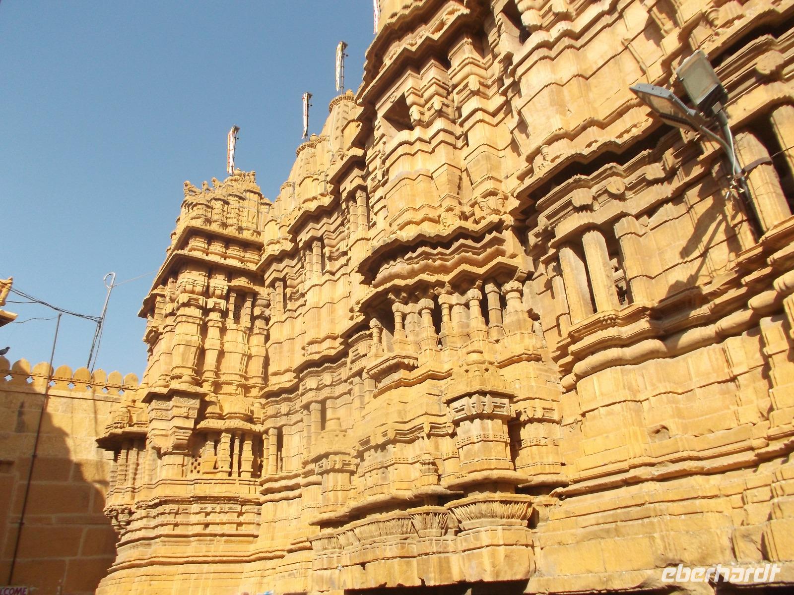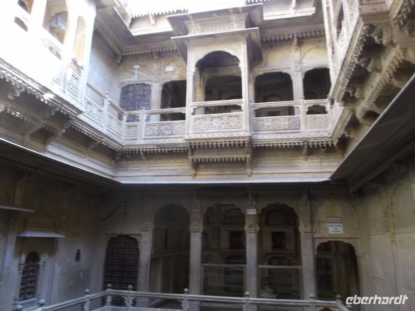 Vom See aus fuhren wir bis zum Fuß der Zitadelle. Diese bildet die Altstadt von Jaisalmer, die man auch „Goldene Stadt" nennt. Der Name für den Ort, der in Verbindung zur historischen Seidenstraße steht, stammt wohl von dem hier bevorzugten Baumaterial, dem honigfarbenen Sandstein. Die Mauern und auch die 99 Türme der Altstadtzitadelle sind aus ihm errichtet worden. Zusammen mit weiteren Festungen - Chittaurgarh und Jaipur hatten wir schon gesehen - wurde Jaisalmer 2013 in die Liste des UNESCO-Weltkulturerbes aufgenommen. Derzeit ist der Ort gerade wegen seines mittelalterlichen Erscheinungsbildes gefährdet - weil das uralte Abwassersystem die Wassermengen eines ergiebigen Monsunjahres nicht mehr fassen kann, werden die historischen Gemäuer unterspült und gerade im vergangenen Jahr sind einige eingestürzt. Wie Chittaurgarh ist Jaisalmer eine der größten, bis heute ununterbrochen bewohnten Festungen der Welt. Wir erreichten noch vor Beginn der großen Tageshitze die Türme und doppelten Mauern der Altstadt-Zitadelle und betraten die von mehrere Dutzend Meter hohen Mauern umgebene Festungsstadt durch ihr beeindruckendes Sytem aufeinanderfolgender Tore an steiler Zufahrtsstraße. Bei der folgenden Besichtigung der Altstadt machten wir unter anderem die Erfahrung, wie es ist, wenn heilige Kühe im Gegenverkehr herankommen. Jaisalmer bietet eine Unmenge Fotomotive - insbesondere die herrlichen geschnitzten Sandsteinfassaden ihrer Wohnhäuser. Nahezu jeder Schritt machte die Stadtführung im Festungsinneren, die mit Blick auf den Stadtpalast begann und beendete - zu einem Erlebnis. Nach etwas Freizeit auf dem Zitadellenplatz widmeten wir uns der Neustadt mit ihren „Havelis", die einst Paläste reicher Händler, mitunter auch Verwaltungsangestellter, Offiziere oder Adeliger waren. Sie wurden auf einzigartige Weise mit wie Holzschnitzerei wirkenden filigran geschmückten Sandsteinfassaden voll kunstvoller Kerbschnitzerei verziert.