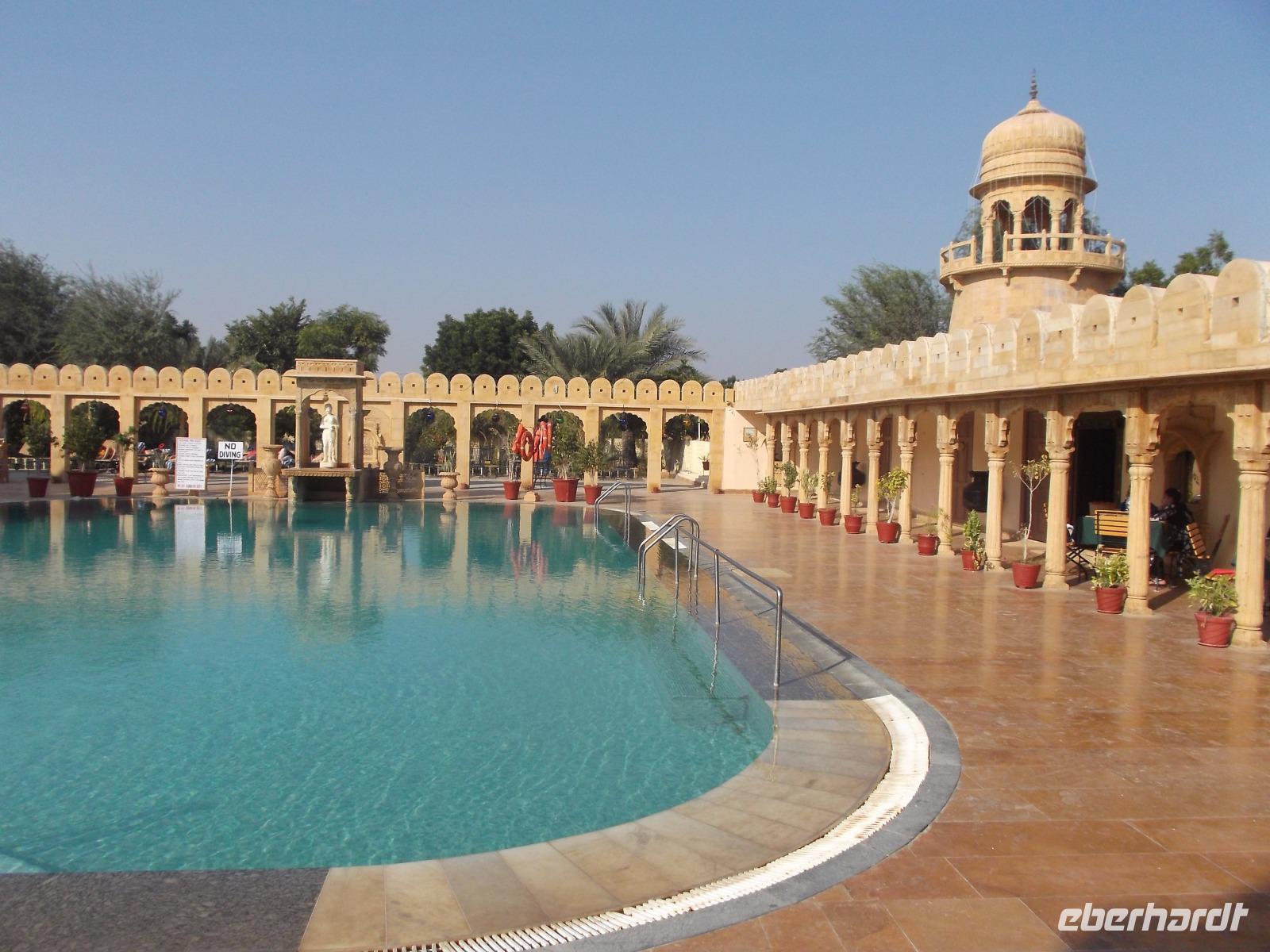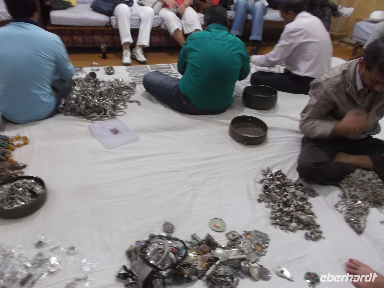 Vor Rückkehr ins Hotel zur „Mittagsruhe" kehrten wir noch bei einem Silberschmied ein und begutachteten zahlreiche Ergebnisse der hier in Jaisalmer beheimateten filigranen Kunst der Silberbearbeitung. Dann kehrten wir ins Hotel zurück, um vor den „Abend-Aktivitäten" in Ruhe eine längeren Mittagspause oder ein Bad im Pool zu genießen.