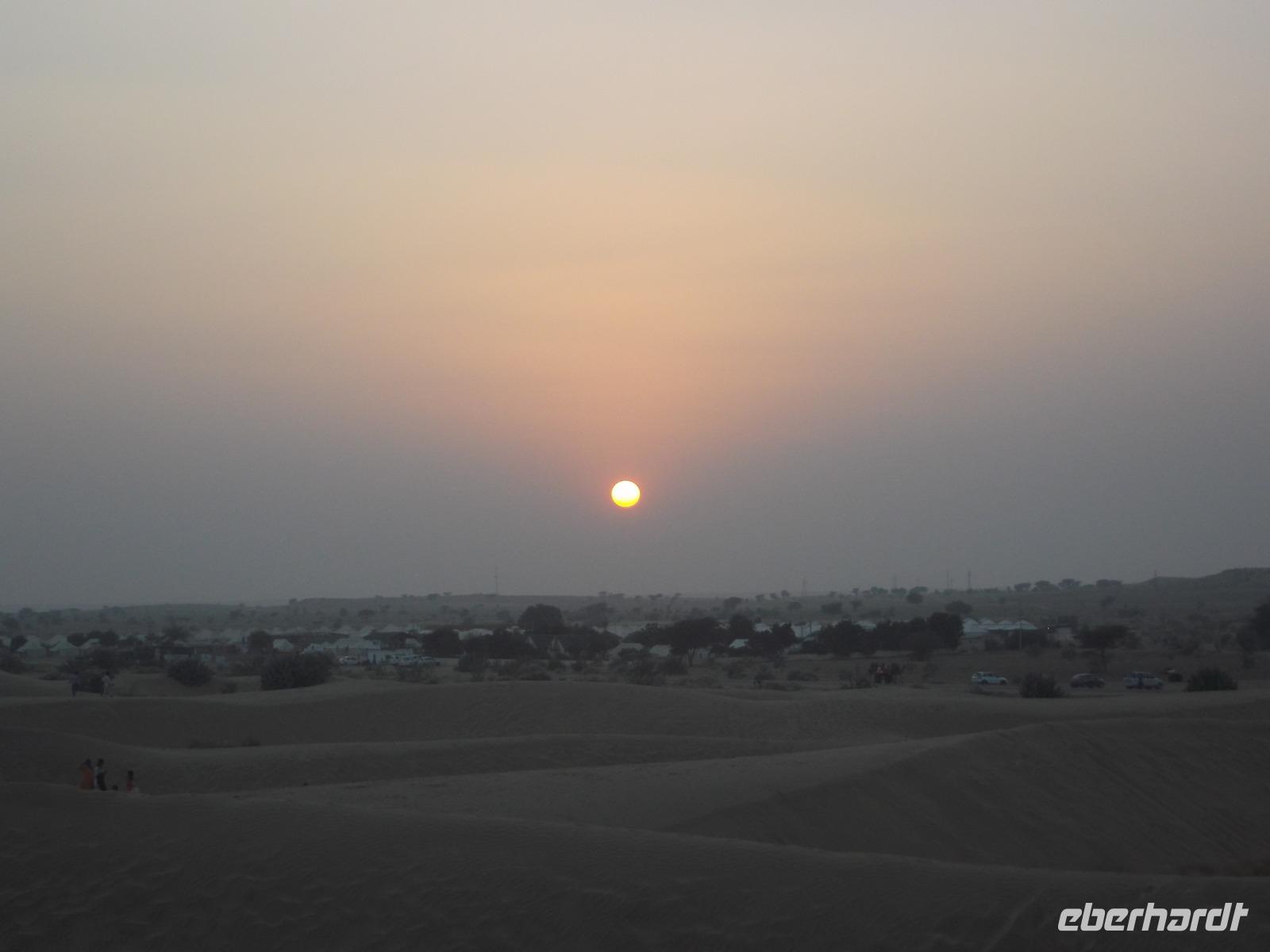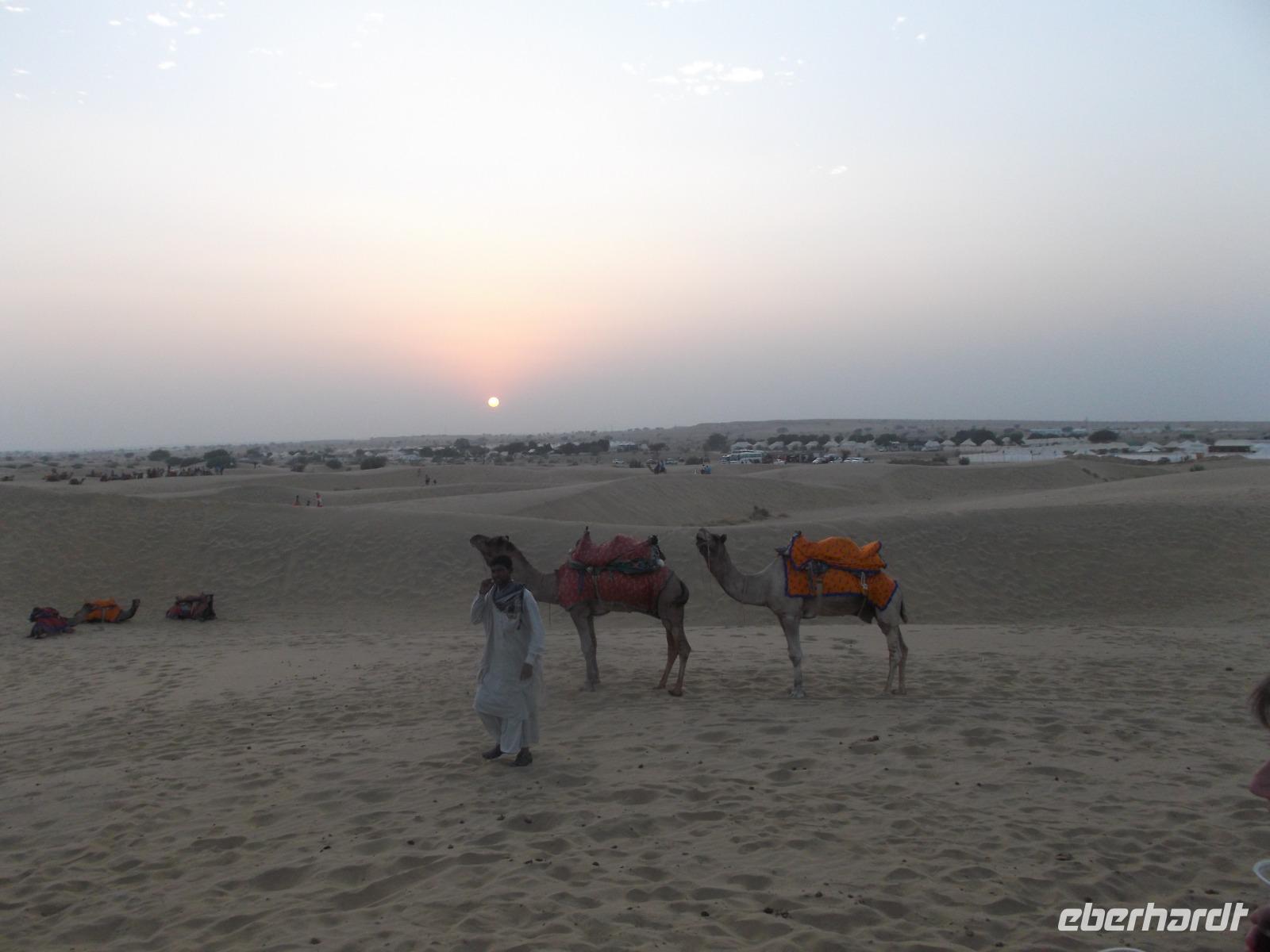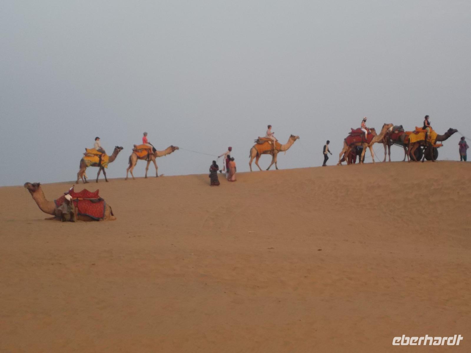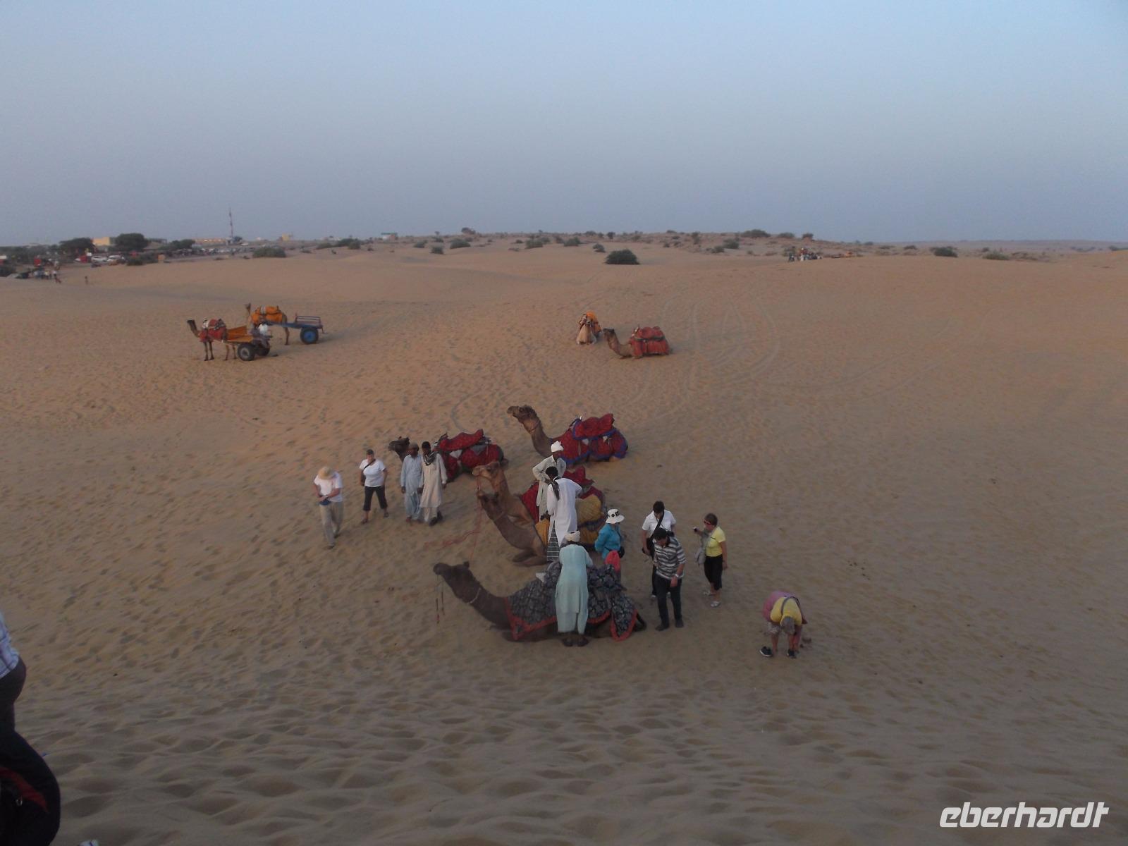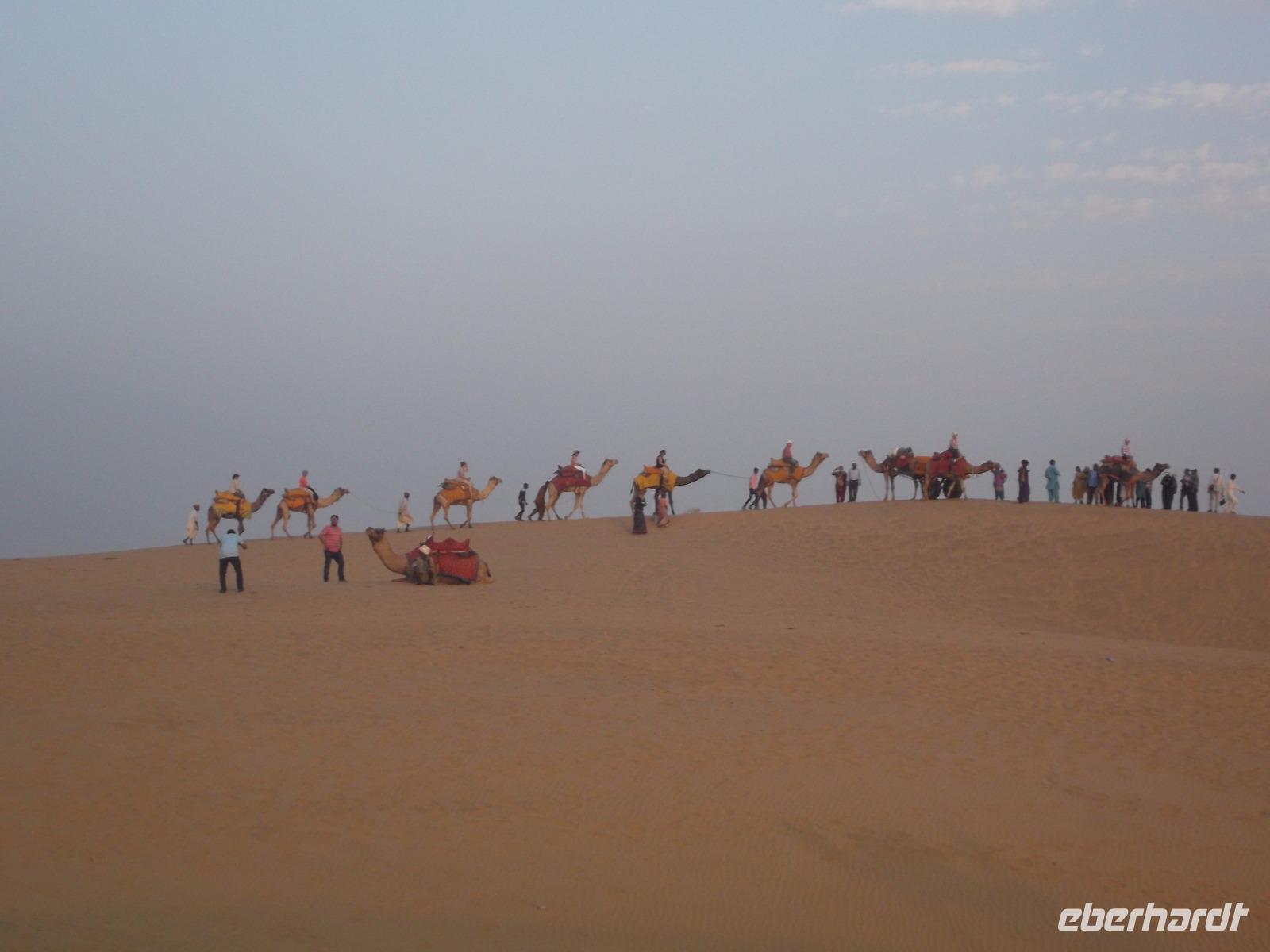 Nachmittags ging es dann zum Kamelritt in Richtung pakistanische Grenze. Die für dieses Ereignis prädestinierten Sanddünen bei Sam liegen im Herz der Wüste Thar, deren Größe mit der Rumäniens vergleichbar ist und die gewiss zu den unwirtlichsten Gebieten des indischen Subkontinents gehört.