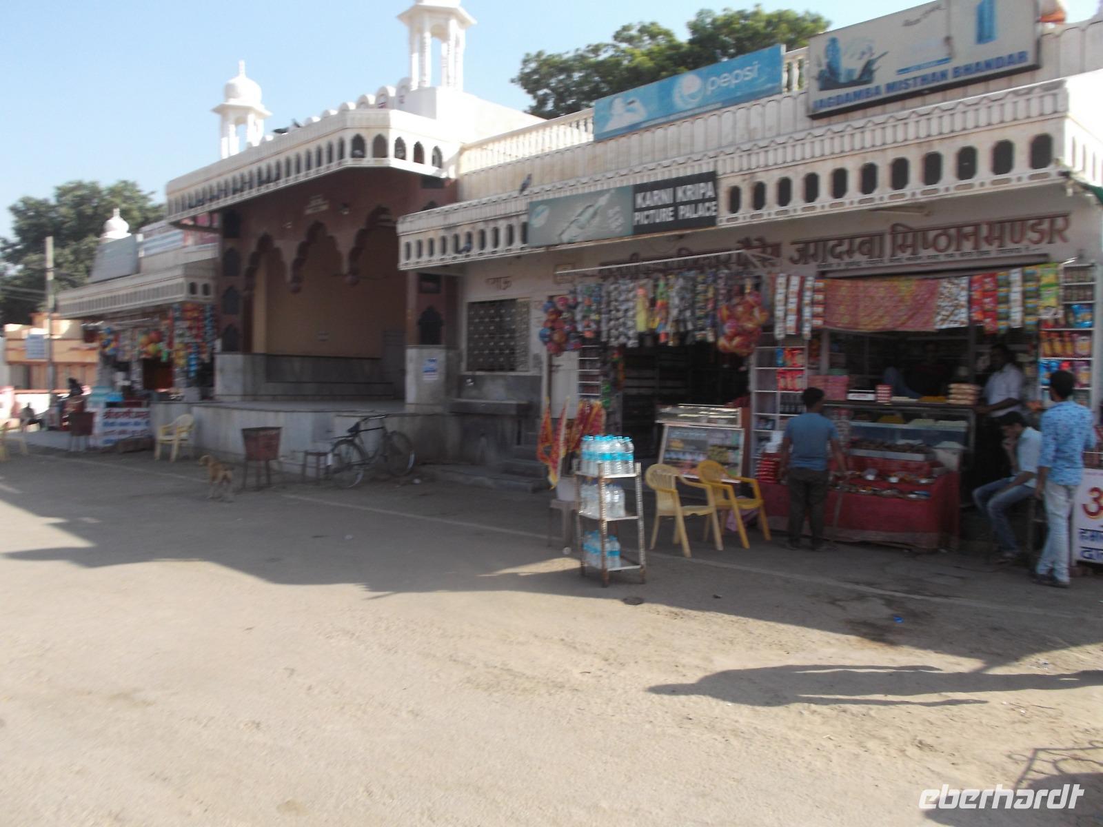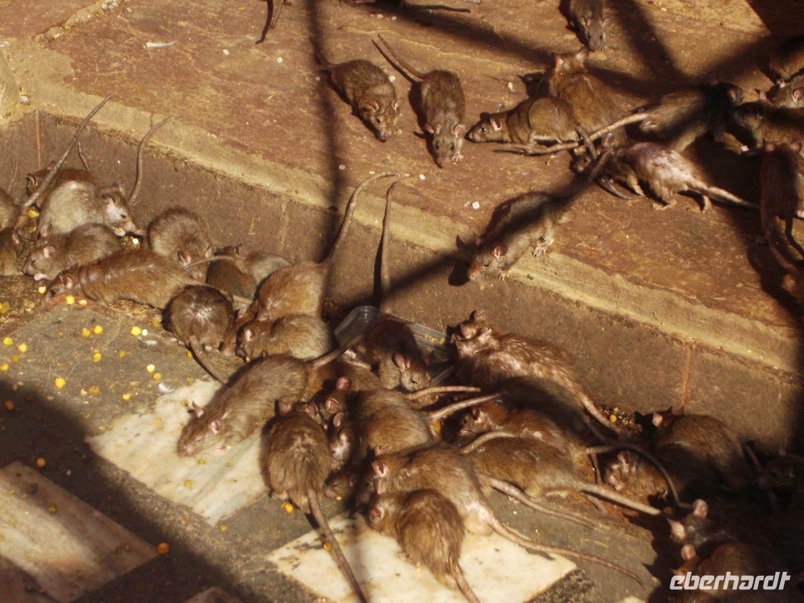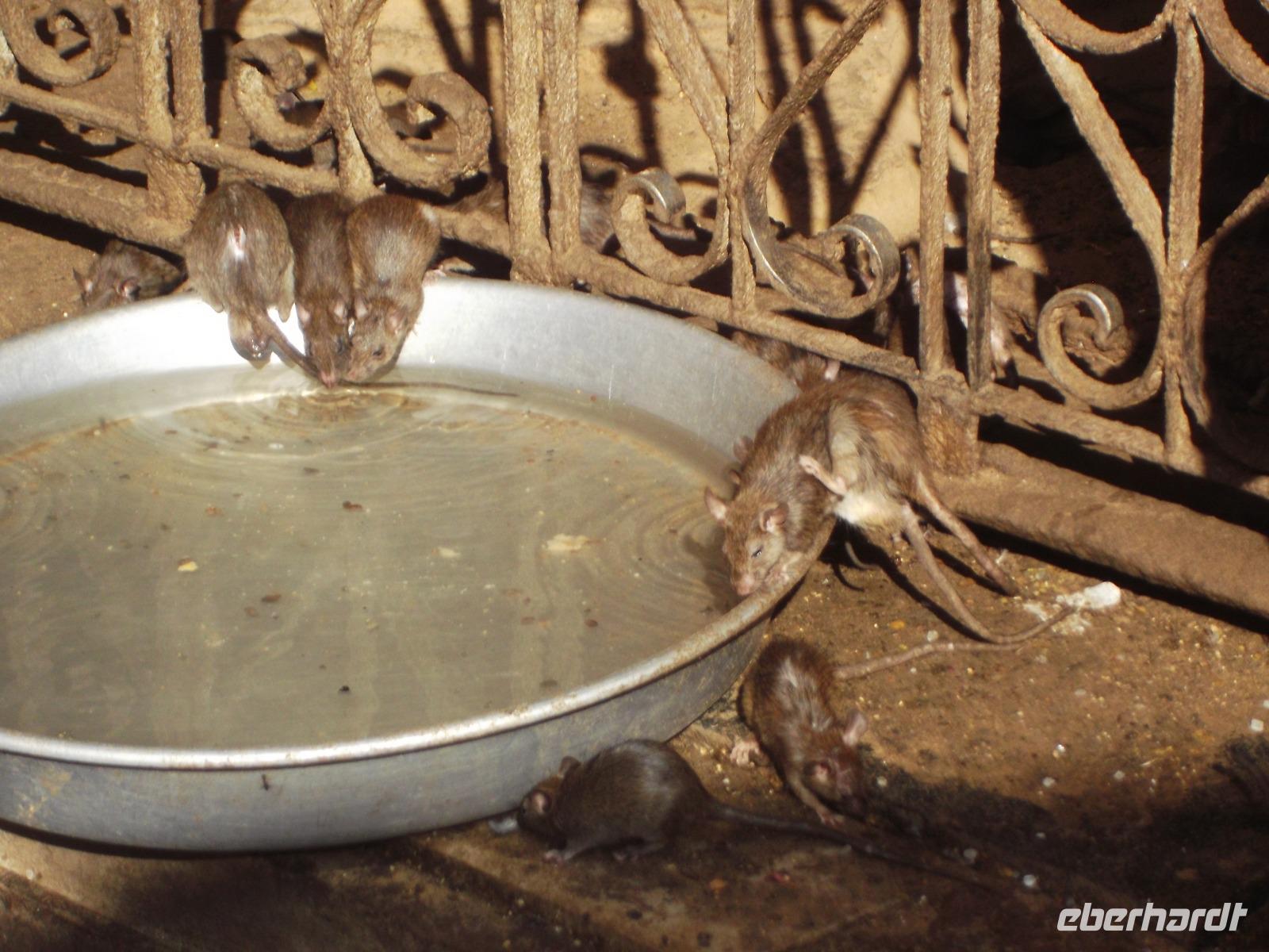 Erst nach dem Mittagessen erreichten wir die alte Stadt Deshnok, um hier einen stets viel diskutierten Programmpunkt zu erleben: die Besichtigung des Rattentempels. Gewiss ist dieses exotische Heiligtum nicht jedermanns Sache und so ist niemand zum Besuch gezwungen, sondern wir haben wir ihn „fakultativ" eingebaut. Der „Rattentempel", gewidmet einer Inkarnation der Mutterrgottheit Durga, ist nicht nur in ganz Indien bekannt, sondern durch den Tourismus auch weit über die Landesgrenzen hinaus. Bei zahllosen Pilgern das ganze Jahr über beliebt, ist der Besuch hier für gläubige Hindus fast ein „Muss", denn im Tempel der „Karni Mata", wo etwa zwanzigtausend freilaufende Ratten zu finden sind, wird eine Inkarnation der Fruchtbarkeit verehrt. Die Legende berichtet, dass die Ratten als Dichter wiedergeboren werden könnten - was ihre Verehrung erhöht. Zudem gehört zum Hinduglauben die Verehrung jeglicher Art von Leben und Ratten werden daher hier positiver gesehen als in Europa, auch wenn es viele Menschen gibt, die sie zu Hause auch nicht besonders mögen... Die meisten unserer Mitreisenden ließen sich nicht abschrecken und haben sich den Tempel mit seinen eher possierlichen Ratten - die sind zumindest hier kleiner als bei uns! - angesehen.
