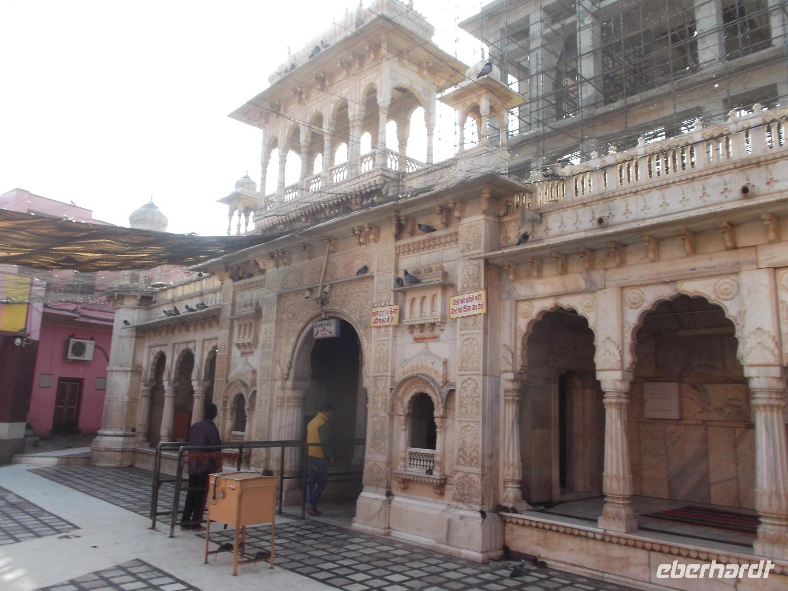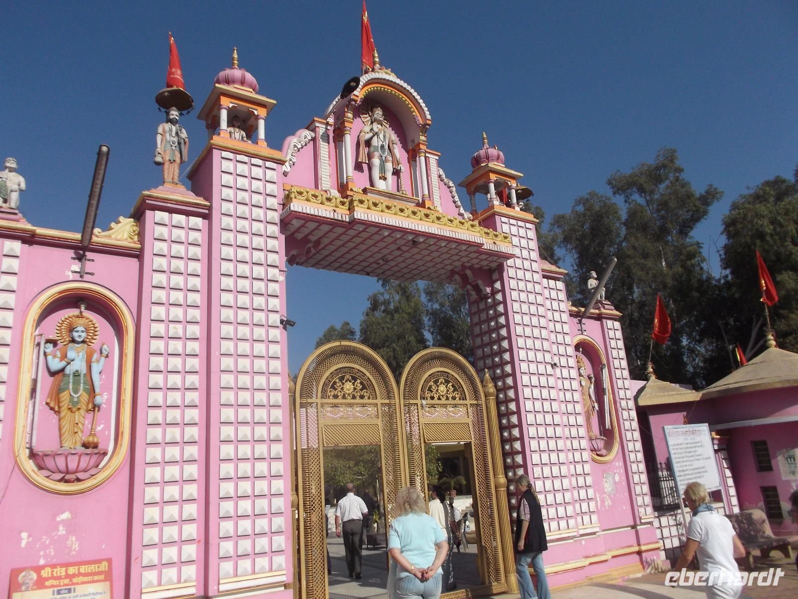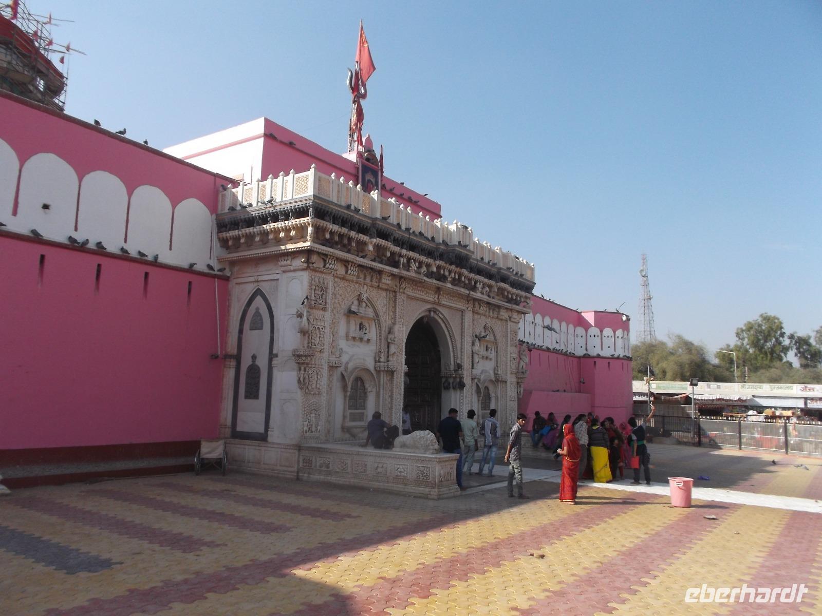 Erst nach dem Mittagessen erreichten wir die alte Stadt Deshnok, um hier einen stets viel diskutierten Programmpunkt zu erleben: die Besichtigung des Rattentempels. Gewiss ist dieses exotische Heiligtum nicht jedermanns Sache und so ist niemand zum Besuch gezwungen, sondern wir haben wir ihn „fakultativ" eingebaut. Der „Rattentempel", gewidmet einer Inkarnation der Mutterrgottheit Durga, ist nicht nur in ganz Indien bekannt, sondern durch den Tourismus auch weit über die Landesgrenzen hinaus. Bei zahllosen Pilgern das ganze Jahr über beliebt, ist der Besuch hier für gläubige Hindus fast ein „Muss", denn im Tempel der „Karni Mata", wo etwa zwanzigtausend freilaufende Ratten zu finden sind, wird eine Inkarnation der Fruchtbarkeit verehrt. Die Legende berichtet, dass die Ratten als Dichter wiedergeboren werden könnten - was ihre Verehrung erhöht. Zudem gehört zum Hinduglauben die Verehrung jeglicher Art von Leben und Ratten werden daher hier positiver gesehen als in Europa, auch wenn es viele Menschen gibt, die sie zu Hause auch nicht besonders mögen... Die meisten unserer Mitreisenden ließen sich nicht abschrecken und haben sich den Tempel mit seinen eher possierlichen Ratten - die sind zumindest hier kleiner als bei uns! - angesehen.