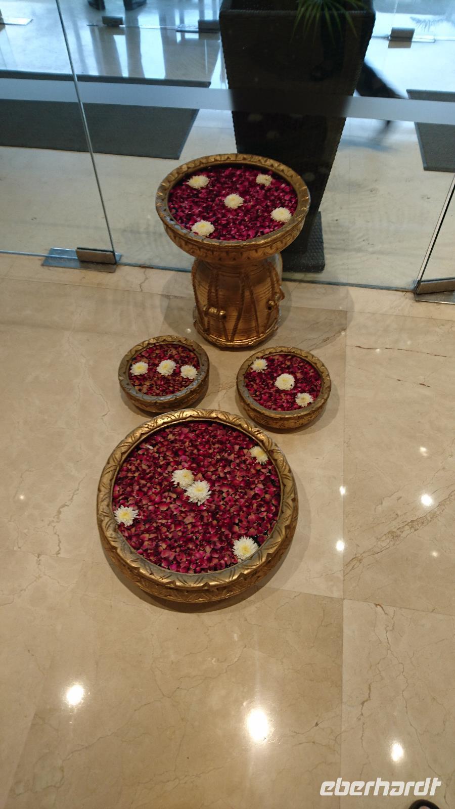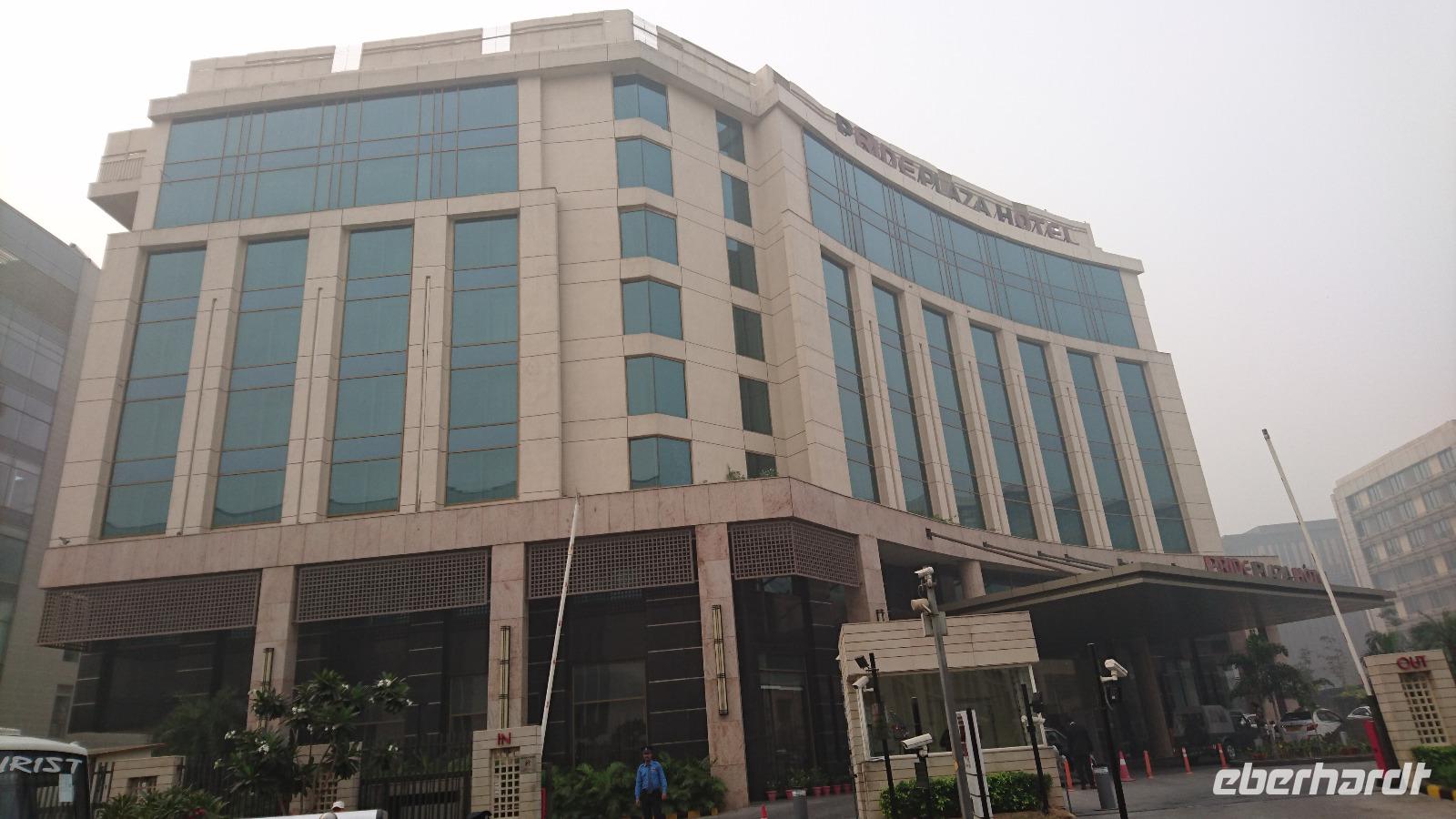 Vor der Besichtigung steht stets das Ankommen. Bereits im Flieger füllten wir, dank Stefans Hinweisen, die Einreiseformulare aus und konnten so gemeinsam als Gruppe bald nach der Landung in Richtung des Immigrations-Bereiches gehen. Wie immer in Delhi, taten dies hunderte andere ankommende Fluggäste mit uns gemeinsam und so dauerte es verständlicherweise etwas, bis wir unsere Fingerabdrücke einscannen und unseren Einreisestempel abholen konnten. Danach bekamen wir die bereits sichergestellten Koffer und wurden von Stefan zu einem der Geldwechselschalter geleitet, wo wir zu einem für diesen tag gültigen günstigen Umtauschkurs erst einmal Bargeld für die ersten Stunden oder Tage eintauschen konnten, ehe uns vor dem Sicherheitsbereich der Ankunftshalle Kamal von der indischen Partner-Agentur von Eberhardt Travel empfing und gemeinsam mit Stefan zu unserem uns nun die kommenden Tage begleitenden Bus geleitete. Wenig später legte er uns Blumenketten um und hieß uns im Bus herzlich in Indien willkommen. Die Fahrt zum Hotel dauerte nicht all zu lange. Ein Glück! Etwas spürten wir bereits die Zeitverschiebung und das sicher nicht unbequeme aber doch ungewohnte lange Sitzen im Flieger. Also hieß es erst einmal: Etwas ausruhen. Der Tag in Delhi, das uns mit nächtlicher Smog-Luft empfing, sollte noch einige Programmpunkte enthalten, die wir nicht verschlafen wollten.
