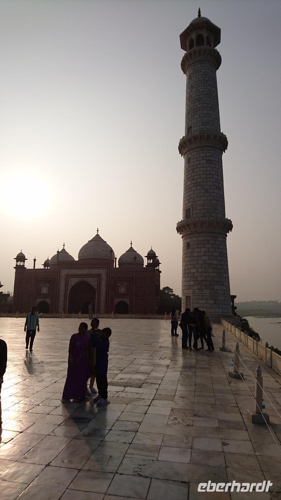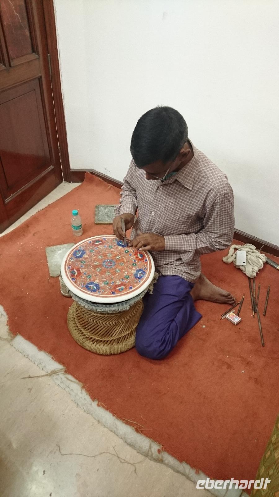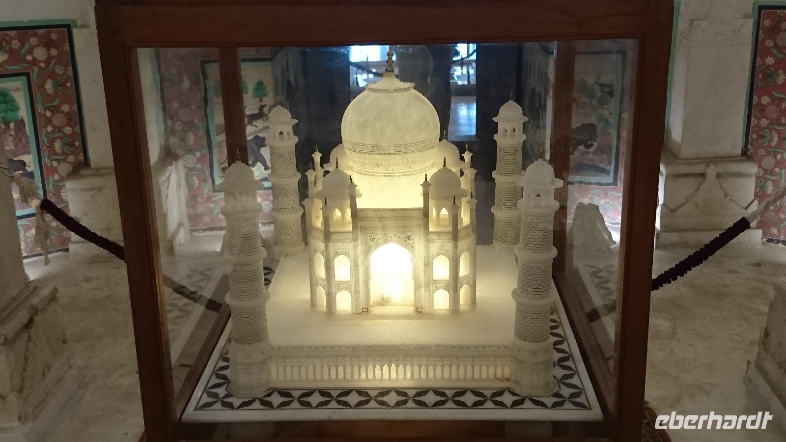 Heraus aus dem Smog Delhis ging es heute ein Stück nach Süden. Nach dem Frühstück nahmen wir im Bus Platz, während eben unsere Koffer verstaut wurden. Dann ging es los. Die Stadt forderte ihren Tribut, es dauerte eine Weile, ehe wir die offene Straße erreichten. Unterwegs gab es einen kleinen Stopp an einem indischen Touristen-Rasthof, wo uns nicht nur die Fülle der indischen Souvenirs umfing, sondern wir auch Tänzer und Musikanten zusehen konnten, die ihre indischen Traditionen gern vorstellten. Um Mittag checkten wir bereits im Hotel in Agra ein, nahmen einen Imbiss zu uns und fuhren zum Taj Mahal, für einige von uns sicher der Höhepunkt der Reise. Zum Glück war es nicht dermaßen überlaufen, wie erst erwartet und der Smog blieb ebenfalls in Delhi zurück, sodass wir zufrieden auf den Marmorbau blicken und viele schöne Fotos und Eindrücke mitnehmen konnten. Die gesamte Anlage dieses Weltkulturerbes, das nie ein Palast war, sondern ein Grabmal für die im Jahre 1631 verstorbene Lieblingsfrau Mumtaz Mahal (Arjumand Bano Begum) des Großmoguls Shah Jahan, welches sogar durch ein in schwarz gehaltenes gleich geartetes Monument auf der anderen Seite des Yamuna-Flusses ergänzt werden sollte, vermittelt einen Eindruck vom Können der indischen Architekten und Bauleute vergangener Tage. Danach wollten wir noch das Rote Fort in Delhi besuchen, jedoch schließt dies bereits bei Anbruch der Dämmerung und so verschoben wir dies auf den nächsten Tag und besuchten stattdessen eine Marmorfabrik, in der heute noch nach alter Art und Weise wie am Taj Mahal Marmor mit Halbedelsteinen besetzt wird. Manch edles Stück dieser Kunst wanderte heute in unser Gepäck und wird zuhause eine interessante Geschichte unserer Reise dinglich ergänzen und uns als schöne Erinnerung an den Besuch des Taj Mahal bleiben. Dann fuhren wir zurück zu unserem Hotel und nach dem Abendessen lud uns Stefan noch auf einen Willkommensdrink auf die Dachterrasse ein. Von hier hatten wir einen schönen Blick über die im Dunkel der Nacht schön erleuchtete Stadt und wir sahen auch die aus Sicherheitsgründen nicht mehr angestrahlte Silhouette des Taj Mahal in der Ferne stehen.