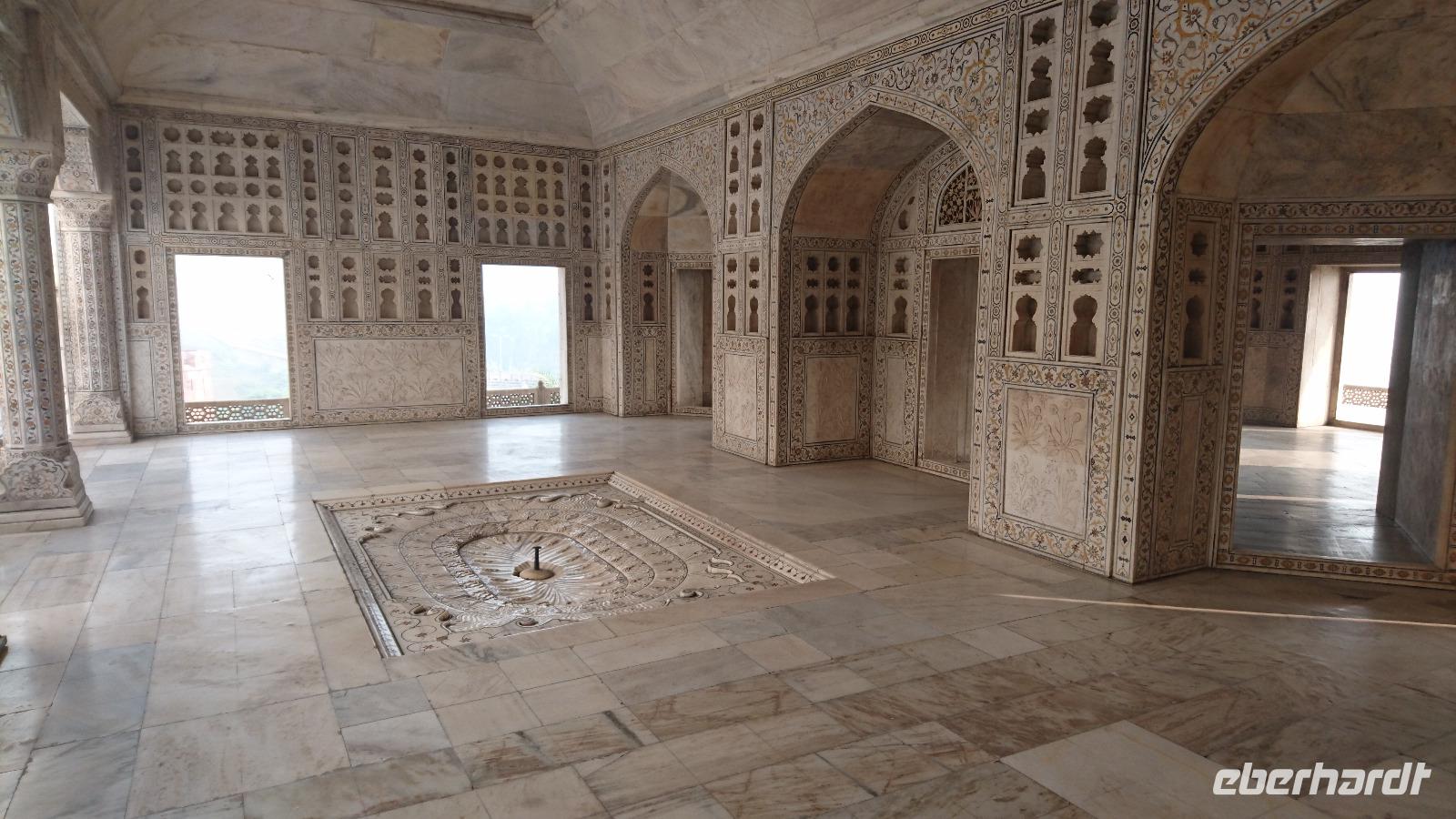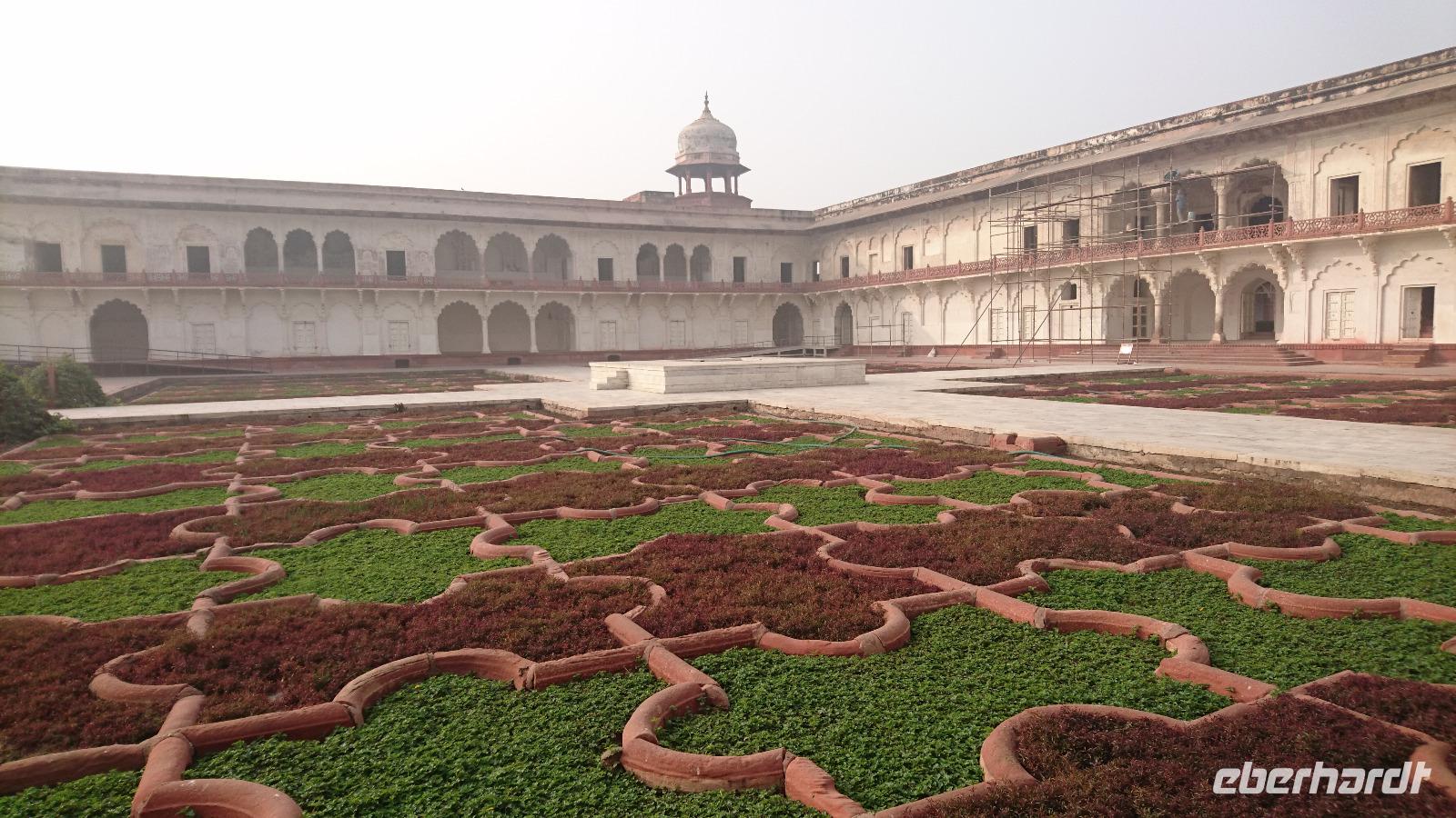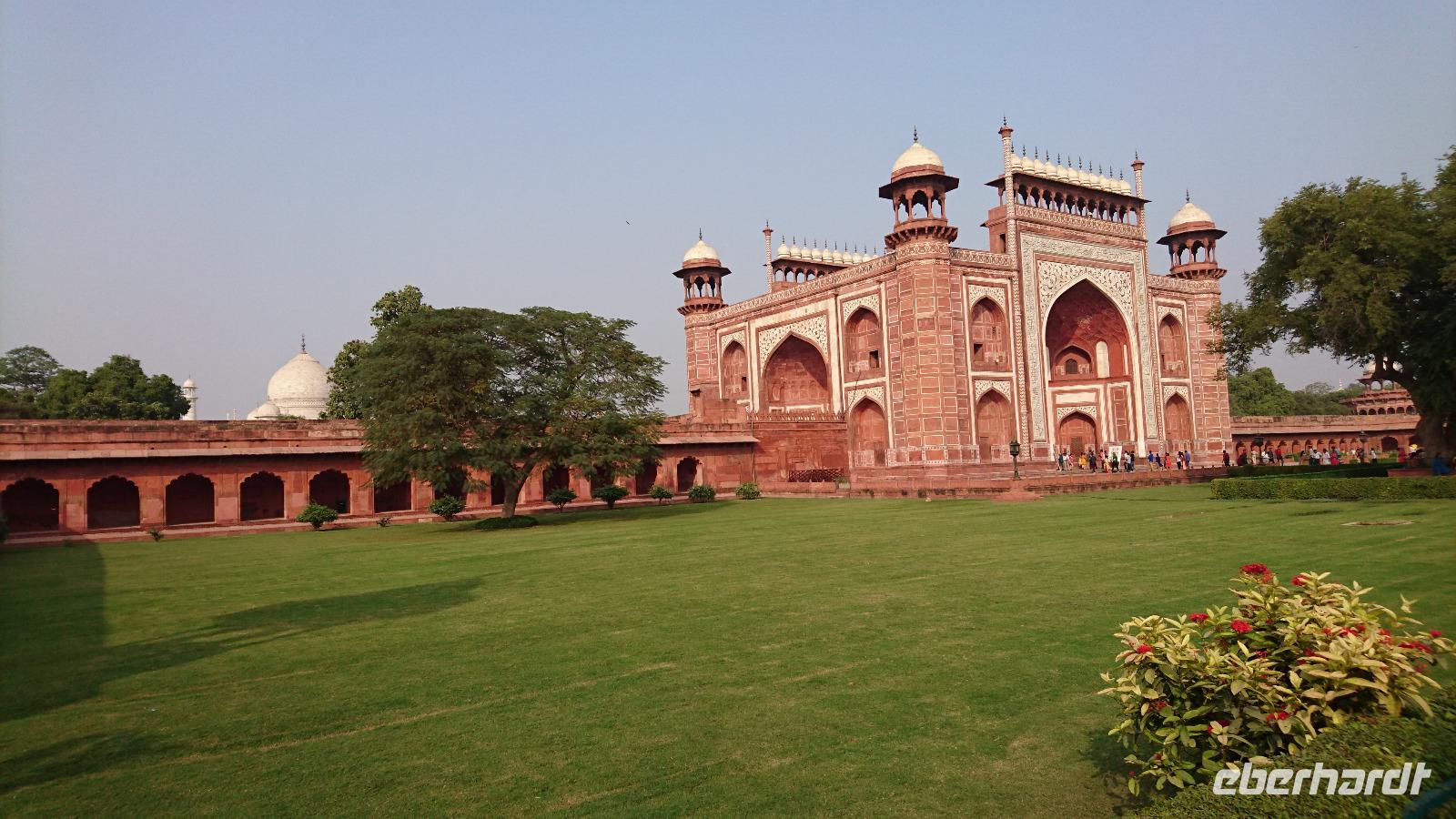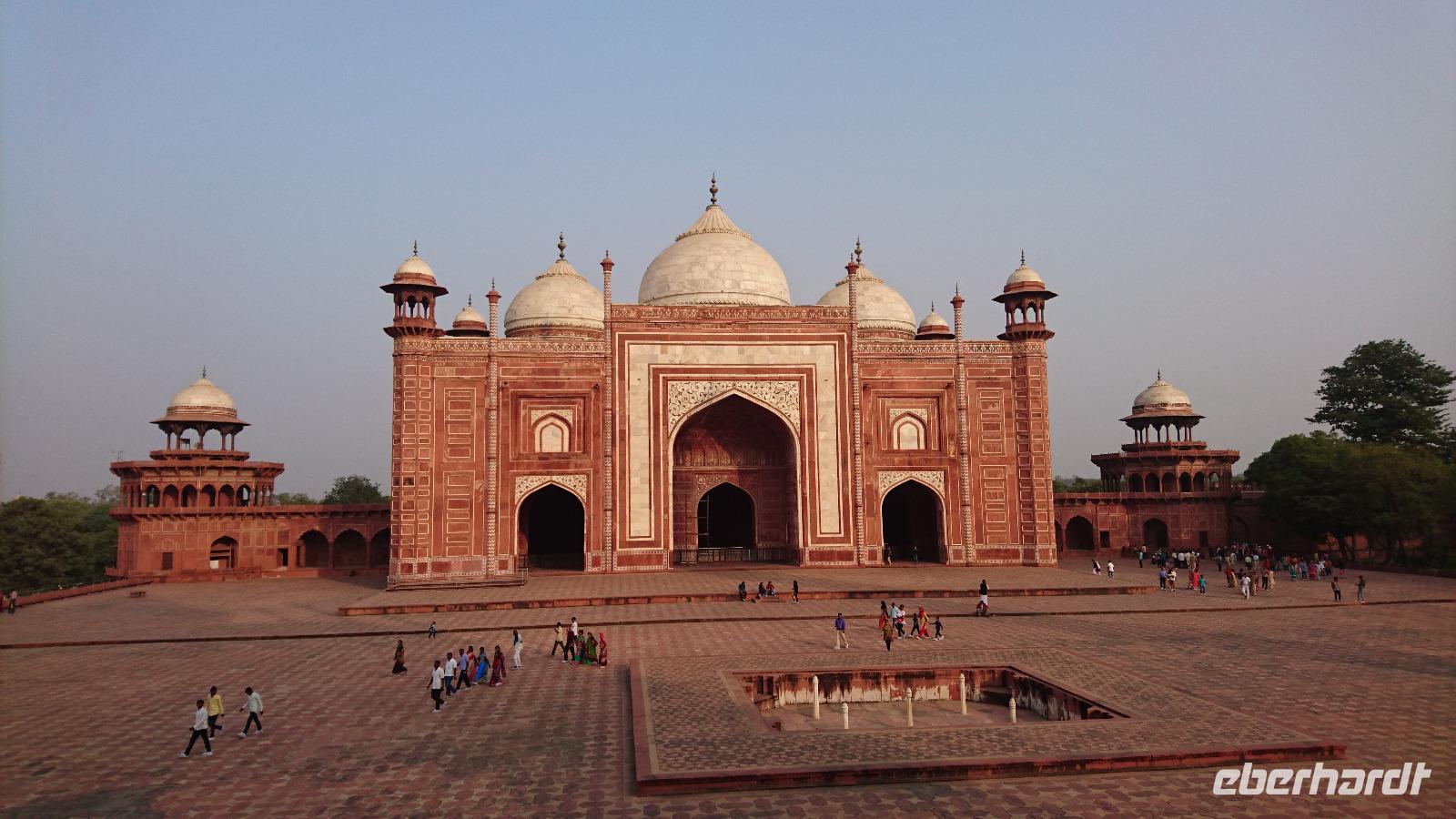 Heraus aus dem Smog Delhis ging es heute ein Stück nach Süden. Nach dem Frühstück nahmen wir im Bus Platz, während eben unsere Koffer verstaut wurden. Dann ging es los. Die Stadt forderte ihren Tribut, es dauerte eine Weile, ehe wir die offene Straße erreichten. Unterwegs gab es einen kleinen Stopp an einem indischen Touristen-Rasthof, wo uns nicht nur die Fülle der indischen Souvenirs umfing, sondern wir auch Tänzer und Musikanten zusehen konnten, die ihre indischen Traditionen gern vorstellten. Um Mittag checkten wir bereits im Hotel in Agra ein, nahmen einen Imbiss zu uns und fuhren zum Taj Mahal, für einige von uns sicher der Höhepunkt der Reise. Zum Glück war es nicht dermaßen überlaufen, wie erst erwartet und der Smog blieb ebenfalls in Delhi zurück, sodass wir zufrieden auf den Marmorbau blicken und viele schöne Fotos und Eindrücke mitnehmen konnten. Die gesamte Anlage dieses Weltkulturerbes, das nie ein Palast war, sondern ein Grabmal für die im Jahre 1631 verstorbene Lieblingsfrau Mumtaz Mahal (Arjumand Bano Begum) des Großmoguls Shah Jahan, welches sogar durch ein in schwarz gehaltenes gleich geartetes Monument auf der anderen Seite des Yamuna-Flusses ergänzt werden sollte, vermittelt einen Eindruck vom Können der indischen Architekten und Bauleute vergangener Tage. Danach wollten wir noch das Rote Fort in Delhi besuchen, jedoch schließt dies bereits bei Anbruch der Dämmerung und so verschoben wir dies auf den nächsten Tag und besuchten stattdessen eine Marmorfabrik, in der heute noch nach alter Art und Weise wie am Taj Mahal Marmor mit Halbedelsteinen besetzt wird. Manch edles Stück dieser Kunst wanderte heute in unser Gepäck und wird zuhause eine interessante Geschichte unserer Reise dinglich ergänzen und uns als schöne Erinnerung an den Besuch des Taj Mahal bleiben. Dann fuhren wir zurück zu unserem Hotel und nach dem Abendessen lud uns Stefan noch auf einen Willkommensdrink auf die Dachterrasse ein. Von hier hatten wir einen schönen Blick über die im Dunkel der Nacht schön erleuchtete Stadt und wir sahen auch die aus Sicherheitsgründen nicht mehr angestrahlte Silhouette des Taj Mahal in der Ferne stehen.