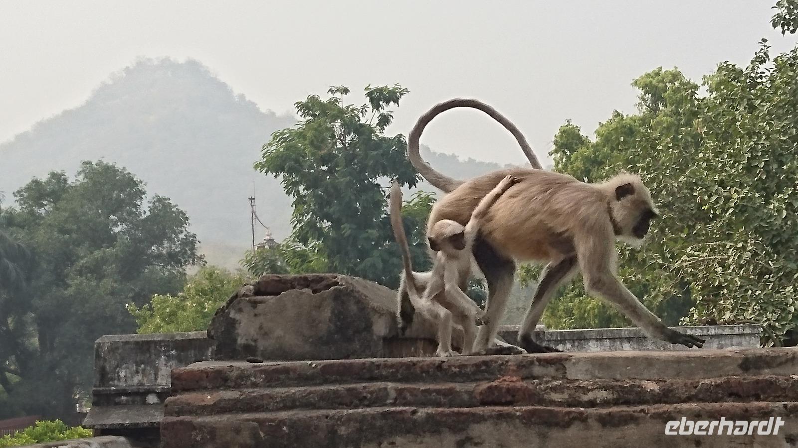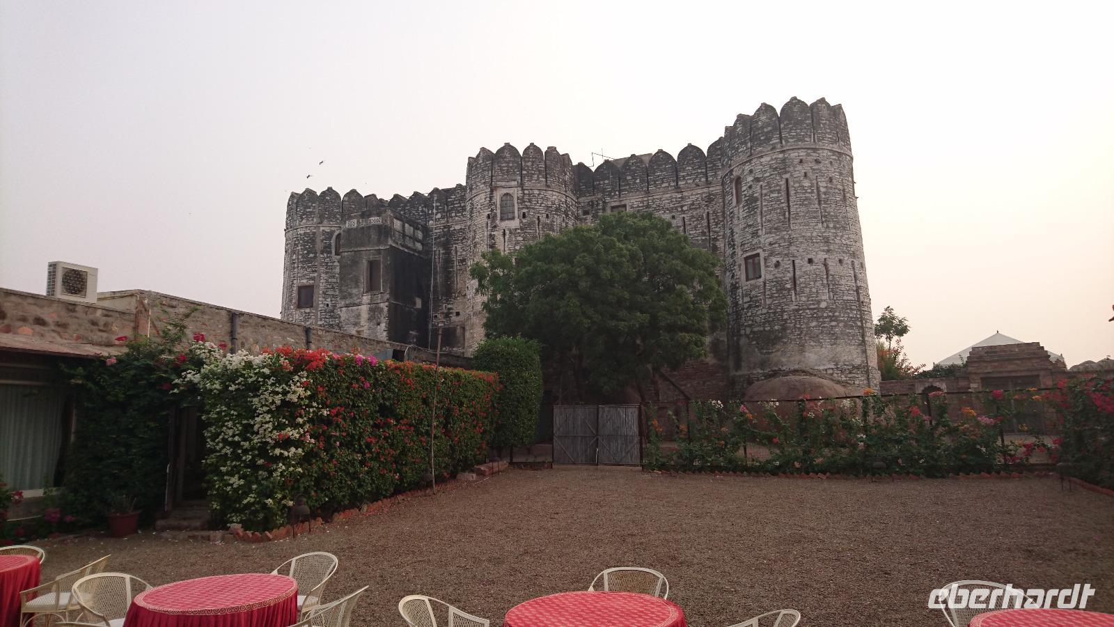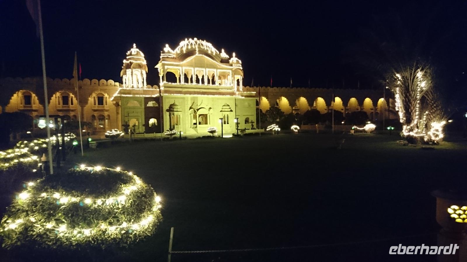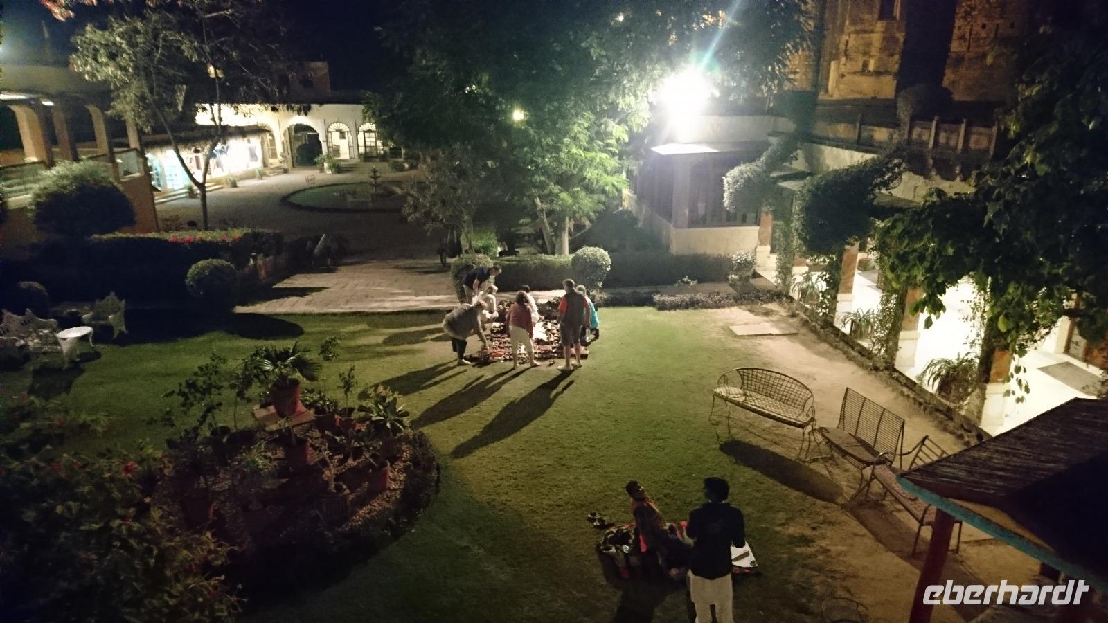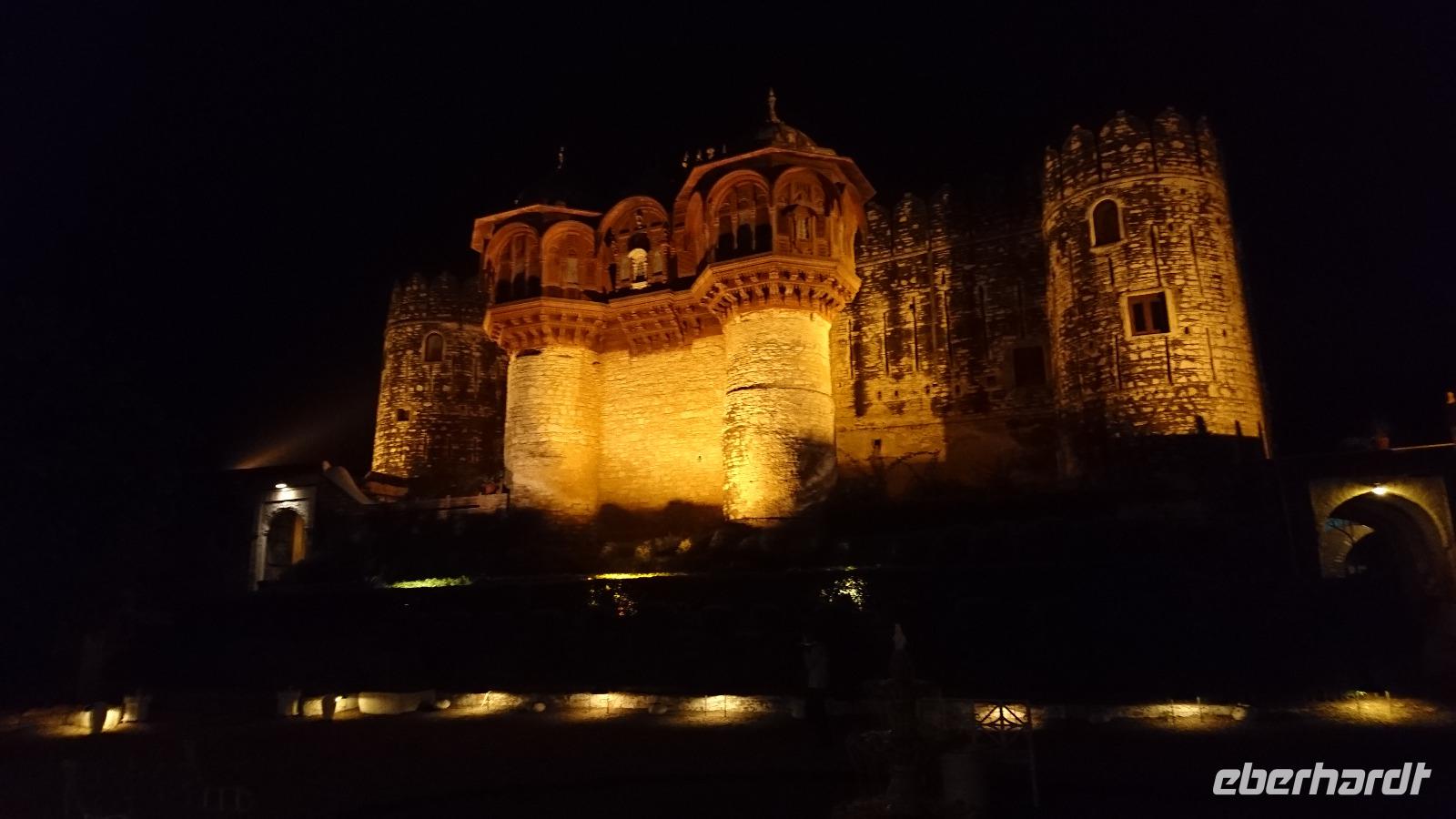 Schauen Sie einmal an sich herunter. Entdecken Sie etwas aus Leder? Die Antwort ist, dass an so vielen Kleidungsstücken und Gegenständen des Alltags Leder zu finden ist. Heute beim Besuch des Jaintempels in Ranakpur an unserer Strecke nach Khejrala mussten wir auf Leder komplett verzichten. Die Jainreligion sieht das Tier als dem Menschen ebenbürtig an und wehrt sich gegen jede Tötung zum Nutzen des Menschen. Auf dem Wege zum Tempel und nach dem morgendlichen Aufbruch sahen wir jedoch noch weitere tolle Dinge. Wir stoppten in einem kleinen Dorf, wo ein Baum stand, in dem eine Kolonie lebte. Flughunde. Diese hingen malerisch für uns bereit und manch ein Foto entstand, doch auch einige der Flughunde konnten wir beim Fliegen beobachten. Ob sie wohl auch bis zum Wasserschöpfrad fliegen konnten? Dieses besichtigten wir als Nächstes. Zur Bewässerung der Felder waren dort zwei Wasserbüffel im Einsatz, um Wasser aus der Tiefe in eine Kanalanlage am Feld zu pumpen. Ein interessantes Unterfangen und Jahrhunderte alt. Schließlich erreichten wir den Jaintempel in Ranakpur, besichtigten zuerst den offenen Sonnentempel, dann noch den Mondtempel, ehe wir den eigentlichen, ganz in Marmor gearbeiteten riesigen Haupttempel in Ranakpur betraten. Präzise, filigran und doch gewaltig war die Gestaltung der Anlage. Marmor an sich zu bearbeiten, ist schon schwer. Hier hatte man jeden Zentimeter der Anlage bearbeitet und kunstvoll gestaltet. Das war sicher auch ein großes Thema bei uns an den Tischen beim folgenden Mittagessen ganz in der Nähe. Dabei beobachteten wir viele Affen, die hier ebenso verehrt wurden, wie ihr Gott Hanuman. Auch wenn Ambrish nicht gern drängelte, mussten wir weiter. Noch eine zeitlich weite Strecke lag vor uns und nach noch einem Bedürfnisstopp unterwegs erreichten wir erst am Abend nach Bergfest-Whisky und -Rum im Bus unter nächstes Hotel. Dort jedoch hielten wir beim Betreten der Anlage den Atem an. Wir lebten für die kommenden zwei Nächte in einem alten Fort, geführt von einem Nachfahren der letzten Herrscher der Region Khejrala. Bei Kerzenschein nahmen wir kurz nach unserer Ankunft unser Abendessen mit Blick auf die erleuchtete Burg ein. Na, da würde der kommende Tag sicher ebenso interessant!