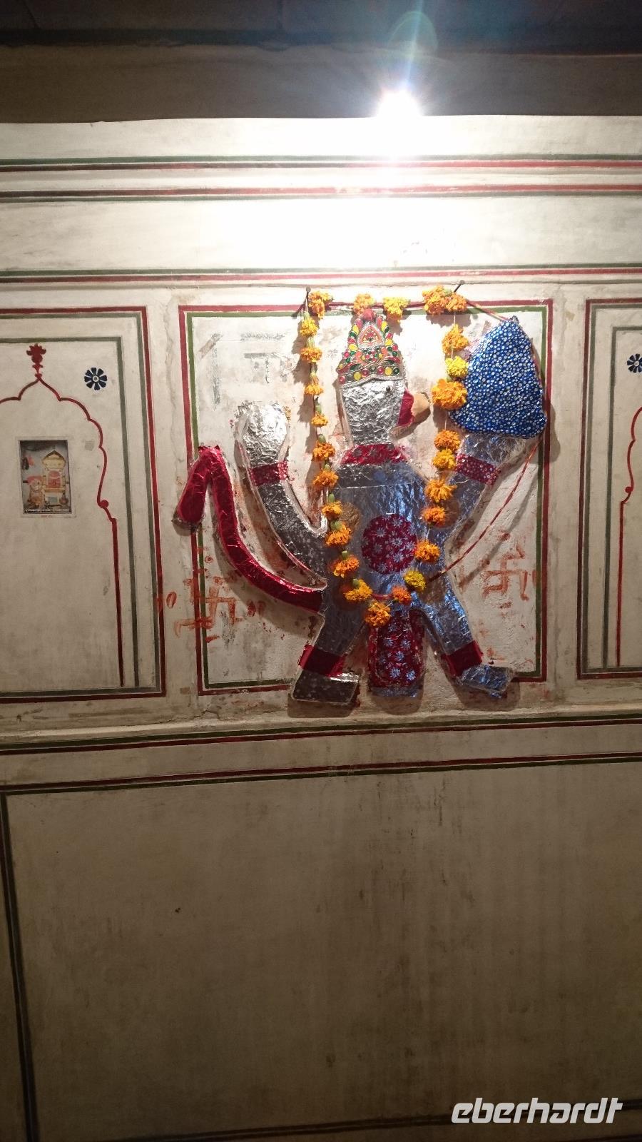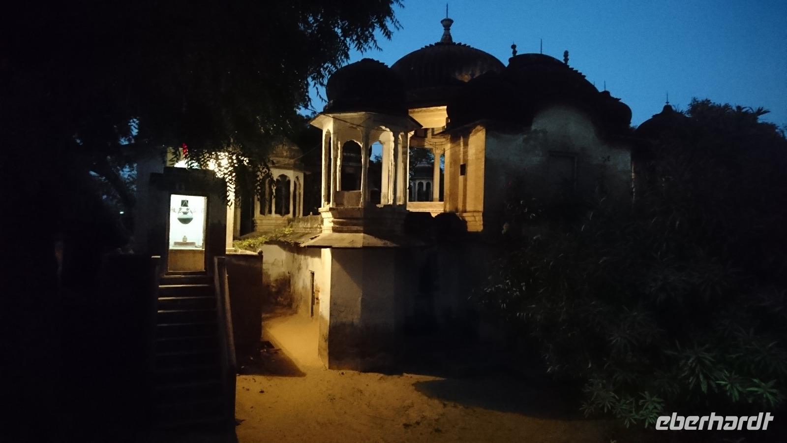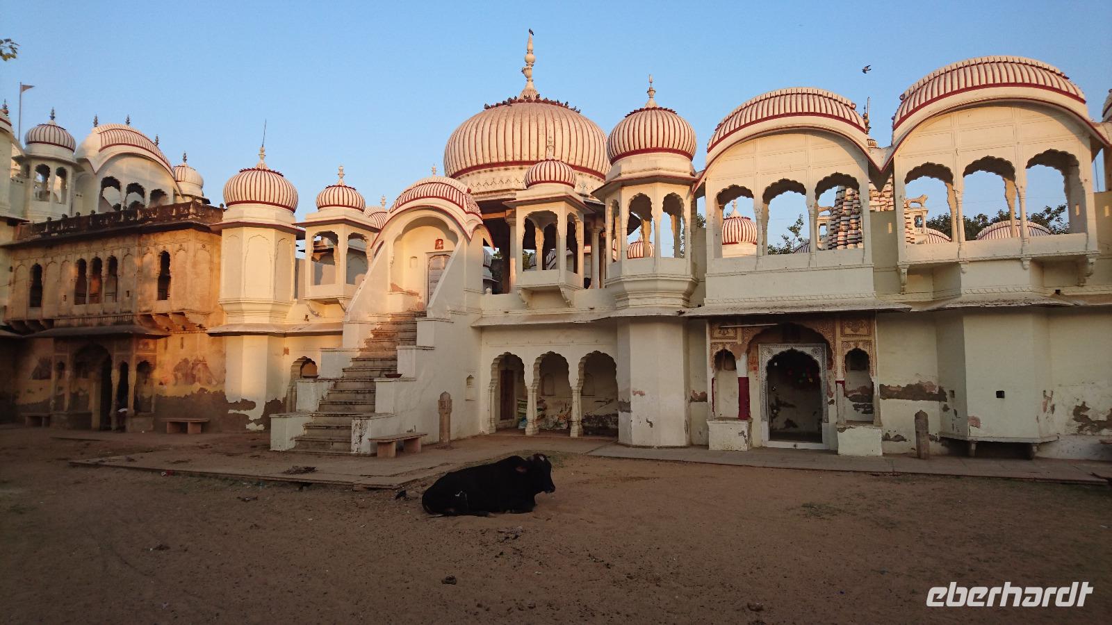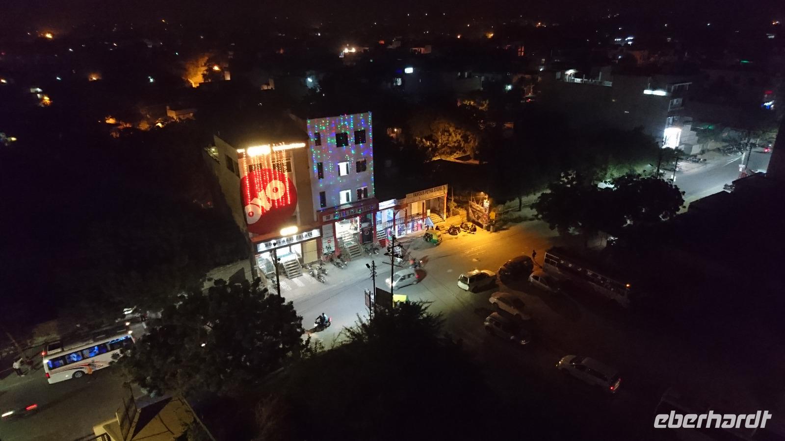 Schauen Sie einmal an sich herunter. Entdecken Sie etwas aus Leder? Die Antwort ist, dass an so vielen Kleidungsstücken und Gegenständen des Alltags Leder zu finden ist. Heute beim Besuch des Jaintempels in Ranakpur an unserer Strecke nach Khejrala mussten wir auf Leder komplett verzichten. Die Jainreligion sieht das Tier als dem Menschen ebenbürtig an und wehrt sich gegen jede Tötung zum Nutzen des Menschen. Auf dem Wege zum Tempel und nach dem morgendlichen Aufbruch sahen wir jedoch noch weitere tolle Dinge. Wir stoppten in einem kleinen Dorf, wo ein Baum stand, in dem eine Kolonie lebte. Flughunde. Diese hingen malerisch für uns bereit und manch ein Foto entstand, doch auch einige der Flughunde konnten wir beim Fliegen beobachten. Ob sie wohl auch bis zum Wasserschöpfrad fliegen konnten? Dieses besichtigten wir als Nächstes. Zur Bewässerung der Felder waren dort zwei Wasserbüffel im Einsatz, um Wasser aus der Tiefe in eine Kanalanlage am Feld zu pumpen. Ein interessantes Unterfangen und Jahrhunderte alt. Schließlich erreichten wir den Jaintempel in Ranakpur, besichtigten zuerst den offenen Sonnentempel, dann noch den Mondtempel, ehe wir den eigentlichen, ganz in Marmor gearbeiteten riesigen Haupttempel in Ranakpur betraten. Präzise, filigran und doch gewaltig war die Gestaltung der Anlage. Marmor an sich zu bearbeiten, ist schon schwer. Hier hatte man jeden Zentimeter der Anlage bearbeitet und kunstvoll gestaltet. Das war sicher auch ein großes Thema bei uns an den Tischen beim folgenden Mittagessen ganz in der Nähe. Dabei beobachteten wir viele Affen, die hier ebenso verehrt wurden, wie ihr Gott Hanuman. Auch wenn Ambrish nicht gern drängelte, mussten wir weiter. Noch eine zeitlich weite Strecke lag vor uns und nach noch einem Bedürfnisstopp unterwegs erreichten wir erst am Abend nach Bergfest-Whisky und -Rum im Bus unter nächstes Hotel. Dort jedoch hielten wir beim Betreten der Anlage den Atem an. Wir lebten für die kommenden zwei Nächte in einem alten Fort, geführt von einem Nachfahren der letzten Herrscher der Region Khejrala. Bei Kerzenschein nahmen wir kurz nach unserer Ankunft unser Abendessen mit Blick auf die erleuchtete Burg ein. Na, da würde der kommende Tag sicher ebenso interessant!