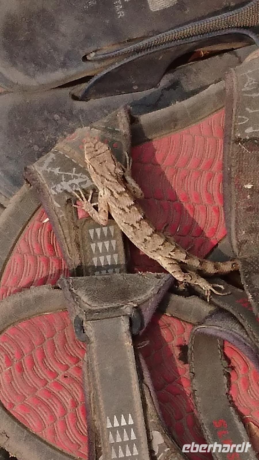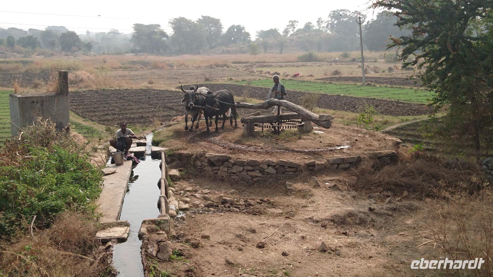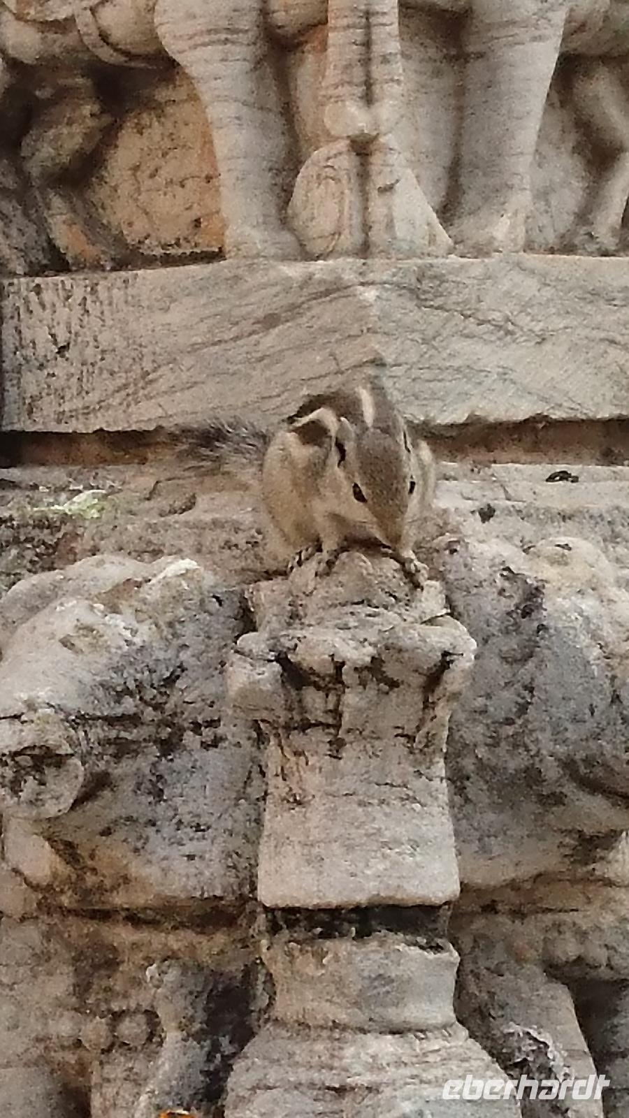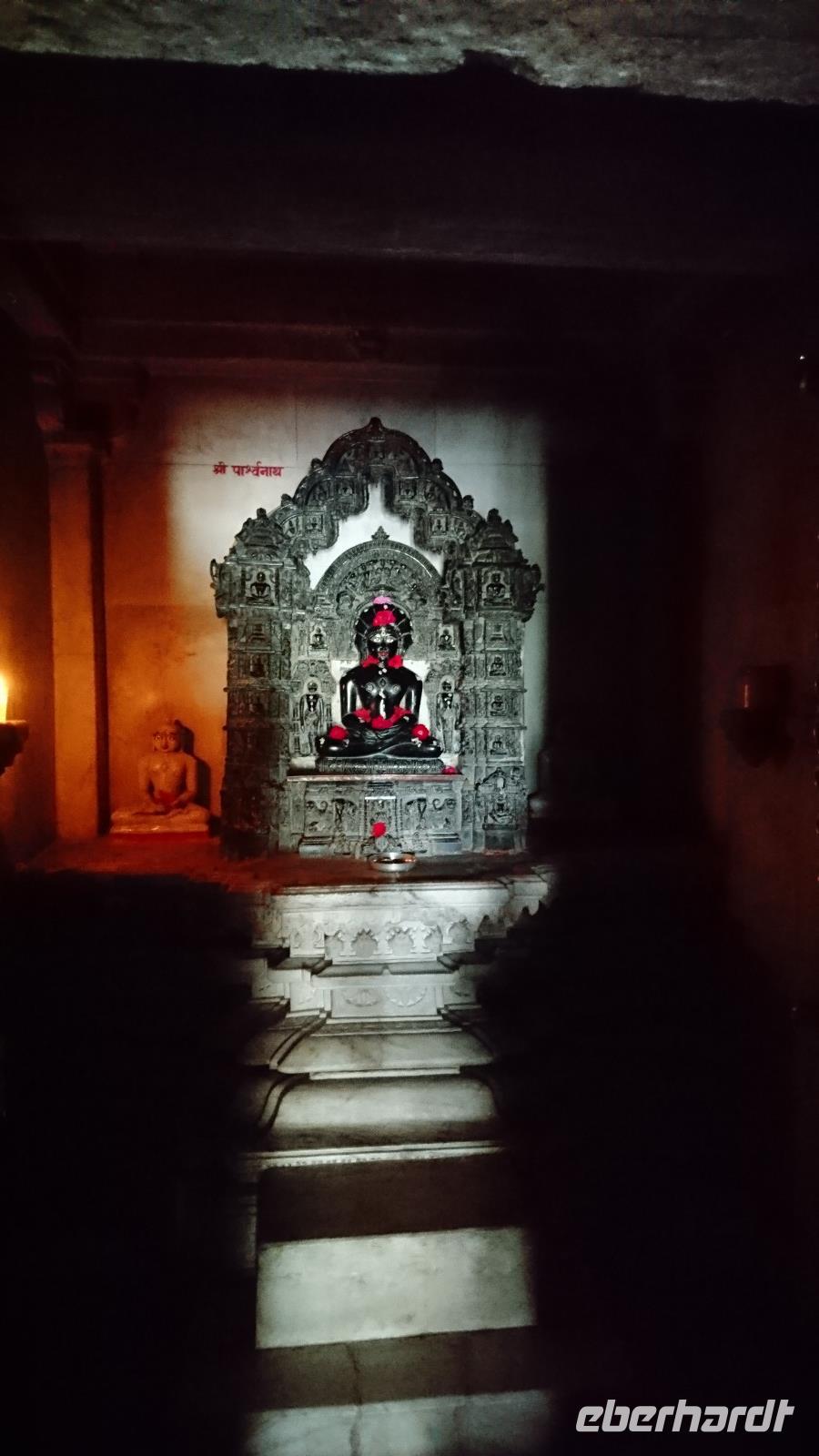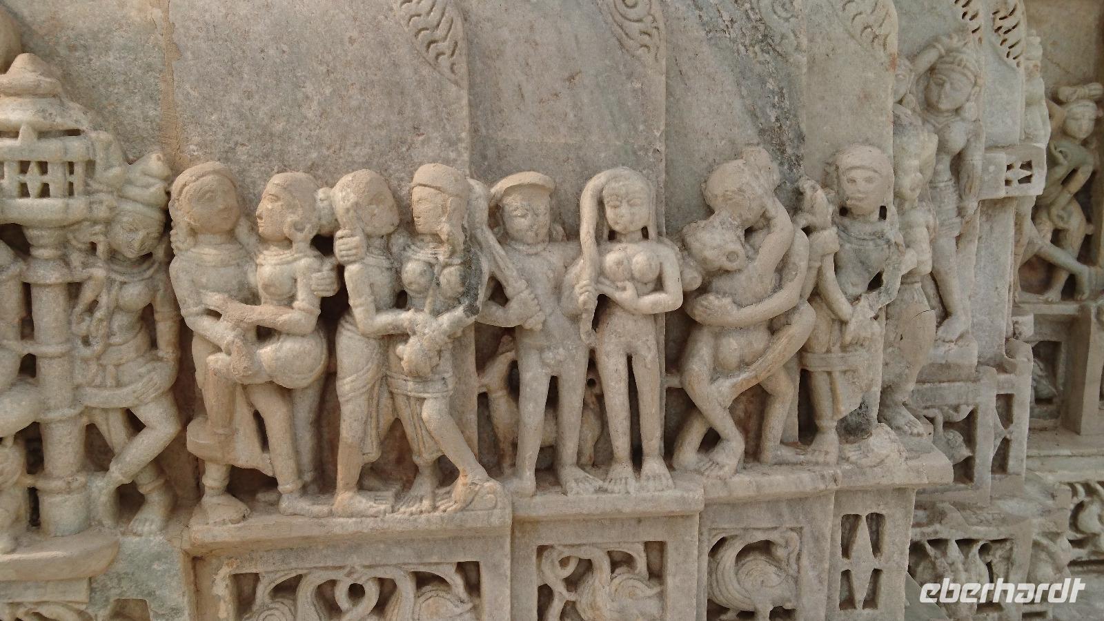Schauen Sie einmal an sich herunter. Entdecken Sie etwas aus Leder? Die Antwort ist, dass an so vielen Kleidungsstücken und Gegenständen des Alltags Leder zu finden ist. Heute beim Besuch des Jaintempels in Ranakpur an unserer Strecke nach Khejrala mussten wir auf Leder komplett verzichten. Die Jainreligion sieht das Tier als dem Menschen ebenbürtig an und wehrt sich gegen jede Tötung zum Nutzen des Menschen. Auf dem Wege zum Tempel und nach dem morgendlichen Aufbruch sahen wir jedoch noch weitere tolle Dinge. Wir stoppten in einem kleinen Dorf, wo ein Baum stand, in dem eine Kolonie lebte. Flughunde. Diese hingen malerisch für uns bereit und manch ein Foto entstand, doch auch einige der Flughunde konnten wir beim Fliegen beobachten. Ob sie wohl auch bis zum Wasserschöpfrad fliegen konnten? Dieses besichtigten wir als Nächstes. Zur Bewässerung der Felder waren dort zwei Wasserbüffel im Einsatz, um Wasser aus der Tiefe in eine Kanalanlage am Feld zu pumpen. Ein interessantes Unterfangen und Jahrhunderte alt. Schließlich erreichten wir den Jaintempel in Ranakpur, besichtigten zuerst den offenen Sonnentempel, dann noch den Mondtempel, ehe wir den eigentlichen, ganz in Marmor gearbeiteten riesigen Haupttempel in Ranakpur betraten. Präzise, filigran und doch gewaltig war die Gestaltung der Anlage. Marmor an sich zu bearbeiten, ist schon schwer. Hier hatte man jeden Zentimeter der Anlage bearbeitet und kunstvoll gestaltet. Das war sicher auch ein großes Thema bei uns an den Tischen beim folgenden Mittagessen ganz in der Nähe. Dabei beobachteten wir viele Affen, die hier ebenso verehrt wurden, wie ihr Gott Hanuman. Auch wenn Ambrish nicht gern drängelte, mussten wir weiter. Noch eine zeitlich weite Strecke lag vor uns und nach noch einem Bedürfnisstopp unterwegs erreichten wir erst am Abend nach Bergfest-Whisky und -Rum im Bus unter nächstes Hotel. Dort jedoch hielten wir beim Betreten der Anlage den Atem an. Wir lebten für die kommenden zwei Nächte in einem alten Fort, geführt von einem Nachfahren der letzten Herrscher der Region Khejrala. Bei Kerzenschein nahmen wir kurz nach unserer Ankunft unser Abendessen mit Blick auf die erleuchtete Burg ein. Na, da würde der kommende Tag sicher ebenso interessant!