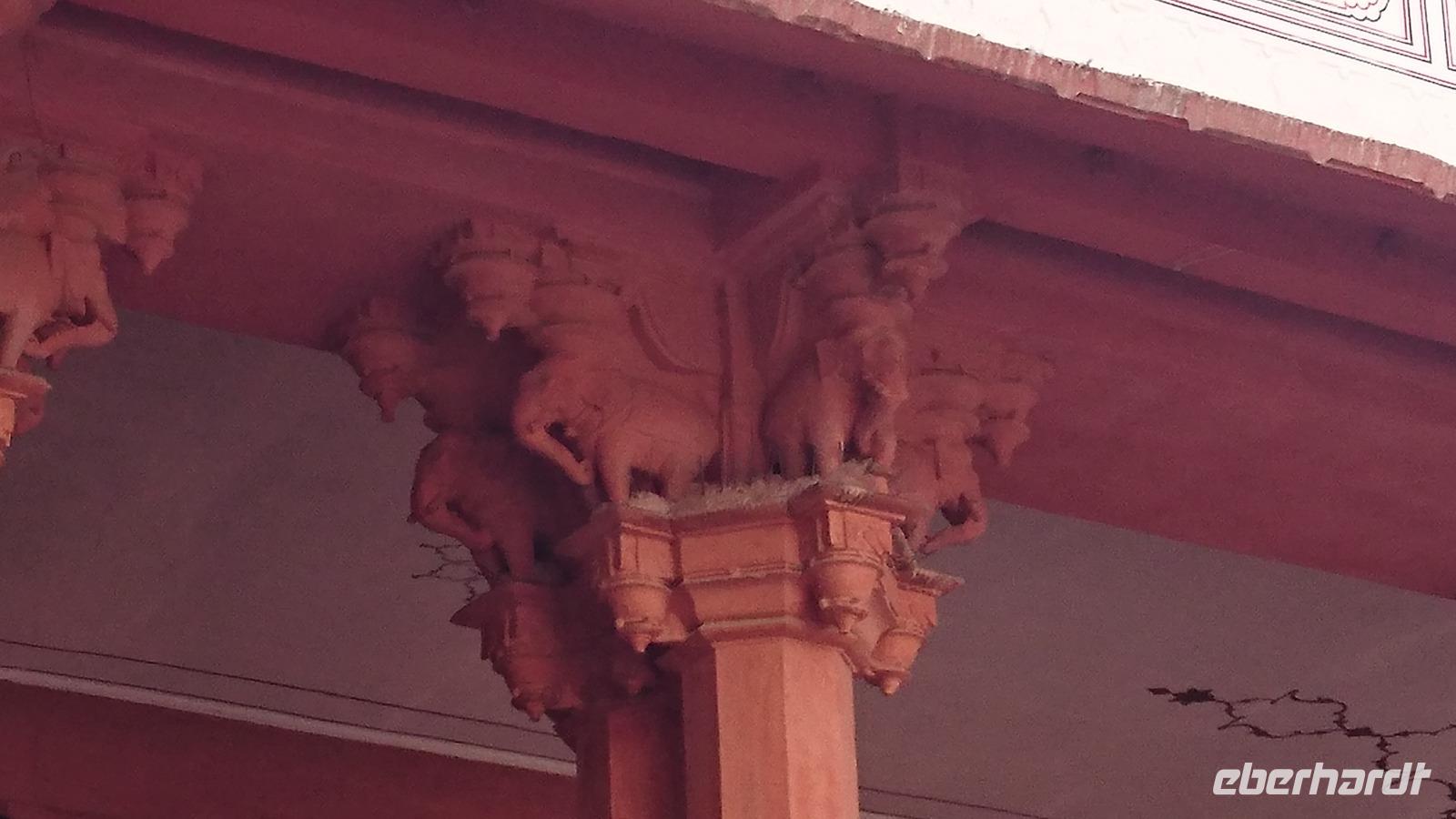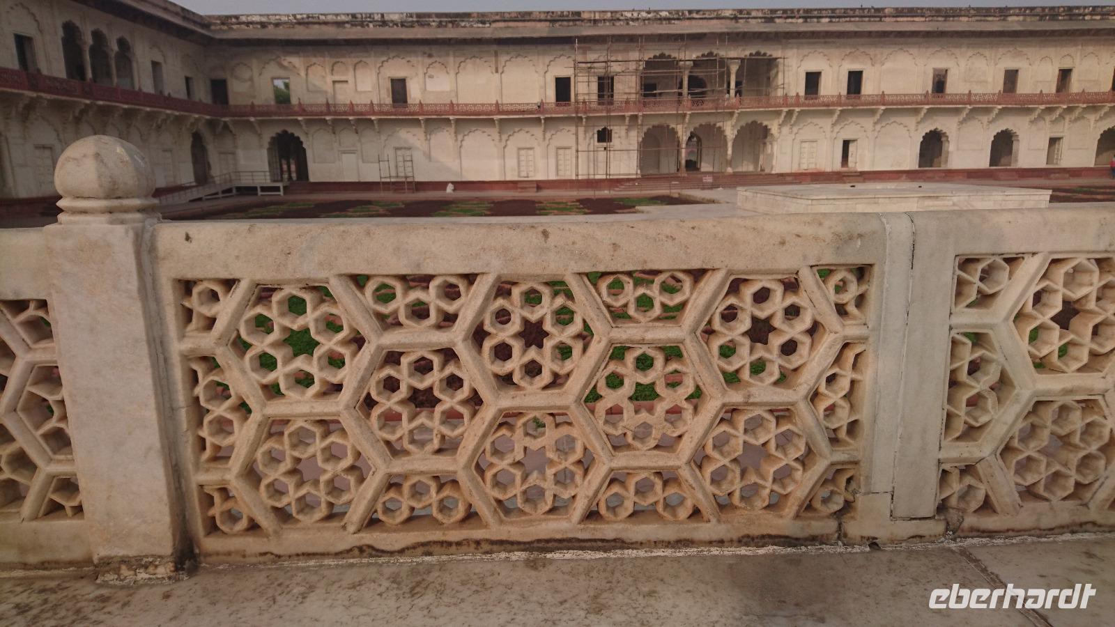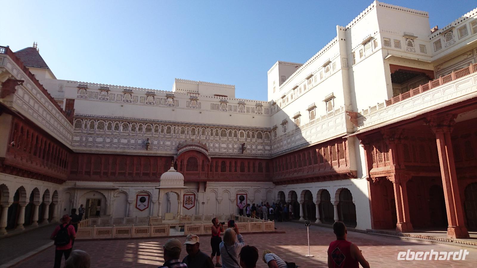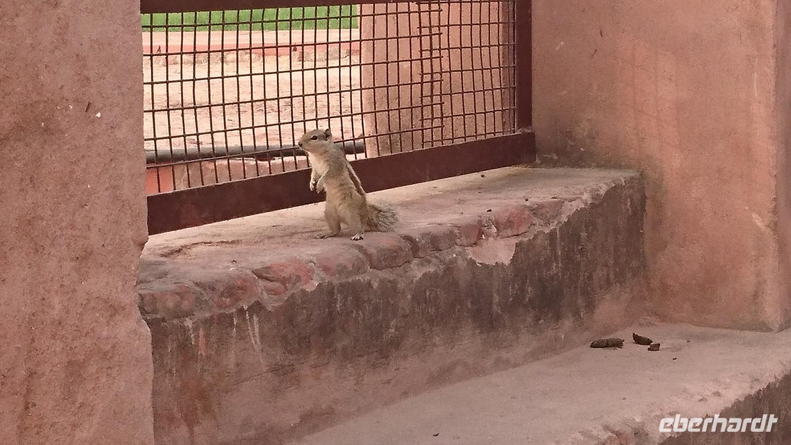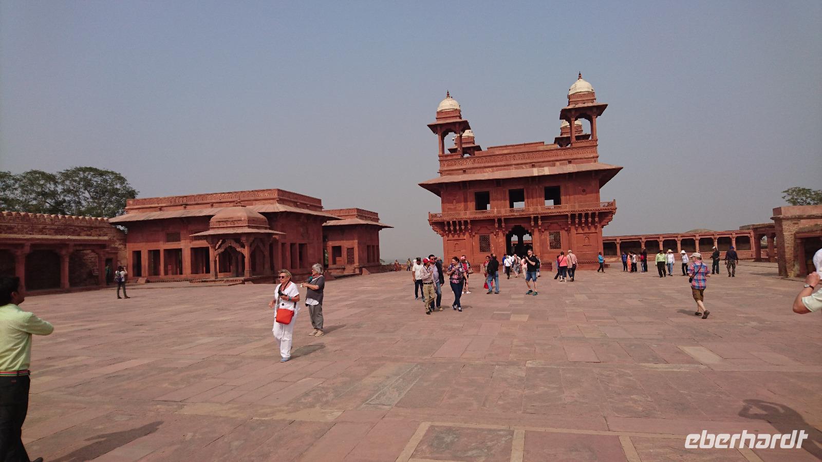 Am Morgen holten wir nach dem Frühstück den Besuch im Roten Fort in Agra nach und sahen, wo der einstige Herrscher der Region von seinem eigenen Sohn eingesperrt wurde, als dieser die Macht an sich reißen konnte. Leider zog heute der uns bereits aus Delhi bekannte Smog auch über Agra und wir konnten am Vormittag keinen letzten Blick auf das Taj Mahal am Yamuna-Fluss werfen, ehe wir Agra Lebewohl sagten und uns unser Bus weiter gen Westen brachte. Eine reichliche Stunde waren wir unterwegs, ehe wir die verlassene Stadt Fatehpur Sikri erreichten. Im Vergleich zu ihrer Bauzeit wurde sie wirklich nur sehr kurze Zeit genutzt und leider hatten sich hier Baumeister und Planer völlig verschätzt, denn das Klima änderte sich zu damaliger Zeit drastisch, sodass pure Trinkwassernot die Bewohner zum Fortzug trieb. Dann vergaß man diese herrliche Stadt an der Grenze zum indischen Bundesstaat Rajasthan und erst Jahrhunderte später, in unserer heutigen Zeit, legte man sie, inzwischen versandet und vom Gestrüpp überwuchert, wieder frei, nutzt seither auch den religiösen Teil der Moschee, machte alles den Touristen zugänglich und bewahrte so ein Stück erlebbarer und so gut wie vollständig erhaltener Geschichte der Region. Fast hätte die Natur sich alles wieder zurück geholt, doch zum Glück können wir heute noch die herrlichen Arbeiten in Sandstein und Marmor betrachten. Später fuhren wir weiter nach Keoladeo und stiegen hier um auf Fahrradrikschas. Mutig-starke Fahrer brachten uns tief hinein in den Naturpark der Region und wir beobachteten verschiedene Vogelarten, unter Anderem auch den Marabu und den Kranich, sowie Antilopen und Schildkröten in diesem von Menschen geschützten Stück Erde, das rund 22 Quadratkilometer groß ist. Einen kleinen Imbiss nahmen wir später im nahen Ort Valpur ein und waren danach noch eine ganze Weile unterwegs, lernten dabei, dass in Indien Kilometerangaben so gut wie nichts über die Länge der bevorstehenden Fahrt aussagten und erreichten gegen Abend unser Hotel in Jaipur, dem Heimatort unseres örtlichen Reiseleiters. Im Hotel gab es ein gutes Abendessen und nach den vielen Stunden im Bus genossen wir später die Ruhe auf der Dachterrasse, am Pool oder bei einem kleinen Rundgang durch die umliegenden Straßen, ehe wir uns für den nächsten Tag in unseren bequemen Zimmern niederlegten.