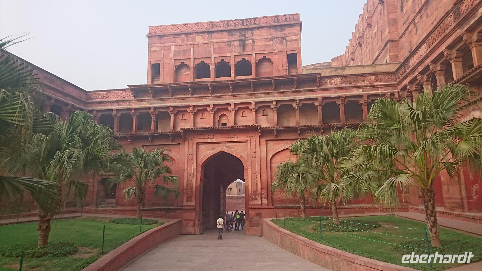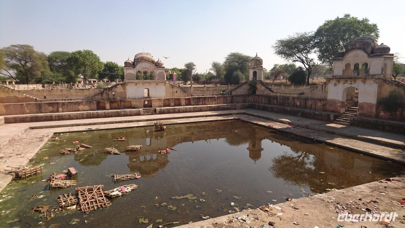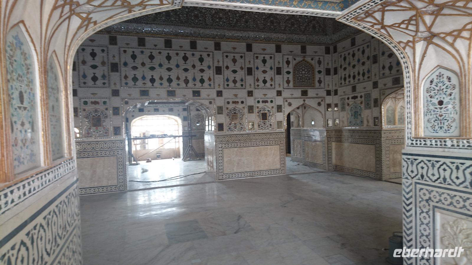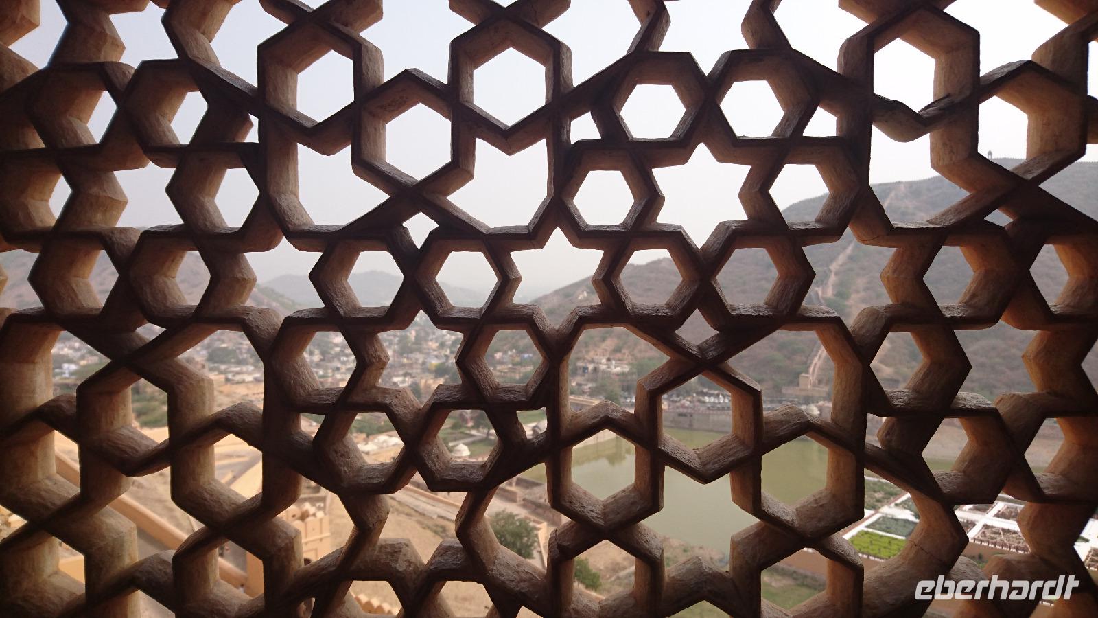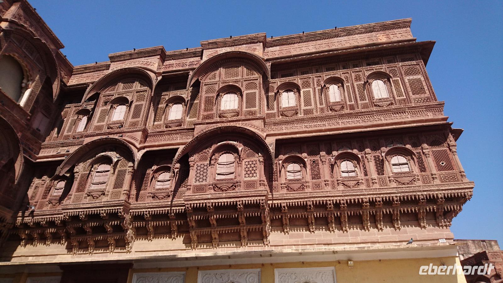 Am Morgen holten wir nach dem Frühstück den Besuch im Roten Fort in Agra nach und sahen, wo der einstige Herrscher der Region von seinem eigenen Sohn eingesperrt wurde, als dieser die Macht an sich reißen konnte. Leider zog heute der uns bereits aus Delhi bekannte Smog auch über Agra und wir konnten am Vormittag keinen letzten Blick auf das Taj Mahal am Yamuna-Fluss werfen, ehe wir Agra Lebewohl sagten und uns unser Bus weiter gen Westen brachte. Eine reichliche Stunde waren wir unterwegs, ehe wir die verlassene Stadt Fatehpur Sikri erreichten. Im Vergleich zu ihrer Bauzeit wurde sie wirklich nur sehr kurze Zeit genutzt und leider hatten sich hier Baumeister und Planer völlig verschätzt, denn das Klima änderte sich zu damaliger Zeit drastisch, sodass pure Trinkwassernot die Bewohner zum Fortzug trieb. Dann vergaß man diese herrliche Stadt an der Grenze zum indischen Bundesstaat Rajasthan und erst Jahrhunderte später, in unserer heutigen Zeit, legte man sie, inzwischen versandet und vom Gestrüpp überwuchert, wieder frei, nutzt seither auch den religiösen Teil der Moschee, machte alles den Touristen zugänglich und bewahrte so ein Stück erlebbarer und so gut wie vollständig erhaltener Geschichte der Region. Fast hätte die Natur sich alles wieder zurück geholt, doch zum Glück können wir heute noch die herrlichen Arbeiten in Sandstein und Marmor betrachten. Später fuhren wir weiter nach Keoladeo und stiegen hier um auf Fahrradrikschas. Mutig-starke Fahrer brachten uns tief hinein in den Naturpark der Region und wir beobachteten verschiedene Vogelarten, unter Anderem auch den Marabu und den Kranich, sowie Antilopen und Schildkröten in diesem von Menschen geschützten Stück Erde, das rund 22 Quadratkilometer groß ist. Einen kleinen Imbiss nahmen wir später im nahen Ort Valpur ein und waren danach noch eine ganze Weile unterwegs, lernten dabei, dass in Indien Kilometerangaben so gut wie nichts über die Länge der bevorstehenden Fahrt aussagten und erreichten gegen Abend unser Hotel in Jaipur, dem Heimatort unseres örtlichen Reiseleiters. Im Hotel gab es ein gutes Abendessen und nach den vielen Stunden im Bus genossen wir später die Ruhe auf der Dachterrasse, am Pool oder bei einem kleinen Rundgang durch die umliegenden Straßen, ehe wir uns für den nächsten Tag in unseren bequemen Zimmern niederlegten.
