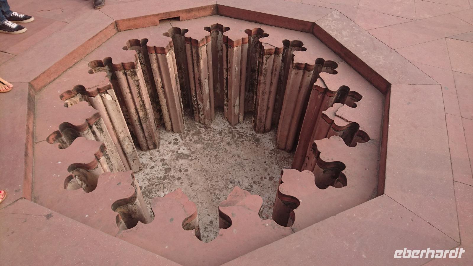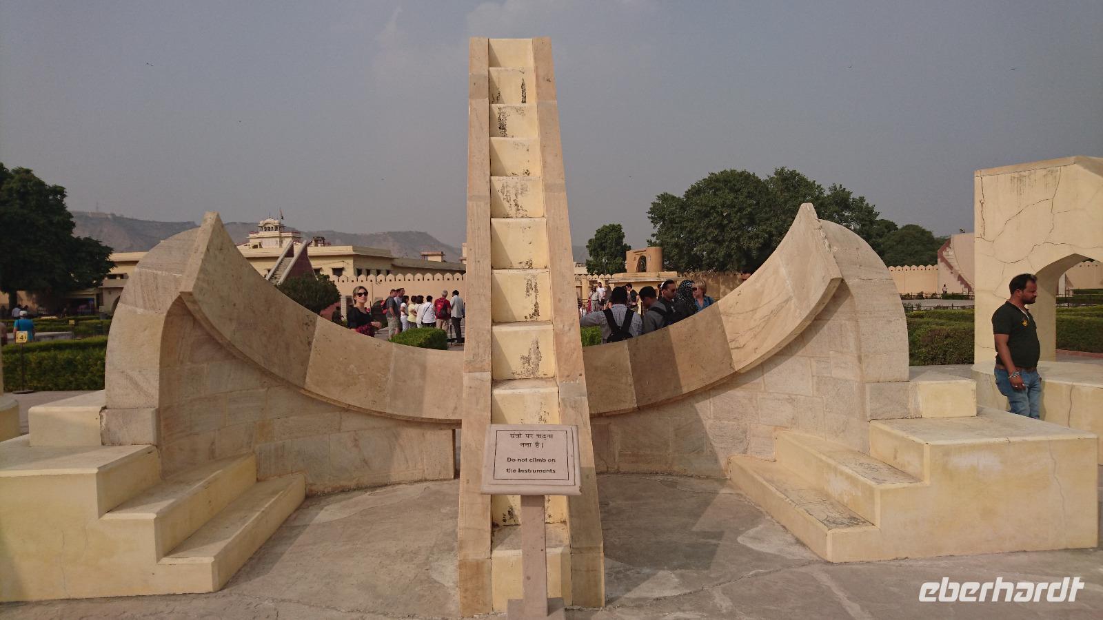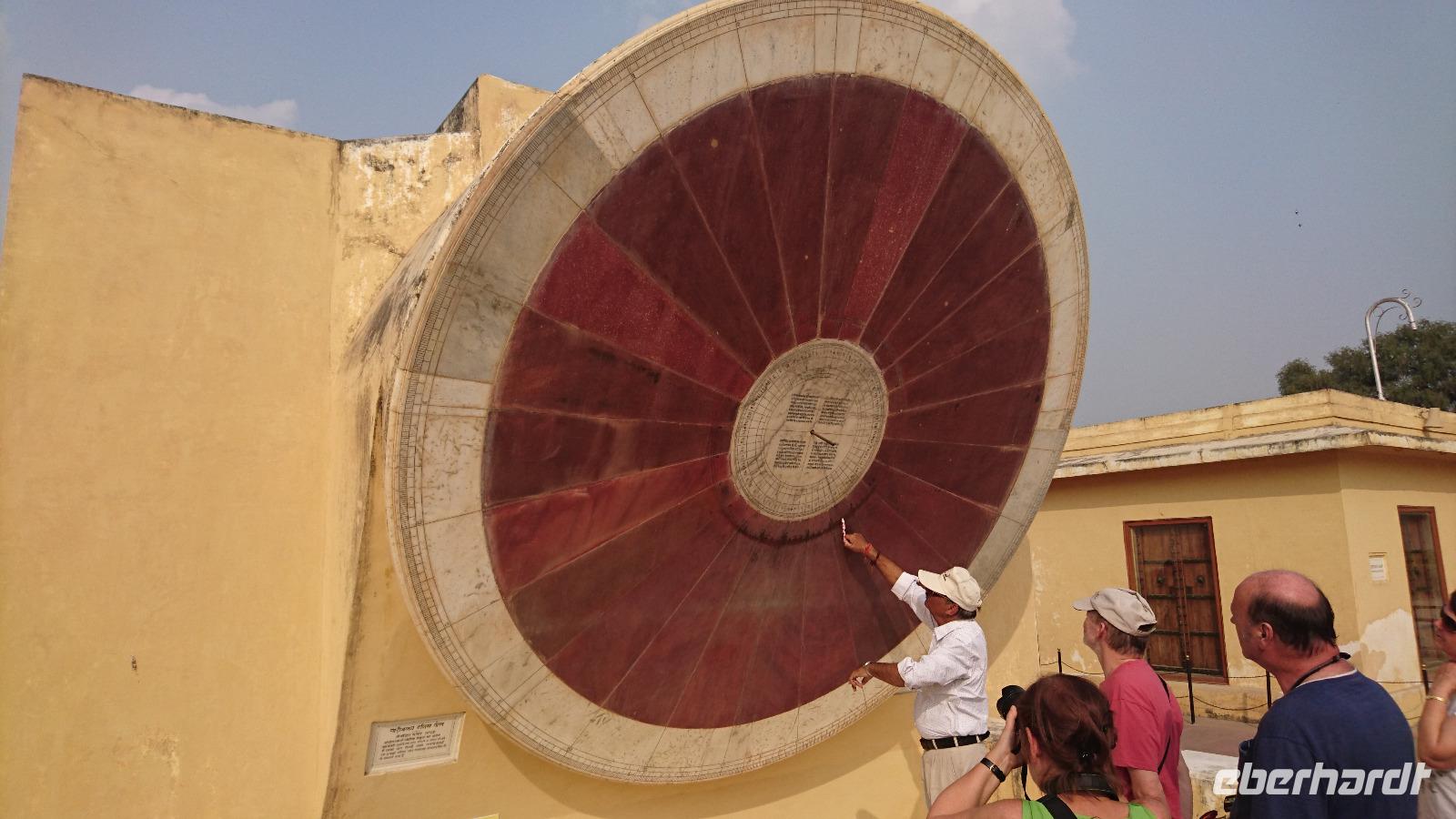 Wer hörte nicht bereits davon? Vom Palast der Winde. Eigentlich ist das, was wir heute als Solches in Jaipur bezeichnen, nur eine Außenmauer des alten Stadtpalastes und heute nur noch eine Fassade, die man von hinten gut vom Observatorium Jantar Mantar sehen kann, welches wir am Nachmittag besuchen wollten. Doch erst einmal sahen wir uns die einzigartige Fassade an, die durch die Vielzahl von Fenstern und einem ausgeklügelten System der Belüftungen wirklich den Anschein machte, als ob man es selbst bei für uns ungewohnten und besonders heißen Temperaturen dahinter gut aushalten konnte. Auf einem Dach gegenüber standen wir bald und schauten uns neben dem Bauwerk auch das rege Treiben auf der Straße unter uns an. Dann fuhren wir zum Amber Fort, einer von vielen grandiosen Befestigungsanlagen rund um Jaipur, die in ihrer Verbindung durch Mauern über Berggipfel und durch Täler, Unterbrechungen durch Tempel und kleine Wachtürme schon ein wenig an die große chinesische Mauer erinnerten. Das Fort mit seinen vielen Räumen und der einzigartigen Architektur, gepaart mit sehr schönen Spiegeln und Marmoreinlegearbeiten, hatte für uns noch einen weiteren Reisevorteil: Wir durften zünftig, fast wie die alten Mogule oder Maharadschas auf Elefanten hinauf in den Innenhof reiten. Diese werden vom TÜV Rheinland überwacht, dürfen heute nur noch bis zum Mittag arbeiten und je Ritt lediglich zwei mitreitende Gäste befördern. Es schaukelte so schön, als wir den gewundenen und ummauerten Pfad nach oben ritten, viele Fotografen wollten und fotografieren und einige geschäftstüchtige Händler versuchten, uns unterwegs vom Turban über Messingschalen und Holzkobras bis hin zur riesigen handgenähten Decke alles Mögliche zu verkaufen, doch wir blieben hart. Stefan bezahlte die Elefantentreiber später, auch wenn diese gern mit jedem von uns ein besonderes Zusatzgeschäft gemacht hätten. Dann ging es an die Besichtigung des einzigartigen Forts, ehe wir später mit Jeeps wieder hinunter zur Straße und damit zum Bus fuhren, denn der tag schritt schnell voran und die Elefanten hatten nun bereits Feierabend. Kurz darauf und zurück in der Stadt, stoppten wir am See und schauten zum Wasserpalast, der sein Vorbild in Udaipur haben sollte, welches wir in den nächsten Tagen ja auch noch bereisen wollten, schauten einem Zauberer bei einer kleinen Show zu und fuhren schließlich zu einem Schmuckhändler, der uns eine ganze Menge interessanter Kunst aus der Region zeigte. Der eine oder andere von uns kaufte etwas nach Stefans und Ambrishs Beratung günstig, ehe wir weiter zum Mittag am See fuhren, später den Stadtpalast und das einzigartige Observatorium Jantar Mantar besichtigten. In letzterem sahen wir 14 nach astronomischen Gesichtspunkten besonders zur extra genauen Bestimmung der Zeit erschaffene Beobachtungsinstrumente in riesiger Dimension und wir fragten uns, ob die alten Inder vielleicht bereits mit anderen Völkern im Weltall kommunizierten, wenn sie sich solche Geräte in dermaßen guter Präzision leisteten. Neben all diesen Dingen ist Abrishs Heimatstadt berühmt für seine Textilien und den professionellen Handel damit in der ganzen Welt. Wir besuchten darum einen bekannten Textilhändler. Dieser zeigte uns viele interessante Stücke, natürlich erst einmal, wie man in Jaipur mit Holz-, Stein- oder Metallstempeln Stoffe vom Taschentuch bis hin zu raumfüllenden Tapeten mit der Hand und in mehreren Farben perfekt druckte, nach Jahrhunderte alten Traditionen Teppiche aus Baumwolle, Kamelwolle, Seide und anderen edlen Stoffen herstellte und sogar über Nacht Kleider, Anzüge, Hemden und so weiter auf Maß anfertigte. Dazu gab es schöne indische Saris oder Tücher zu kaufen und wohl fast jeder von uns nahm etwas mit nach Hause. Sogar am nächsten Morgen kam noch ein Mitarbeiter des Handelshauses in unser Hotel und überbrachte Gästen gerade erst gefertigte Maßhemden. Das gefiel uns sehr gut. Verwundert waren wir jedoch, als die Fotografen vom Vormittag am Amber Fort an unseren Bus kamen und uns am zeitigen Abend noch einmal ihre Fotos anboten. Na ja, geschäftstüchtig sind sie ja. Bevor es ins Hotel ging, lud uns Stefan noch auf einen Rum mit Cola oder einen Whisky ein, Natürlich indische Produktion und, wie wir gleich merkten, nicht zu verachten. Er meinte, heute sei der fünfte Tag und wir hätten uns und unsere Mägen gut gehalten in diesen ersten Reisetagen, sodass wir nun auch einmal etwas schärfere, traditionellere Speisen probieren konnten. Um unseren Magen daran zu gewöhnen und genügend Widerstand gegen Abwegigkeiten aufzubauen, war eine kleine alkoholische Stärkung sicher nicht verkehrt. Später, der Tag war ja recht anstrengend, fuhren wir wieder ins Hotel und es gab bald Abendessen. Dabei gratulierten wir unserer Hannelore zu ihrem Ehrentag und sie feierte dann noch ein wenig auf der Dachterrasse weiter, ehe wir alle schlafen wollten, um am nächsten Tag wieder viele neue Erlebnisse und Eindrücke aufnehmen zu können.