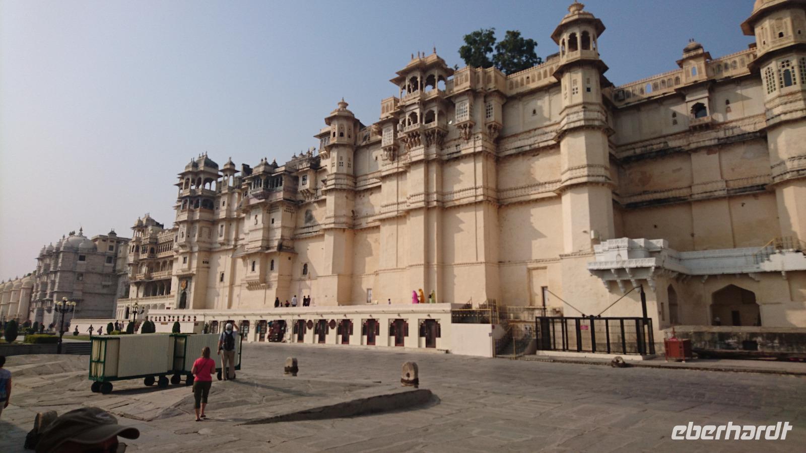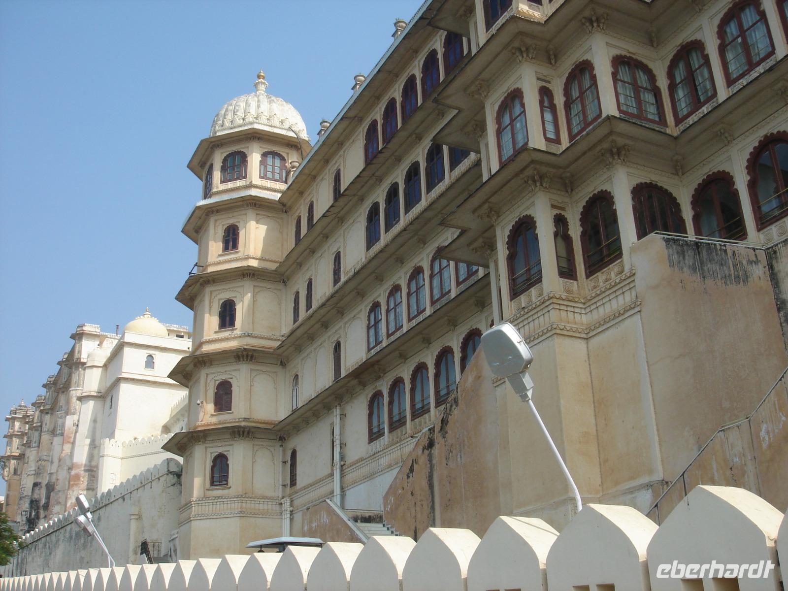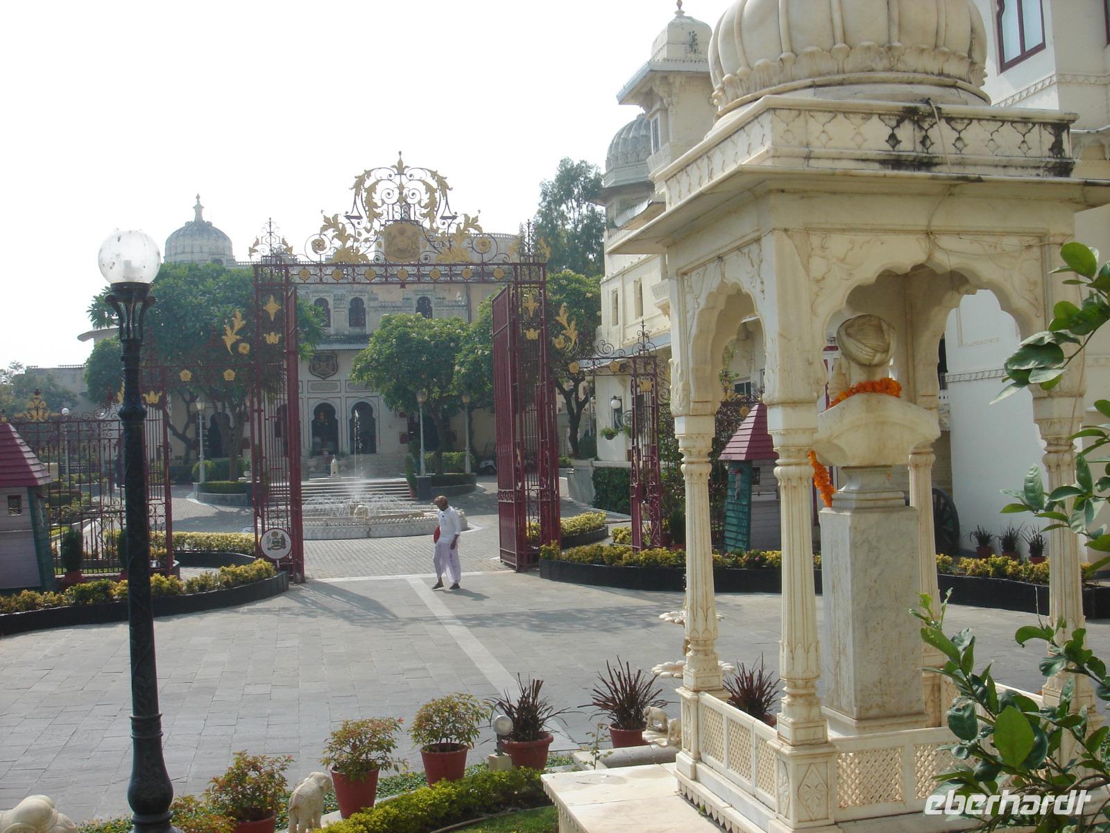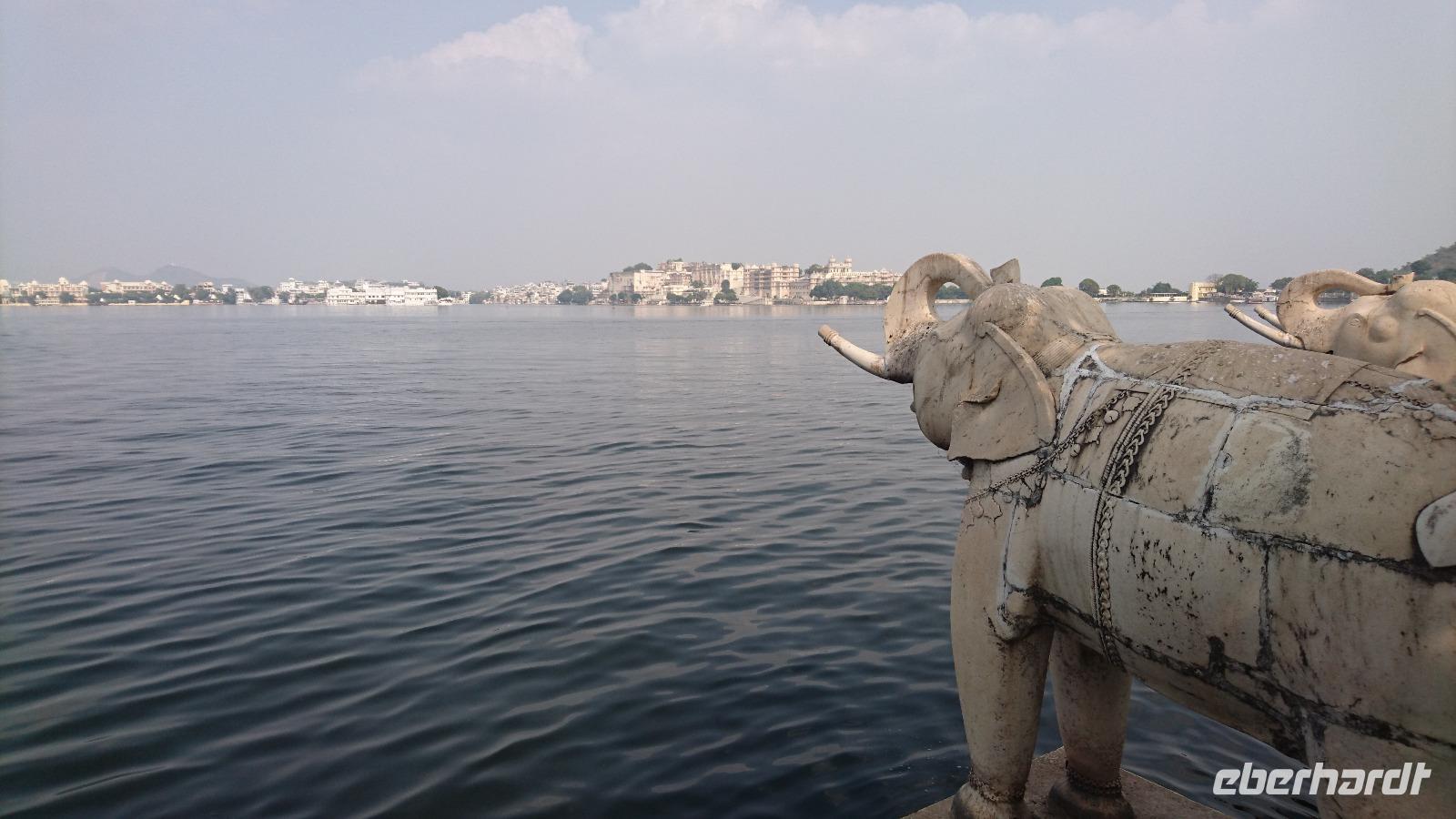 Nach dem Frühstück trafen wir uns heute in der Lobby, um einmal durch Udaipur zu spazieren. Enge Gassen, überall Geschäfte, bald ein Bazar, dazu viele Menschen, die uns ansahen und gleich mit uns gemeinsam freundlich lächelten sahen wir auf unserem Weg zum Stadtpalast. Dieser ist heute noch von der Maharadscha-Familie bewohnt und trotzdem zum Teil zu besichtigen. Man erzählt sich gar, man könne dort ein Cafétrinken mit dem derzeitigen Machthaber im Palast buchen, doch wir sahen uns lieber einige Ausstellungsstücke an, staunten über das Pferd mit dem Elefantenrüssel, mit dem man einmal eine anrückende Armee verunsicherte, entdeckten interessante Szenen auf den vielen in Miniaturmalerei erschaffenen Gemälden und hatten einen guten Blick auf den See und den dortigen Seepalast, der ja Vorbild für den Wasserpalast in Jaipur war, jedoch auch hin und wieder in bekannten Filmen auftaucht, wie z.B. in James Bond 007 - Octopussy. Spöäter standen wir am See und bestiegen kurz darauf ein Boot, das uns entlang der Kulisse aus Stadtpalast, Wasserpalast, verschiedenen 5-Sterne-Hotels und Restaurants zu einer Insel brachte, auf dem sich eines der teuersten Cafés Indiens befand. Von hier hatte man einen weiteren herrlichen Blick über den See und hinüber zum Land. Später fuhren wir ein kleines Stück durch die Stadt und aßen in einem Seerestaurant zu Mittag, ehe wir den großen und vor allem wegen seiner Wasserspiele aber auch von Liebespaaren wegen seiner einsamen Ecken geschätzten Stadtpark Sahelion Ki Bari. Von hier konnten wir zu Fuß in die Werkstatt der Miniaturmalerei gehen und sahen dort, wie die wunderbaren Gemälde im Palast entstanden und was man dazu alles verwendete. Manch einer von uns nahm ein kleines in Udaipur gemaltes Bild auf Seide, Holz, Kamelknochen oder Keramik mit nach Hause. Später fuhren wir zum Hotel, von wo alle, die Lust hatten, nach einer kurzen Ruhephase aufbrachen, um im indischen Nationaltheater ein Puppenspiel und eine Tanzshow zu erleben. Der Tag war wieder mit so vielen Eindrücken ausgefüllt und nach dem Abendessen im Hotel freuten wir uns, erneut etwas Kraft tanken zu können für kommende Erlebnisse.