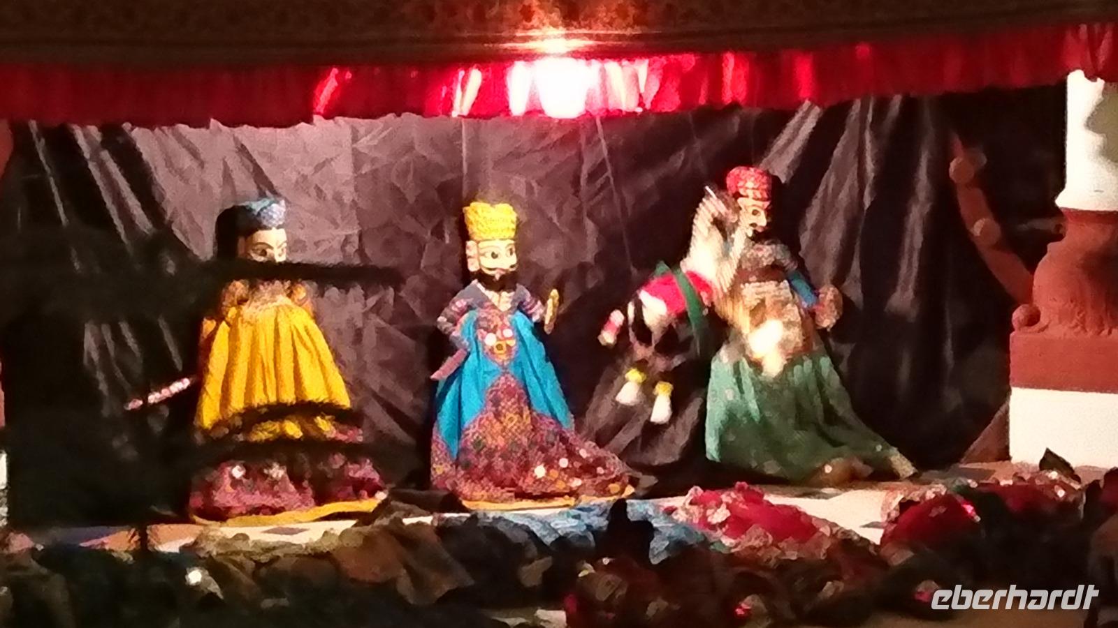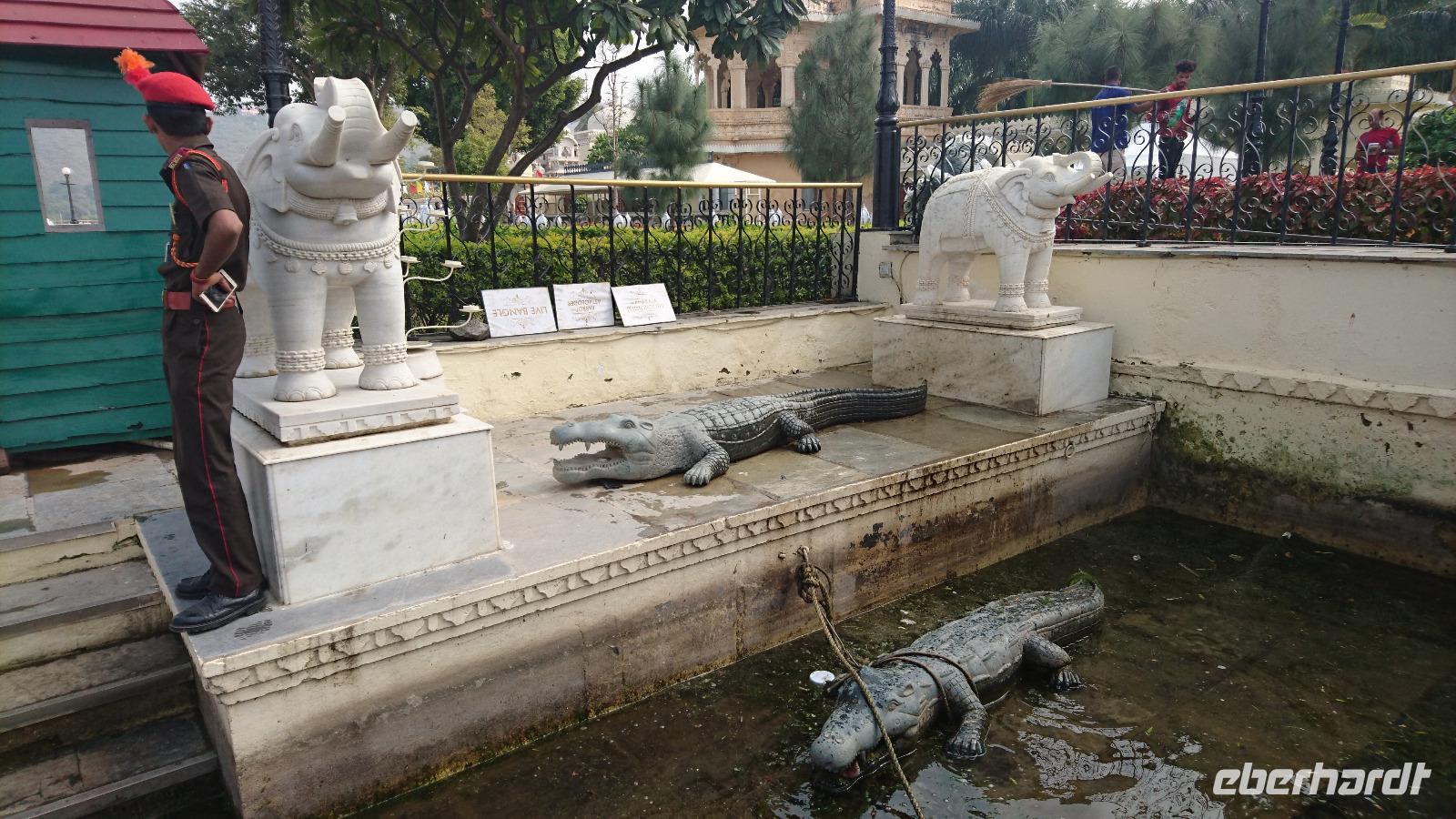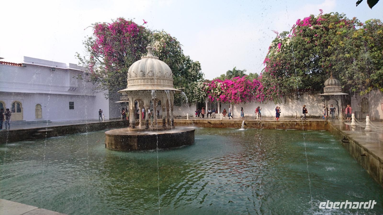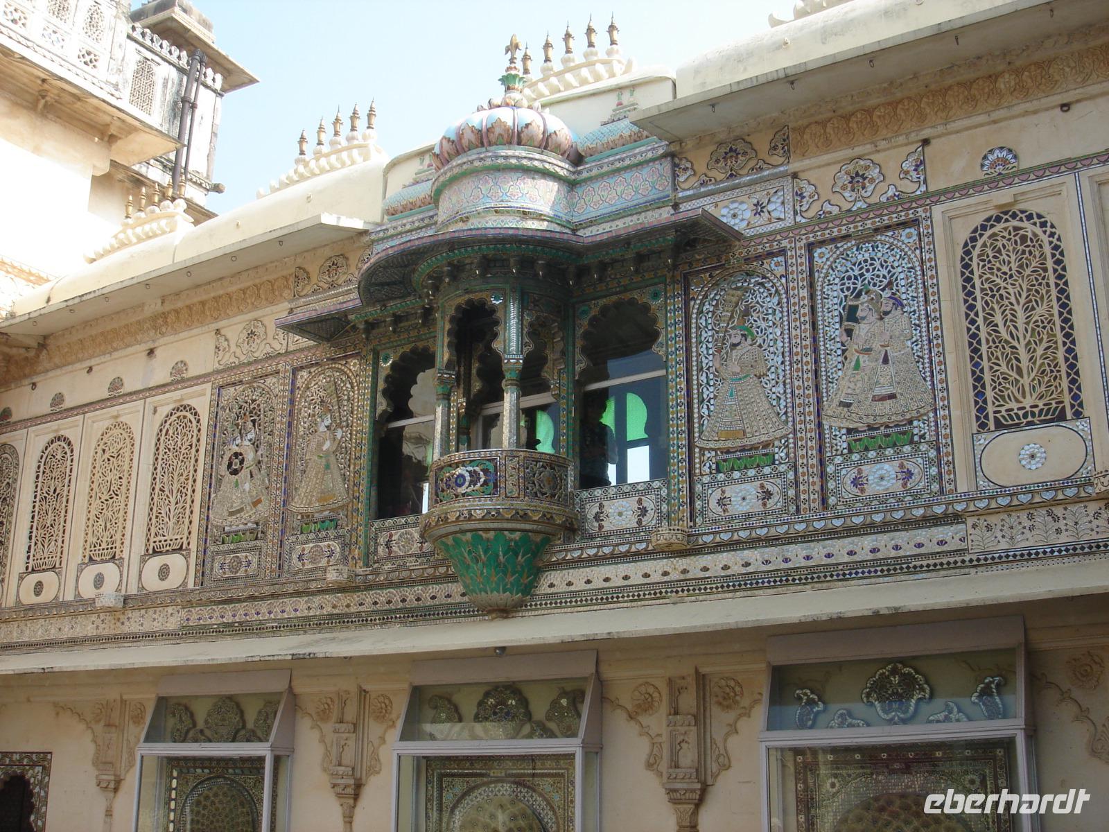 Nach dem Frühstück trafen wir uns heute in der Lobby, um einmal durch Udaipur zu spazieren. Enge Gassen, überall Geschäfte, bald ein Bazar, dazu viele Menschen, die uns ansahen und gleich mit uns gemeinsam freundlich lächelten sahen wir auf unserem Weg zum Stadtpalast. Dieser ist heute noch von der Maharadscha-Familie bewohnt und trotzdem zum Teil zu besichtigen. Man erzählt sich gar, man könne dort ein Cafétrinken mit dem derzeitigen Machthaber im Palast buchen, doch wir sahen uns lieber einige Ausstellungsstücke an, staunten über das Pferd mit dem Elefantenrüssel, mit dem man einmal eine anrückende Armee verunsicherte, entdeckten interessante Szenen auf den vielen in Miniaturmalerei erschaffenen Gemälden und hatten einen guten Blick auf den See und den dortigen Seepalast, der ja Vorbild für den Wasserpalast in Jaipur war, jedoch auch hin und wieder in bekannten Filmen auftaucht, wie z.B. in James Bond 007 - Octopussy. Spöäter standen wir am See und bestiegen kurz darauf ein Boot, das uns entlang der Kulisse aus Stadtpalast, Wasserpalast, verschiedenen 5-Sterne-Hotels und Restaurants zu einer Insel brachte, auf dem sich eines der teuersten Cafés Indiens befand. Von hier hatte man einen weiteren herrlichen Blick über den See und hinüber zum Land. Später fuhren wir ein kleines Stück durch die Stadt und aßen in einem Seerestaurant zu Mittag, ehe wir den großen und vor allem wegen seiner Wasserspiele aber auch von Liebespaaren wegen seiner einsamen Ecken geschätzten Stadtpark Sahelion Ki Bari. Von hier konnten wir zu Fuß in die Werkstatt der Miniaturmalerei gehen und sahen dort, wie die wunderbaren Gemälde im Palast entstanden und was man dazu alles verwendete. Manch einer von uns nahm ein kleines in Udaipur gemaltes Bild auf Seide, Holz, Kamelknochen oder Keramik mit nach Hause. Später fuhren wir zum Hotel, von wo alle, die Lust hatten, nach einer kurzen Ruhephase aufbrachen, um im indischen Nationaltheater ein Puppenspiel und eine Tanzshow zu erleben. Der Tag war wieder mit so vielen Eindrücken ausgefüllt und nach dem Abendessen im Hotel freuten wir uns, erneut etwas Kraft tanken zu können für kommende Erlebnisse.