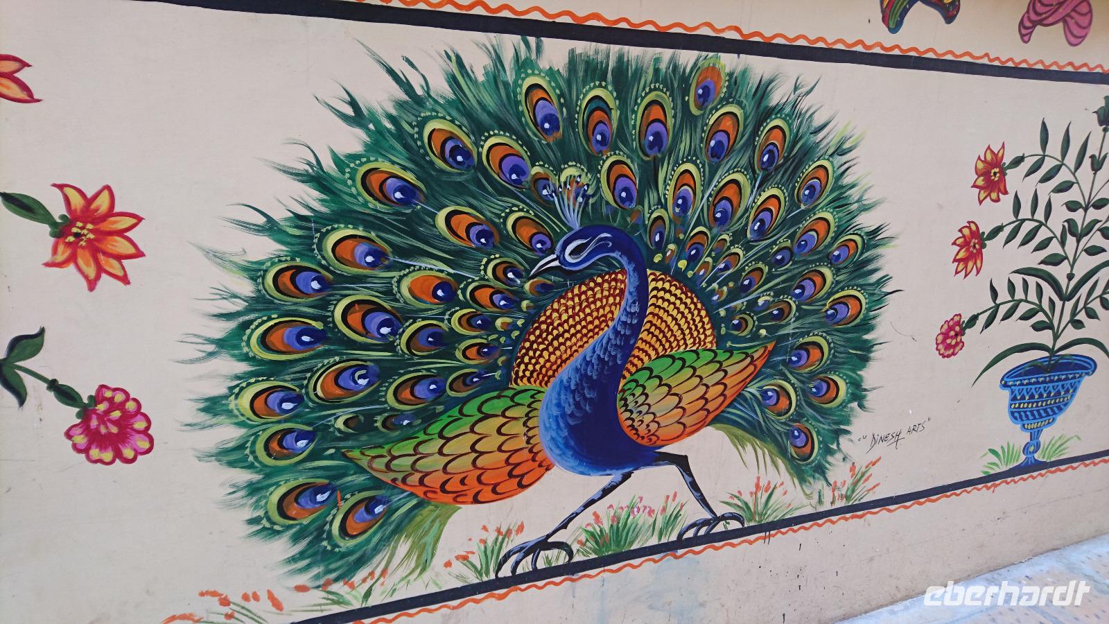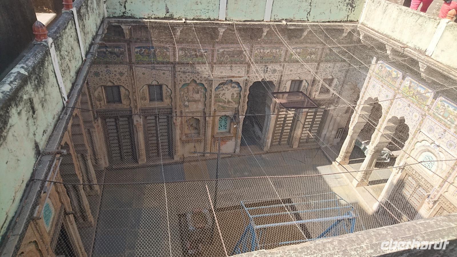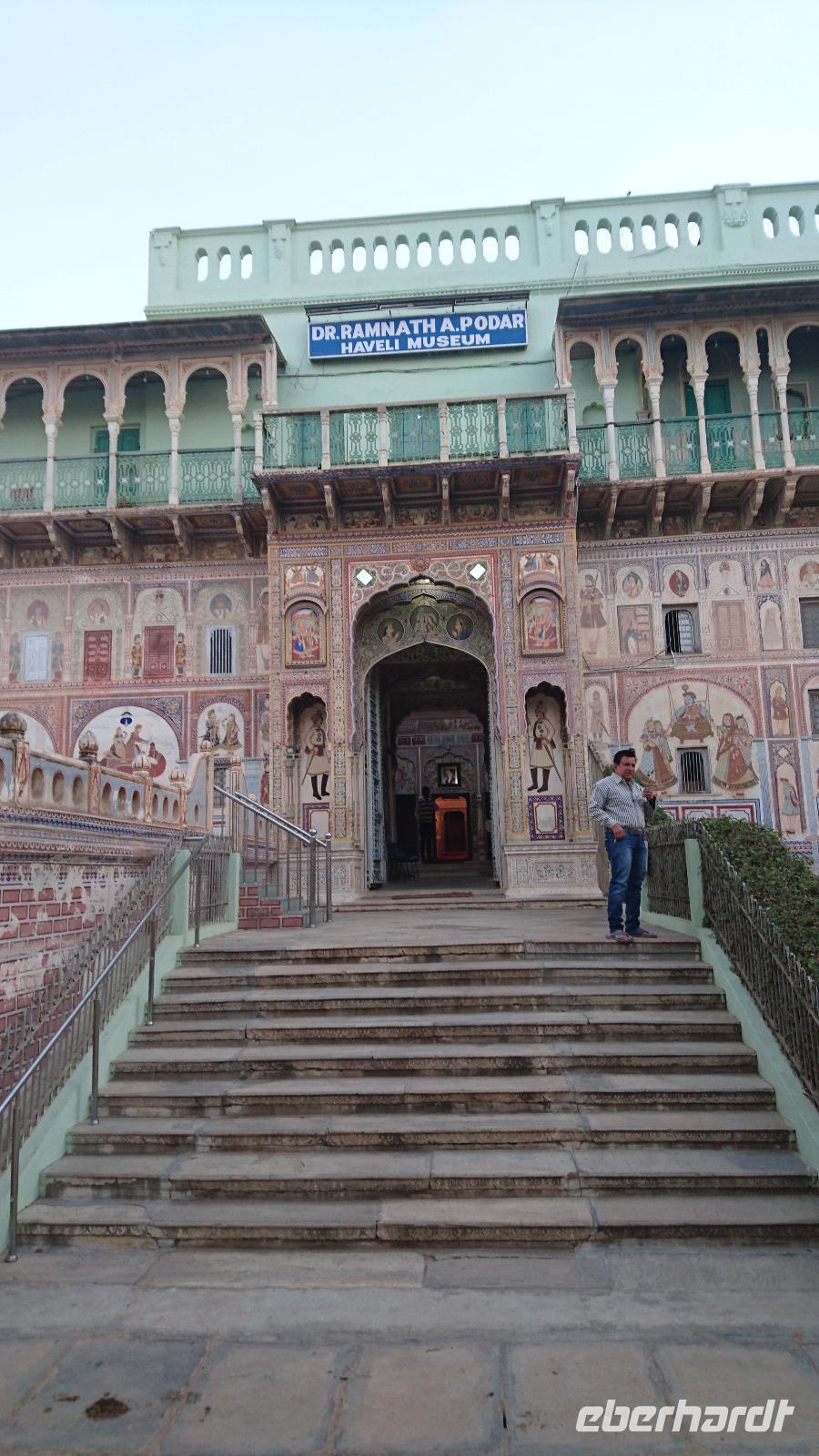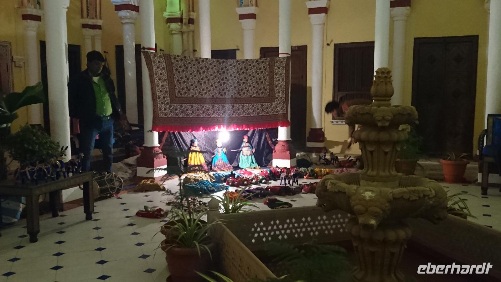 Eigentlich sollte es eher ein Haweli-Besuchs-Tag werden, also wir wollten alte und vor allem schön bemalte Händlerhäuser sehen und besichtigen. Doch wider Erwarten schlug nun der Magen-Darm-Trakt bei einigen unserer Gäste zu und wir machten den einen oder anderen Stopp, um Bedürfnisse zu befriedigen oder indische und auf die Situation perfekt abgestimmte schnellwirkende Medikamente zu besorgen und zu verabreichen. Später, allen ging es schon wieder etwas besser, erreichten wir Fatehpur, wo wir einmal ein Haweli besichtigen konnten, einmal die Herrlichkeit vergangener Tage betrachten durften, andermal jedoch erkannten, dass viel Arbeit und vor allem Geld investiert werden müsste, um den alten Glanz auch nur annähernd auf Dauer erhalten zu können. Auch einen interessanten Bazar besuchten wir in der Stadt, ehe es weiter zu unserer Mittagsrast und danach zu unserem Hotel ging. Hier angekommen, zogen wir erst einmal in unsere Zimmer. Es sollte ja die letzte Übernachtung vor Delhi sein, also erst einmal einrichten. Dann luden Ambrish und Stefan zu einem Rundgang durch den Ort, vorbei oder auch hinein in unterschiedliche Hawelis, dazu durch den nicht enden wollenden Bazar, bei dem sich verschiedenste Händler abwechselten und der besonders viele Silberhändler haben musste. Später kamen wir wieder ins Hotel, schauten uns vor dem Abendessen eine kleine Vorführung mit käuflichen Wendepuppen im Foyer an und aßen kurz darauf zu Abend, ehe wir den Tag bei einem Spaziergang oder im Hotel ausklingen ließen.