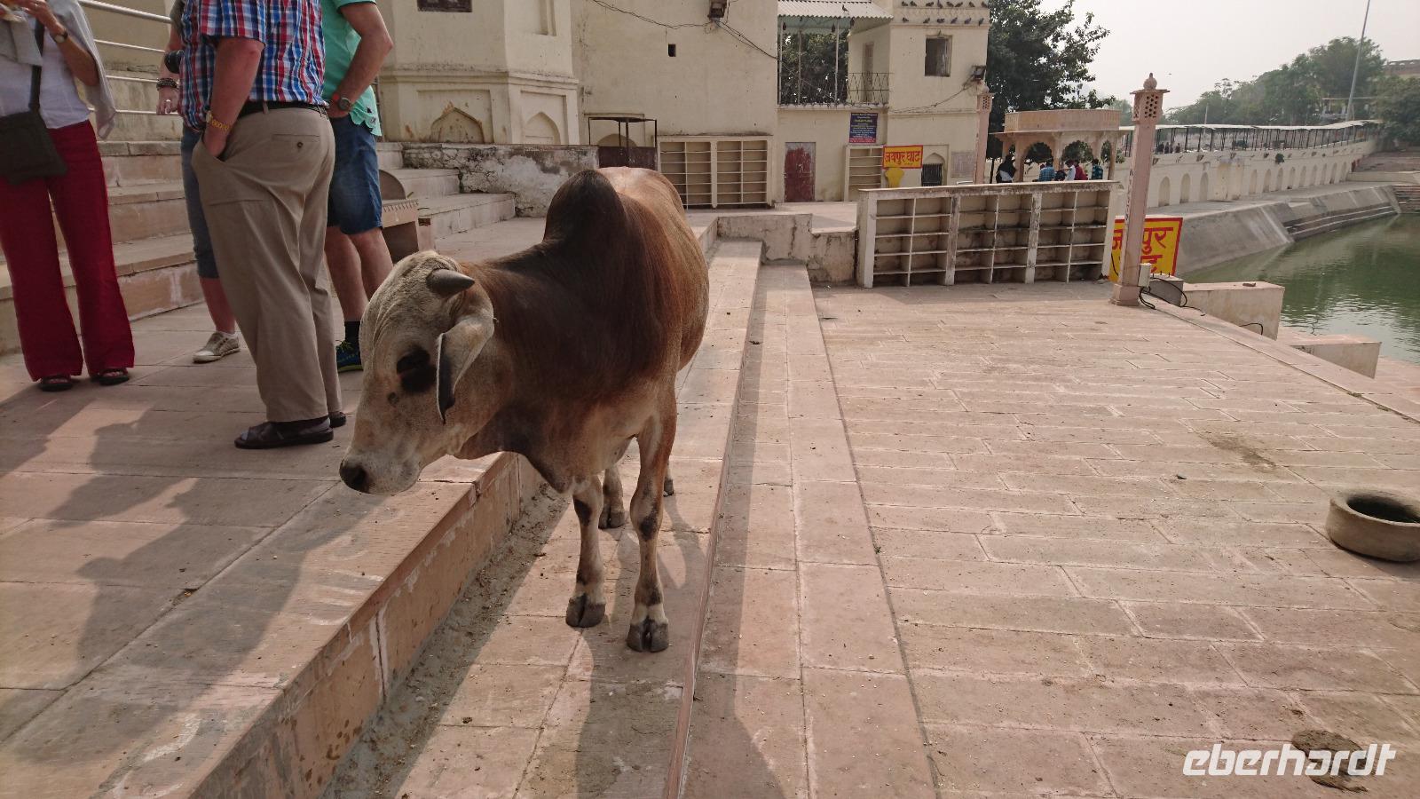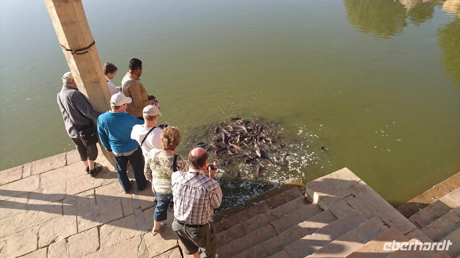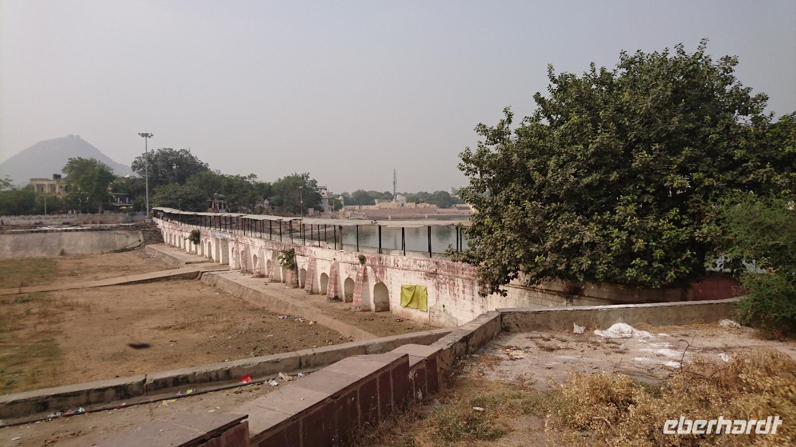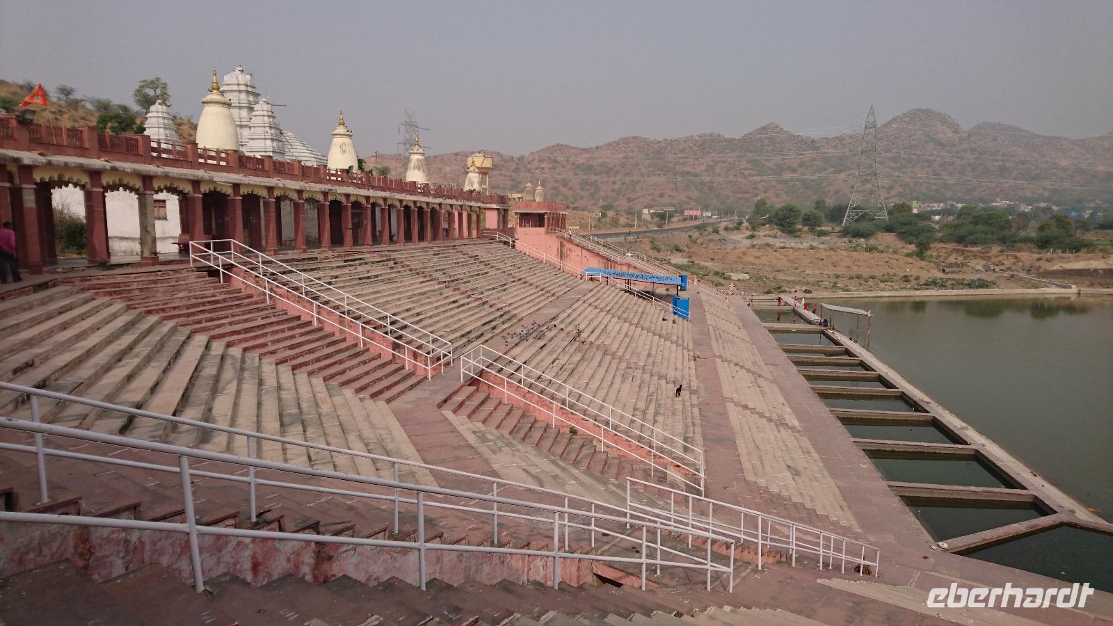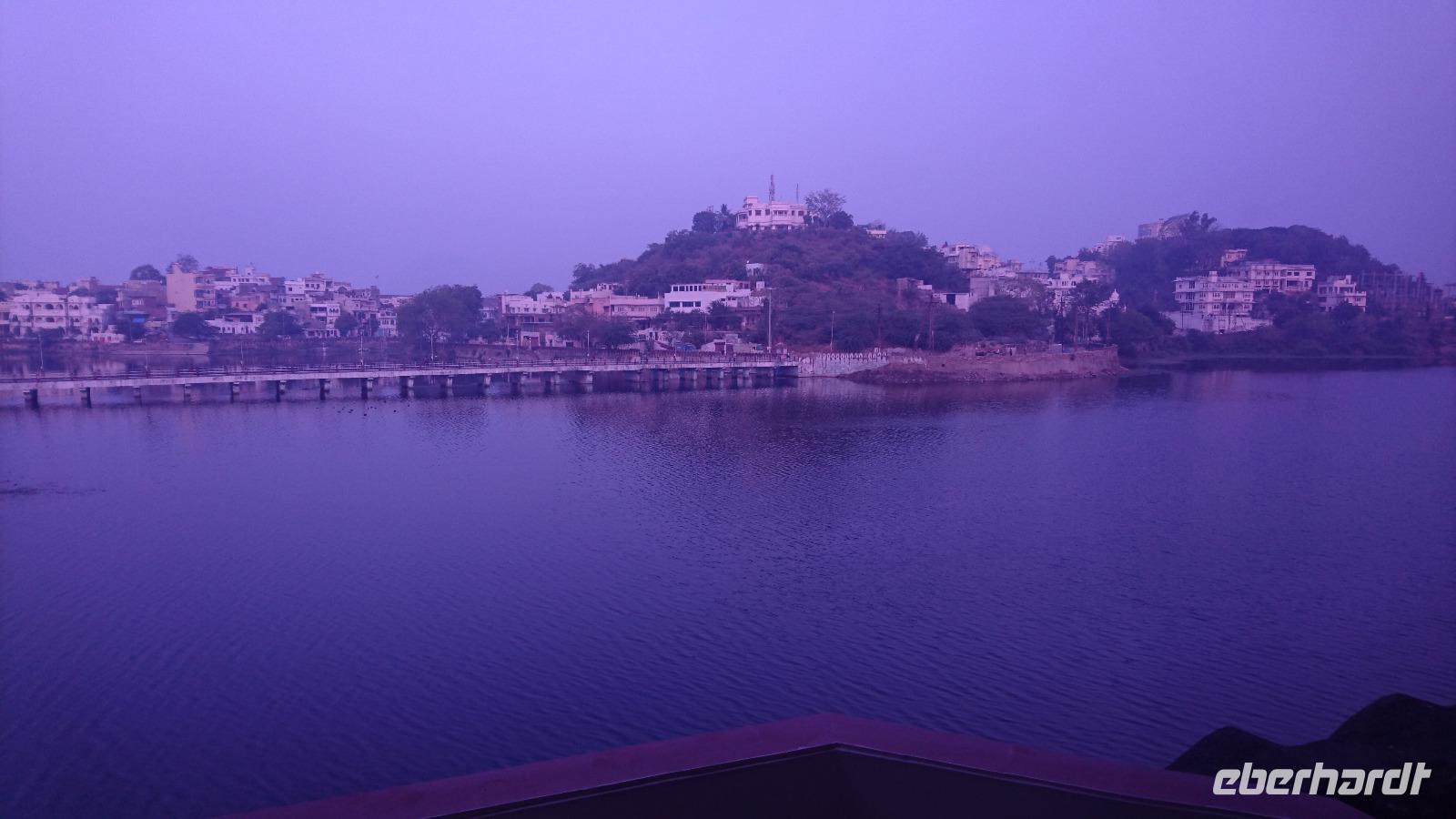 Am Morgen lachten wir, als uns Ambrish das heutige Tagesziel vorstellte. In die zweitschönste Stadt Indiens würden wir fahren. Natürlich. Jaipur, seine Geburtsstadt war die schönste und heute ging es nach Udaipur. Doch ehe wir dort angekommen sein würden, waren noch eine Menge Kilometer und ein ausgiebiger Zwischenstopp in einem heiligen Ort zu absolvieren. Also auf, auf, die Koffer in den Bus verladen lassen und schon waren wir unterwegs. Indische Straßen halten stets neue Überraschungen bereit. Mal ist die Piste gut, man kann mit 80 bis 100 Kilometern pro Stunde fahren, dann wiederum gleicht die Straße trotz der Auszeichnung als Hauptverbindungsroute zwischen großen und wichtigen Ortschaften, einer Huckelpiste, die jedem guten Fahrzeug etwas Probleme bereiten kann. Wir hatten uns auf unserem bisherigen Weg schon etwas daran gewöhnt und so verging die Fahrt nach Pushkar, unserem Zwischenstopp, mit Erzählen, etwas Ausruhen, dem Genießen der Landschaft um uns herum und einigen Schlucken des wichtigen Wassers recht schnell. Pushkar ist ein heiliger Pilgerort, zu dem gar die Herrscher der alten, glorreichen indischen Maharadscha-Zeiten aufbrachen und sich an den Ghats der Stadt wuschen, rituelle Handlungen vornahmen und sich so ihren Göttern näher fühlen konnten. Später kam das Pushkarfest hinzu, ein großer, unter dem Schutz der indischen Götterwelt stehender Verkaufsevent, bei dem Kamele die Besitzer wechseln. Wir hielten erst an den alten Ghats vor der Stadt, schauten uns dort an, wie in alter Zeit diese heiligen Orte angelegt wurden, fuhren dann in den Ort hinein, genossen mit Blick auf die neuen Ghats der Stadt einen Massala-Tee und nahmen später, wer wollte, an einer heiligen Zeremonie am See teil, ehe wir noch eine ganze weile das bunte Treiben auf dem Bazar der Stadt genossen, das eine oder andere Schnäppchen für zuhause erwarben und glücklich in den Bus stiegen. Nach dem Mittagessen in einem kleinen Gartenrestaurant am Wege, wo wir auch einmal etwas Tamarinde, eine antibakteriell wirkende Frucht des Tamarindenbaumes, probieren konnten. Auf dem weiteren Weg gen Udaipur entdeckten wir am Wege viele Marmorbetriebe, was wir verstanden, denn der Marmor aus Udaipur ist weltberühmt. Nach einem kleinen Stopp für die eigenen Bedürfnisse und noch dem einen oder anderen Schluck Rum zur Stärkung trafen wir bereits in der Dunkelheit und nach vielen interessanten Erlebnissen in unserem Hotel in Udaipur ein, um uns nach dem baldigen Abendessen für den nächsten tag auszuruhen.