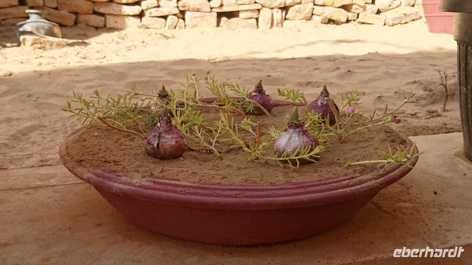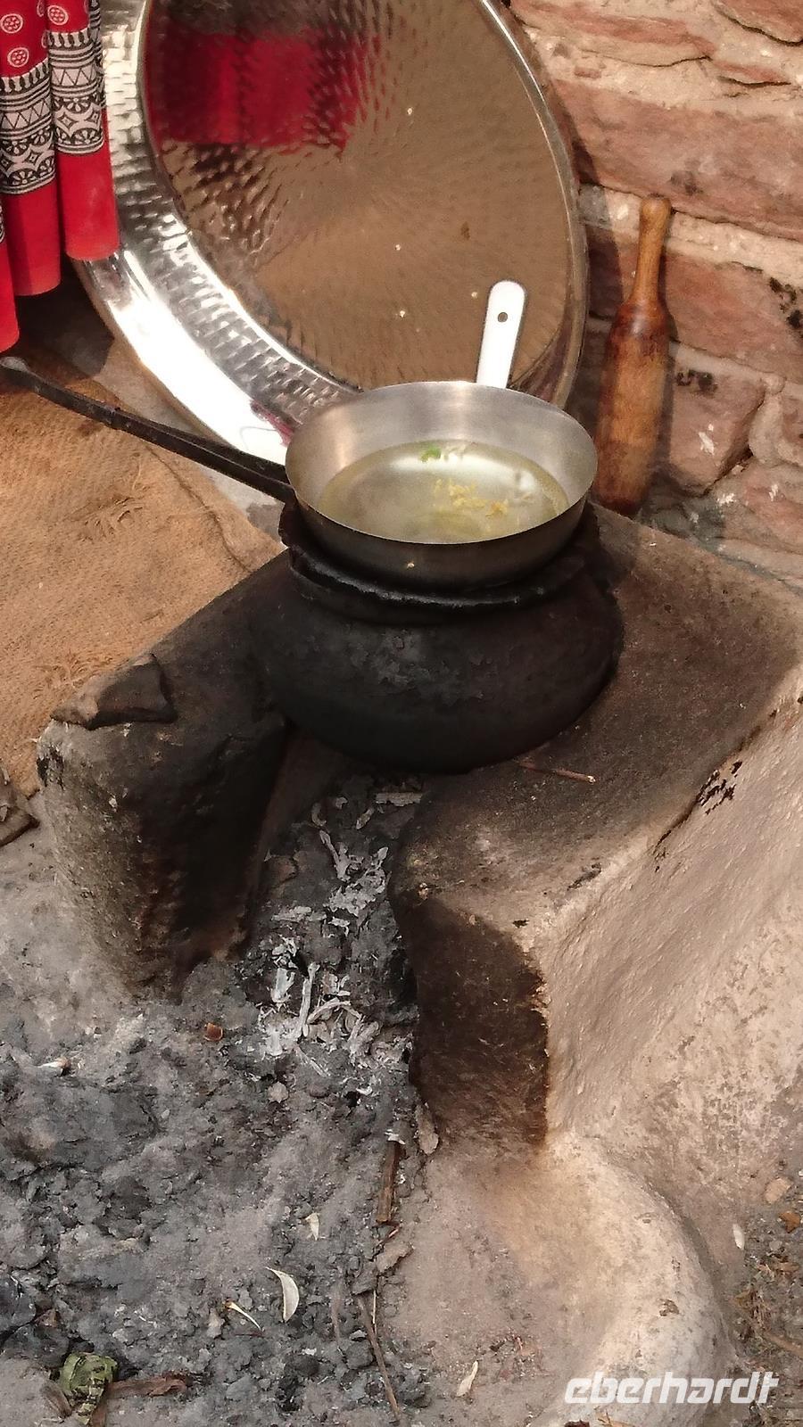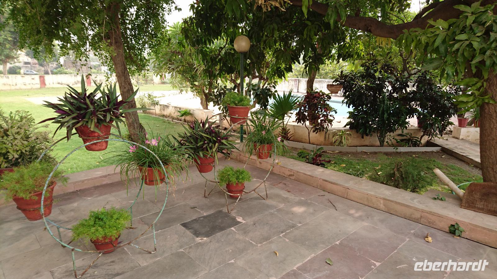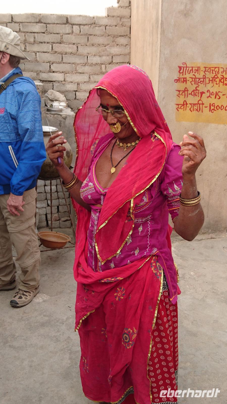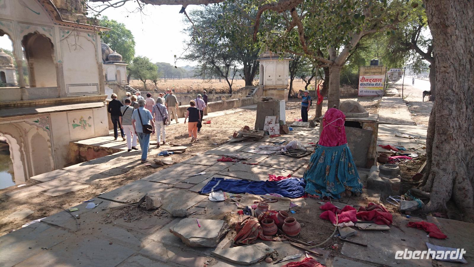 Heute durften wir wählen: Ausruhen im Hotel, am Pool, bei Massagen oder Jeepsafari zu den Antilopen und in ein kleines Opiumdorf. Die Meisten von uns wollten mitkommen, einige blieben zurück, um neue Kräfte zu tanken oder ein kleines, speisenbedingtes Unwohlsein zu überbrücken. Alle Safarilustigen fuhren bald mit Jeeps in die Savanne. Wenig später entdeckten wir bereits Antilopen, konnten ihnen zusehen, wenn sie zum Wasser gingen oder einfach nur gemeinsam grasten. Dazu sahen wir Springböcke und Schildkröten. Der Besuch in einer alten religiösen Stätte zeigte uns, wie nahe doch die indische Religion auch an der christlichen ist. Ob es wohl etwas mit der ebenso einen gemeinsamen Sprachstamm besitzenden Gemeinschaft der Indogermanen zu tun hatte? Wir wussten es nicht, nahmen es jedoch an. Dann erreichten wir ein Dorf, in dem die Einwohner nach alter Tradition Opium verarbeiteten und für rituelle Handlungen einsetzten, Bereitwillig zeigten sie uns ihre Behausungen, ließen uns ebenso an einer solchen Zeremonie teilhaben und so kamen wir zwar mit Opium in Kontakt, wurden aber versichert, dass wir nur die heilende, nicht aber die abhängig machende Seite dieses Stoffes aus der Mohnkapsel erfahren würden. Später fuhren wir zu einem Felsentempel und wurden überrascht. Denn Stefan und Ambrish organisierten gemeinsam mit dem Hotel, dass wir hier einen kleinen Imbiss zu uns nehmen durften. Eine gelungene Idee, denn wir saßen mit Blick über die Savanne und zu unserem Fort-Hotel hinüber direkt auf den Terrassen des alten und immer noch in Betrieb befindlichen Tempels. Dann ging es wieder zurück ins Hotel, doch damit war der Tag noch lange nicht zu Ende. Am Nachmittag luden Ambrish und Stefan für einen kleinen Rundgang durch das Dorf Khejrala rund ums Fort ein. Die Bevölkerung, besonders die Kinder, waren begeistert, uns Langnasen zu sehen, und verfolgten uns freundlich den ganzen kleinen Ausflug lang. Manche Frage beantwortete man uns hierbei und wir sahen auch noch einen traditionell arbeitenden Töpfer im Dorf, der für uns einen großen Tontopf fertigte. Später kamen wir wieder zurück ins Hotel und nahmen noch einmal ein traditionelles Abendessen ein, ehe wir den Tag ausklingen ließen.
