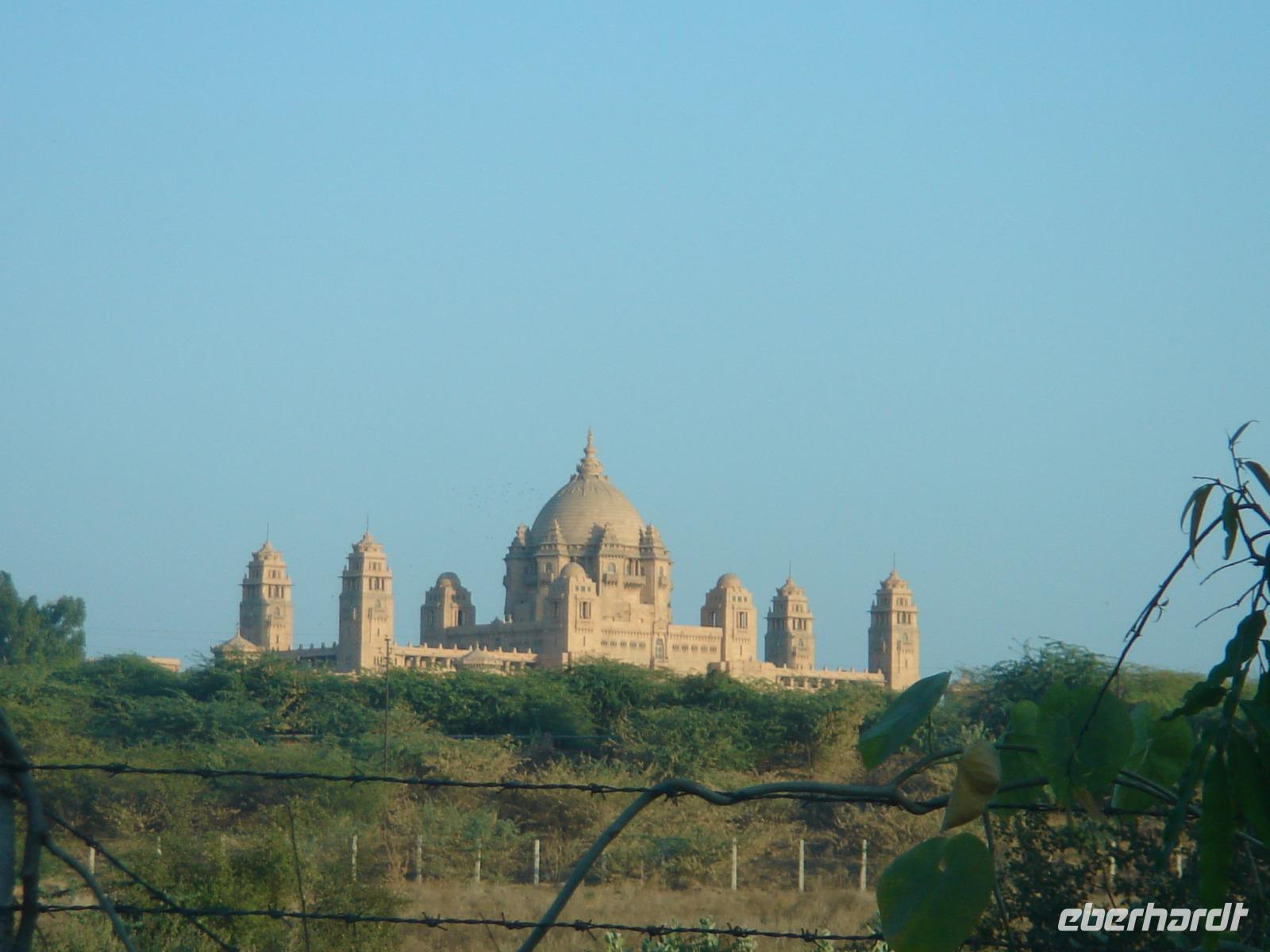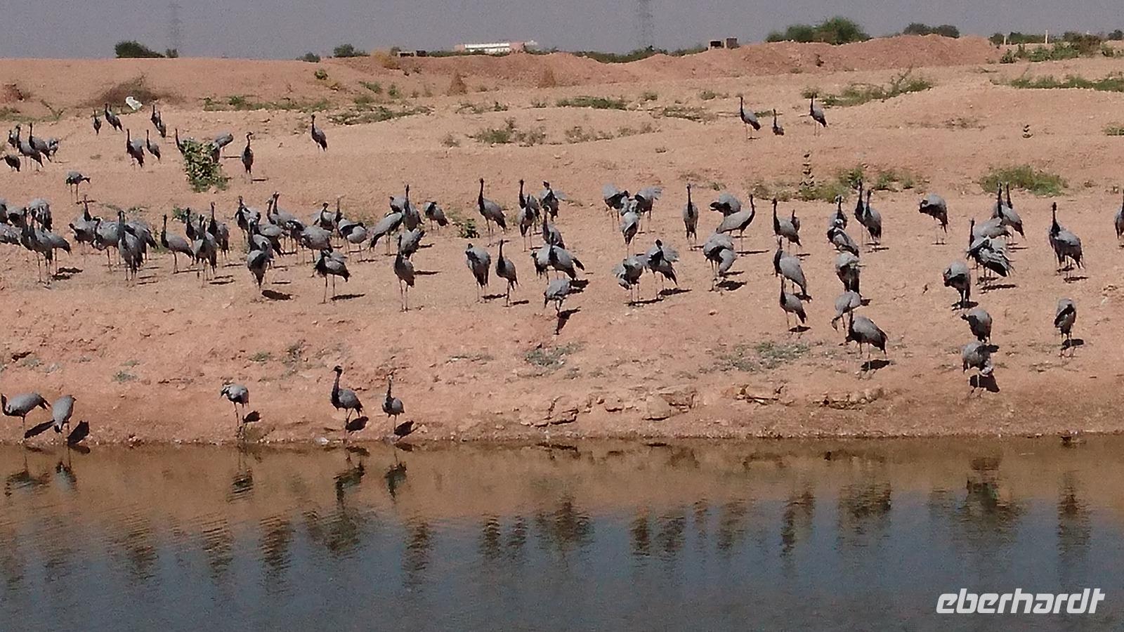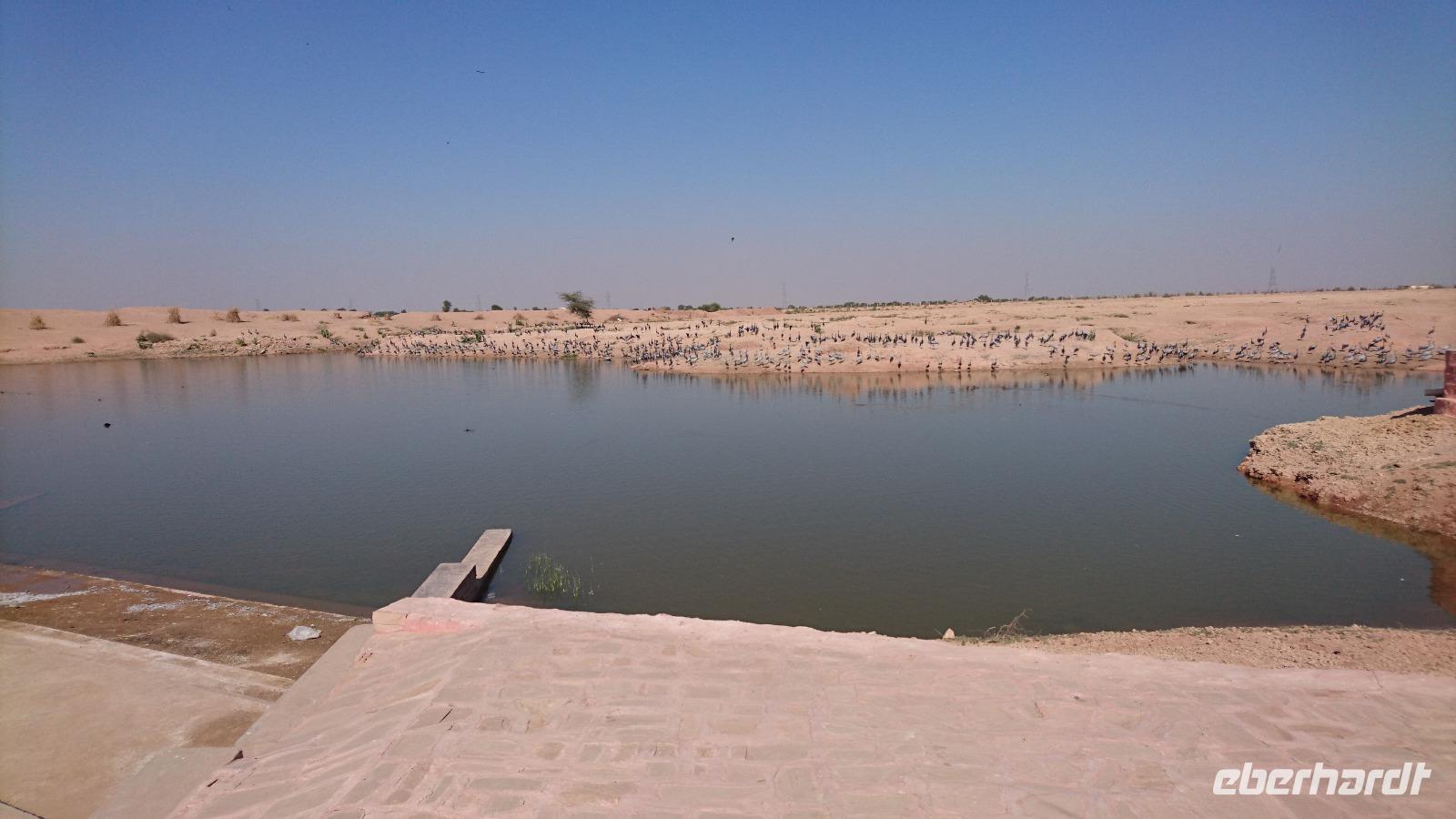 Heute sollte es in die Wüste gehen. Wüste. Was stellt man sich darunter vor? Karge Landschaft, nur Sand, hin und wieder eine Karawane, vielleicht gar verblichene Knochen und natürlich kein oder kaum Wasser. Auf die Wüste Thar trifft dies nur zum Teil zu. Zumindest ist es eine der am meisten bewohnten Wüsten. Dazu liegt sie zwischen Indien und Pakistan und schaut auf eine bewegte Geschichte als wichtige Station eines Teles der alten Seidenstraße zurück. Doch erst einmal brachen wir in Jodhpur auf und fuhren gen Westen. Auf unserem Wege lag noch eine bekannte und kulturhistorisch aber auch religiös sehr wichtige Tempelstadt. Osian. Seit wann der Ort verehrt und als heilig genutzt wurde, ist nicht bekannt. Es gibt in ihm und um ihn herum eine Unmenge alter Tempelanlagen, von denen ein Großteil heute nicht mehr in Betrieb, durch Geschehnisse vergangener Jahrhunderte gar entweiht und damit offengelassen ist. Trotzdem stehen die alten Tempelbauten noch fast unversehrt und man kann sie besichtigen, sich einen Eindruck von der Kunstfertigkeit aber auch der hohen Religiösität der alten Einwohner der Umgebung machen. Der Haupttempel jedoch ist immer noch in Betrieb und liegt auf einem Hügel mitten in der Stadt, die wahrscheinloch einst wegen der Tempel hier entstand. Wir erklommen den Hügel über die angelegten Treppen und besuchten den Tempel, konnten gar eine dort gerade stattfindende Zeremonie erleben. Am Ausgang beschenkte eine junge Inderin uns mit Süßigkeiten und erklärte, sie hätte eben erst geheiratet und bitte nun mit ihrem Süßigkeitenopfer, an dem wir alle teilhaben durften, die Götter um einen guten Willen zu Ihrer Ehe. Ihr Mann, ganz Inder und ein netter Kerl, war ebenfalls im Tempel und beaufsichtigte, ob seine Frau die Fürbitte richtig machte und alle um sie herum sich auch ordentlich zu ihr benahmen. Später fuhren wir nach Dank und vielem Winken weiter nach Kichna, wo sich eine riesige, nur im Europäischen Herbst und Winter erkennbare Kranichkolonie befand. Tausende Kraniche standen vor uns und liebten offensichtlich Waser und Wärme. Angeblich sollen sie irgendwann vor ihrer Abreise zu Fuß in den nächsten Ort laufen und sich so bei den Anwohnern für die Gastfreundschaft bedanken. Das konnten wir leider nicht sehen. Nach einem kleinen Mittagsimbiss in einem Restaurant am Wege fuhren wir noch in den Baba Hinku Tempel und besuchten auch den zum Tempel gehörenden Bazar, auf dem einige von uns sich mit echtem Weihrauch eindeckten. Ein kurzer Toilettenstopp unterwegs lockerte die restliche Fahrt bis zum Abend etwas auf und dann waren wir da, mitten in der Wüste, gleichzeitig in der größten Stadt der Thar, Jaisalmer. Wir bezogen hier unsere Hotelzimmer und genossen wenig später das Abendessen am Pool.