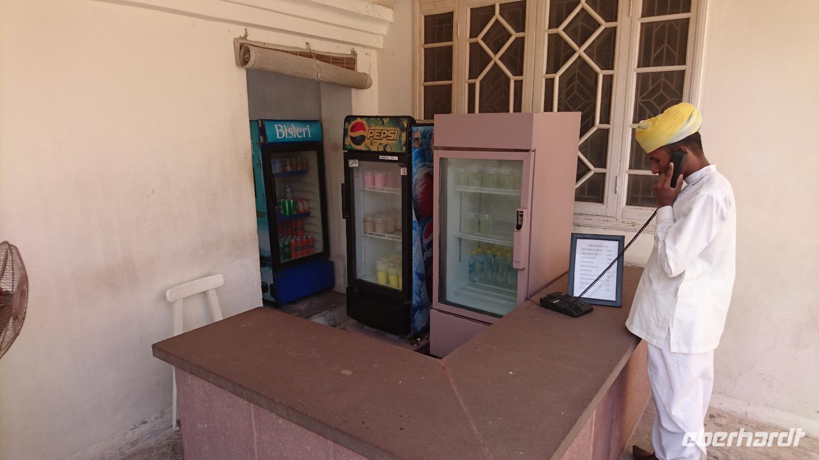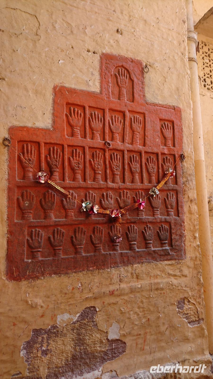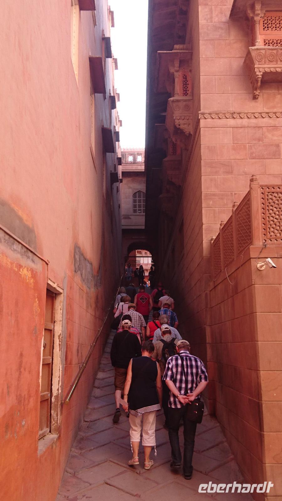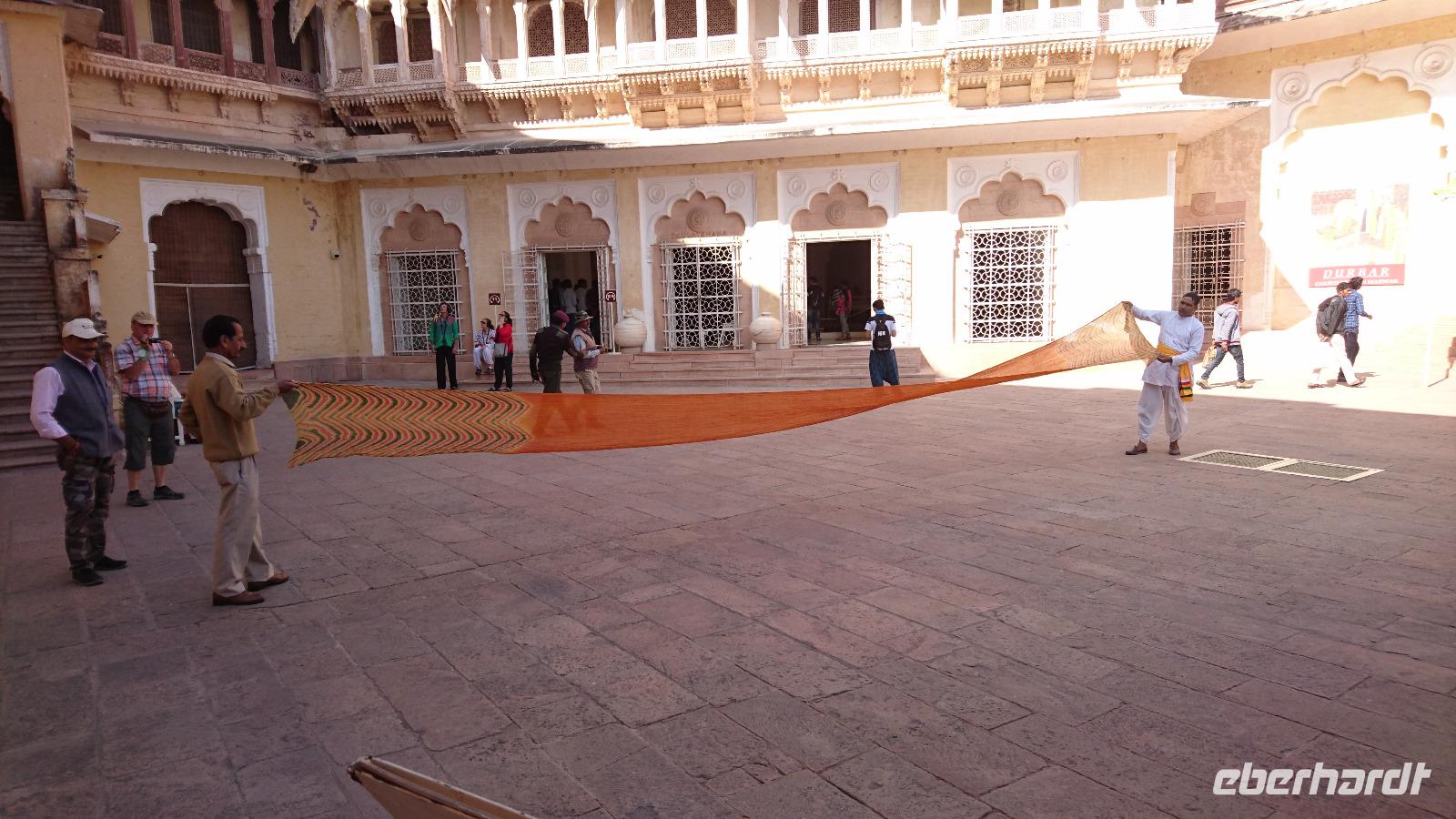 Lange Strecken kannten wir nun schon zur Genüge auf unserer Tour, doch heute sollte es einmal eine kurze Fahrtstrecke werden, die vor uns lag. Nach nur rund zwei Stunden Fahrt standen wir bereits vor dem großen Grabmal der Maharajas Jaswant Thada. Von hier hatten wir einen tollen Blick über die blaue Stadt Jodhpur und hinüber zur Festung Meherangarh, die wir wenig später ebenso besichtigten. Die Größe, der Bau auf einen Felsen, die vielen Räume und Sammlungen von Sänften, Waffen, Gemälden, die Vorführung, wie ein Turban aus vielen Metern Stoff gewickelt wird und dann auch hält, ebenso der Blick von der Festung und Burg über die Stadt und der kleine Imbiss, den wir am Burgrestaurant einnahmen waren ein besonders bleibendes Erlebnis. Danach liefen wir den Burgberg hinab in die Stadt, in der das bunte Treiben in allen Straßen, der große Bazar, die vielen kleinen Geschäfte, ein altes Frauen-Badebecken und viele interessante Bauwerke lockten. Im Bazar probierten wir frisch zubereiteten Lassi und bei einer Tee- und Gewürzhändlern am Wege ließen wir uns in die Geheimnisse der indischen Würzkunst, aber auch in die Sorten der vielen Tees einführen und staunten nicht schlecht, was man alles trinken und würzen konnte. Danach und nach noch einigen Metern durch den belebten Bazar bestiegen wir immer zu viert Pferdebuggys und fuhren mit diesen zurück zu unserem Bus, der in einer Seitenstraße auf uns wartete. Mit ihm ging es dann ins Hotel, wo wir später zu Abend aßen und den Tag in der drittschönsten Stadt Indiens, wie Ambrish sie nannte, gemütlich ausklingen ließen.