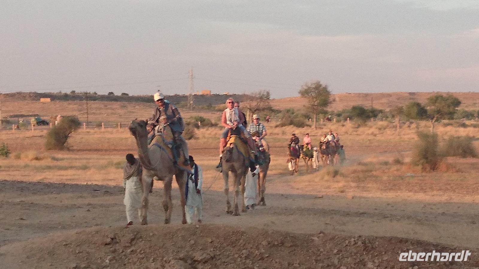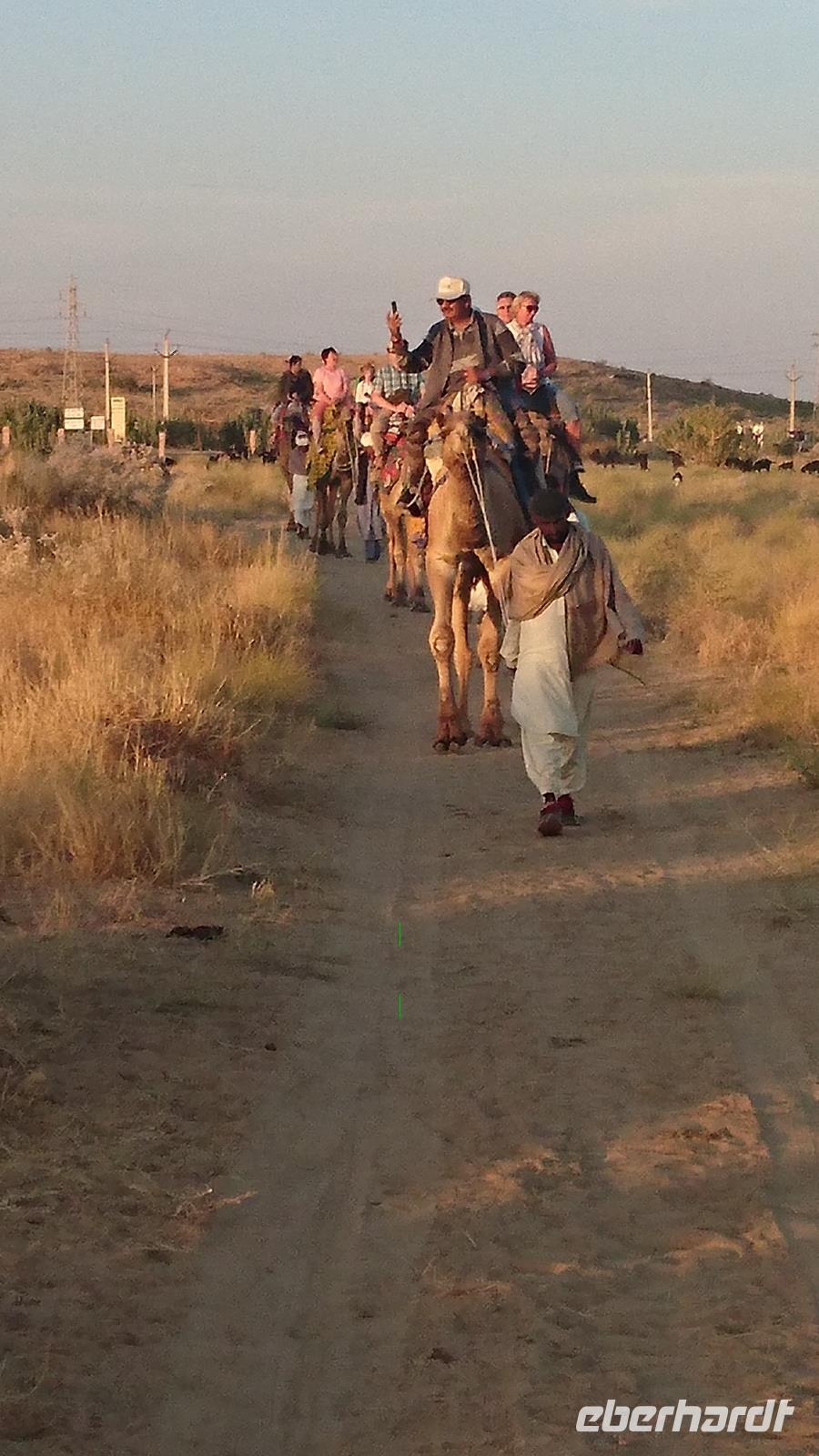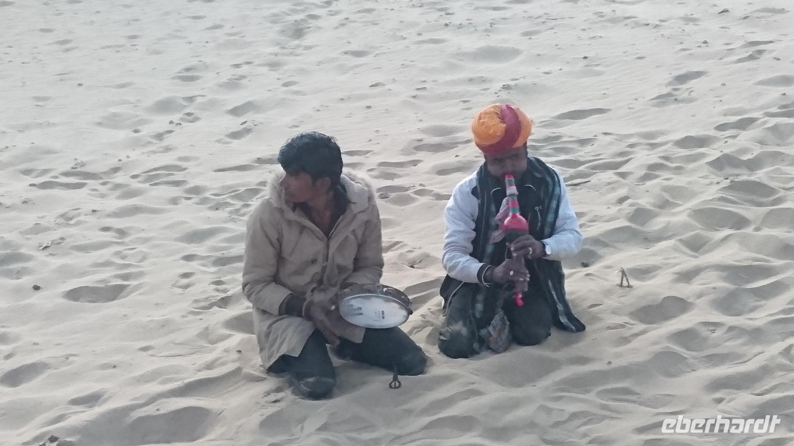 Jaisalmer ist wie aus einem Märchen. Alles ist in Gelb oder fast schon in Gold getaucht, zumindest wirkt es so und gab der Stadt sicher auch den Namen ‚Goldene Stadt'. Wir wollten heute einiges von dieser Stadt sehen. Am Morgen fuhren wir zum heiligen See, an dem einige Tempel und Gebetshallen erhalten blieben. Von hier hatten wir bald darauf einen herrlichen Blick auf das Fort, die heute noch von hunderten Menschen bewohnte Festung der Stadt. Die Händler am Heiligen See waren etwas nervig, aber die ruhige Art von Ambrish und Stefan verscheuchte sie schließlich doch. Nach dem Seebesuch ging es zum Fort. Vor einigen Jahren musste man hier eine neue Kanalisation einbauen, denn die alten Gemäuer waren zwar einst für einige Menschen ausgelegt, jedoch nicht für so viele, wie heute offiziell darin wohnten, geschweige denn noch deren Familienangehörige und die vielen Touristen, die am tage oder auch über Nacht blieben. Zum Glück ist noch nichts Nennenswertes vom alten Festungspalast eingestürzt, aber alles muss erhalten werden, was für den indischen Staat finanziell fast ein Ding der Unmöglichkeit ist. Da sind die Touristen und deren Käufe in Jaisalmer wahrlich die Rettung! Wir besichtigten das Fort, die Gassen, einige Geschäfte und ein Hawelimuseum, ehe wir hinunter in die Altstadt stiegen, dort an geeigneter Stelle etwas zum Mittag aßen und dann zu einem Silberhändler fuhren. Wer wollte, konnte sich seine Auslagen anschauen. Später ging es zum Hotel. Noch ein paar Stunden hatten wir Ruhe, ehe wir weiter hinein in die Wüste aufbrachen. Denn ein Programmhighlight unserer Tour sollte bis zum Sonnenuntergang folgen: Unser Kamelritt. Dazu fuhren wir in den kleinen Vorort Sam. Die Kameltreiber erwarteten uns bereits und wer nicht reiten wollte, konnte mit einem Kamelkarren befördert werden. Zum Sonnenuntergang erreichten wir dann eine schöne große Sanddüne und genossen dort Sand, Sonne, Whisky, Rum, Cola und handgemachte traditionelle Musik Rajasthans, vorgetragen von Musikern, die sich vor uns in den Sand setzten und uns den Sonnenuntergang verschönten. Später nach Rückkehr im Hotel und dem Abendessen spielten noch einige Gäste gemeinsam mit Stefan Rommé. So ließ sich der Abend wunderbar beenden.