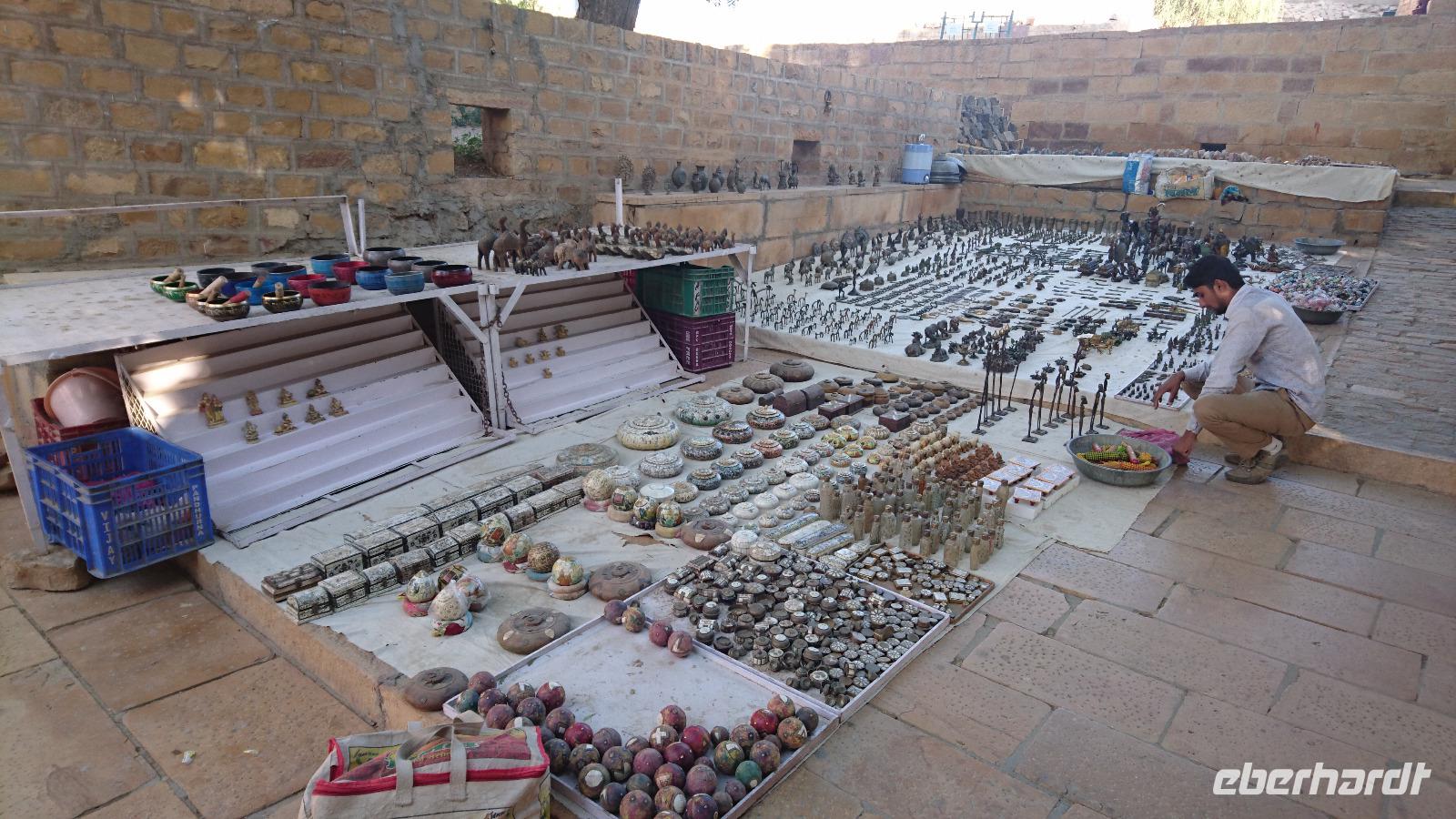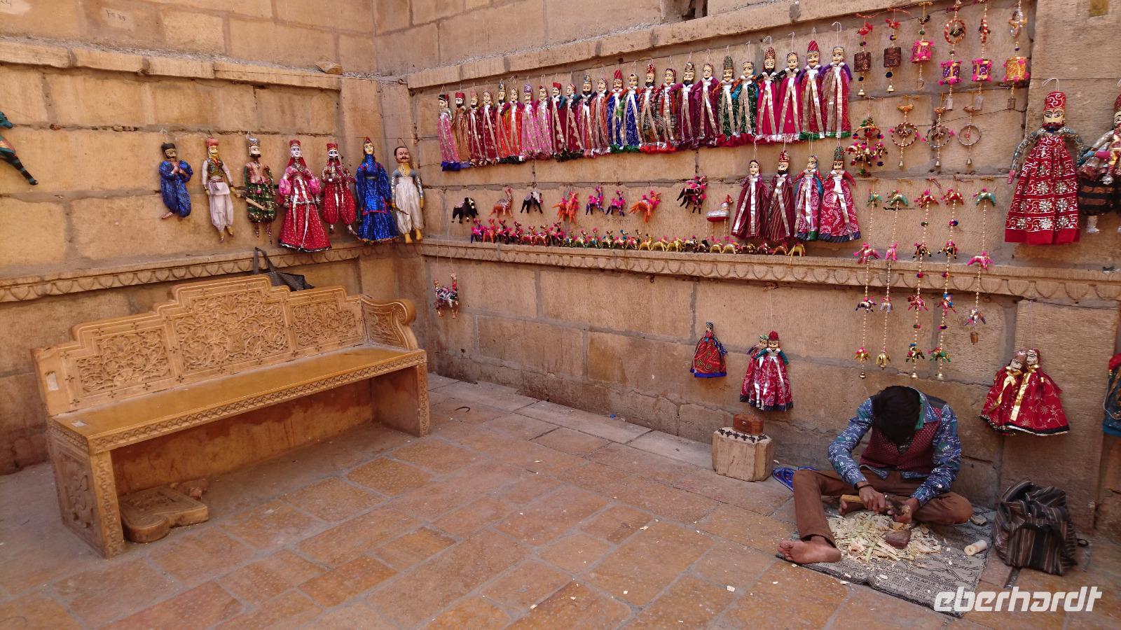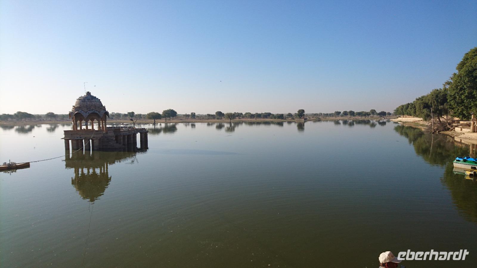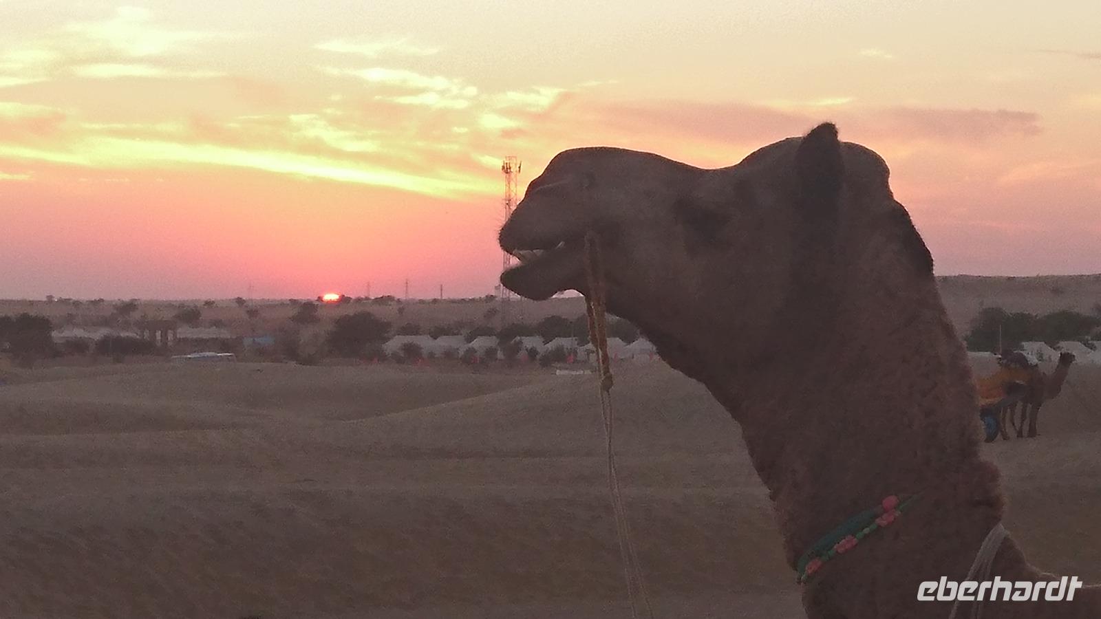 Jaisalmer ist wie aus einem Märchen. Alles ist in Gelb oder fast schon in Gold getaucht, zumindest wirkt es so und gab der Stadt sicher auch den Namen ‚Goldene Stadt'. Wir wollten heute einiges von dieser Stadt sehen. Am Morgen fuhren wir zum heiligen See, an dem einige Tempel und Gebetshallen erhalten blieben. Von hier hatten wir bald darauf einen herrlichen Blick auf das Fort, die heute noch von hunderten Menschen bewohnte Festung der Stadt. Die Händler am Heiligen See waren etwas nervig, aber die ruhige Art von Ambrish und Stefan verscheuchte sie schließlich doch. Nach dem Seebesuch ging es zum Fort. Vor einigen Jahren musste man hier eine neue Kanalisation einbauen, denn die alten Gemäuer waren zwar einst für einige Menschen ausgelegt, jedoch nicht für so viele, wie heute offiziell darin wohnten, geschweige denn noch deren Familienangehörige und die vielen Touristen, die am tage oder auch über Nacht blieben. Zum Glück ist noch nichts Nennenswertes vom alten Festungspalast eingestürzt, aber alles muss erhalten werden, was für den indischen Staat finanziell fast ein Ding der Unmöglichkeit ist. Da sind die Touristen und deren Käufe in Jaisalmer wahrlich die Rettung! Wir besichtigten das Fort, die Gassen, einige Geschäfte und ein Hawelimuseum, ehe wir hinunter in die Altstadt stiegen, dort an geeigneter Stelle etwas zum Mittag aßen und dann zu einem Silberhändler fuhren. Wer wollte, konnte sich seine Auslagen anschauen. Später ging es zum Hotel. Noch ein paar Stunden hatten wir Ruhe, ehe wir weiter hinein in die Wüste aufbrachen. Denn ein Programmhighlight unserer Tour sollte bis zum Sonnenuntergang folgen: Unser Kamelritt. Dazu fuhren wir in den kleinen Vorort Sam. Die Kameltreiber erwarteten uns bereits und wer nicht reiten wollte, konnte mit einem Kamelkarren befördert werden. Zum Sonnenuntergang erreichten wir dann eine schöne große Sanddüne und genossen dort Sand, Sonne, Whisky, Rum, Cola und handgemachte traditionelle Musik Rajasthans, vorgetragen von Musikern, die sich vor uns in den Sand setzten und uns den Sonnenuntergang verschönten. Später nach Rückkehr im Hotel und dem Abendessen spielten noch einige Gäste gemeinsam mit Stefan Rommé. So ließ sich der Abend wunderbar beenden.