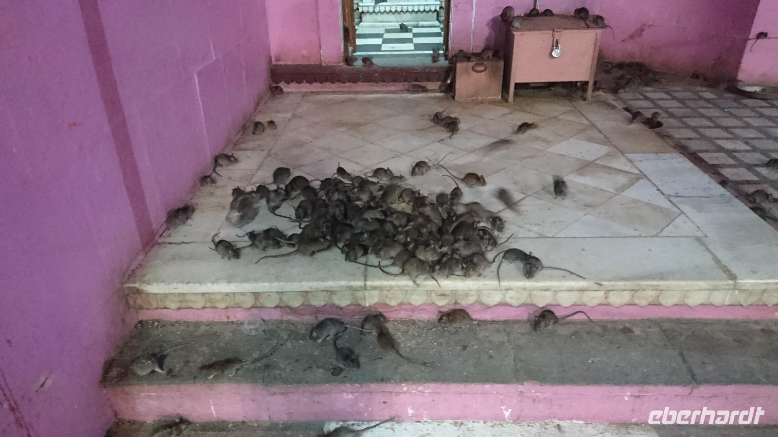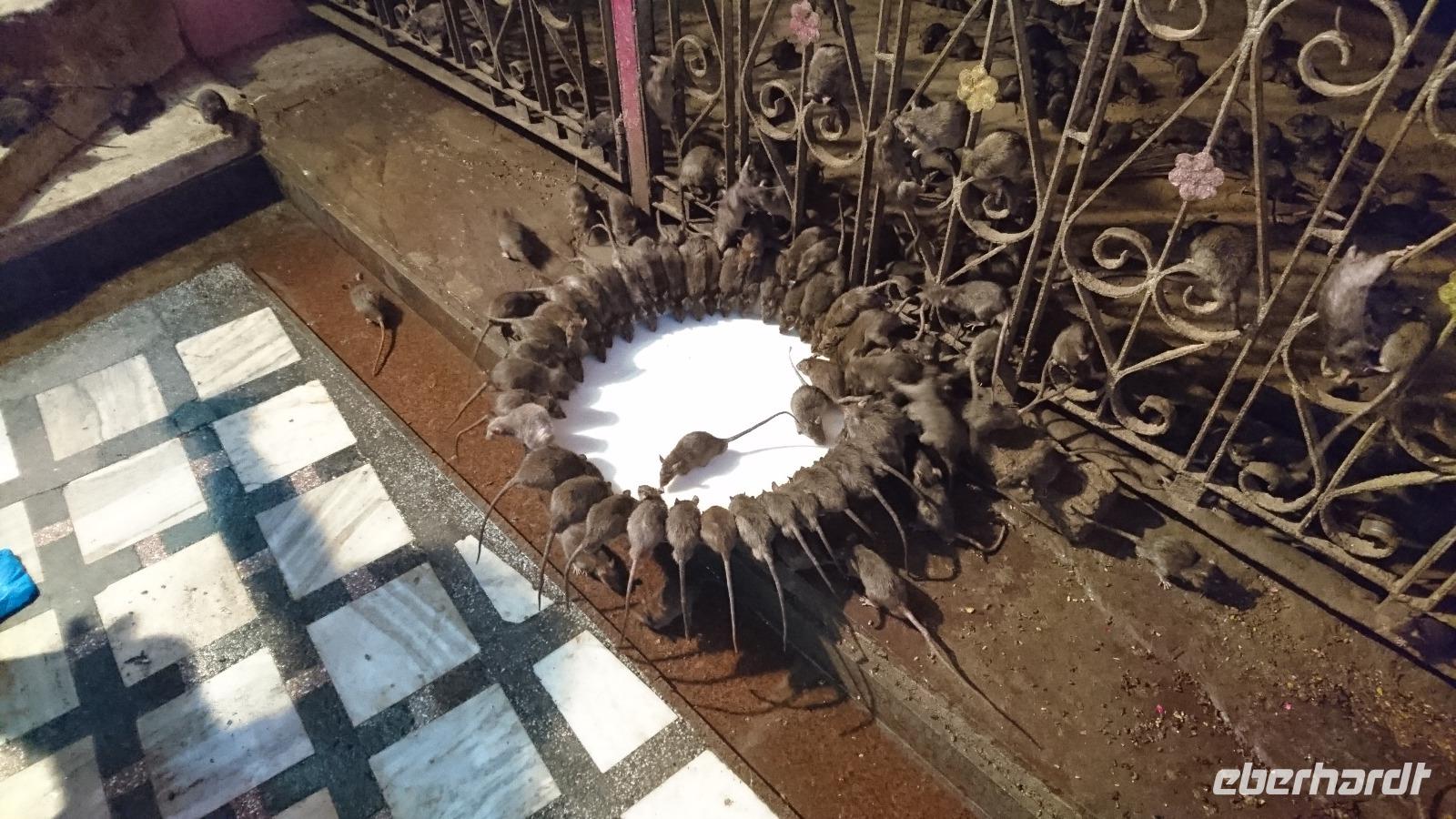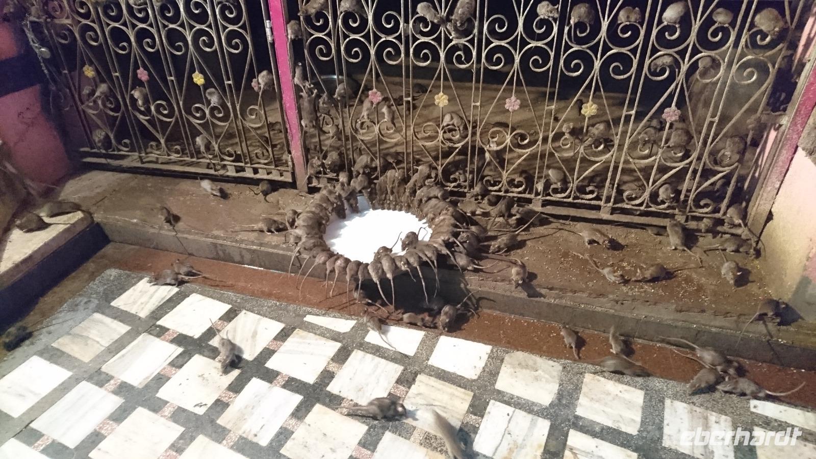 Wieder wirken die Kilometerangaben erst einmal lächerlich, wieder belehrten uns die Straßenverhältnisse eines Anderen. Am Morgen brachen wir zeitig auf, stoppten noch einmal mitten in der Wüste an einem kleinen Restaurant zum Bedürfnisstopp, ehe wir die Straße nach Bikaner entlangfuhren und die Wüste zumindest nicht noch tiefer ergründeten. Nahe des Indira-Gandhi-Kanals, eines schon sehr lange geplanten, nun auch fertigen Bewässerungsprojektes zur Begrünung der Wüste, erreichten wir am Mittag Bikaner und aßen in einem ehemals großen Hotelkomplex, in dem heute nur noch das Restaurant geöffnet war, zu Mittag. Danach besichtigten wir das Fort Bikaner, also den wehrhaften und immer noch von der einstigen Herrscherfamilie bewohnten Stadtpalast, in dem gar ein dem damaligen Maharadscha von den Engländern für treue Dienste im ersten Weltkrieg geschenktes Flugzeug zu sehen war. Werbegeschenke waren also auch damals schon ‚in'. Nach dem Palast fuhren wir ein gutes Stück aus Bikaner hinaus und erreichten bald NRCC. Was ist das? Die einzige Kamelzucht- und Forschungseinrichtung Asiens in solch einer Dimension. Wer wollte, konnte Kamelmilchprodukte kosten, auf jeden Fall sahen wir aber Vertreter verschiedenster Kamelarten, die hier gezüchtet und erforscht wurden. Ein interessanter Zwischenstopp! Der Kommende war nicht für jeden Gast geeignet, aber ebenfalls sehr interessant. Wir fuhren zum hinduistischen Tempel Karni Mata, besser bekannt als Rattentempel. Die Ratte an sich ist ein reinliches Tier. Nur ihre Lebensumstände in Kanalisationen bedingt, dass sie so viele Krankheitserreger herumtragen kann. Hier im Tempel wird die Ratte, auf der einst der Gott Ganesha geritten sein soll, täglich von tausenden Pilgern verehrt, gefüttert und besucht. Besonders eine der wohl fünf Albinoratten, also hellen oder weißen Ratten, wollen all die Besucher sehen, denn deren Sichtung soll ein besonderes Glück darstellen. Wir sahen keine weiße Ratte, fuhren jedoch um einige interessante Erfahrungen reicher zu unserem Hotel, aßen dort noch zu Abend und dachten daraufhin sicher lange und intensiv über die Erlebnisse des eben zu Ende gehenden Tages nach, ehe wir schliefen.