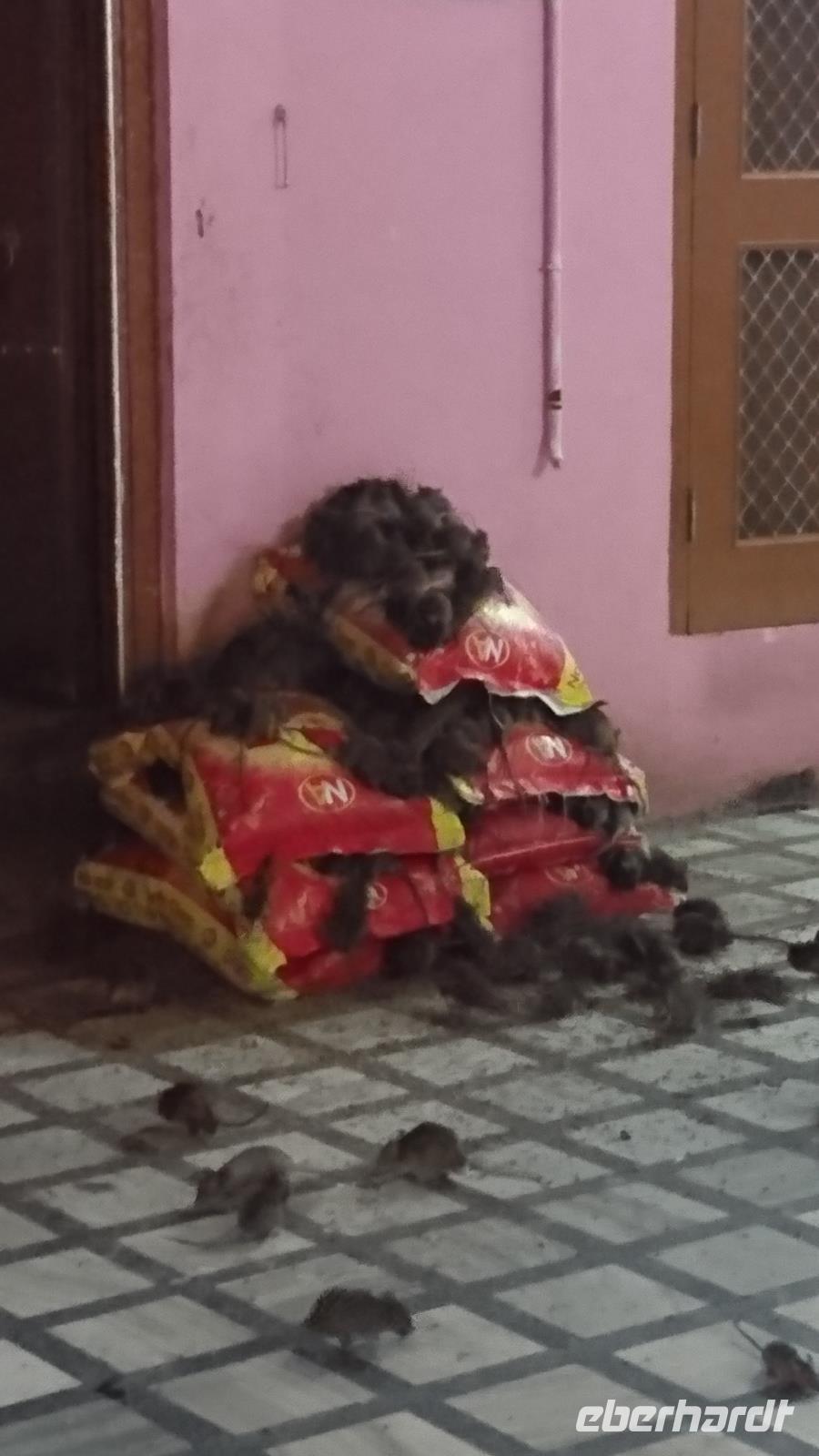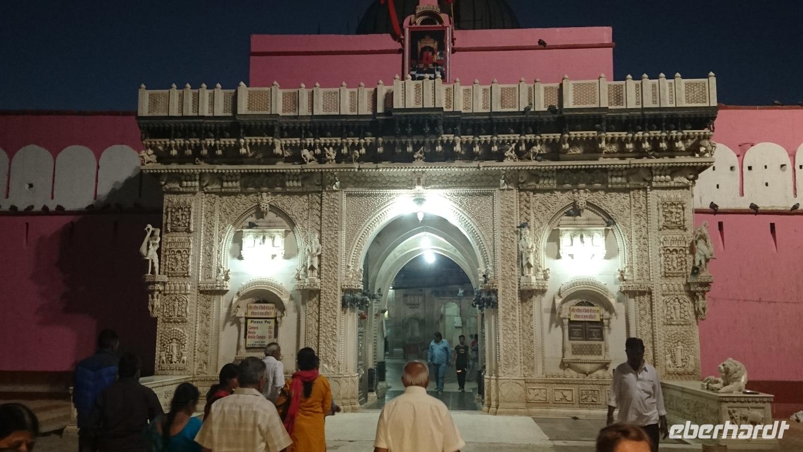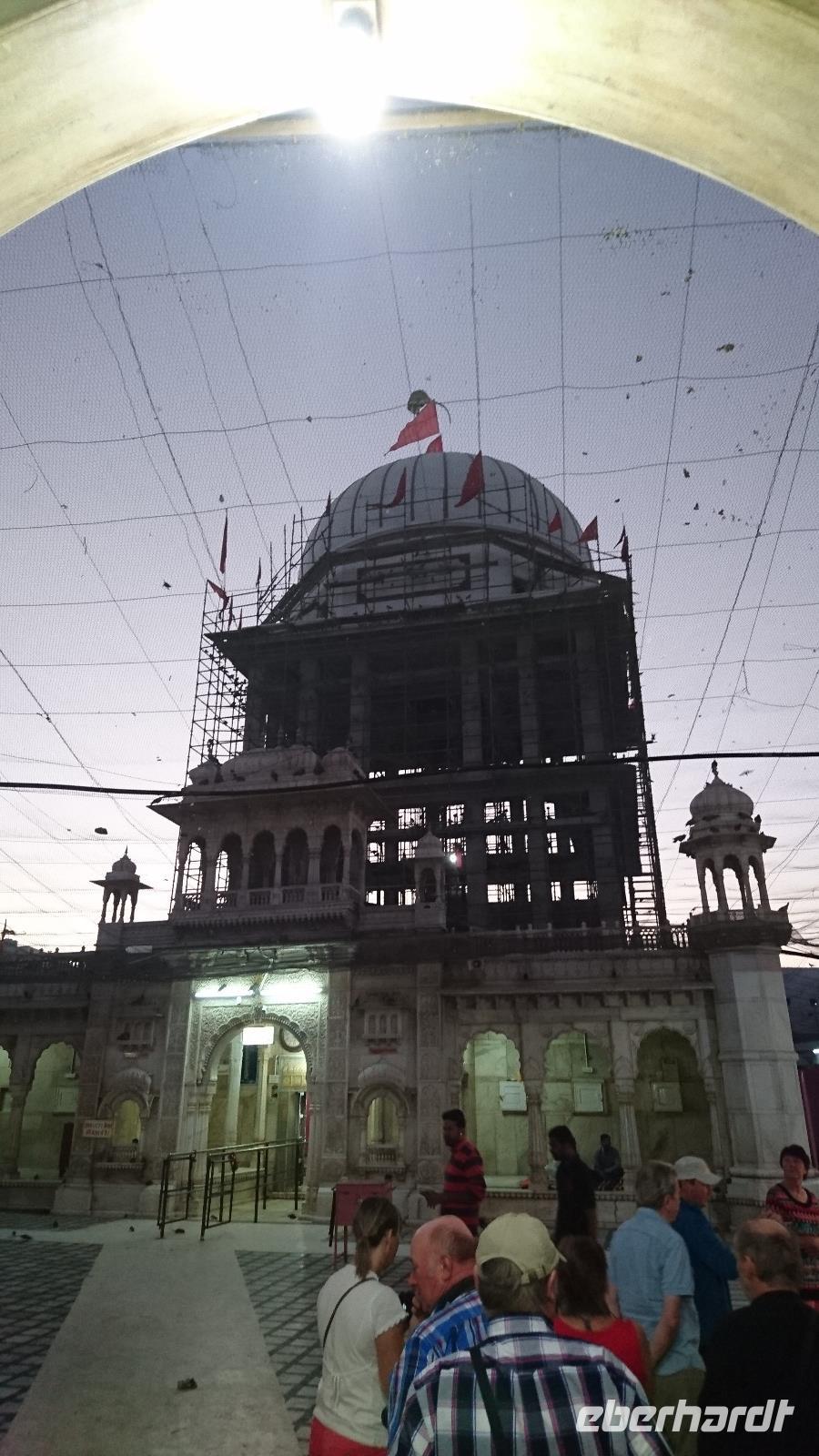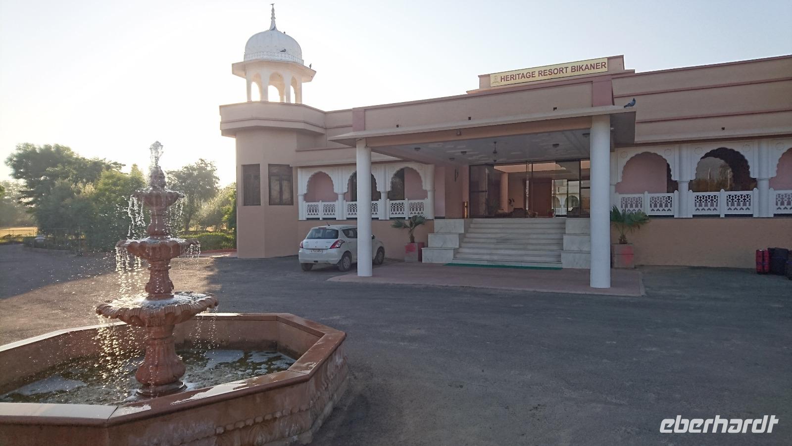 Wieder wirken die Kilometerangaben erst einmal lächerlich, wieder belehrten uns die Straßenverhältnisse eines Anderen. Am Morgen brachen wir zeitig auf, stoppten noch einmal mitten in der Wüste an einem kleinen Restaurant zum Bedürfnisstopp, ehe wir die Straße nach Bikaner entlangfuhren und die Wüste zumindest nicht noch tiefer ergründeten. Nahe des Indira-Gandhi-Kanals, eines schon sehr lange geplanten, nun auch fertigen Bewässerungsprojektes zur Begrünung der Wüste, erreichten wir am Mittag Bikaner und aßen in einem ehemals großen Hotelkomplex, in dem heute nur noch das Restaurant geöffnet war, zu Mittag. Danach besichtigten wir das Fort Bikaner, also den wehrhaften und immer noch von der einstigen Herrscherfamilie bewohnten Stadtpalast, in dem gar ein dem damaligen Maharadscha von den Engländern für treue Dienste im ersten Weltkrieg geschenktes Flugzeug zu sehen war. Werbegeschenke waren also auch damals schon ‚in'. Nach dem Palast fuhren wir ein gutes Stück aus Bikaner hinaus und erreichten bald NRCC. Was ist das? Die einzige Kamelzucht- und Forschungseinrichtung Asiens in solch einer Dimension. Wer wollte, konnte Kamelmilchprodukte kosten, auf jeden Fall sahen wir aber Vertreter verschiedenster Kamelarten, die hier gezüchtet und erforscht wurden. Ein interessanter Zwischenstopp! Der Kommende war nicht für jeden Gast geeignet, aber ebenfalls sehr interessant. Wir fuhren zum hinduistischen Tempel Karni Mata, besser bekannt als Rattentempel. Die Ratte an sich ist ein reinliches Tier. Nur ihre Lebensumstände in Kanalisationen bedingt, dass sie so viele Krankheitserreger herumtragen kann. Hier im Tempel wird die Ratte, auf der einst der Gott Ganesha geritten sein soll, täglich von tausenden Pilgern verehrt, gefüttert und besucht. Besonders eine der wohl fünf Albinoratten, also hellen oder weißen Ratten, wollen all die Besucher sehen, denn deren Sichtung soll ein besonderes Glück darstellen. Wir sahen keine weiße Ratte, fuhren jedoch um einige interessante Erfahrungen reicher zu unserem Hotel, aßen dort noch zu Abend und dachten daraufhin sicher lange und intensiv über die Erlebnisse des eben zu Ende gehenden Tages nach, ehe wir schliefen.