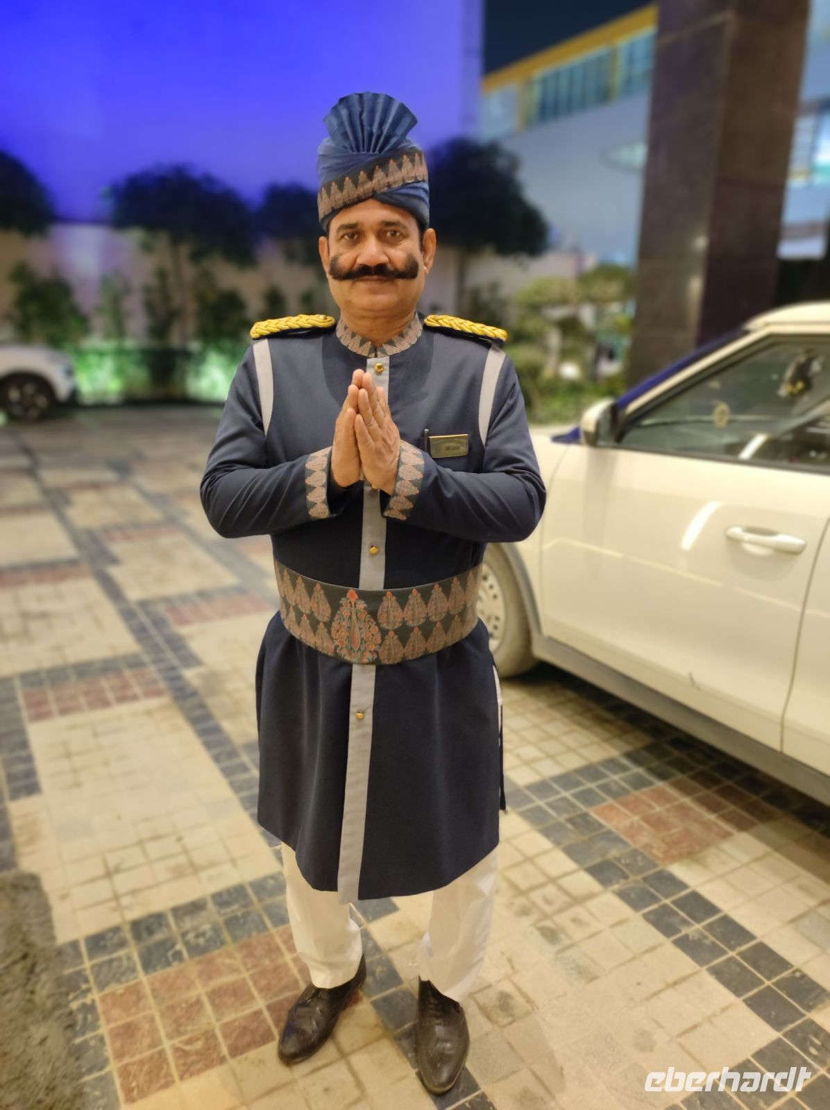 Wir fuhren auf der „Indischen Autobahn“ bis nach Jodhpur, auf dem Weg machten wir Stopp an einem besonderen Tempel – dem Motorrad Tempel. Hier wird ein heiliges Motorrad verehrt, die Legende ist, dass dieses nach einem Unfall beschlagnahmt wurde und immer wieder auf mysteriöse Weise zurück zum Unfallort fuhr, trotz Ketten und leeren Tank. Daraufhin wurde der Tempel gebaut und das heilige Zweirad mit einem Glaskasten geschützt. Anschließend ging es zur riesigen Festung von Jodhpur, wir fuhren mit einem Fahrstuhl hoch auf die Festungsmauer und erkundigten zusammen mit unseren örtlichen Reiseleiter die weitläufige Anlage. Bei einer kleinen Vorführung lernten wir, wie man einen Turban bindet und durften uns auch mal wie ein Maharadscha fühlen. Danach liefen wir durch die Stadt zu einem kleinen Gewürz- und Teeladen, wo wir nach einer kleinen Kostprobe mit viel Erklärung auch ein wenig Zeit das ein oder andere für die Küche zu Hause zu erwerben. Bevor wir in unser heutiges Hotel fuhren besuchten wir noch einen Laden, welcher wunderschönen Halstücher, Schals und auch Teppiche und Läufer verkaufte, hergestellt aus Kashmir Wolle oder Seide. Wir erreichten unser Hotel kurz nach Anbruch der Dunkelheit und genossen ein fabelhaftes Abendessen vom Buffet in dem Palastartigen Hotel.