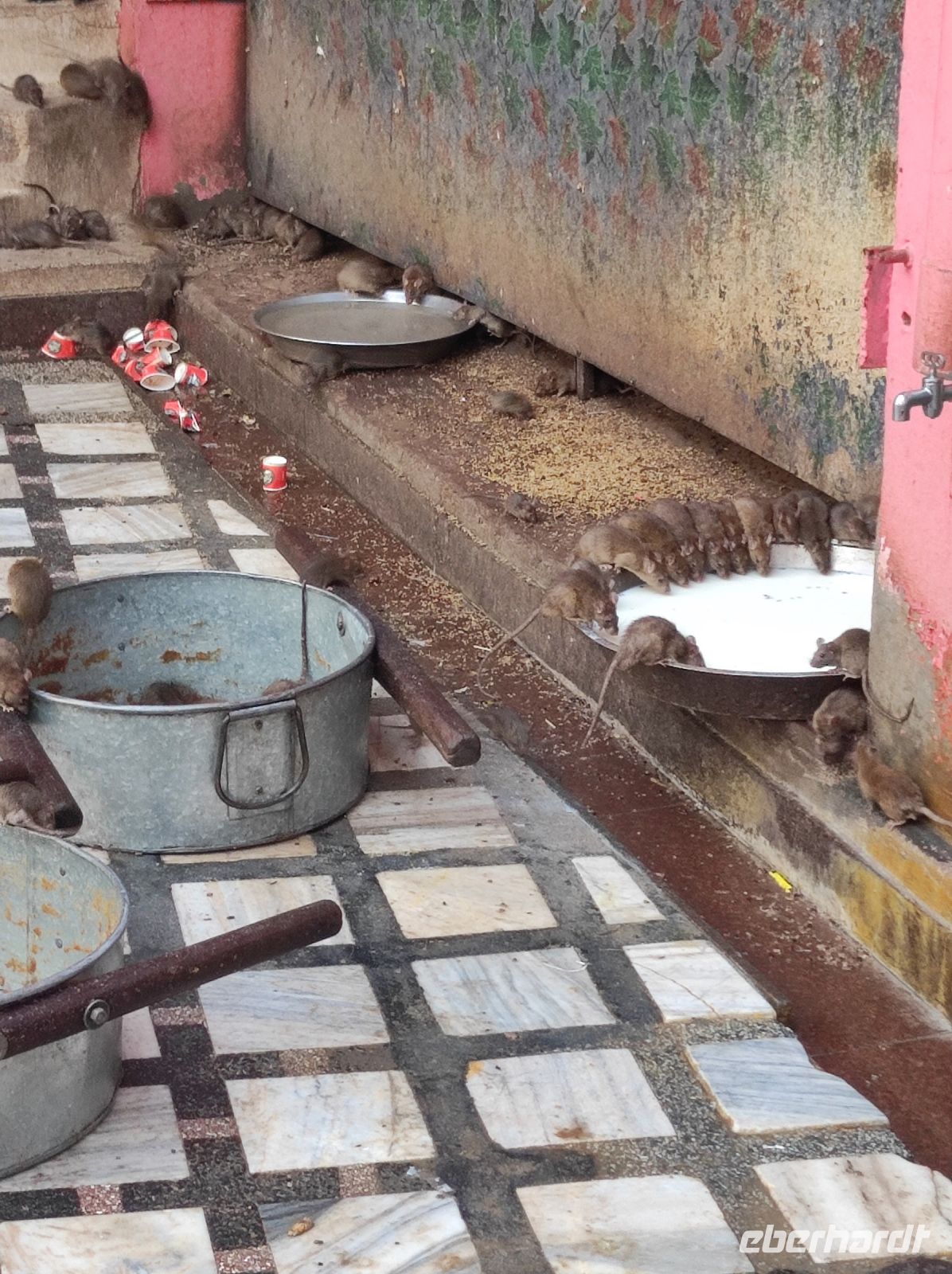 Im komfortablen Reisebus, gut versorgt durch unseren Bus-Pagen und mit fahrtbegleitenden Kommentar des örtlichen Reiseleiters ging Richtung Bikaner. Nachdem Mittagessen erreichten wir die Kamelfarm von Bikaner, hier werden Kamele versorgt, behandelt und gezüchtet. Nach einem Rundgang gab es noch eine exotische Spezialität, frischen Kamelmilch "Lassi" (eine Art Milchshake) oder andere Süßwaren wie Kamelschokolade oder Kamelmilcheis. Weiterging es zum Ratten-Tempel von Bikaner, die mutige Reisegruppe ging durch den von hunderten Ratten bewohnten Tempel und bewiesen den Indern wie furchtlos und wissbegierig die Deutschen sind! Auch wenn ein Rattenbiss Glück bringen soll, wurde zum Glück keiner Verletzt, die kleinen Bewohner waren auch sehr an Touristen gewöhnt und blieben friedlich. Anschließend ging es in das heutige Hotel, etwas auswärts von Bikaner, ruhig und abgelegen mit einer schönen Grünanlgae zum Relaxen.