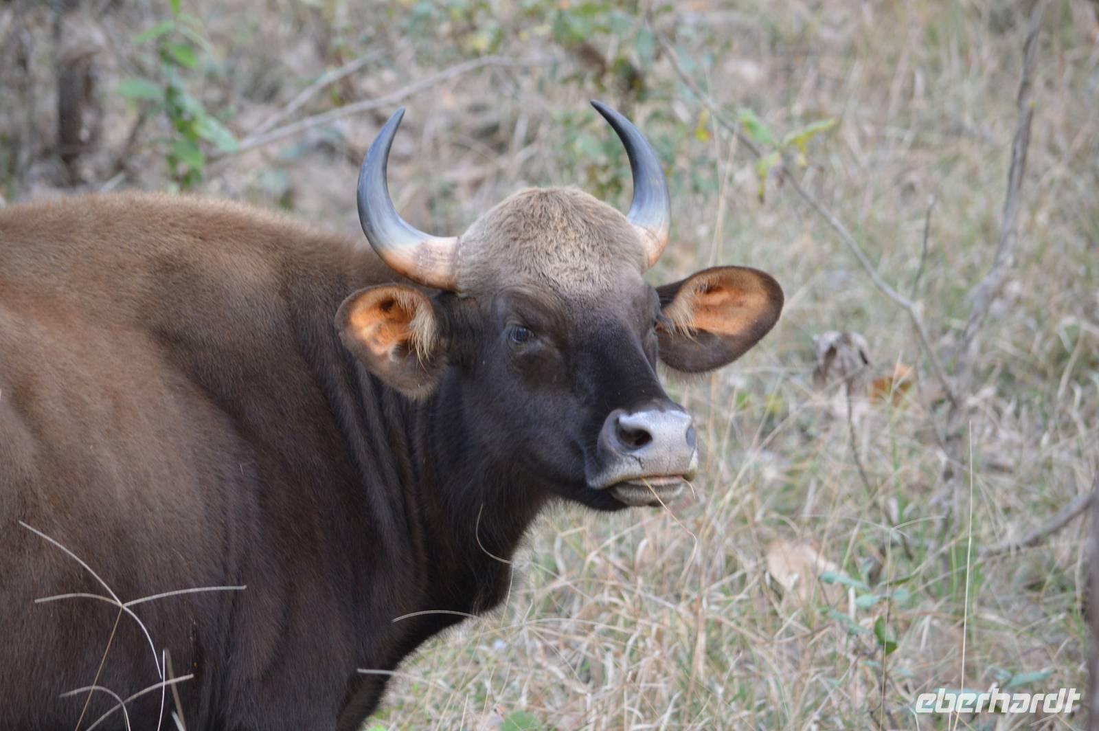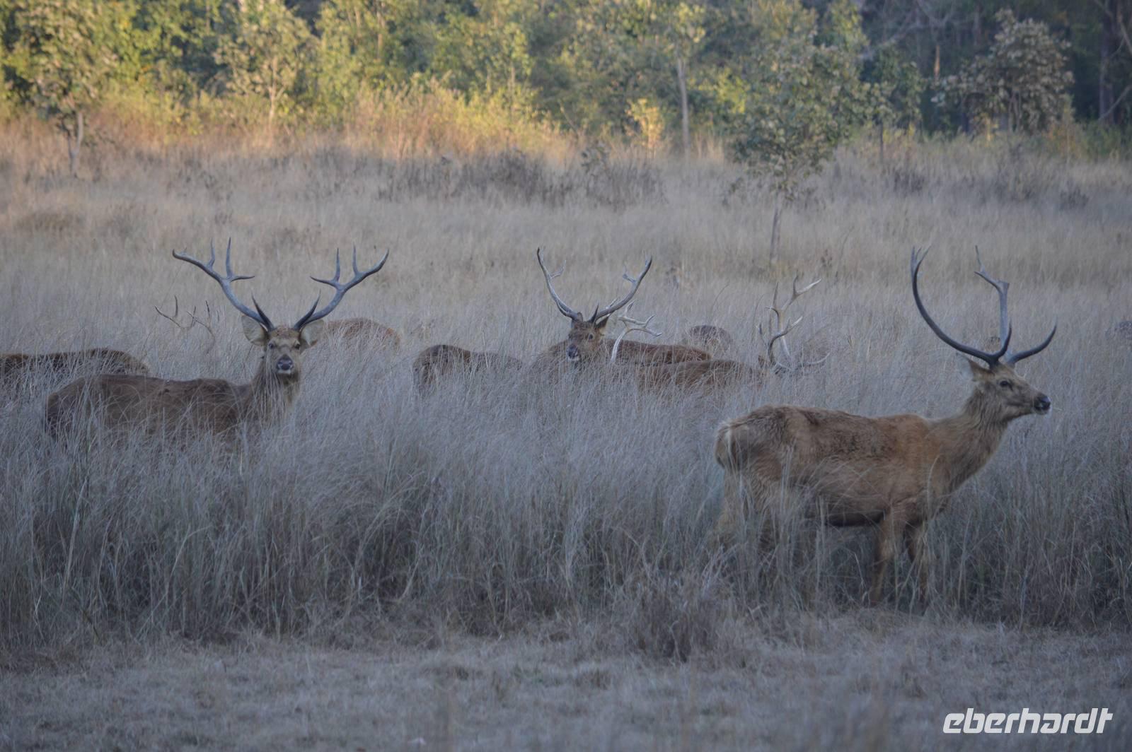 Um 5.30 geht es wieder zum Mukki Gate im Nationalpark. Der Game Drive ist wieder sehr gut. Neben den bereits bekannten Hirschen haben wir jetzt sehr gut die nur hier noch vorkommenden Barasingha Hirsche in schönen Gruppen, darunter eine mit kapitalen Hirschen. Jetzt finden wir auch den Gaur, erst eine Herde Kühe mit Jungtieren, dann sehr dicht am Jeep einen richtig großen Bullen. Die Gaur können wir lange beobachten. Unsere Vogelbeobachtungsliste wächst und wächst! Auf diesem Game Drive finden wir einen Graukopf Seeadler, den Spitzhaubenadler und viele Kleinvögel, darunter auch Arten, die aus Sibirien kommend hier überwintern. Der Gamedrive führt und tief in den Kanha Nationalpark und zeigt auch die landschaftliche Vielfalt. Tief im Park drinnen sind die großen Wiesen mit sehr großen Herden von Axis und Barasingha. Dass wir dann quasi den „Tiger unter den Vögeln", nämlich den Streak-throated Specht finden, demonstriert einmal mehr a) das Glück, was die Gruppe hat und b) die Qualität der Ranger, die auf unseren beiden Jeeps sind! Gefrühstückt wird an einer schönen Stelle im Park, dann geht es retour zur Lodge.