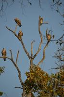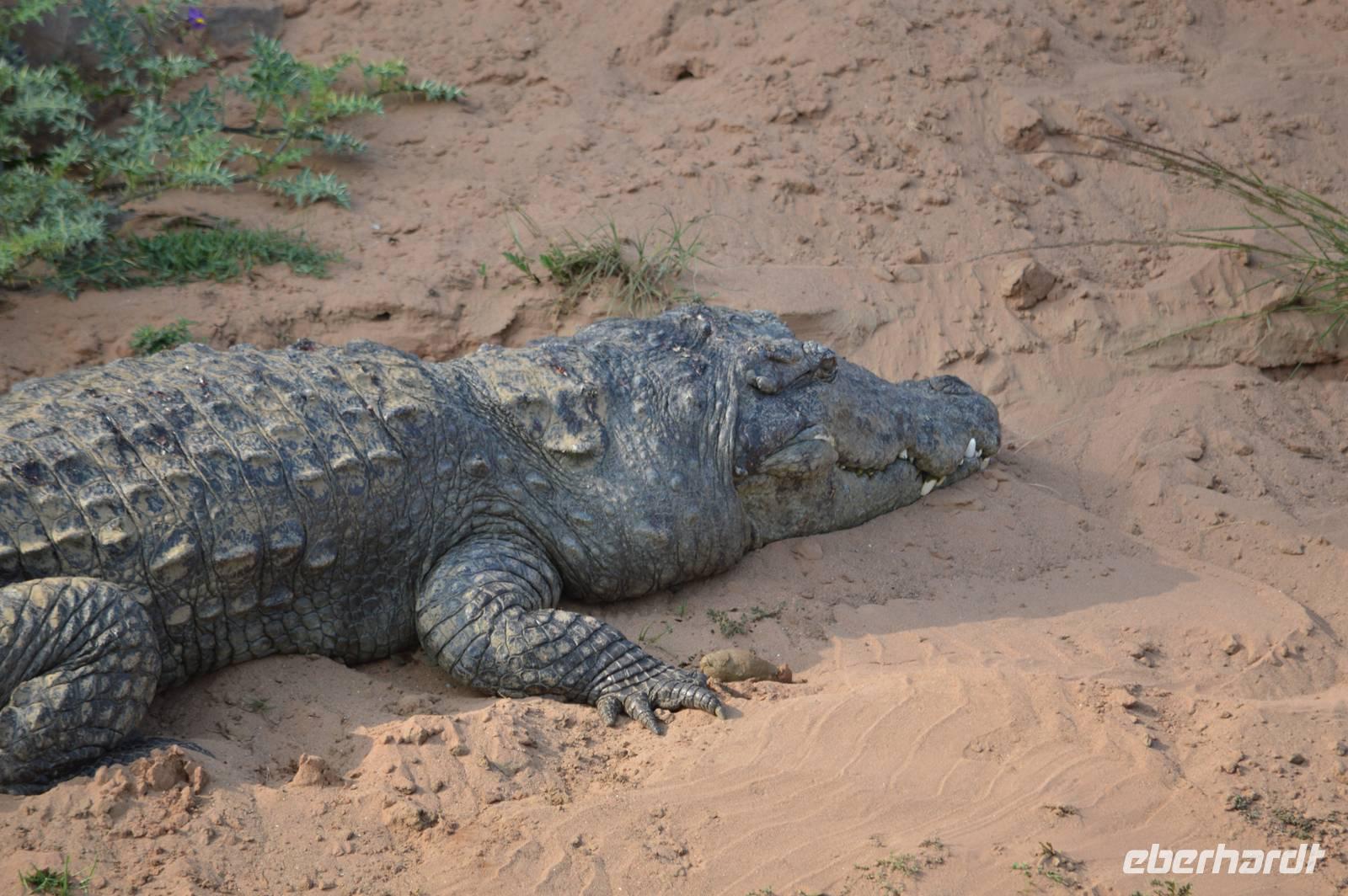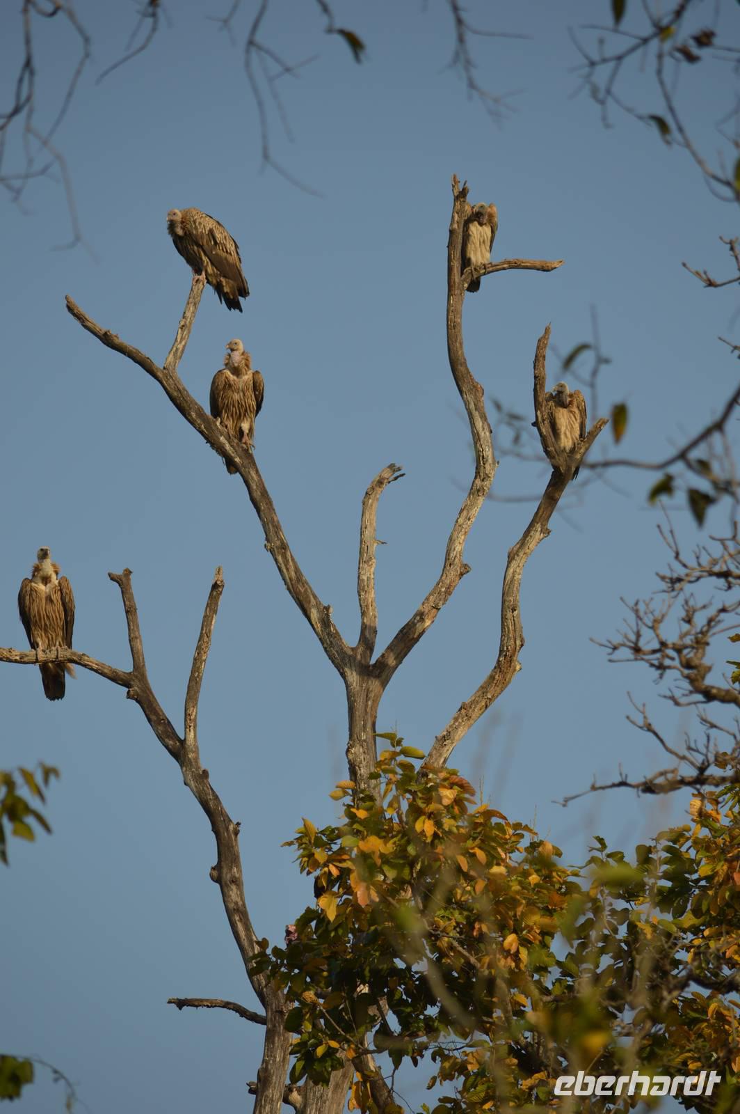Früh geht es raus: Um 5.45 verlassen wir in zwei Jeeps das Camp und fahren in den Panna Nationalpark und dort beginnt die Tour durch die Nationalparks gleich mit einem Paukenschlag: Wir sehen quasi sofort Rothunde und das kleine Rudel gleich zweimal! Dann finden wir eine Tigerin, die dicht am Jeep den Weg kreuzt und so traumhafte Photos ermöglicht- und auch sie sehen wir dann nochmal! Hulmans, Axis und Sambar sind da und dann auch noch Großgreife - einfach ein Traum. Gegen 10.30 sind wir wieder im Camp und frühstücken erst einmal. Am Nachmittag dann die 2. Safari. Wir fahren jedoch erst zu einem Bootsanleger und befahren im Nationalpark den Ken River erneut. Ausbeute: Etliche sehr große Sumpfkrokodile, Wollhalsströche, Kiebitze und eine traumhafte Landschaft. Retour geht's mit den Jeeps weiter. Wir fahren tief in den Park auf das 2.Plateau hinauf und kommen zu einer großen Geierkolonie, an der wir 4 (!) Geierarten sowie Wanderfalken beobachten können. Die Kolonie legt in einer sehr steilen hufeisenförmigen Felskulisse. Beim Wegfahren haben wir wieder Glück: Sundamarabus und zum Schluß dann noch kurz vor dem Gate einen Leoparden, der sich in aller Ruhe ca. 10 m neben dem Jeep photographieren läßt! Das war dann beim Abendessen eine Flasche Rum wert, die wir auf diesen magischen Tag leeren - normal war das Ganze überhaupt nicht!
