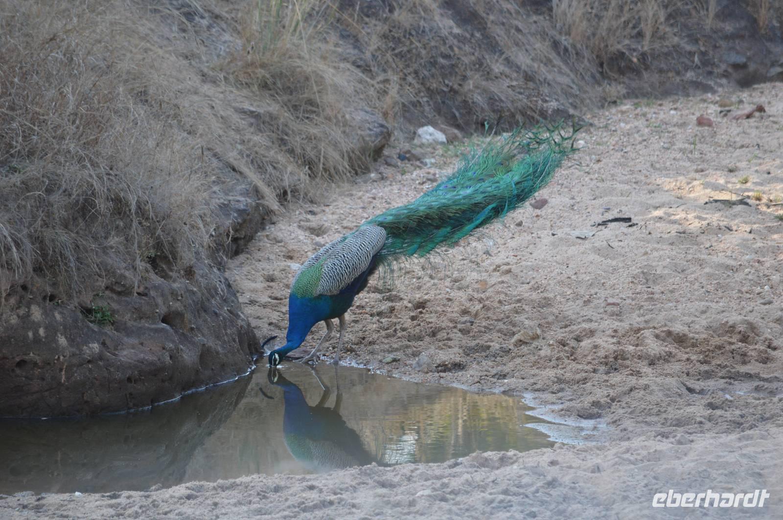 Auf dem Nachmittags Game Drive in den Park finden wir gleich am Anfang einen Muntjak sehr dicht am Jeep und wenig später einen sehr schönen Marabu. Insgesamt gestaltet sich der Game Drive sehr gut mit immer wieder Beobachtungen, z.B. von Pfauen beim Trinken und einem Paddyreiher, welcher dicht am Jeep in aller Ruhe fischt. Es ist ein sehr gelungener Game Drive. Abends vor dem Dinner sehen wir uns noch im Camp einen Film über das Projekt Tiger an.