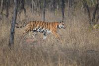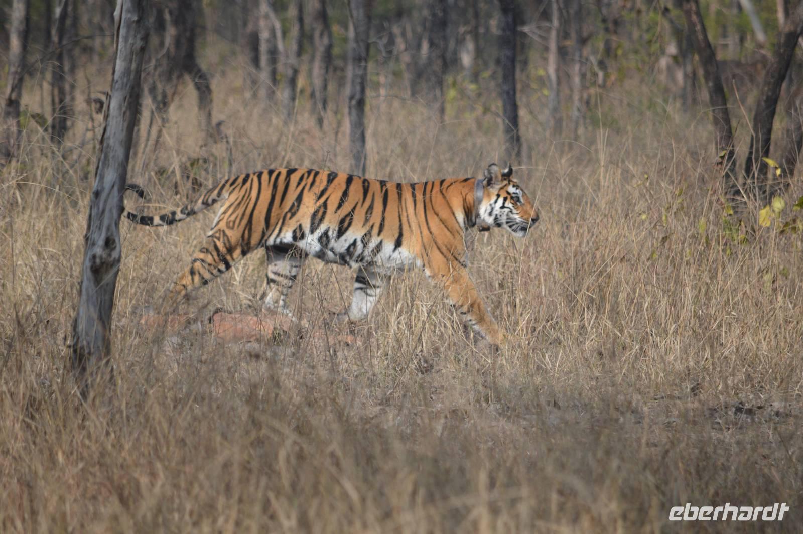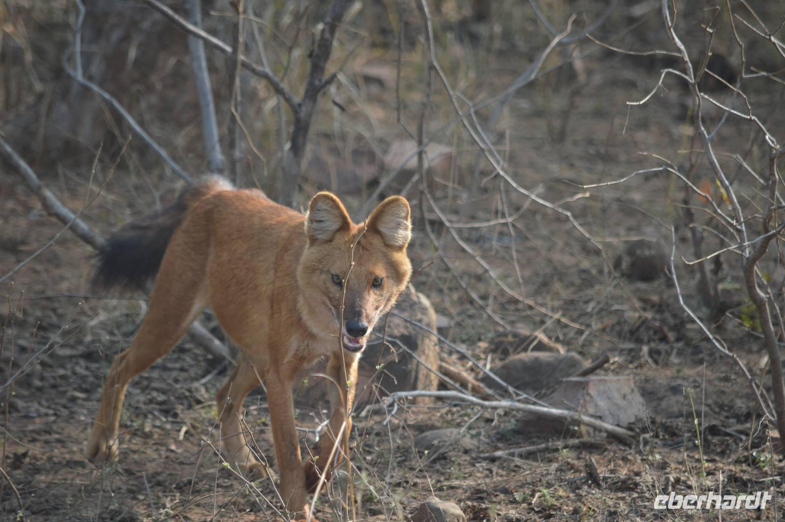 Um 15.00 erfolgt der erste Game Drive mit Jeeps - und gleich hinter dem Gate kommt erneut ein doppelter Paukenschlag: Auf der Jeepspur liegen und stehen 5 Rothunde - soviel Glück kann es doch gar nicht geben, nachdem wir ja schon im Panna Nationalpark Rothunde gesichtet hatten. Die Rothunde lassen sich überhaupt nicht stören, verschwinden nach einiger Zeit im Gras. Und kaum sind wir ein Stück weiter: Kommt ein Tigerkater auf uns zu und passiert den Jeep in knapp 5 m Entfernung. Wir können ihm fast 10 Minuten lang folgen. Damit aber noch nicht genug finden wir kurz danach, nachdem wir den Tiger noch einmal weiter entfernt gesehen hatten, Schwarzstörche, Wollhalsstörche und in einem Baum etliche Geier, darunter den seltenen Ohrengeier. Und beim Rausfahren aus dem Nationalpark geben sich die 5 Rothunde noch einmal die Ehre und tauchen erneut vor unserem Jeep auf! Was für ein Game Drive! Klar, dass das abends beim Dinner entsprechend gewürdigt wird.