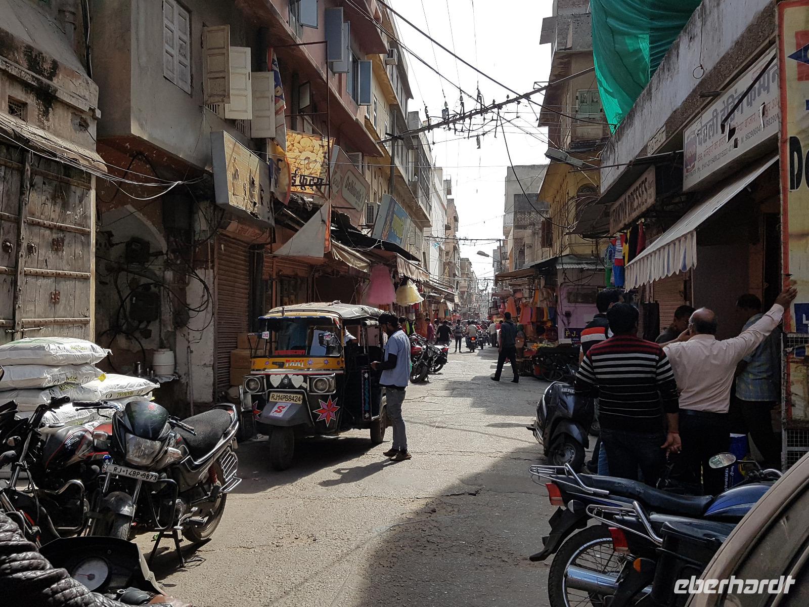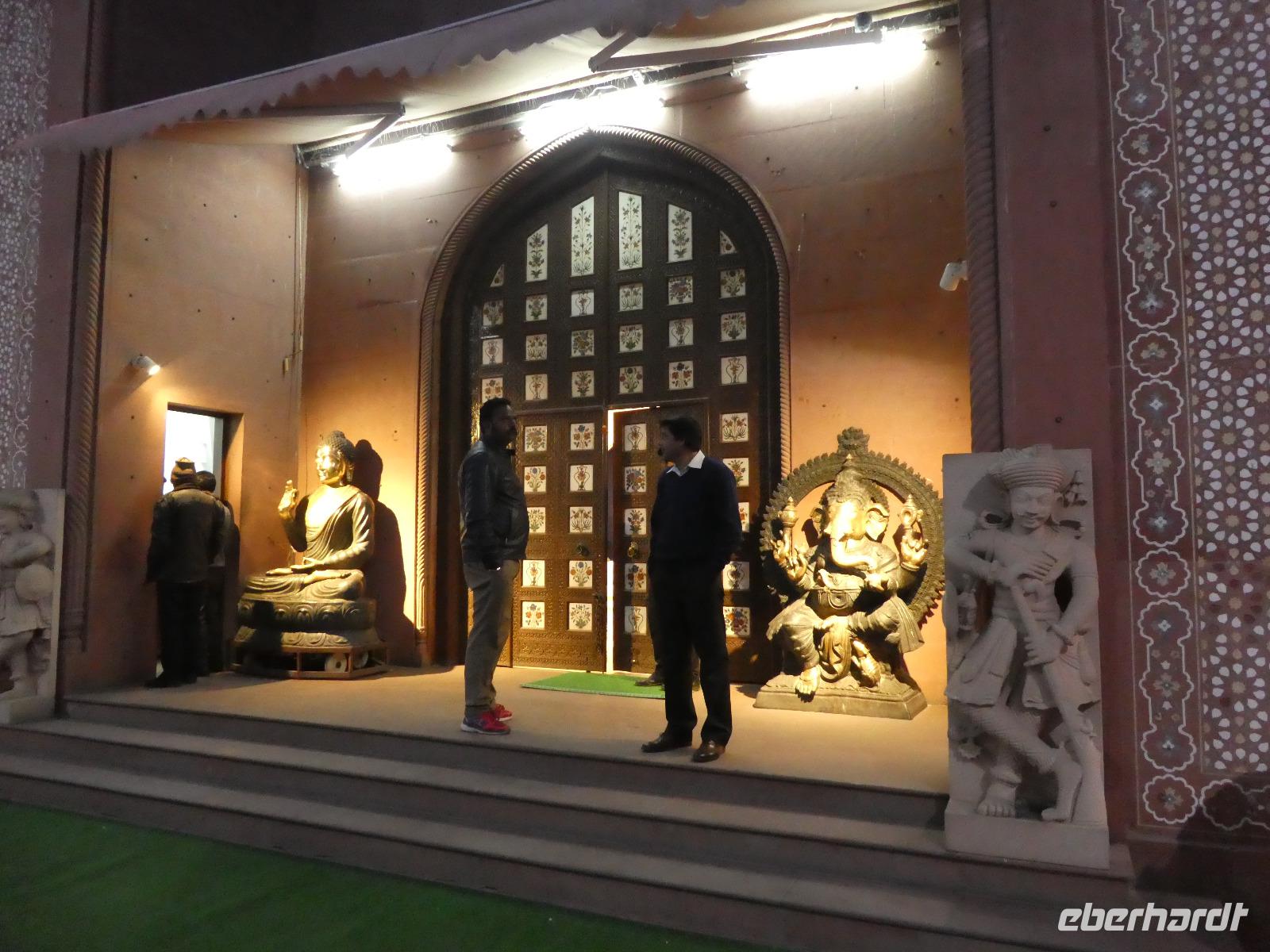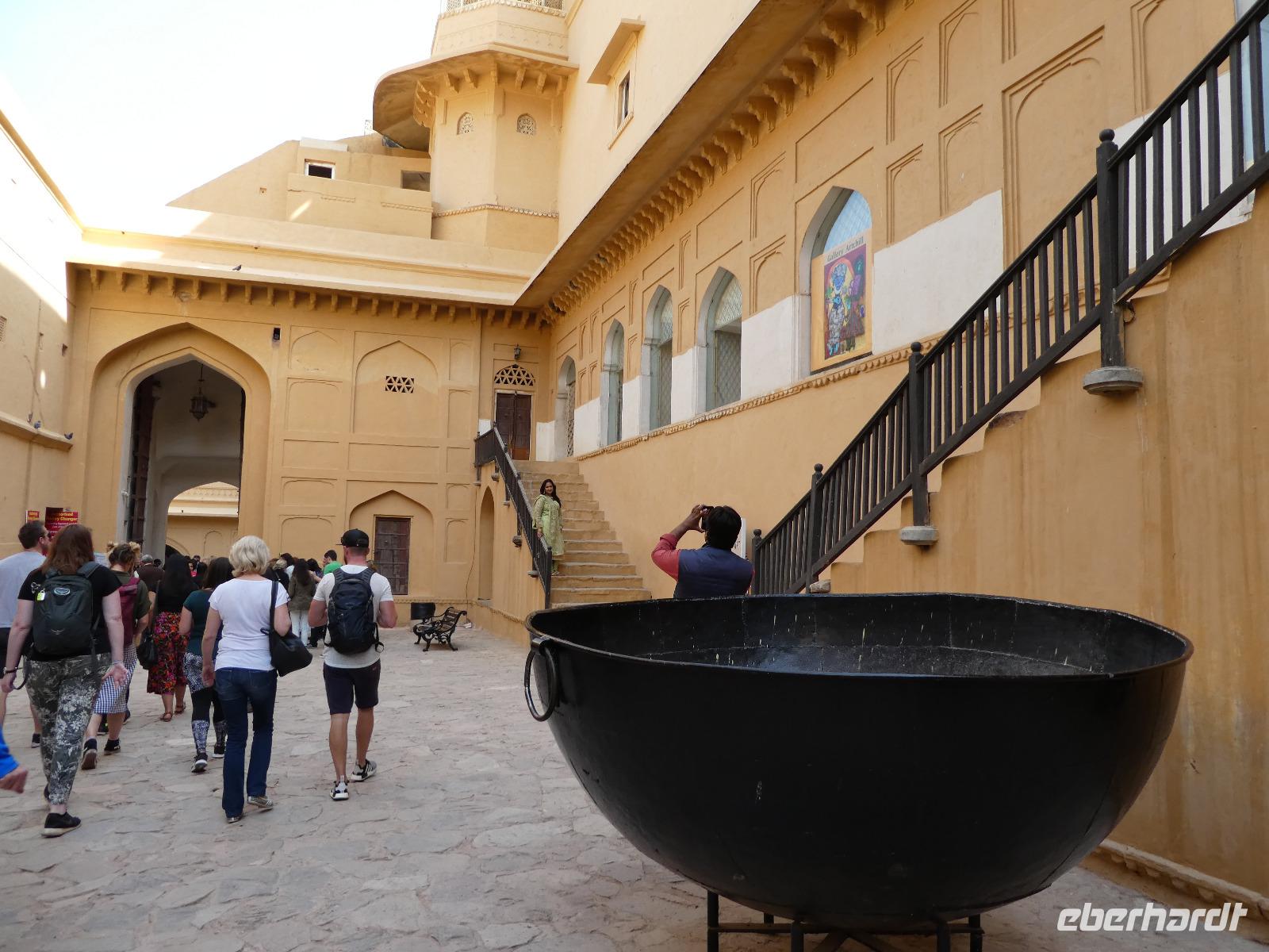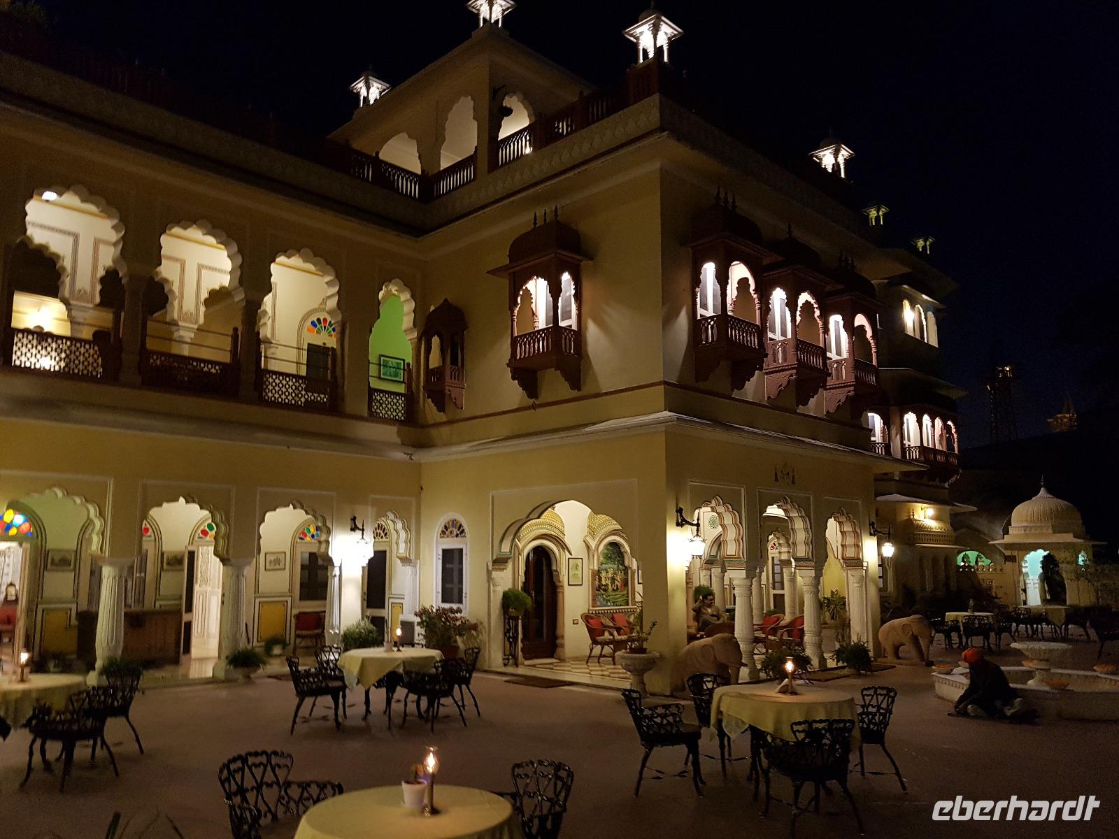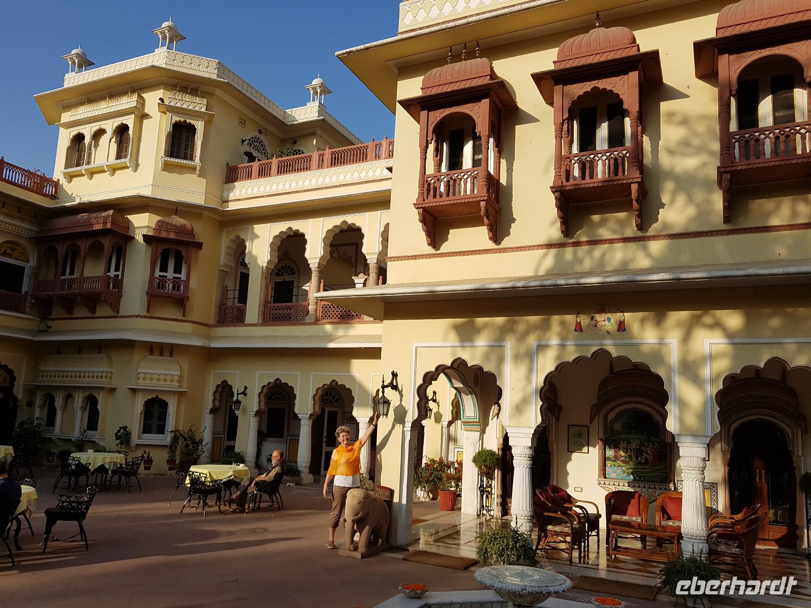 Neben dem Taj Mahal hat Agra noch mehr zu bieten und wir entschieden uns frühmorgens zusätzlich für die Besichtigung des Roten Forts. Es steht ebenfalls am Yamuna Fluß und diente den Mogulkaisern als Residenz. Der wohl berühmteste Mogulkaiser Sha Jahan gab dem Komplex das heutige Aussehen und kehrte zum Ende seines Lebens hierhier zurück, wo ihn sein Sohn unter Hausarrest stellte. Nach der zweistündigen Besichtigung verließen wir Agra und damit auch den Bundesstaat Uttar Pradesh. Unterwegs machten wir wieder eine Kaffeepause und besuchten einen Wochenmarkt mit seinem bunten Treiben. Am frühen Abend erreichten wir die rosarote Stadt Jaipur und bezogen Quartier im Alisar Haveli, einem indischen Traditionshotel wie aus 1001 Nacht. Es war ein hoher Feiertag der Hindus und so empfahl uns Bhawani den Besuch einer Tempelzeremonie. Das war ganz besonders, bei Sonnenuntergang inmitten der vielen Hindus das Fest zu erleben und für viele waren wir die Attraktion. Immer wieder mußte unsere Gruppe mit auf die Fotos der Inder. Im Hotel gab es dannwieder ein gutes Abendessen vom Buffet.