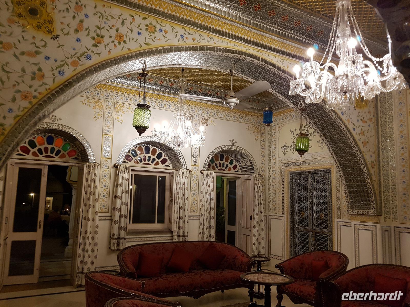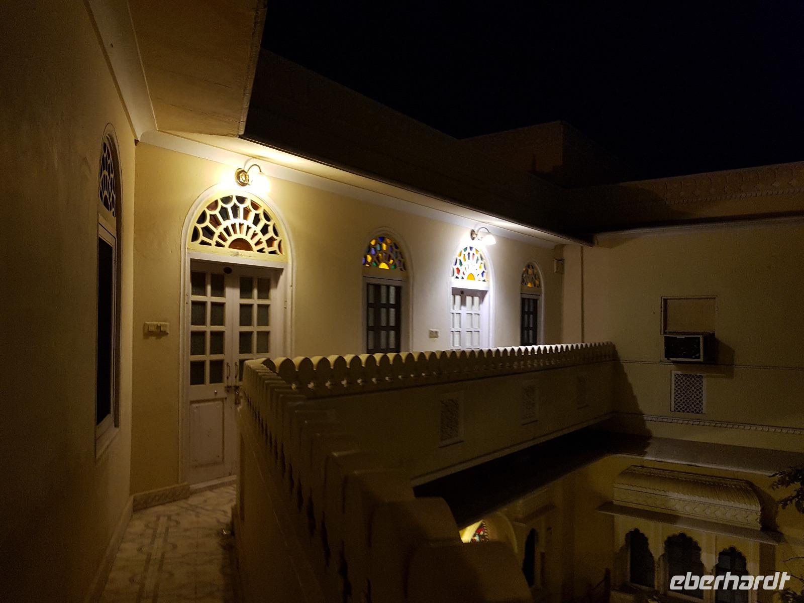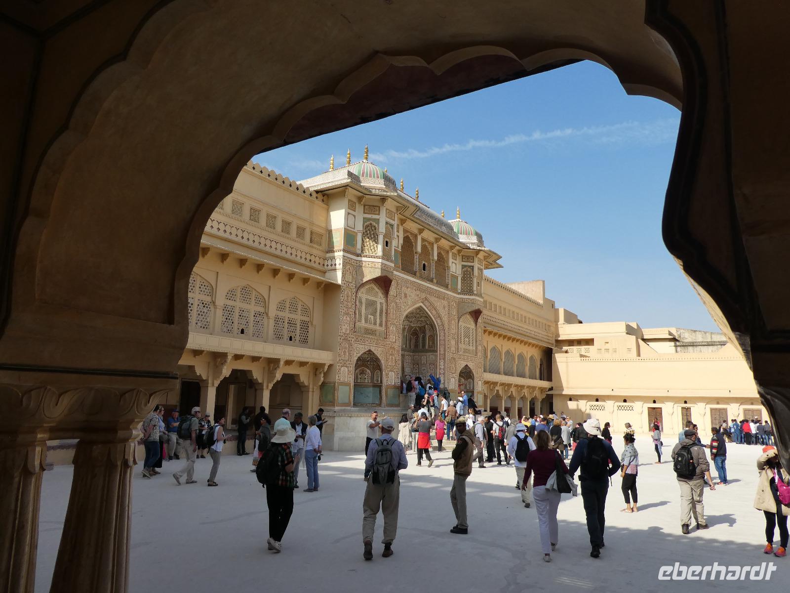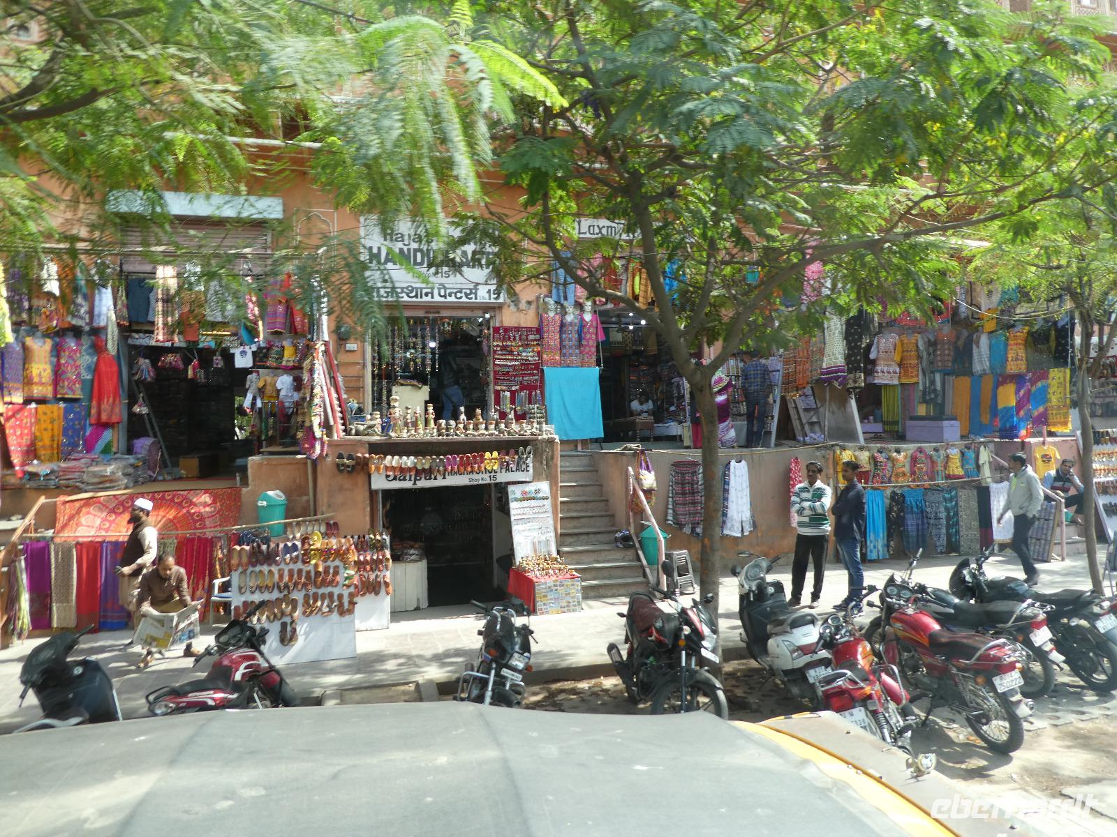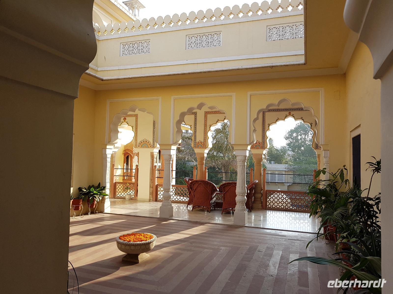 Neben dem Taj Mahal hat Agra noch mehr zu bieten und wir entschieden uns frühmorgens zusätzlich für die Besichtigung des Roten Forts. Es steht ebenfalls am Yamuna Fluß und diente den Mogulkaisern als Residenz. Der wohl berühmteste Mogulkaiser Sha Jahan gab dem Komplex das heutige Aussehen und kehrte zum Ende seines Lebens hierhier zurück, wo ihn sein Sohn unter Hausarrest stellte. Nach der zweistündigen Besichtigung verließen wir Agra und damit auch den Bundesstaat Uttar Pradesh. Unterwegs machten wir wieder eine Kaffeepause und besuchten einen Wochenmarkt mit seinem bunten Treiben. Am frühen Abend erreichten wir die rosarote Stadt Jaipur und bezogen Quartier im Alisar Haveli, einem indischen Traditionshotel wie aus 1001 Nacht. Es war ein hoher Feiertag der Hindus und so empfahl uns Bhawani den Besuch einer Tempelzeremonie. Das war ganz besonders, bei Sonnenuntergang inmitten der vielen Hindus das Fest zu erleben und für viele waren wir die Attraktion. Immer wieder mußte unsere Gruppe mit auf die Fotos der Inder. Im Hotel gab es dannwieder ein gutes Abendessen vom Buffet.
