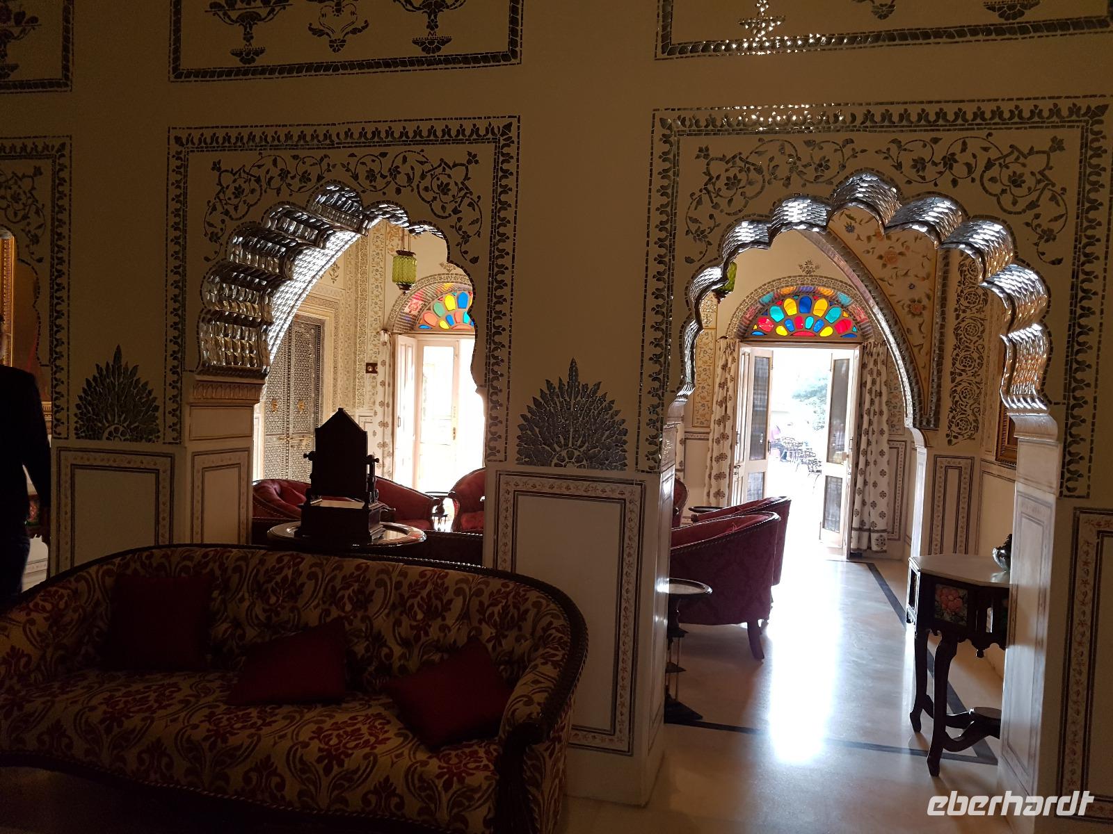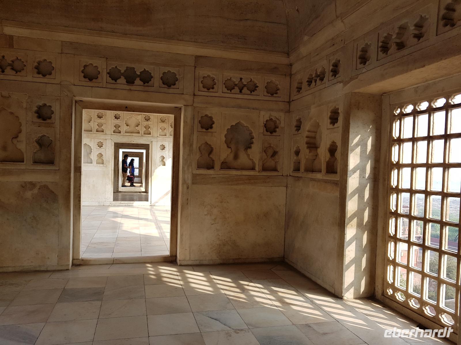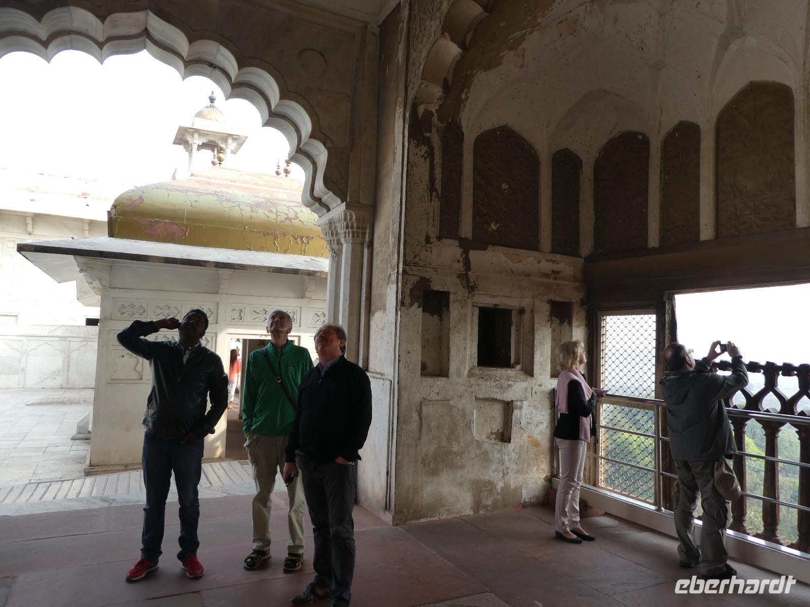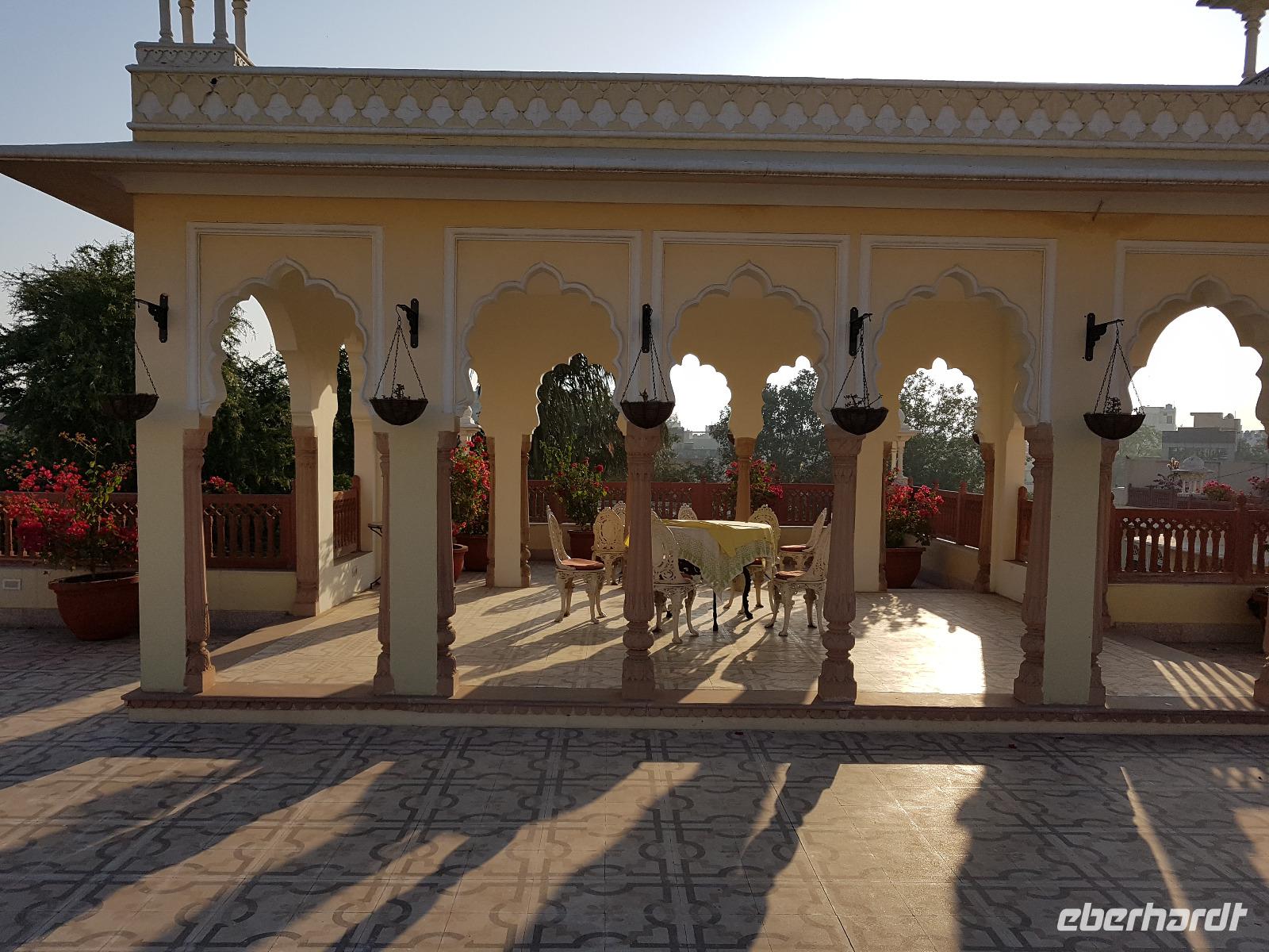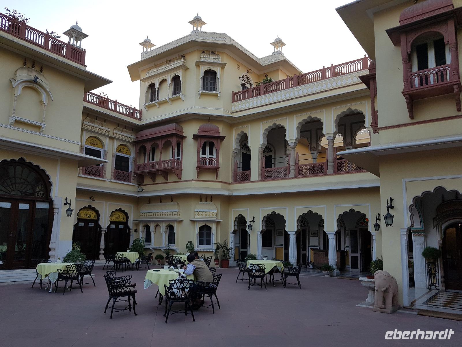 Neben dem Taj Mahal hat Agra noch mehr zu bieten und wir entschieden uns frühmorgens zusätzlich für die Besichtigung des Roten Forts. Es steht ebenfalls am Yamuna Fluß und diente den Mogulkaisern als Residenz. Der wohl berühmteste Mogulkaiser Sha Jahan gab dem Komplex das heutige Aussehen und kehrte zum Ende seines Lebens hierhier zurück, wo ihn sein Sohn unter Hausarrest stellte. Nach der zweistündigen Besichtigung verließen wir Agra und damit auch den Bundesstaat Uttar Pradesh. Unterwegs machten wir wieder eine Kaffeepause und besuchten einen Wochenmarkt mit seinem bunten Treiben. Am frühen Abend erreichten wir die rosarote Stadt Jaipur und bezogen Quartier im Alisar Haveli, einem indischen Traditionshotel wie aus 1001 Nacht. Es war ein hoher Feiertag der Hindus und so empfahl uns Bhawani den Besuch einer Tempelzeremonie. Das war ganz besonders, bei Sonnenuntergang inmitten der vielen Hindus das Fest zu erleben und für viele waren wir die Attraktion. Immer wieder mußte unsere Gruppe mit auf die Fotos der Inder. Im Hotel gab es dannwieder ein gutes Abendessen vom Buffet.