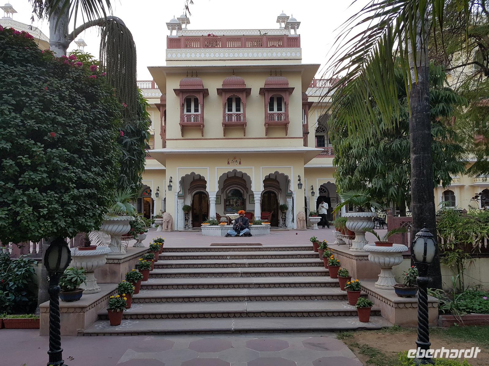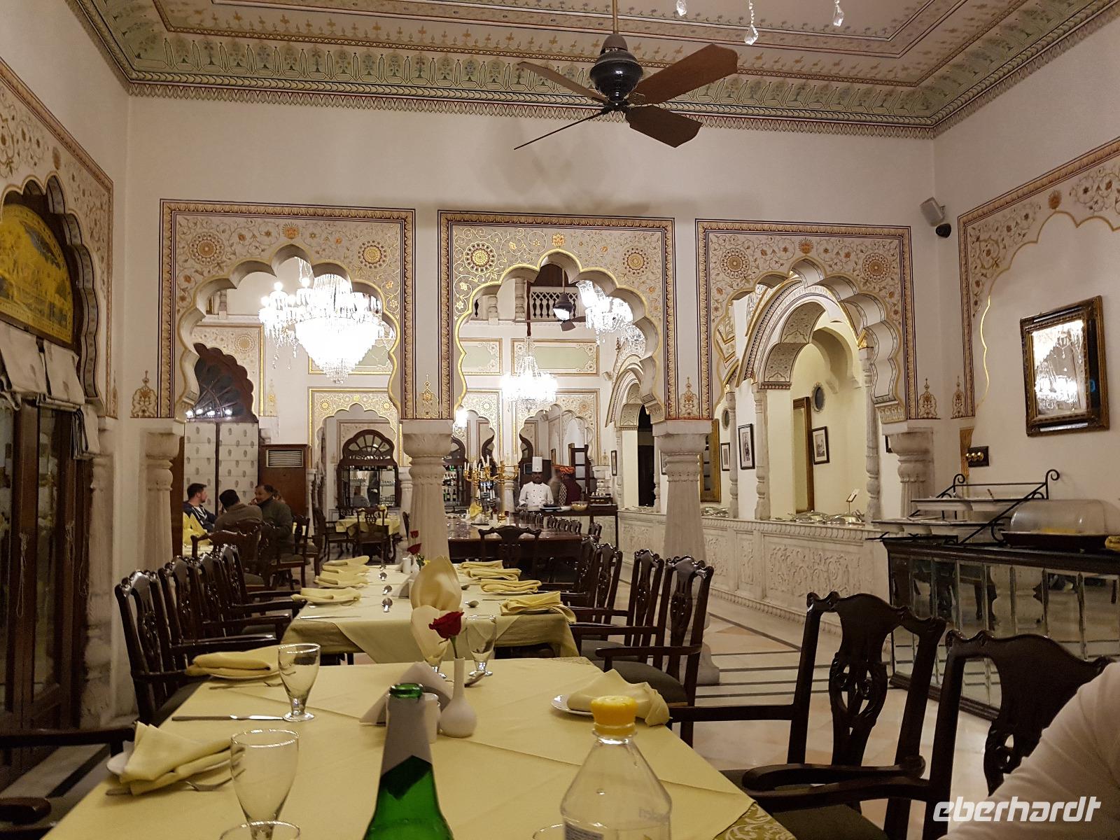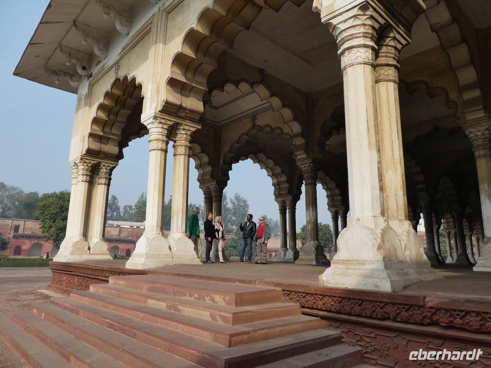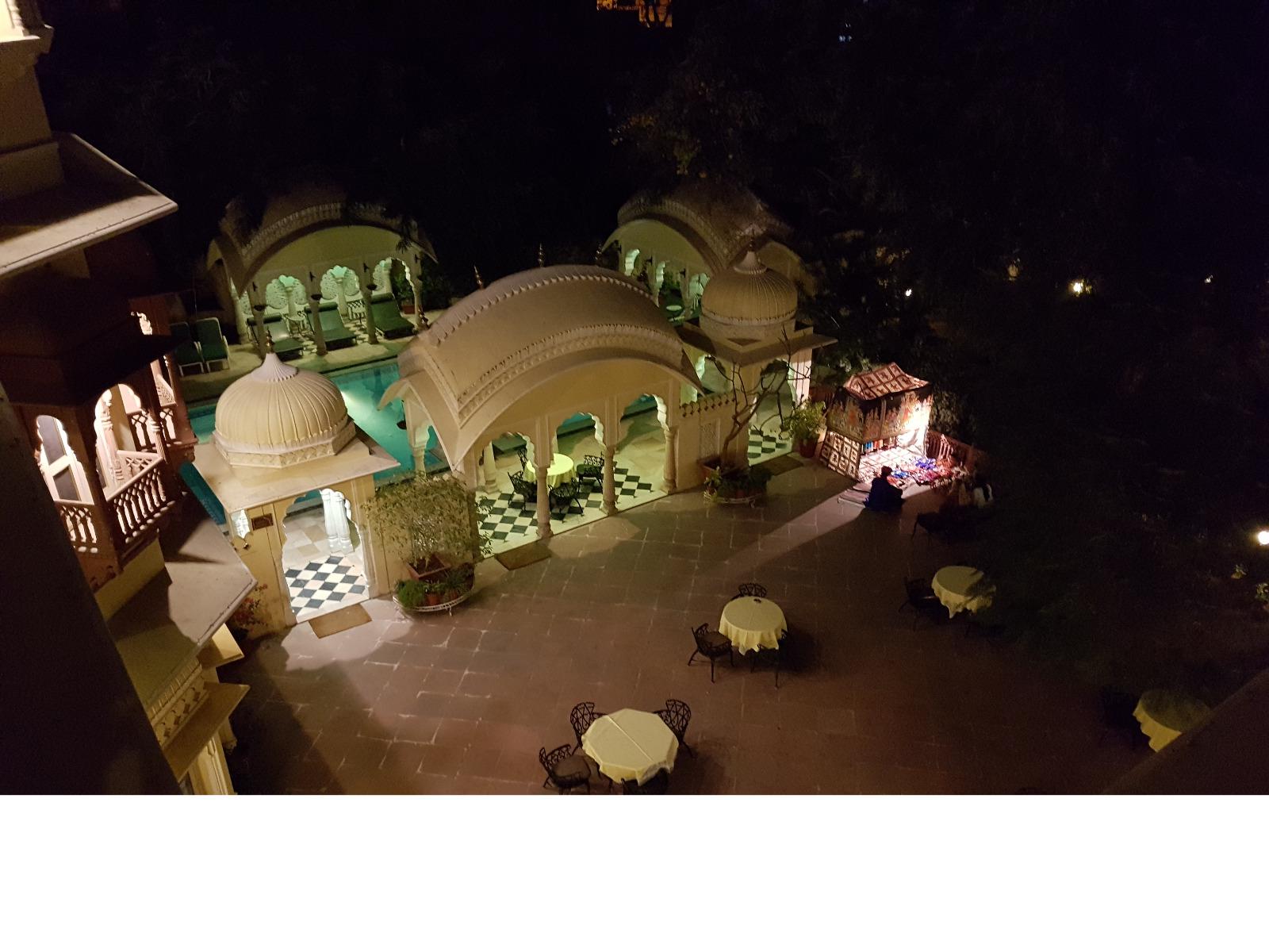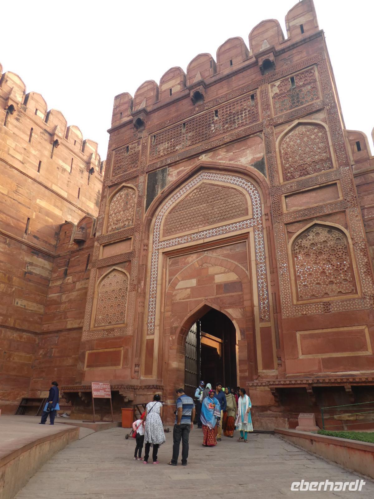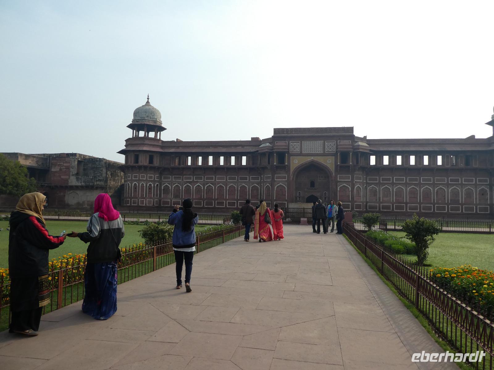Neben dem Taj Mahal hat Agra noch mehr zu bieten und wir entschieden uns frühmorgens zusätzlich für die Besichtigung des Roten Forts. Es steht ebenfalls am Yamuna Fluß und diente den Mogulkaisern als Residenz. Der wohl berühmteste Mogulkaiser Sha Jahan gab dem Komplex das heutige Aussehen und kehrte zum Ende seines Lebens hierhier zurück, wo ihn sein Sohn unter Hausarrest stellte. Nach der zweistündigen Besichtigung verließen wir Agra und damit auch den Bundesstaat Uttar Pradesh. Unterwegs machten wir wieder eine Kaffeepause und besuchten einen Wochenmarkt mit seinem bunten Treiben. Am frühen Abend erreichten wir die rosarote Stadt Jaipur und bezogen Quartier im Alisar Haveli, einem indischen Traditionshotel wie aus 1001 Nacht. Es war ein hoher Feiertag der Hindus und so empfahl uns Bhawani den Besuch einer Tempelzeremonie. Das war ganz besonders, bei Sonnenuntergang inmitten der vielen Hindus das Fest zu erleben und für viele waren wir die Attraktion. Immer wieder mußte unsere Gruppe mit auf die Fotos der Inder. Im Hotel gab es dannwieder ein gutes Abendessen vom Buffet.