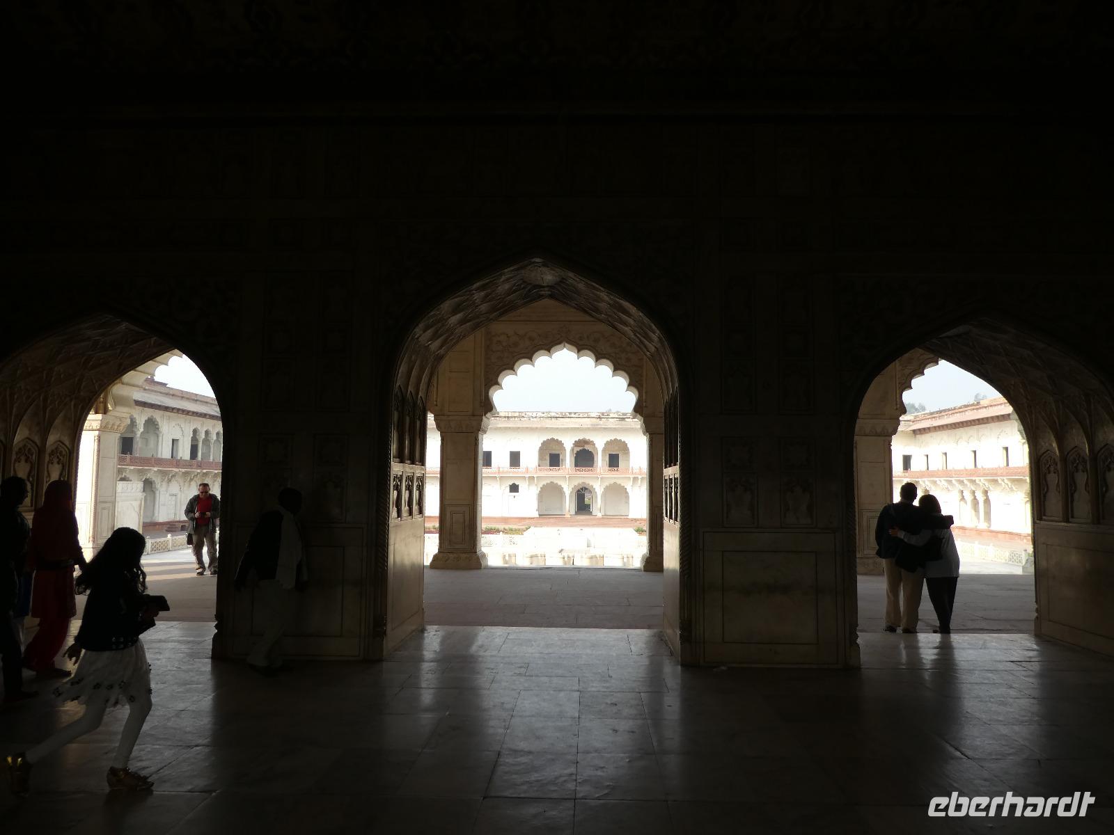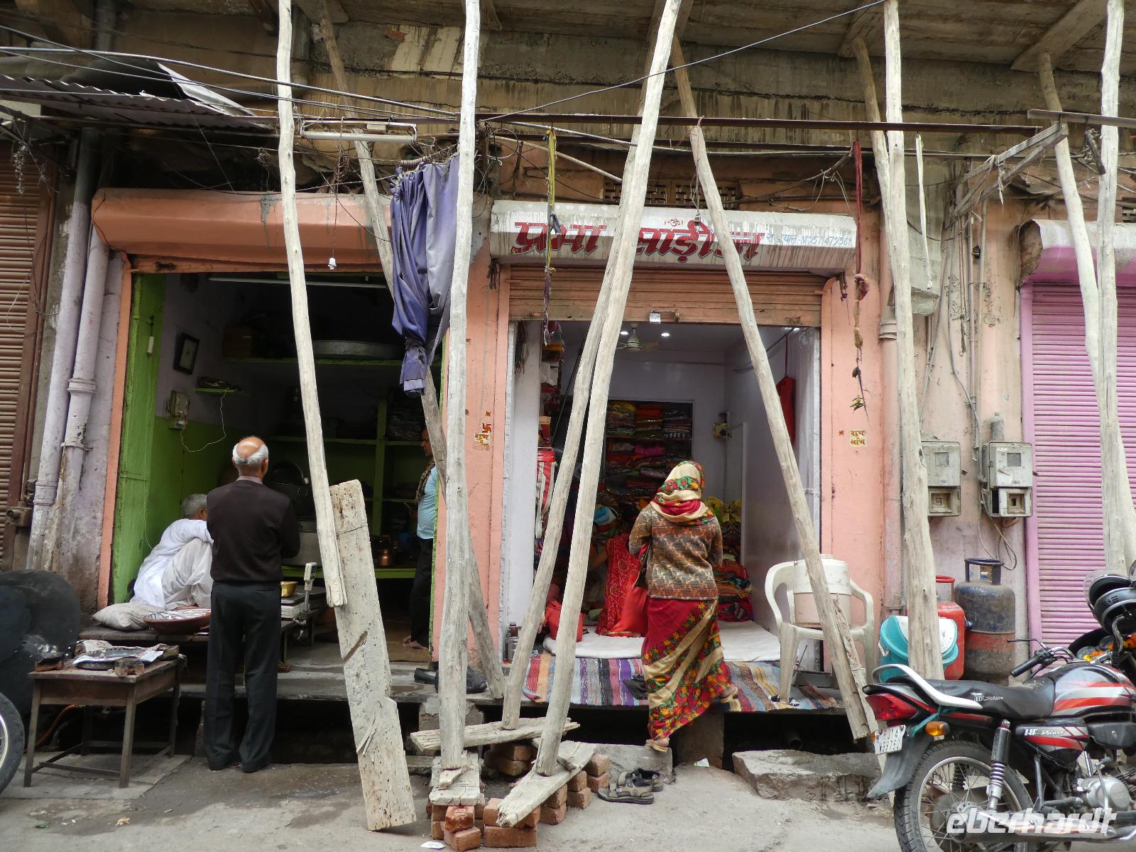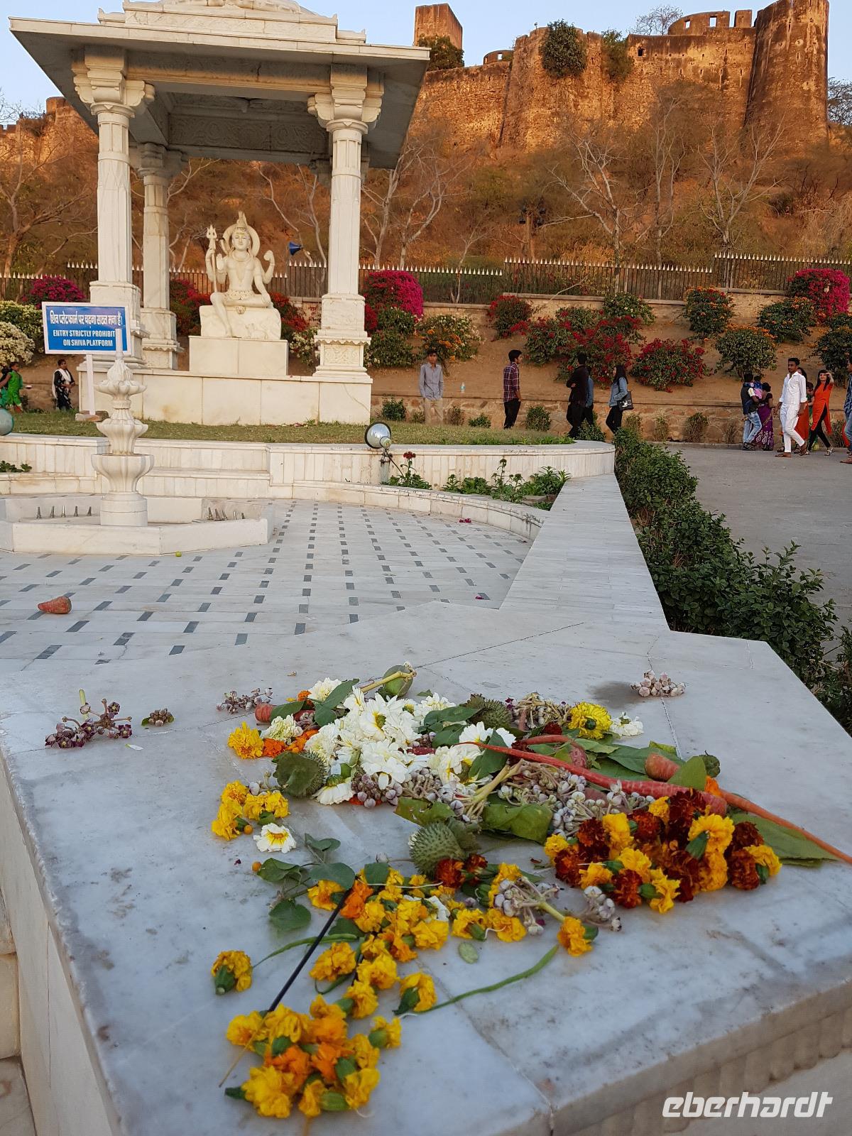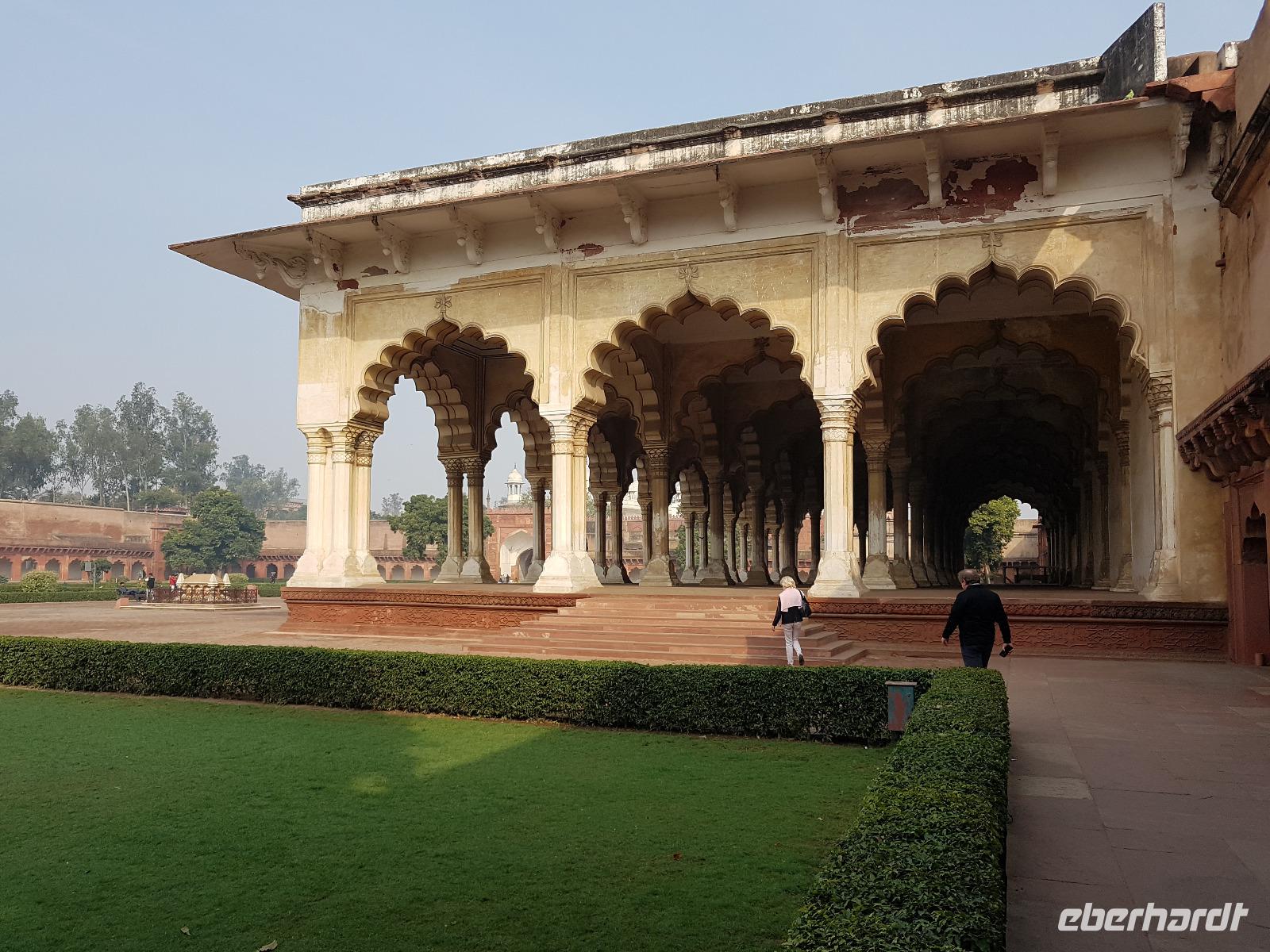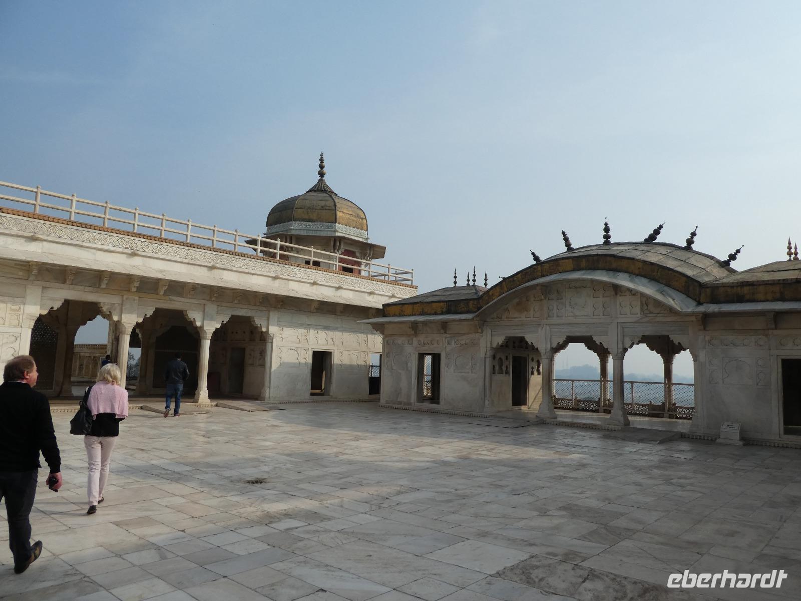 Neben dem Taj Mahal hat Agra noch mehr zu bieten und wir entschieden uns frühmorgens zusätzlich für die Besichtigung des Roten Forts. Es steht ebenfalls am Yamuna Fluß und diente den Mogulkaisern als Residenz. Der wohl berühmteste Mogulkaiser Sha Jahan gab dem Komplex das heutige Aussehen und kehrte zum Ende seines Lebens hierhier zurück, wo ihn sein Sohn unter Hausarrest stellte. Nach der zweistündigen Besichtigung verließen wir Agra und damit auch den Bundesstaat Uttar Pradesh. Unterwegs machten wir wieder eine Kaffeepause und besuchten einen Wochenmarkt mit seinem bunten Treiben. Am frühen Abend erreichten wir die rosarote Stadt Jaipur und bezogen Quartier im Alisar Haveli, einem indischen Traditionshotel wie aus 1001 Nacht. Es war ein hoher Feiertag der Hindus und so empfahl uns Bhawani den Besuch einer Tempelzeremonie. Das war ganz besonders, bei Sonnenuntergang inmitten der vielen Hindus das Fest zu erleben und für viele waren wir die Attraktion. Immer wieder mußte unsere Gruppe mit auf die Fotos der Inder. Im Hotel gab es dannwieder ein gutes Abendessen vom Buffet.