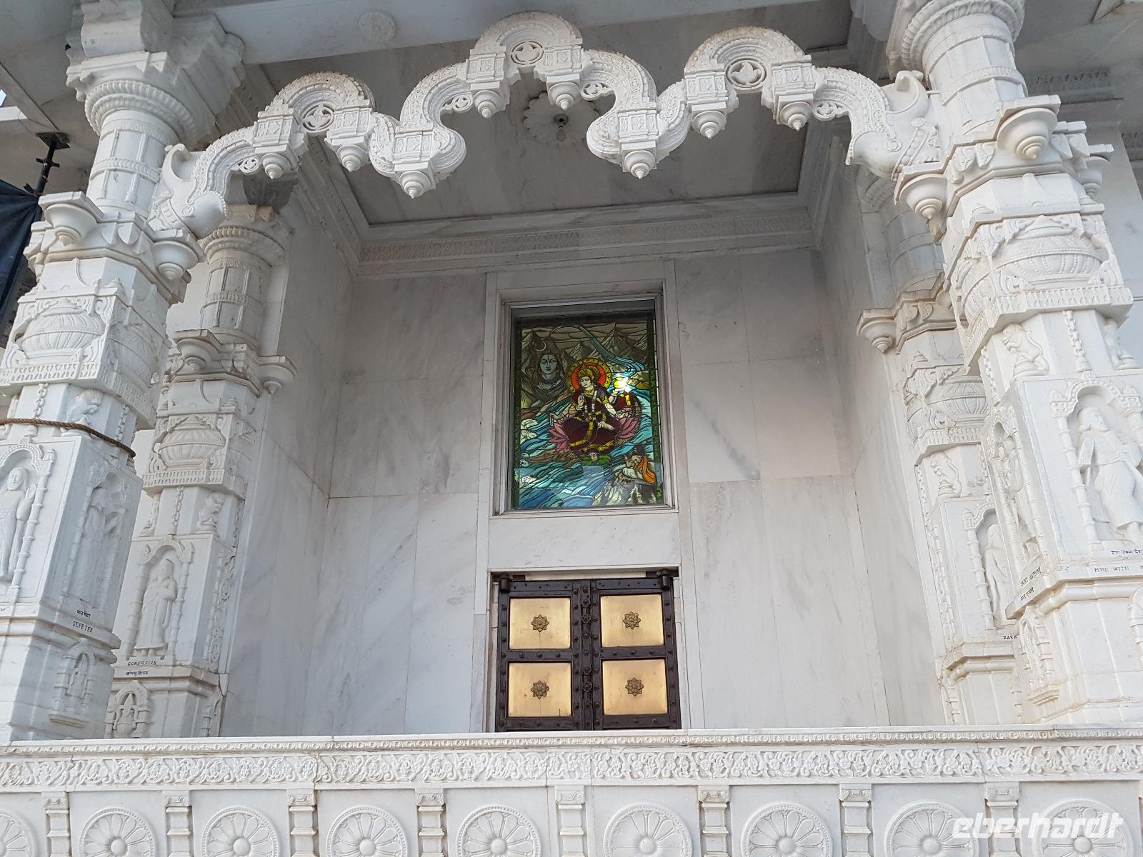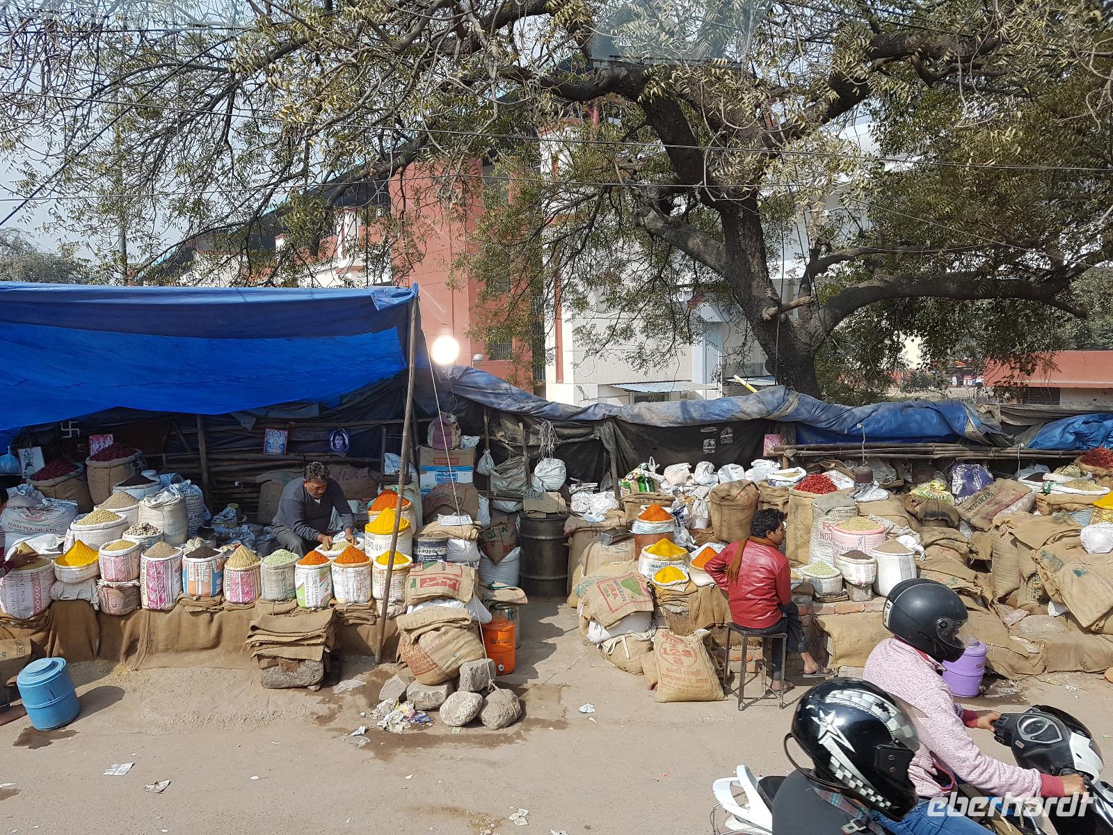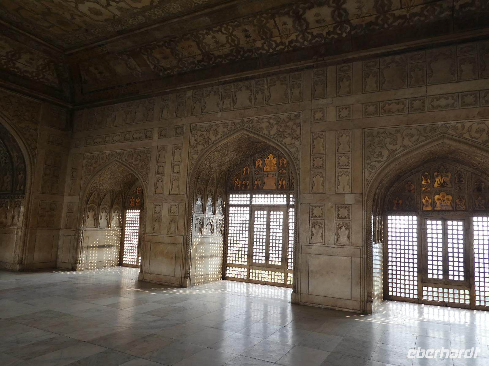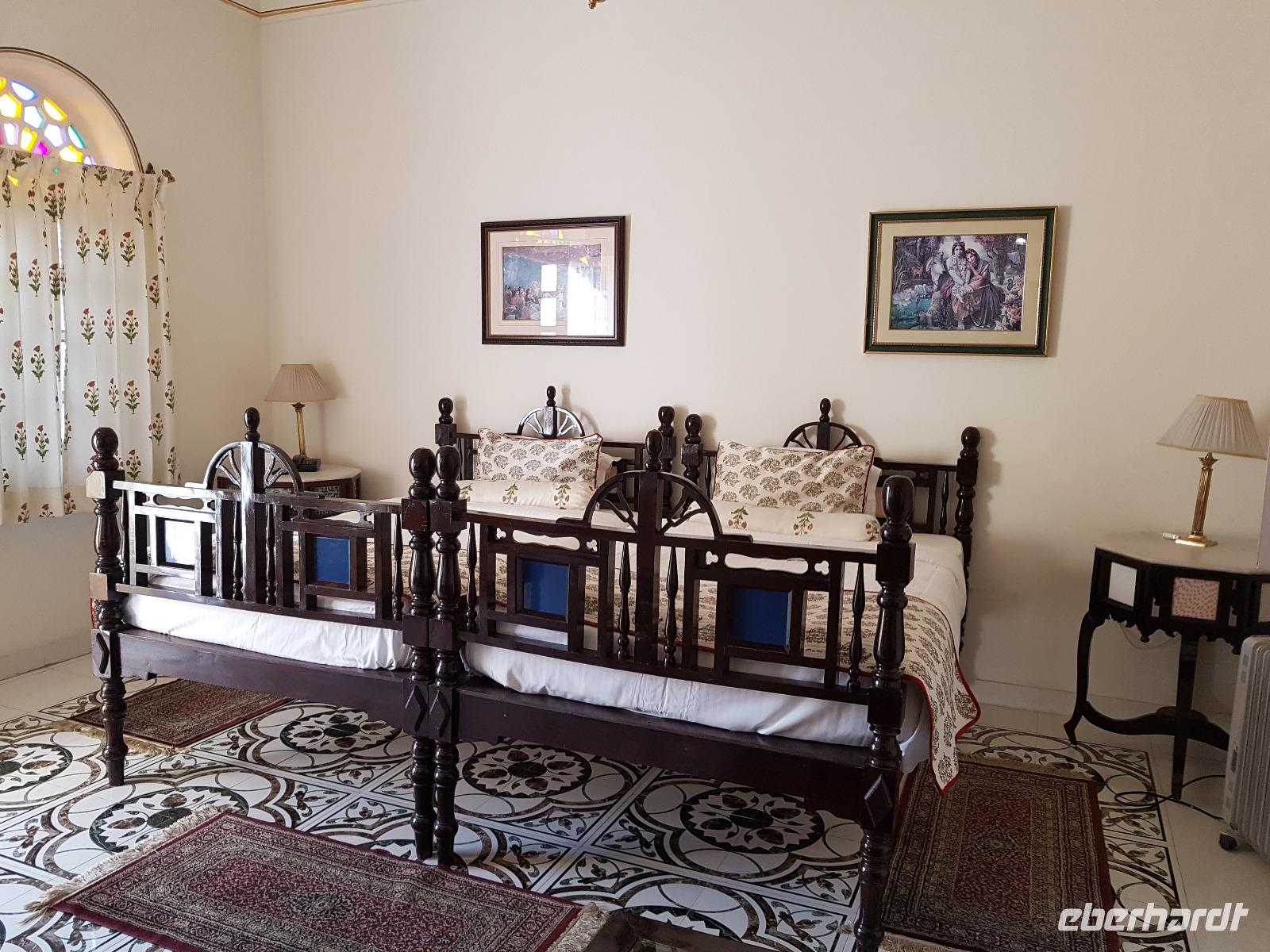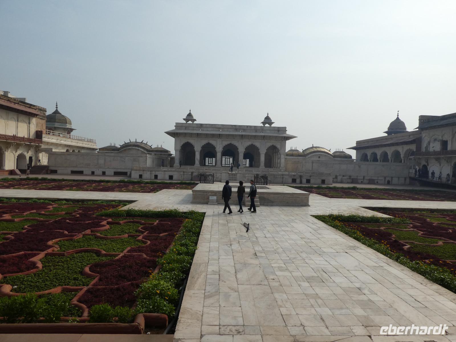 Neben dem Taj Mahal hat Agra noch mehr zu bieten und wir entschieden uns frühmorgens zusätzlich für die Besichtigung des Roten Forts. Es steht ebenfalls am Yamuna Fluß und diente den Mogulkaisern als Residenz. Der wohl berühmteste Mogulkaiser Sha Jahan gab dem Komplex das heutige Aussehen und kehrte zum Ende seines Lebens hierhier zurück, wo ihn sein Sohn unter Hausarrest stellte. Nach der zweistündigen Besichtigung verließen wir Agra und damit auch den Bundesstaat Uttar Pradesh. Unterwegs machten wir wieder eine Kaffeepause und besuchten einen Wochenmarkt mit seinem bunten Treiben. Am frühen Abend erreichten wir die rosarote Stadt Jaipur und bezogen Quartier im Alisar Haveli, einem indischen Traditionshotel wie aus 1001 Nacht. Es war ein hoher Feiertag der Hindus und so empfahl uns Bhawani den Besuch einer Tempelzeremonie. Das war ganz besonders, bei Sonnenuntergang inmitten der vielen Hindus das Fest zu erleben und für viele waren wir die Attraktion. Immer wieder mußte unsere Gruppe mit auf die Fotos der Inder. Im Hotel gab es dannwieder ein gutes Abendessen vom Buffet.