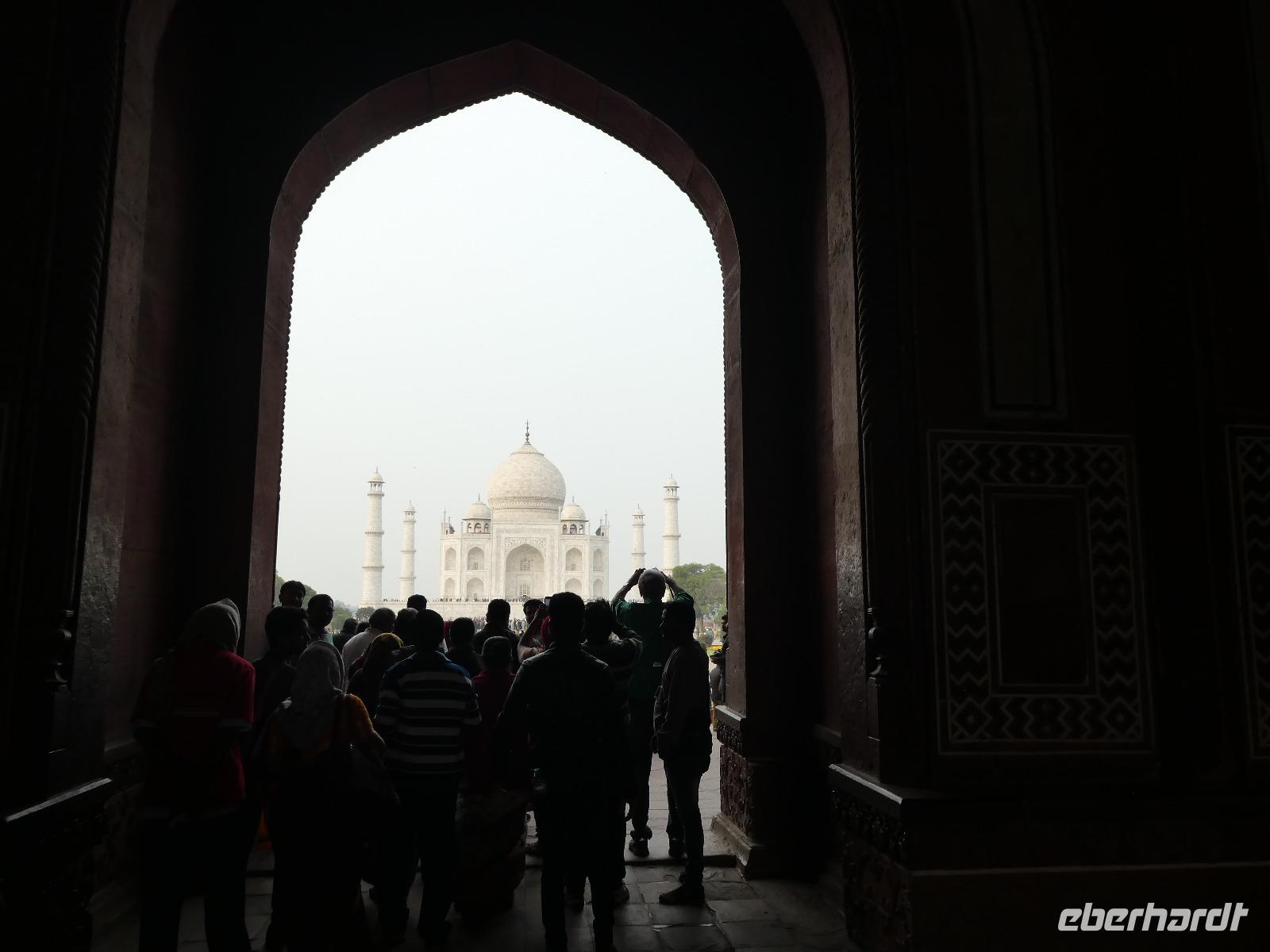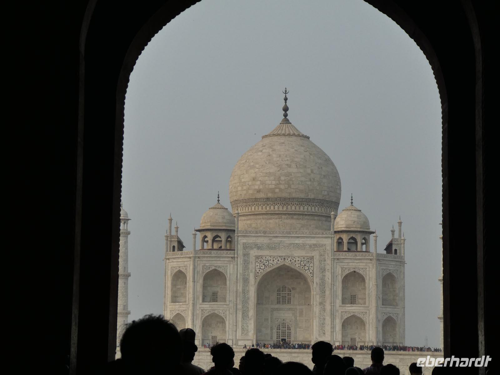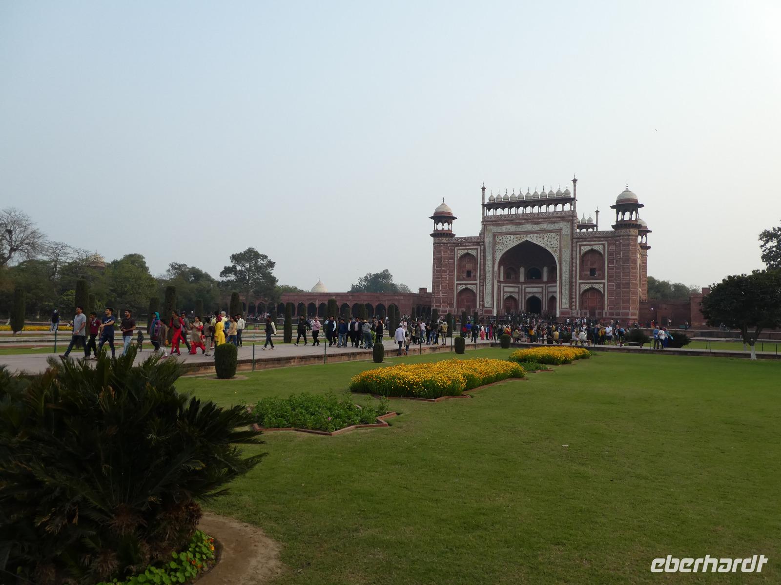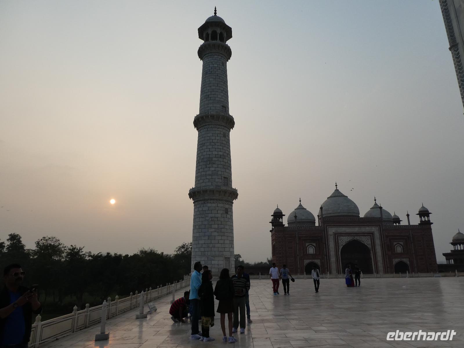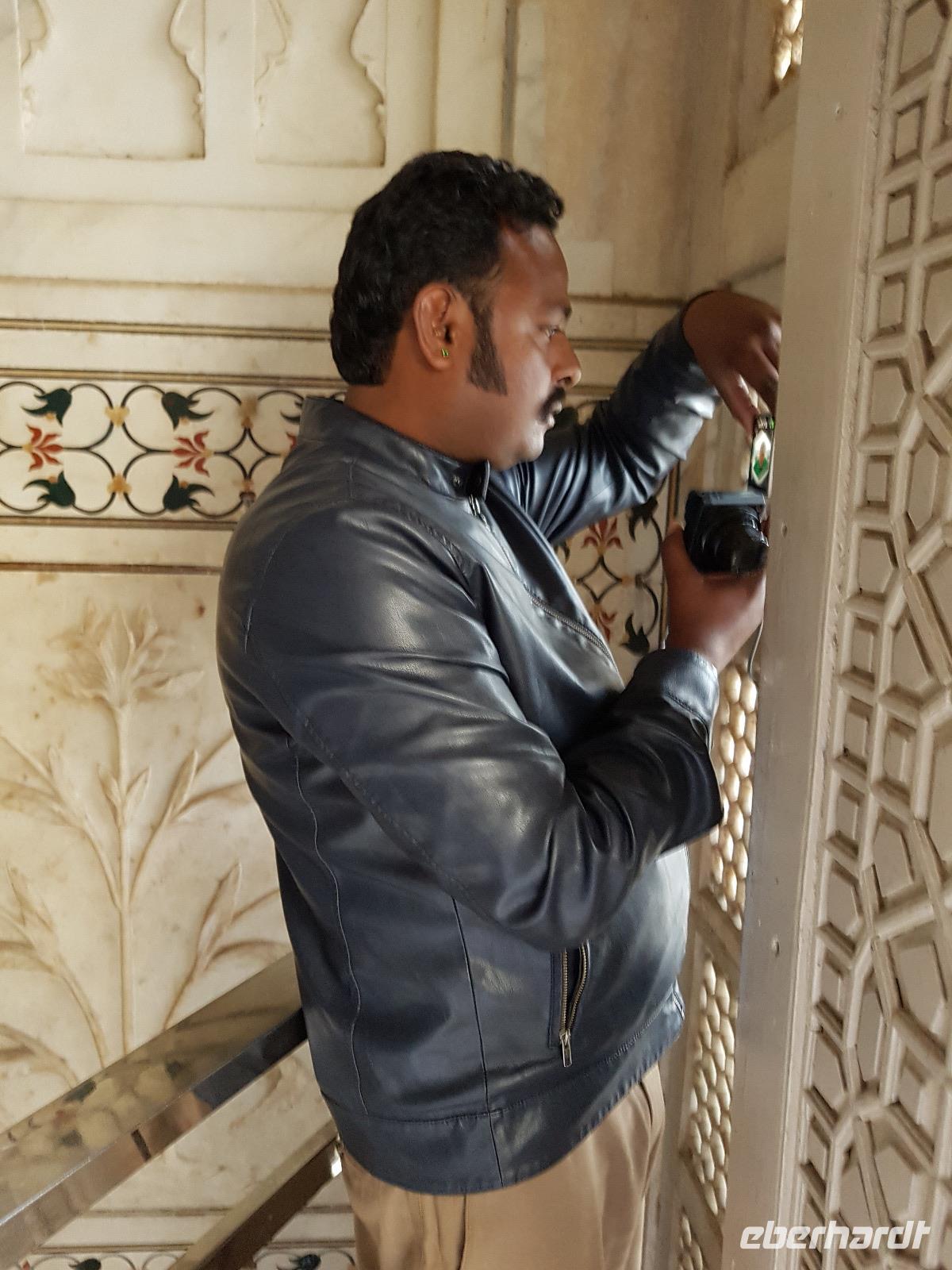 Ausgeruht und gut gestärkt nach einem tollen Frühstück fuhren wir mit unserem Bus aus Delhi hinaus auf die neue Autobahn Richtung Agra. An den Straßenrändern sahen wir viele Inder sitzen, die mit Essen von den Sikh versorgt wurden. Ein bedrückendes Bild angesichts des grenzenlosen Reichtums bei uns in Europa. Unterwegs tranken wir Kaffee an einer Raststätte und Bhawani informierte zur Geschichte der Mogul Kaiser und gab eine erste Einführung zum Kastensystem in Indien. Am frühen Nachmittag erreichten wir das Trident Hotel in Agra. Wir bezogen unsere Zimmer und gegen 15 Uhr brachen wir wieder auf in Richtung Taj Mahal. Zunächst besuchten wir aber das Taj Khema Restaurant mit einem herrlichen Garten. Bei Kaffee und Keksen genossen wir die Aussicht auf das wohl bekannteste Bauwerk Indiens und wir fotografierten wie die Weltmeister. Danach gingen wir zu Fuß zur Anlage des Taj Mahal und hatten gut 2 Stunden Zeit für eine sehr ausführliche Besichtigung. Bhawani zeigte uns die schönsten Ecken und besten Perspektiven zum Fotografieren und machte eine sehr detaillierte Führung. Wir blieben bis zum Sonnenuntergang und genossen diese ganz besondere Stimmung.