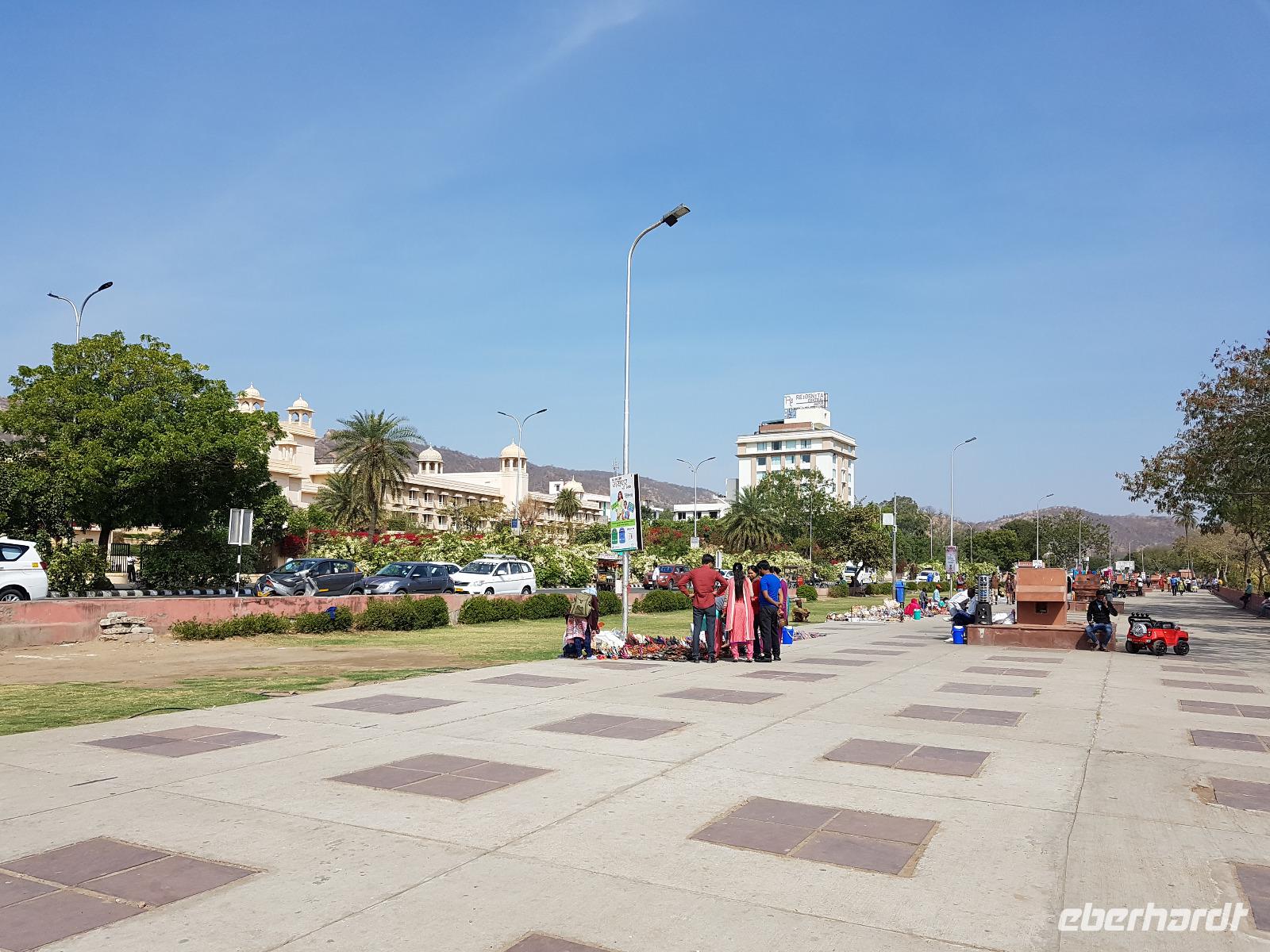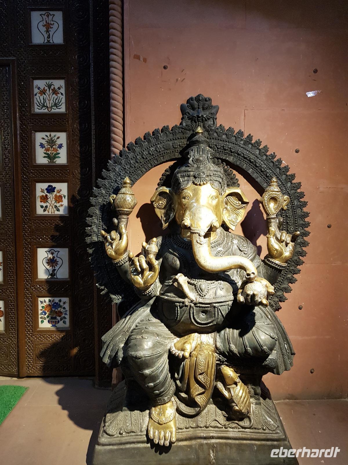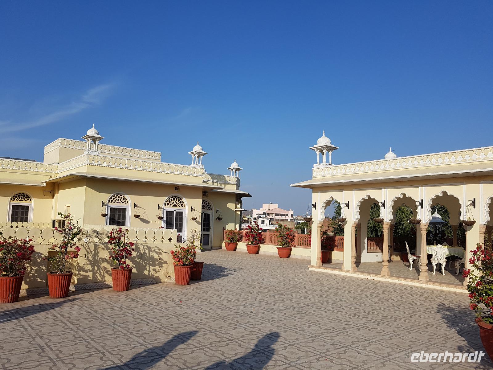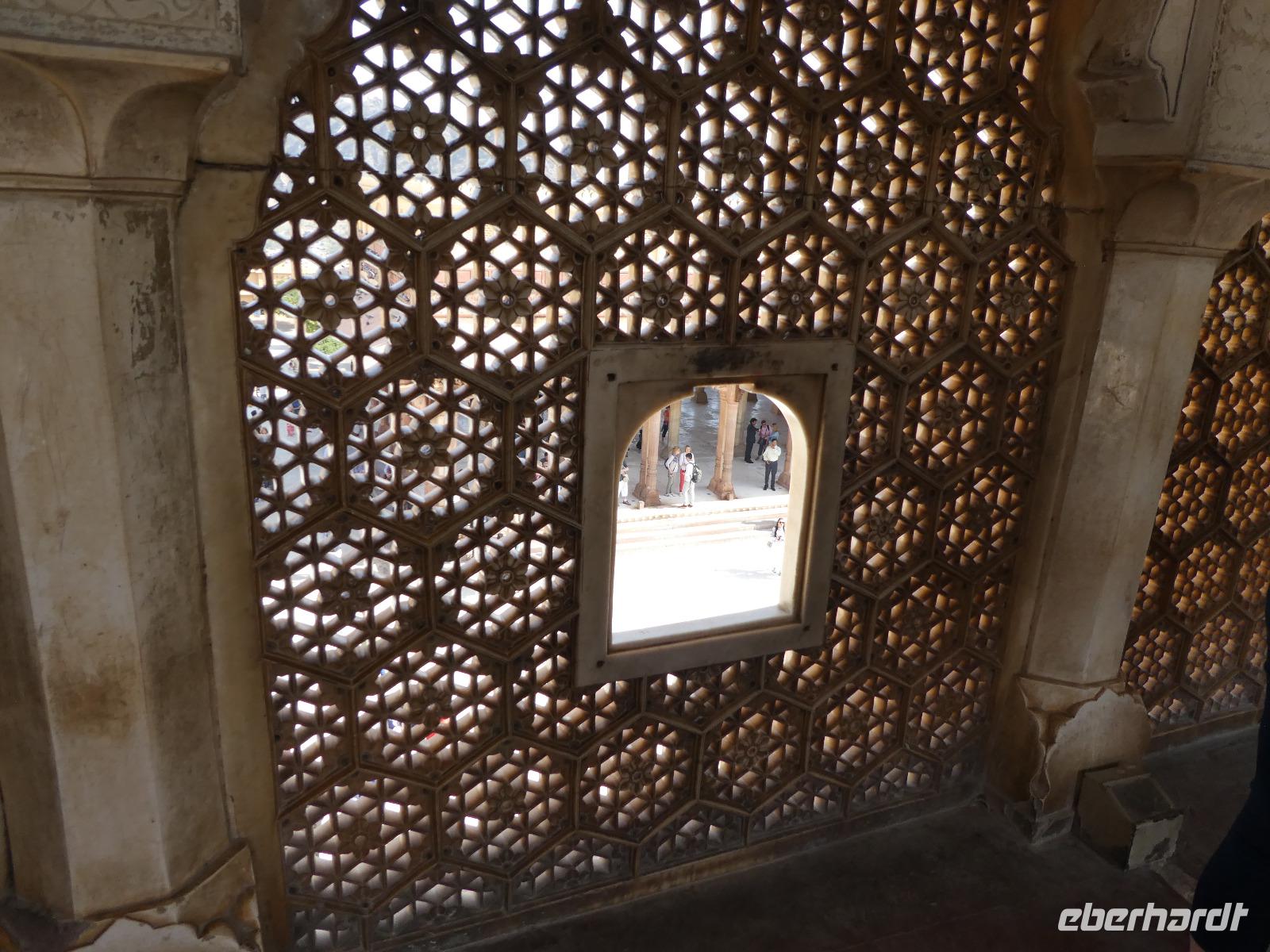 Recht früh brachen wir heute auf zum Amber Fort. Die Elefanten, die die Gäste hinauf zum Fort bringen, arbeiten nur noch vormittags und so bot sich eine lange Schlange Wartender Touristen. Immer 2 Gäste saßen sehr bequem auf einem breiten Sessel auf dem Rücken des Elefanten und so war der Ritt hinauf schon mal ein Erlebnis. Bei Sonnenschein und guter Sicht erkundeten wir die zahlreichen Gebäude und Gärten des Forts. Seine Lage im Aravelligebirge macht es besonders reizvoll und eine 25 km lange Mauer schützt den Ort mit dem Fort. Den Weg wieder hinunter zum Bus gingen wir zu Fuß und konnten so noch einmal die fantastische Aussicht genießen. Auf dem Rückweg stoppten wir in einer Teppeichknüpferei und Druckerei und erfuhren viel Interessantes und bekamen dazu auch noch einen Mittagssnack.