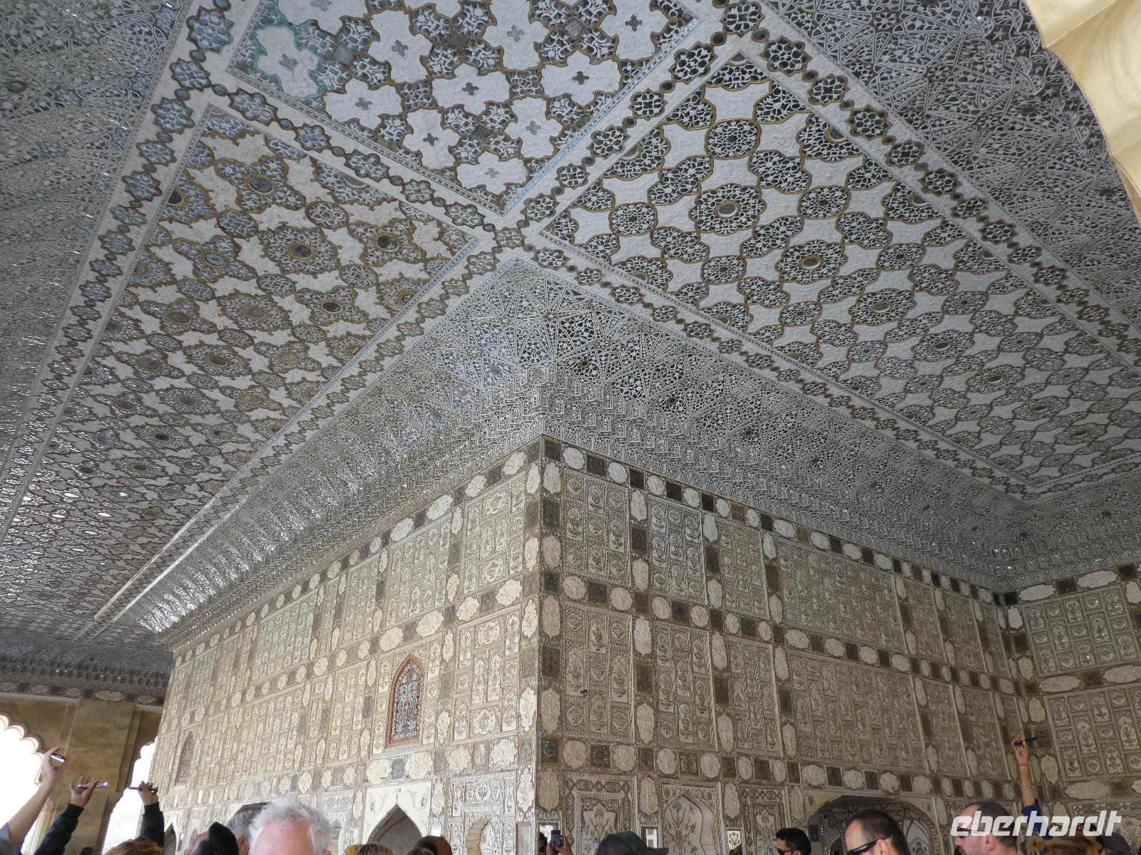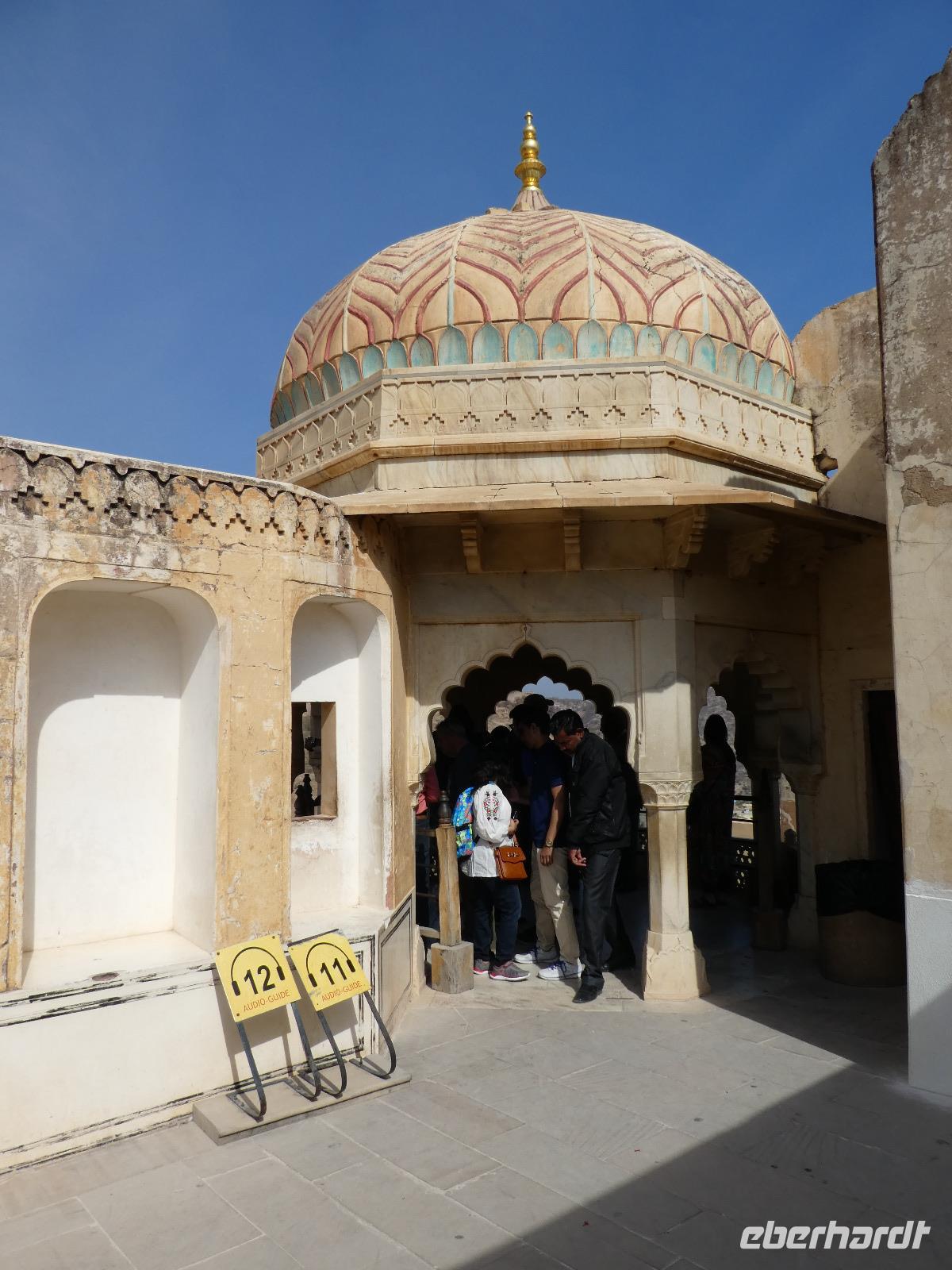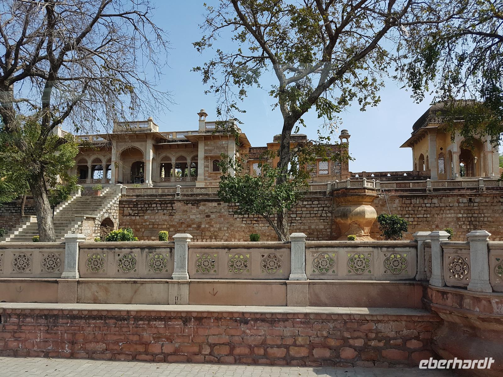 Recht früh brachen wir heute auf zum Amber Fort. Die Elefanten, die die Gäste hinauf zum Fort bringen, arbeiten nur noch vormittags und so bot sich eine lange Schlange Wartender Touristen. Immer 2 Gäste saßen sehr bequem auf einem breiten Sessel auf dem Rücken des Elefanten und so war der Ritt hinauf schon mal ein Erlebnis. Bei Sonnenschein und guter Sicht erkundeten wir die zahlreichen Gebäude und Gärten des Forts. Seine Lage im Aravelligebirge macht es besonders reizvoll und eine 25 km lange Mauer schützt den Ort mit dem Fort. Den Weg wieder hinunter zum Bus gingen wir zu Fuß und konnten so noch einmal die fantastische Aussicht genießen. Auf dem Rückweg stoppten wir in einer Teppeichknüpferei und Druckerei und erfuhren viel Interessantes und bekamen dazu auch noch einen Mittagssnack.