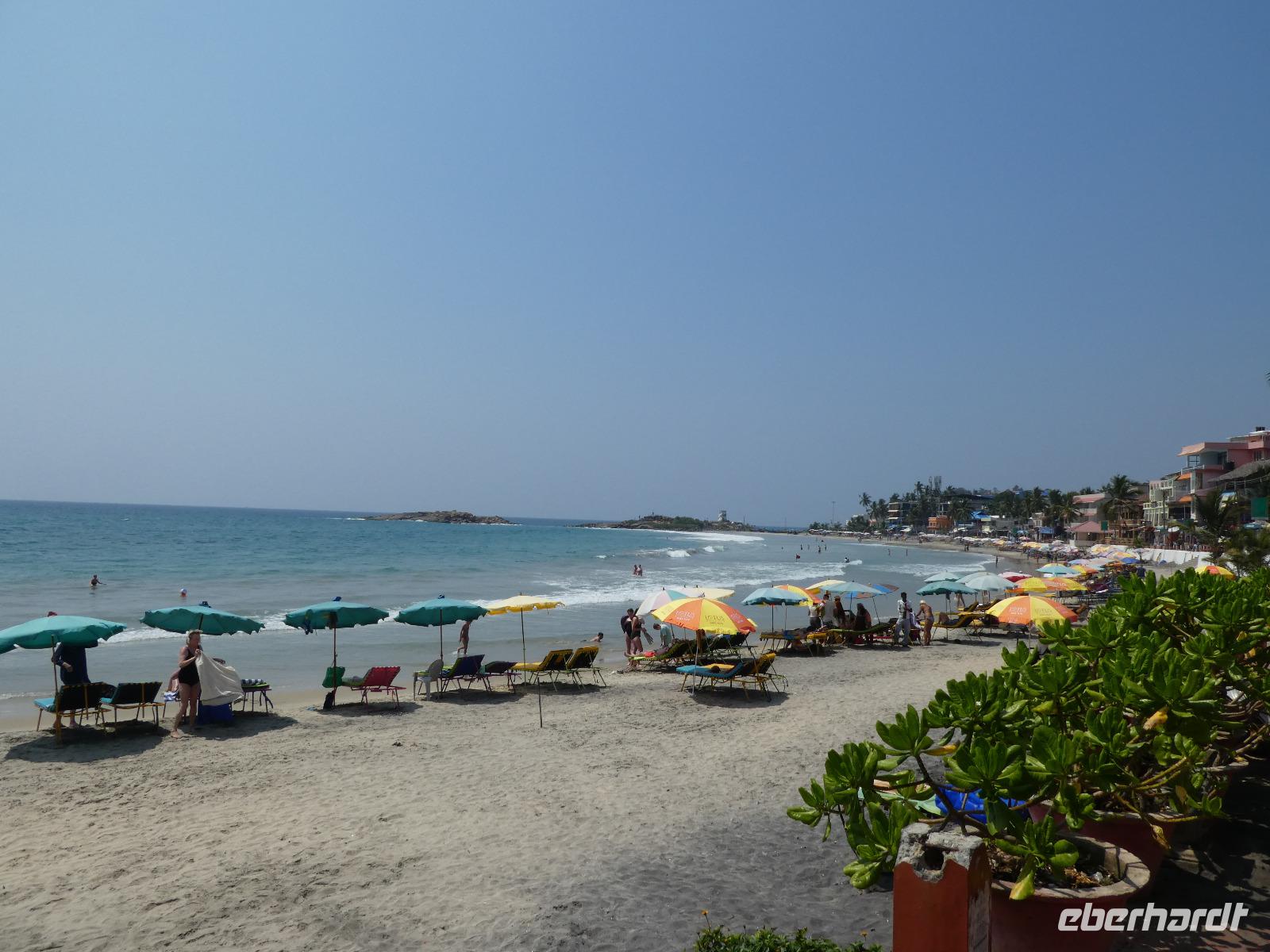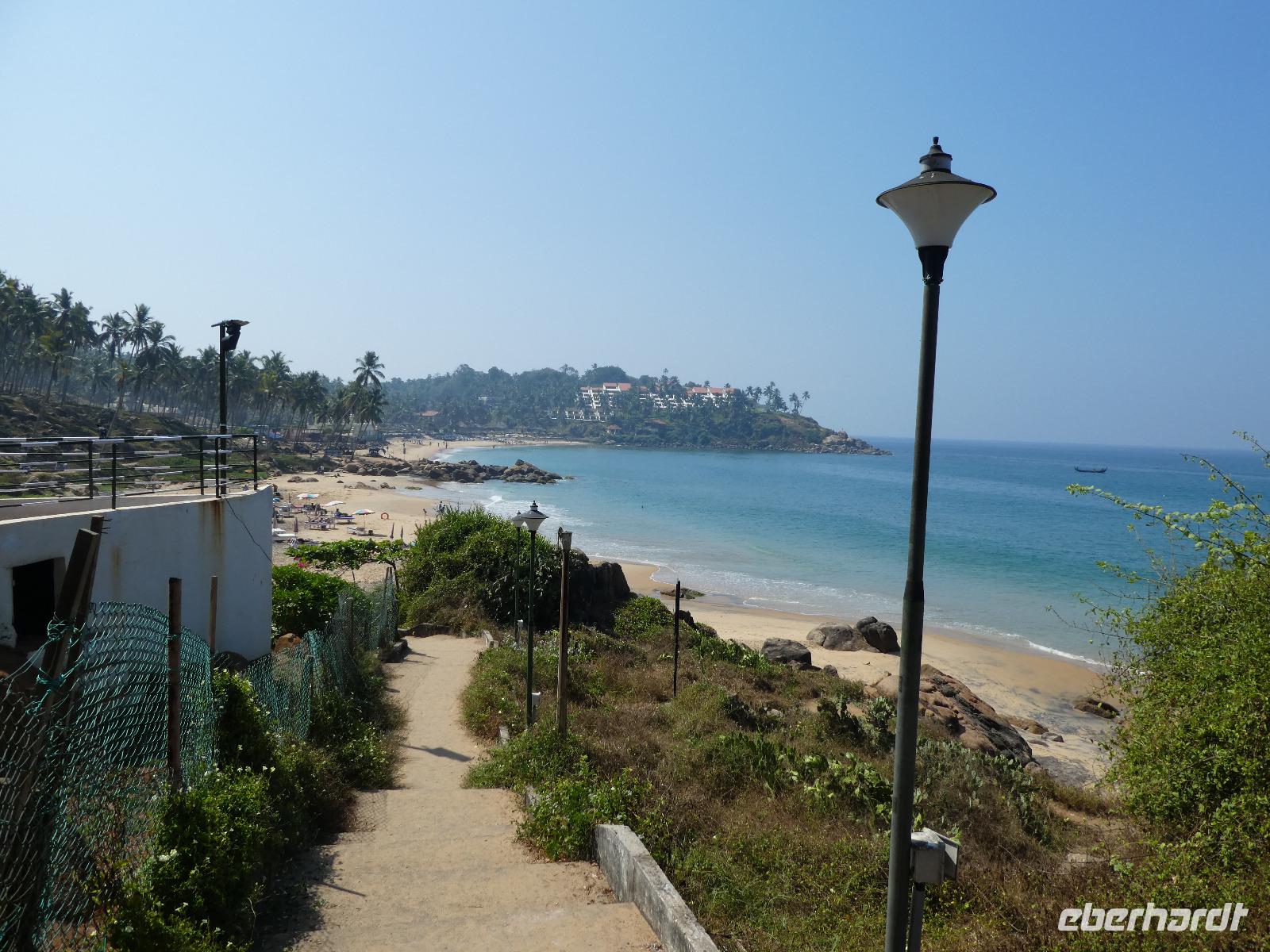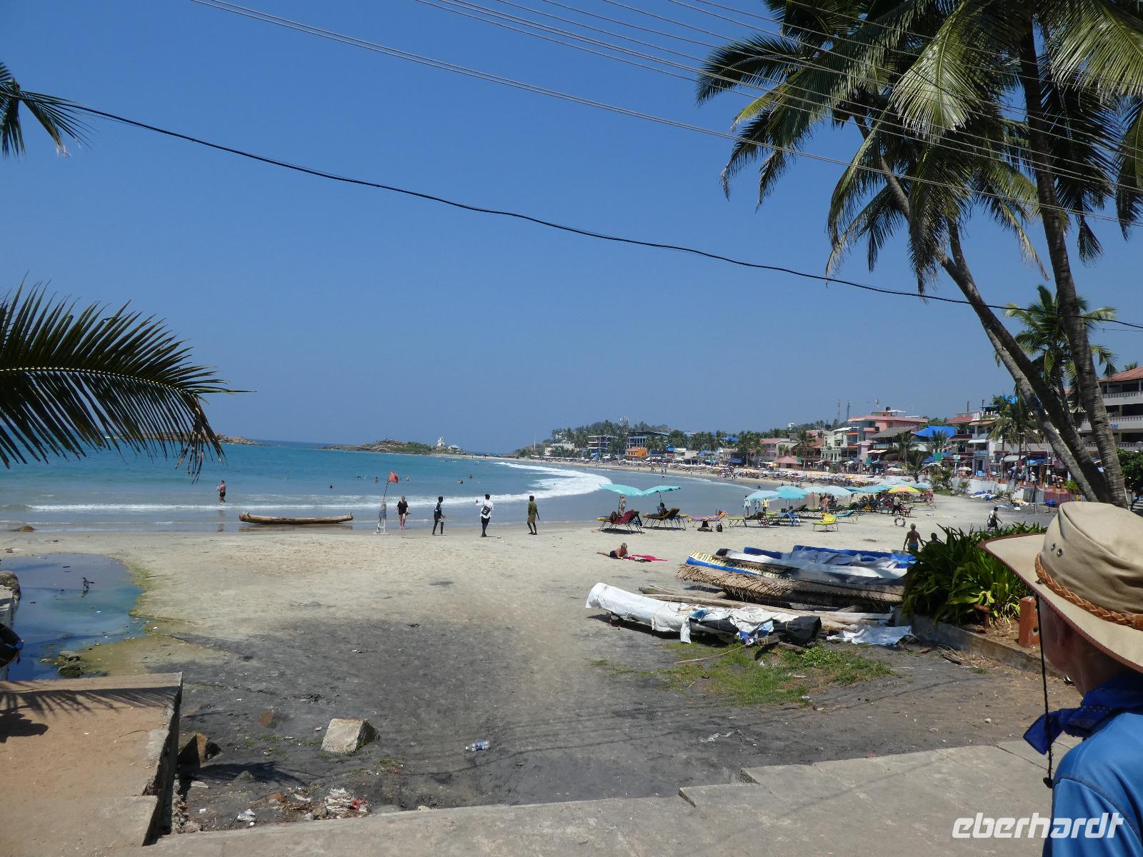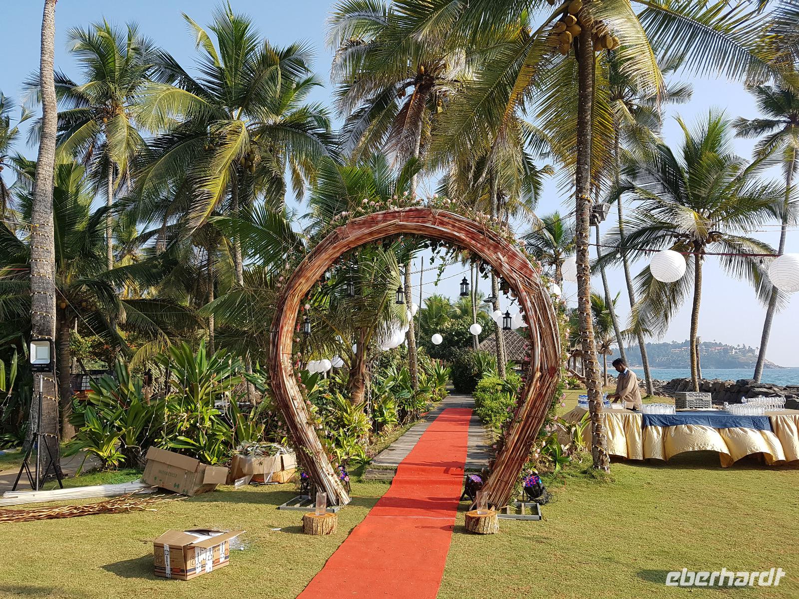 Das kleine Boot holte uns mit dem Gepäck wieder vom Hausboot ab und an Kand warteten schon Bhawani und Sajee auf uns. Die Fahrt ging weiter in den Süden und zum Mittagessen organisierten wir ein typisches südindisches Mahl auf einem Bananenblatt. Die Inder essen mit den Fingern, für uns Europäer wurden Löffel und Gabel bereit gelegt. Es schmeckte hervorragend. Am frühen Nachmittag erreichten wir Kovalem und unser letztes Hotel Vivanta by Taj - Green Cove. Inzwischen herrschten Temperaturen von 35 Grad und so schmeckte die frische Kokosnuß besonders gut. Die Hotelanlage lag in einem tropischen Garten hoch über dem Meer und war sehr verwinkelt. Wir wurden zu unseren Häuschen begleitet und richteten uns ein. Am Nachmittag dann erkundeten wir den Bereich unten am Meer und den etwas weiter entfernten Sandstrand von Kovalem. Wie schon am Vembanadsee gab es auch hier ab 17 Uhr kostenlos Kaffee und Snacks und wir konnten die Vorbereitungen für einen Hochzeitsempfang beobachten. Dann hieß es Abschied nehmen von Bhawani, der uns von Delhi bis hierher begleitet hatte und von dem wir sehr viel über Indien erfahren hatten. Danke Bhawani, wir hatten viel Spaß miteinander in familiärer Atmosphäre unserer kleinen Gruppe.