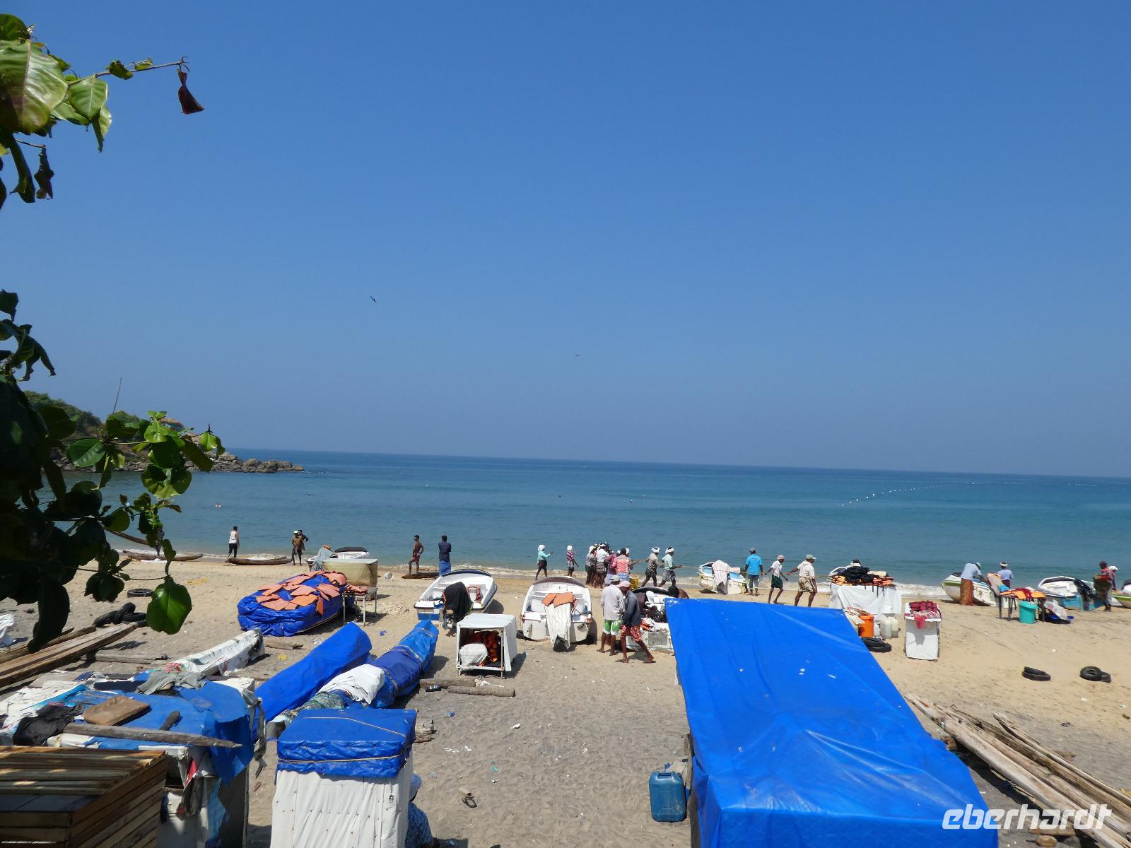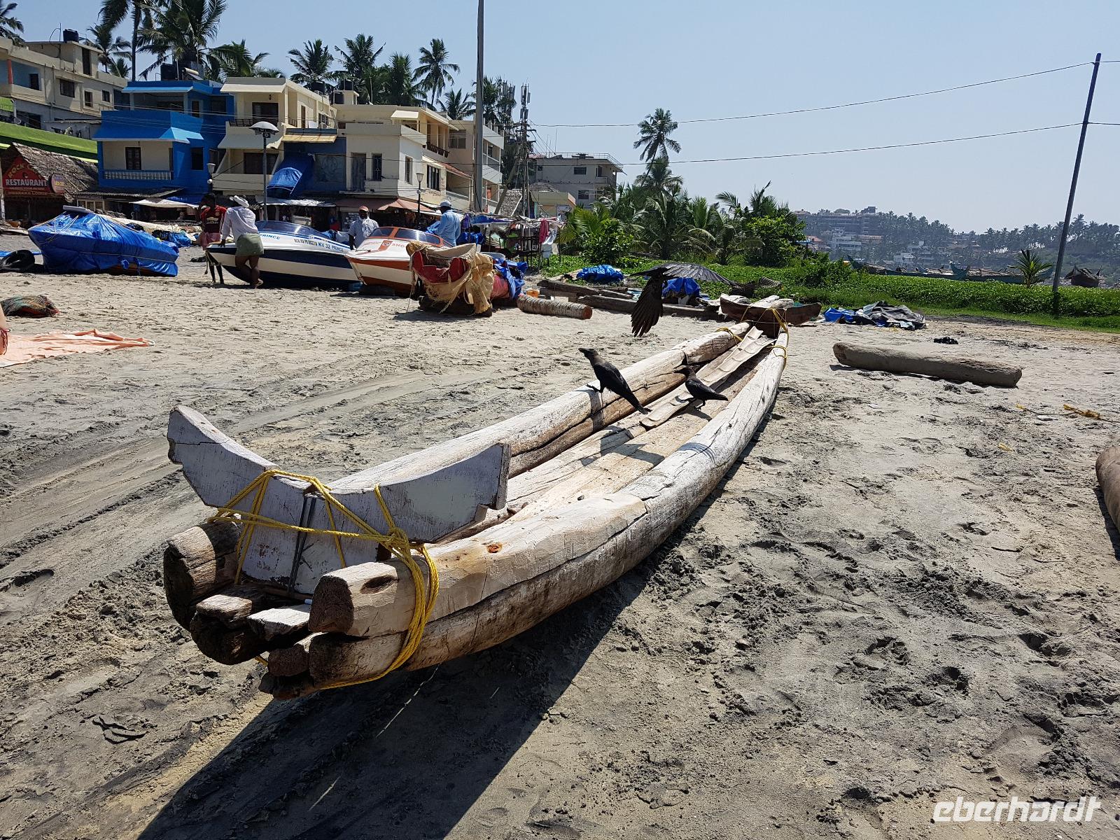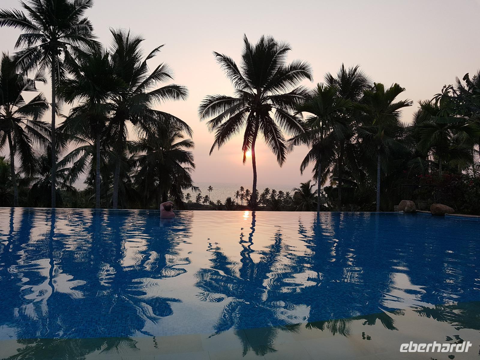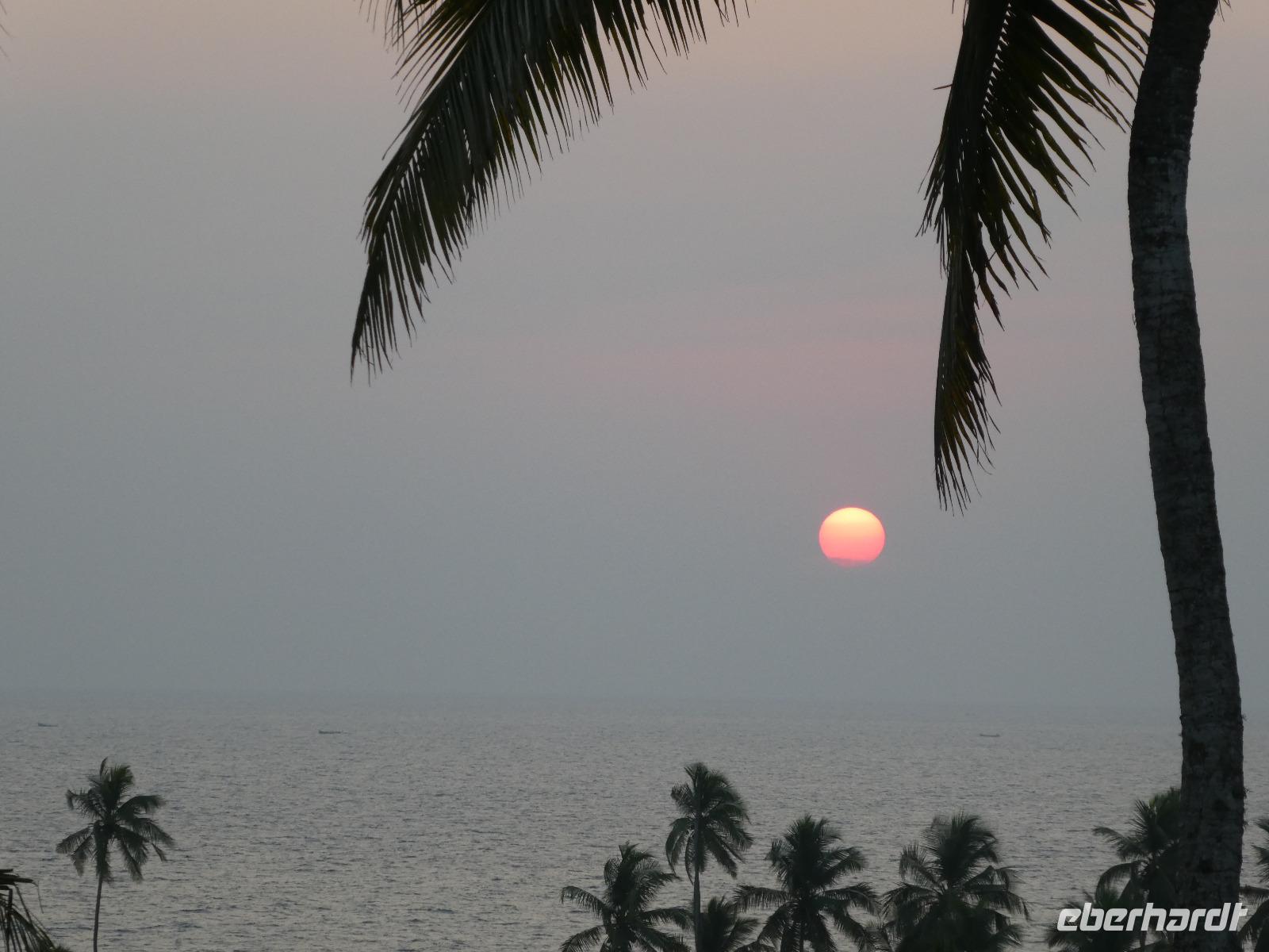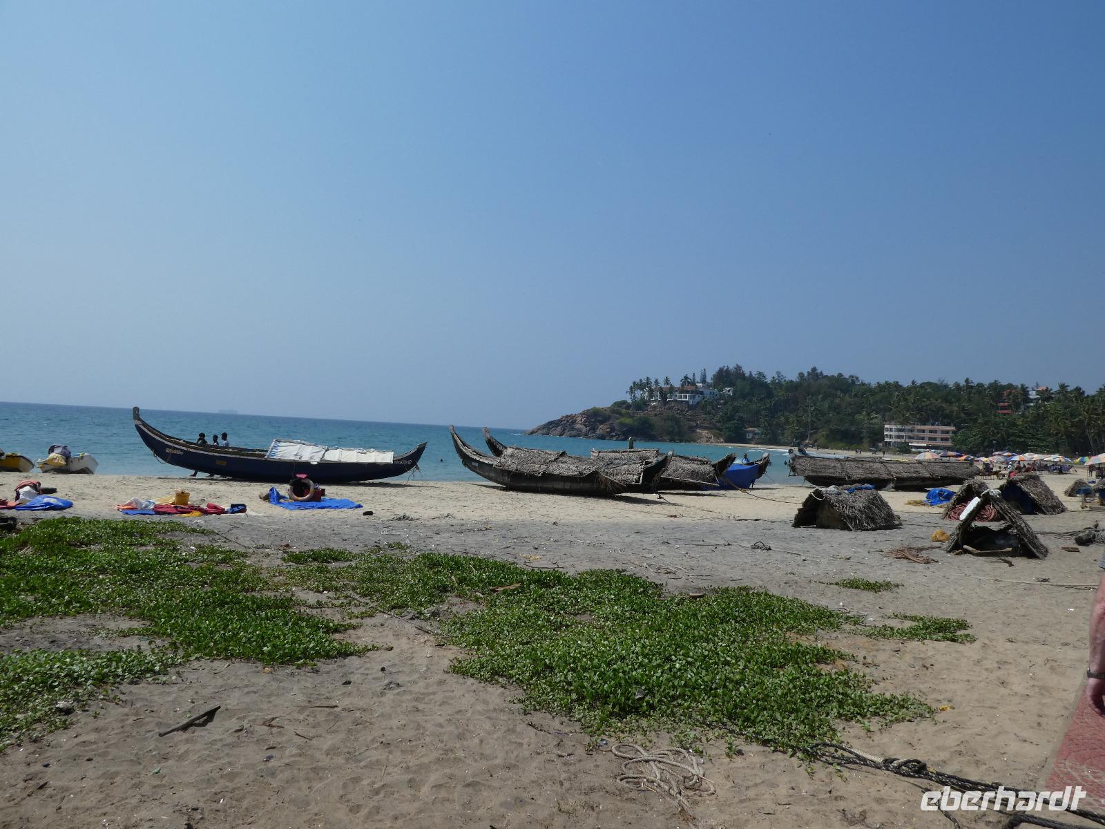 Das kleine Boot holte uns mit dem Gepäck wieder vom Hausboot ab und an Kand warteten schon Bhawani und Sajee auf uns. Die Fahrt ging weiter in den Süden und zum Mittagessen organisierten wir ein typisches südindisches Mahl auf einem Bananenblatt. Die Inder essen mit den Fingern, für uns Europäer wurden Löffel und Gabel bereit gelegt. Es schmeckte hervorragend. Am frühen Nachmittag erreichten wir Kovalem und unser letztes Hotel Vivanta by Taj - Green Cove. Inzwischen herrschten Temperaturen von 35 Grad und so schmeckte die frische Kokosnuß besonders gut. Die Hotelanlage lag in einem tropischen Garten hoch über dem Meer und war sehr verwinkelt. Wir wurden zu unseren Häuschen begleitet und richteten uns ein. Am Nachmittag dann erkundeten wir den Bereich unten am Meer und den etwas weiter entfernten Sandstrand von Kovalem. Wie schon am Vembanadsee gab es auch hier ab 17 Uhr kostenlos Kaffee und Snacks und wir konnten die Vorbereitungen für einen Hochzeitsempfang beobachten. Dann hieß es Abschied nehmen von Bhawani, der uns von Delhi bis hierher begleitet hatte und von dem wir sehr viel über Indien erfahren hatten. Danke Bhawani, wir hatten viel Spaß miteinander in familiärer Atmosphäre unserer kleinen Gruppe.