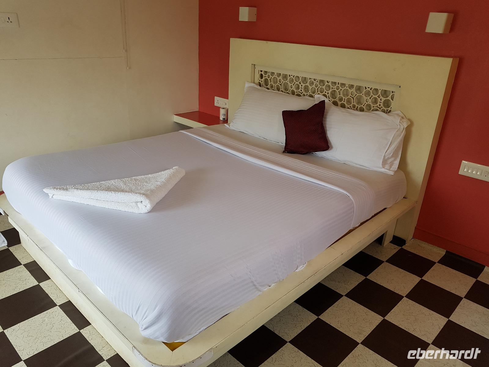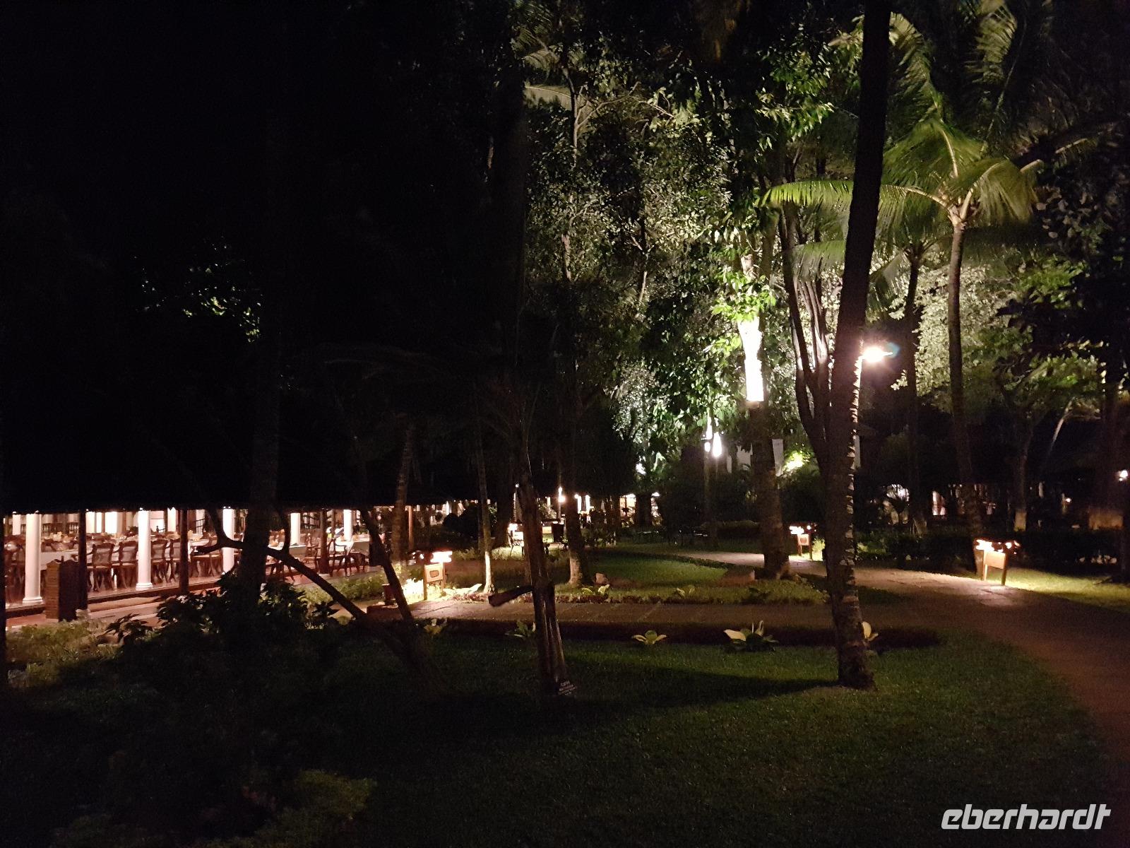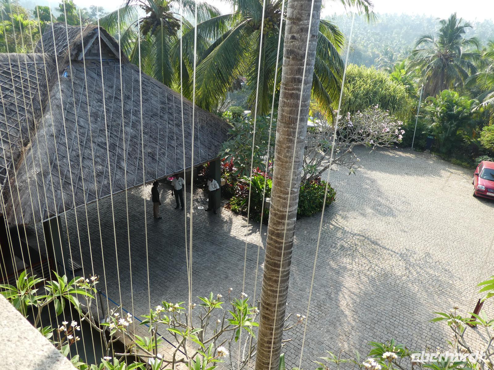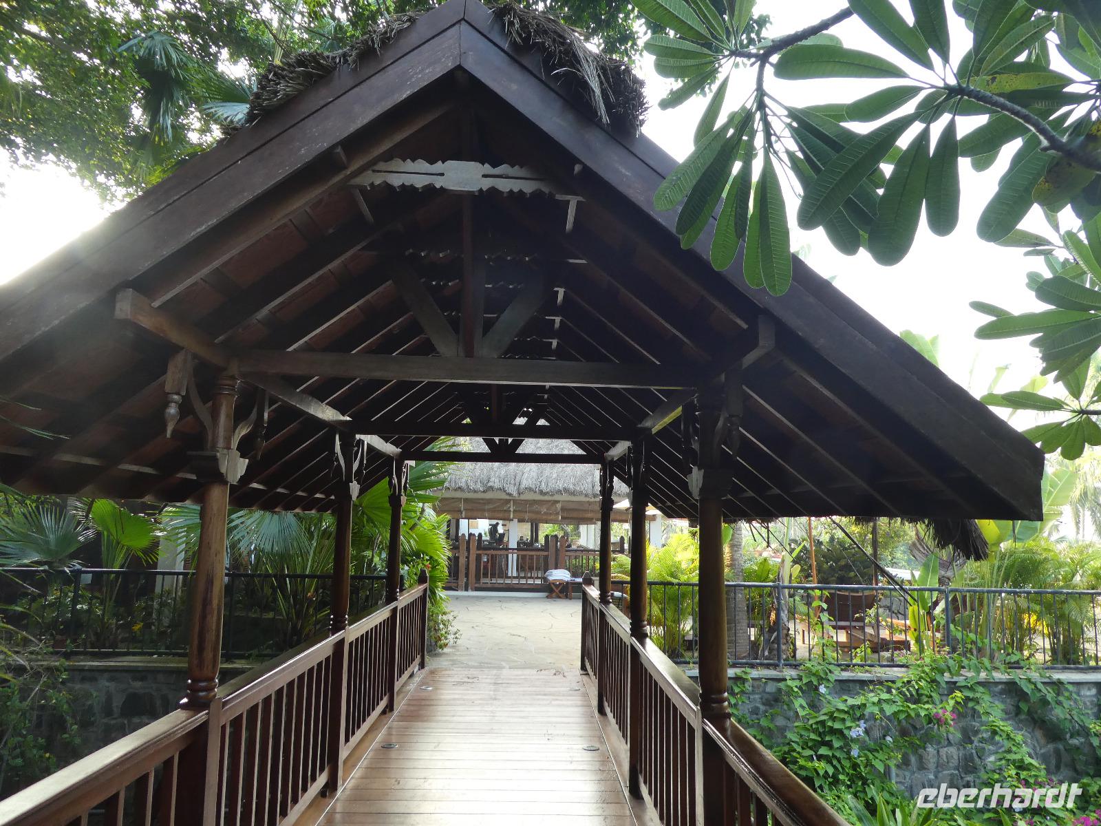 Das kleine Boot holte uns mit dem Gepäck wieder vom Hausboot ab und an Kand warteten schon Bhawani und Sajee auf uns. Die Fahrt ging weiter in den Süden und zum Mittagessen organisierten wir ein typisches südindisches Mahl auf einem Bananenblatt. Die Inder essen mit den Fingern, für uns Europäer wurden Löffel und Gabel bereit gelegt. Es schmeckte hervorragend. Am frühen Nachmittag erreichten wir Kovalem und unser letztes Hotel Vivanta by Taj - Green Cove. Inzwischen herrschten Temperaturen von 35 Grad und so schmeckte die frische Kokosnuß besonders gut. Die Hotelanlage lag in einem tropischen Garten hoch über dem Meer und war sehr verwinkelt. Wir wurden zu unseren Häuschen begleitet und richteten uns ein. Am Nachmittag dann erkundeten wir den Bereich unten am Meer und den etwas weiter entfernten Sandstrand von Kovalem. Wie schon am Vembanadsee gab es auch hier ab 17 Uhr kostenlos Kaffee und Snacks und wir konnten die Vorbereitungen für einen Hochzeitsempfang beobachten. Dann hieß es Abschied nehmen von Bhawani, der uns von Delhi bis hierher begleitet hatte und von dem wir sehr viel über Indien erfahren hatten. Danke Bhawani, wir hatten viel Spaß miteinander in familiärer Atmosphäre unserer kleinen Gruppe.