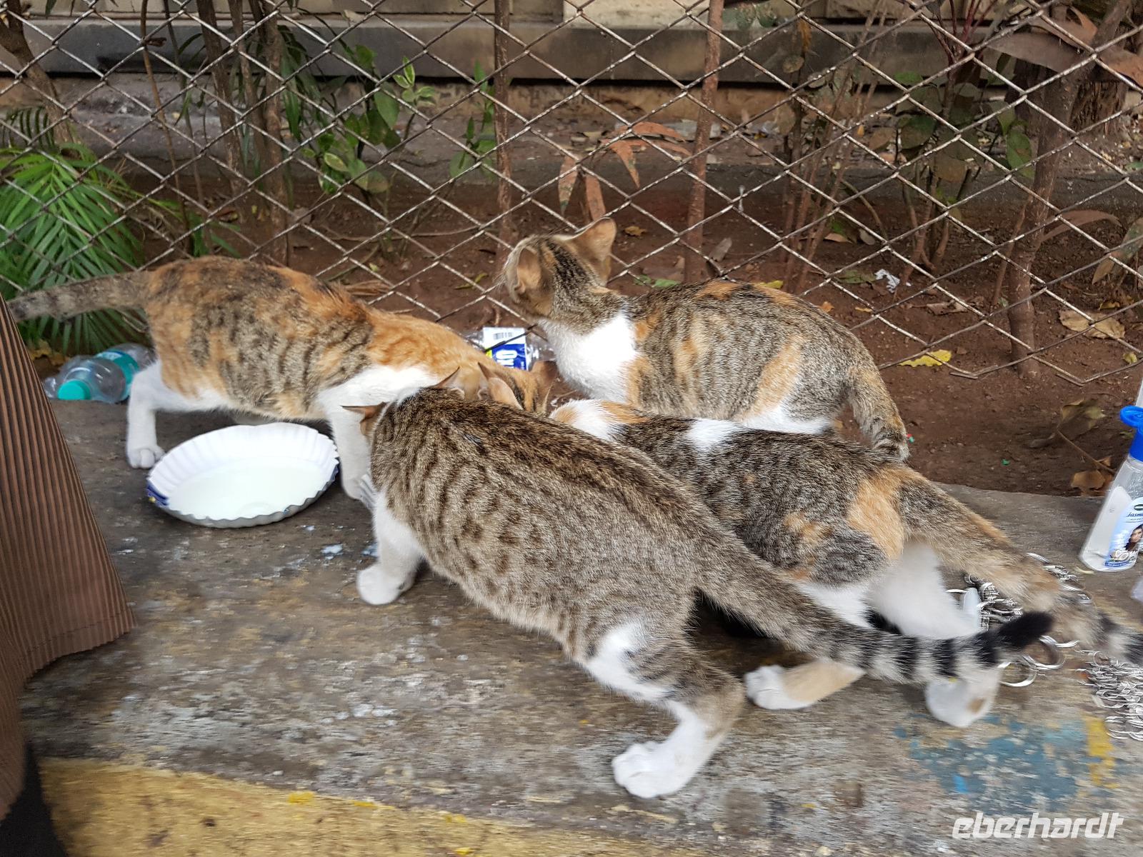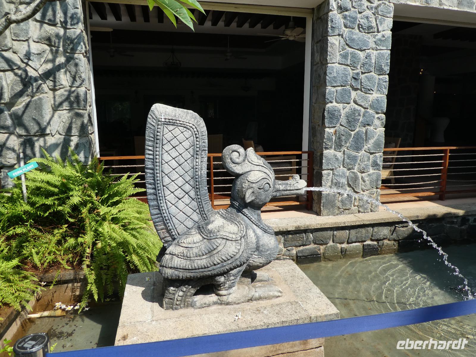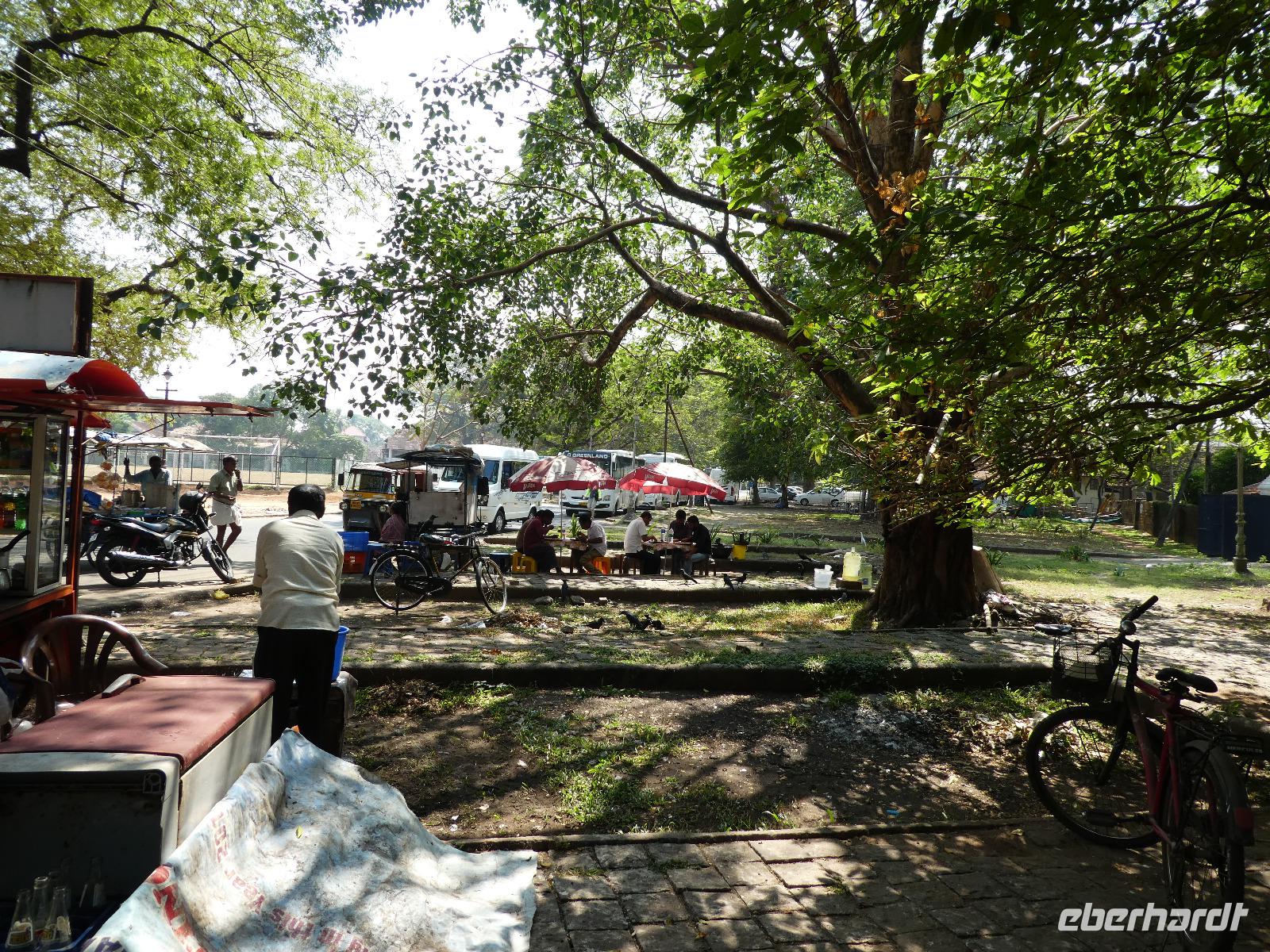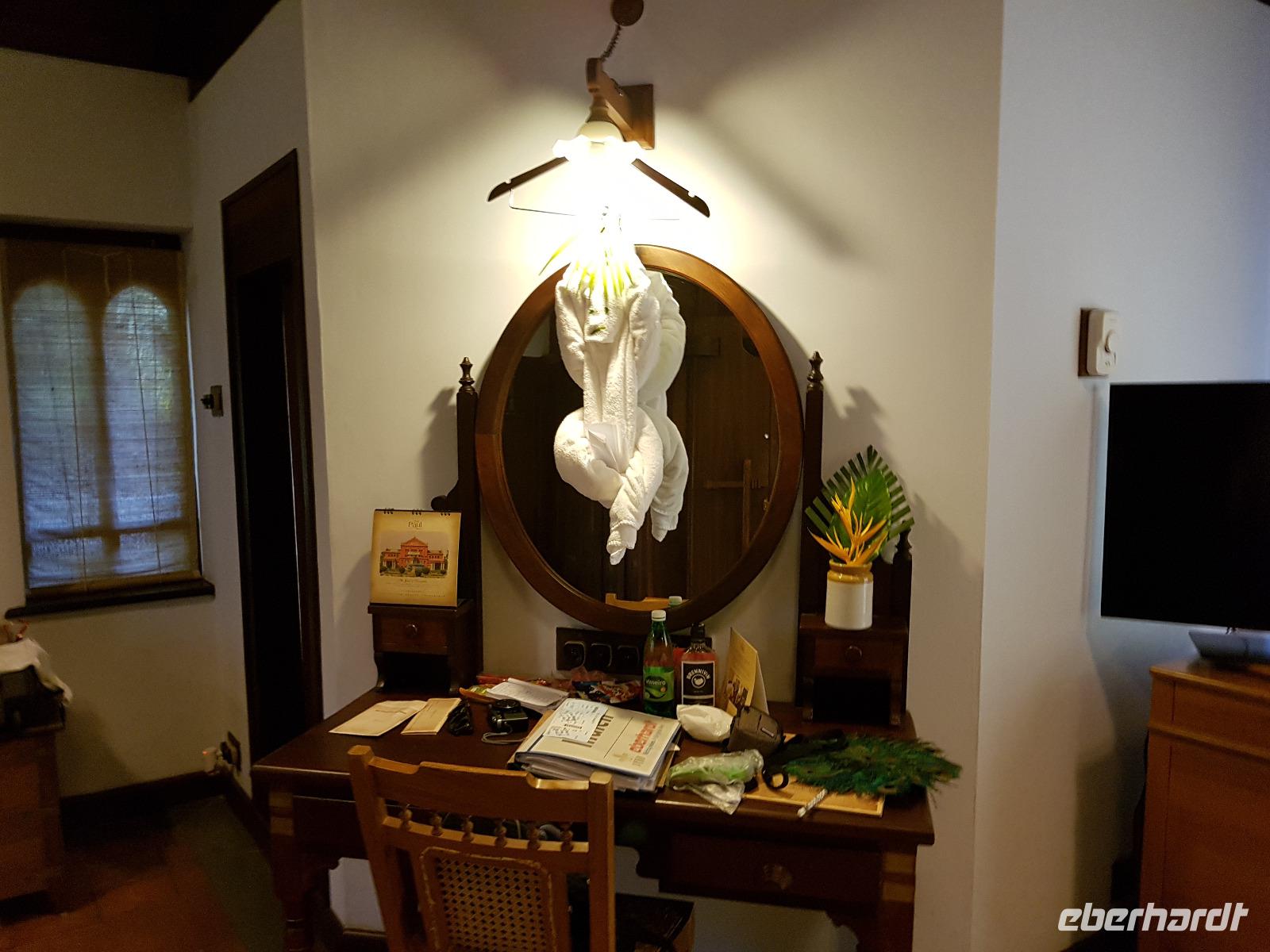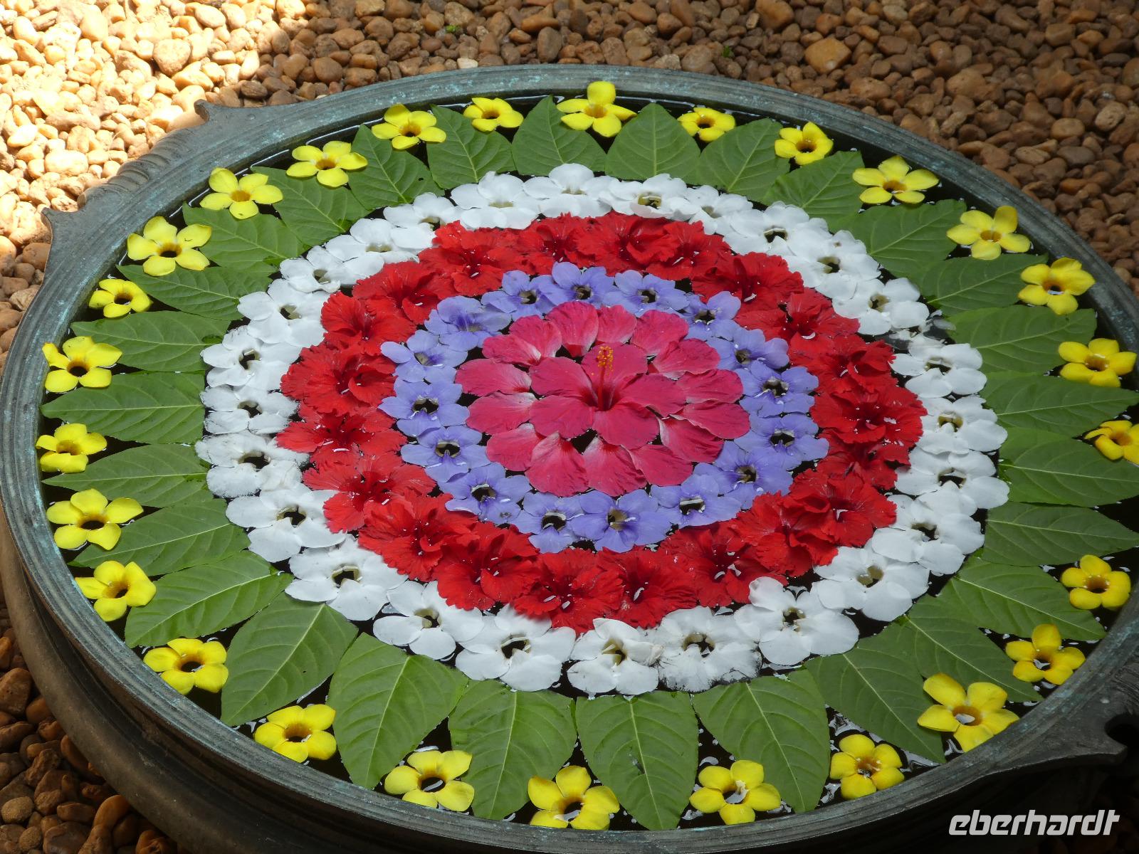 Das kleine Boot holte uns mit dem Gepäck wieder vom Hausboot ab und an Kand warteten schon Bhawani und Sajee auf uns. Die Fahrt ging weiter in den Süden und zum Mittagessen organisierten wir ein typisches südindisches Mahl auf einem Bananenblatt. Die Inder essen mit den Fingern, für uns Europäer wurden Löffel und Gabel bereit gelegt. Es schmeckte hervorragend. Am frühen Nachmittag erreichten wir Kovalem und unser letztes Hotel Vivanta by Taj - Green Cove. Inzwischen herrschten Temperaturen von 35 Grad und so schmeckte die frische Kokosnuß besonders gut. Die Hotelanlage lag in einem tropischen Garten hoch über dem Meer und war sehr verwinkelt. Wir wurden zu unseren Häuschen begleitet und richteten uns ein. Am Nachmittag dann erkundeten wir den Bereich unten am Meer und den etwas weiter entfernten Sandstrand von Kovalem. Wie schon am Vembanadsee gab es auch hier ab 17 Uhr kostenlos Kaffee und Snacks und wir konnten die Vorbereitungen für einen Hochzeitsempfang beobachten. Dann hieß es Abschied nehmen von Bhawani, der uns von Delhi bis hierher begleitet hatte und von dem wir sehr viel über Indien erfahren hatten. Danke Bhawani, wir hatten viel Spaß miteinander in familiärer Atmosphäre unserer kleinen Gruppe.